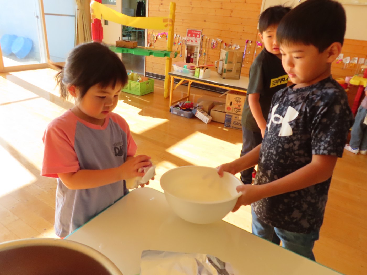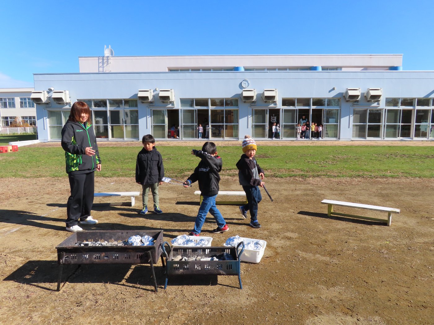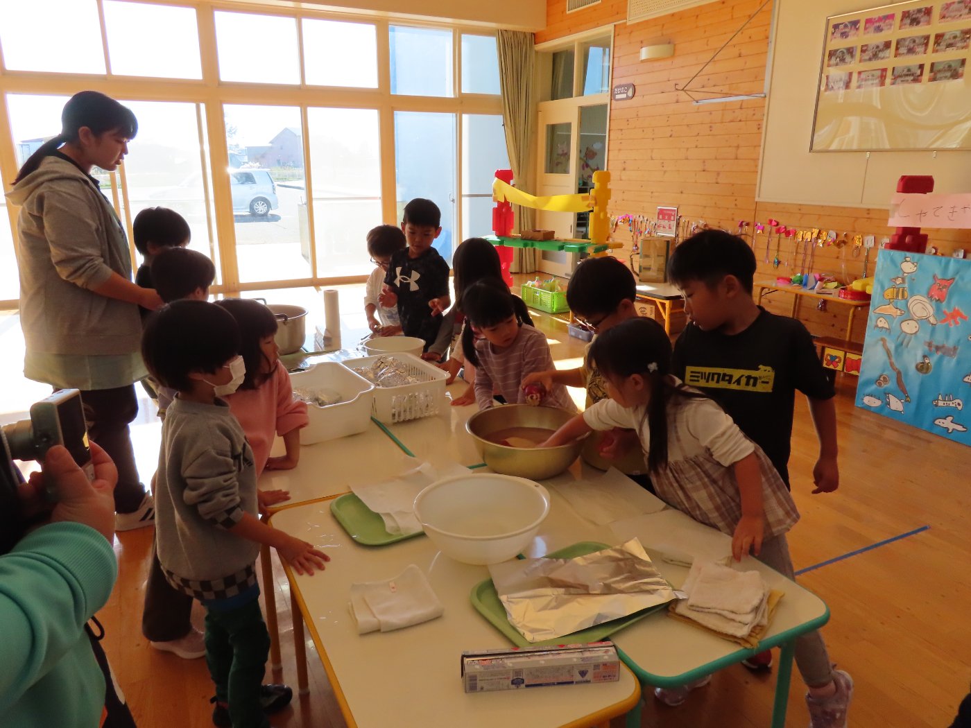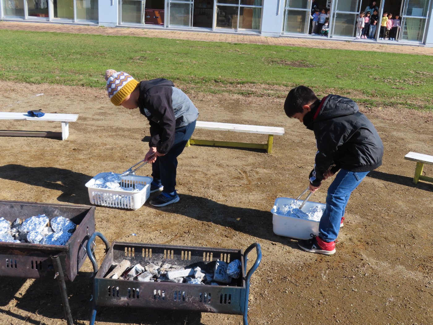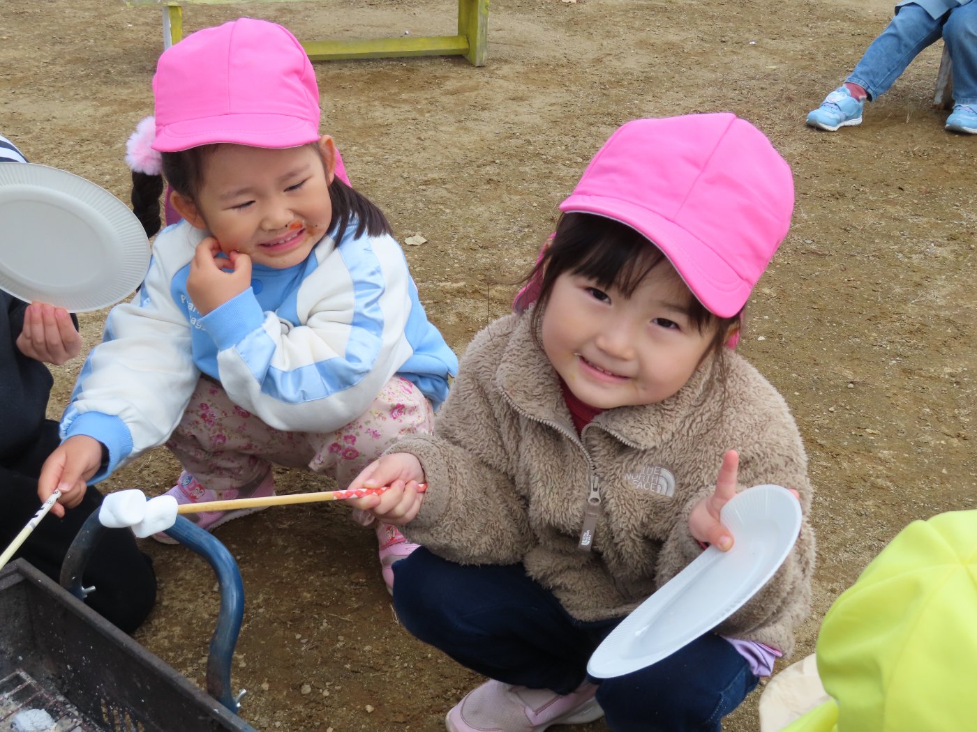 10月誕生会のお楽しみは、毎年恒例!『焼き芋』を行いました。朝遊びの時間は、美味しい焼き芋のためにサツマイモのホイル包みに精を出しました。このサツマイモはもちろん!たけのこ組が丹精込めて育てた上西春別幼稚園産です。たけのこ組は、炭火の,熱風と格闘しながら、包んだサツマイモを投入するのにもチャレンジしました。サツマイモの他にも、マシュマロ、ウィンナー、収穫カボチャ、チーズ(A先生の旦那様が差し入れてくださいました♫)も炭火焼に! 熱々ほくほくのうちにみんなで味わい、それはそれは幸せそうに頬張っていた子ども達です。