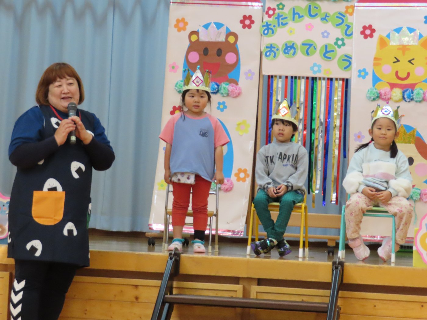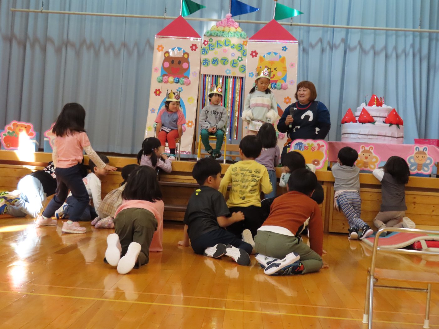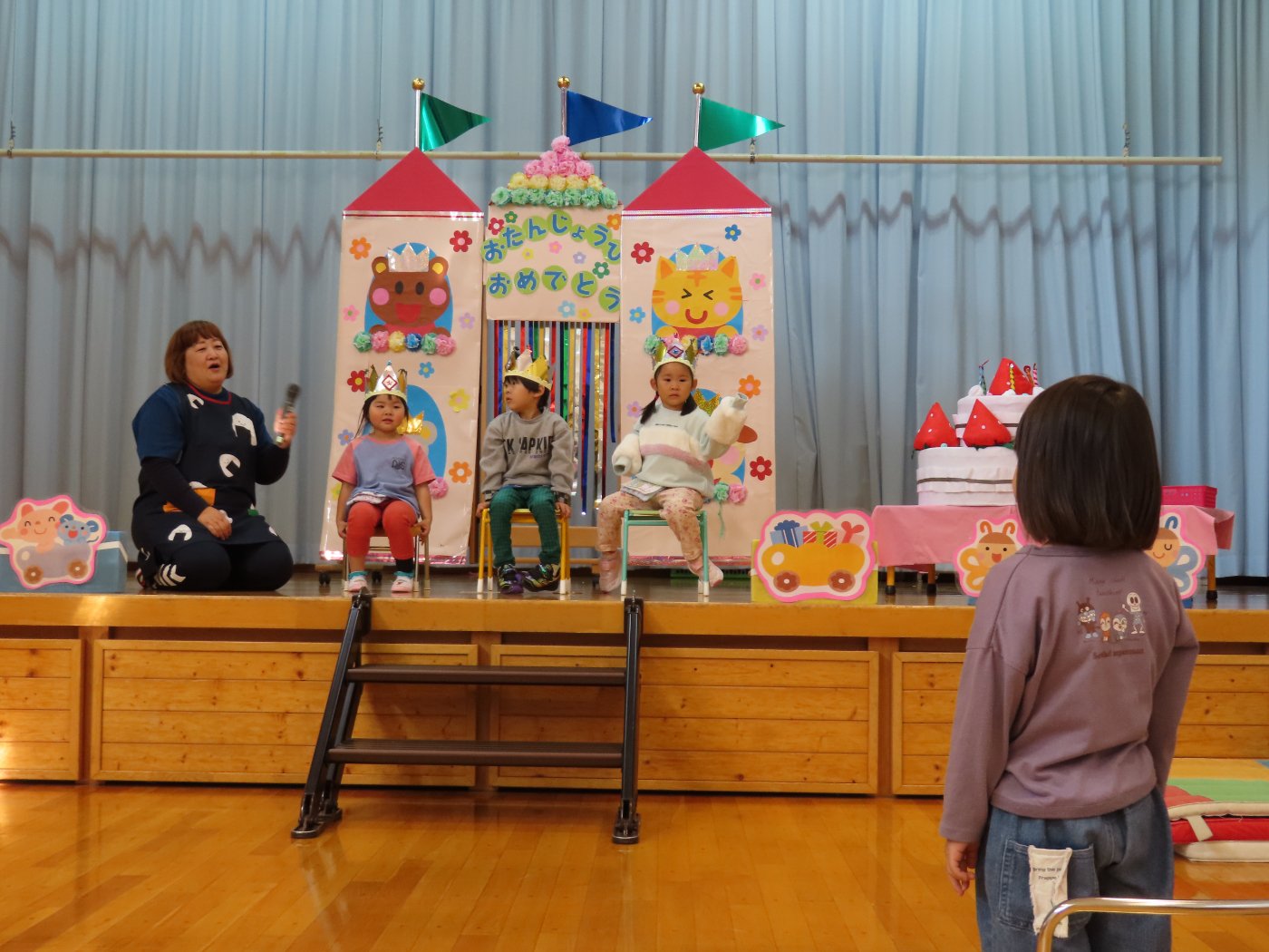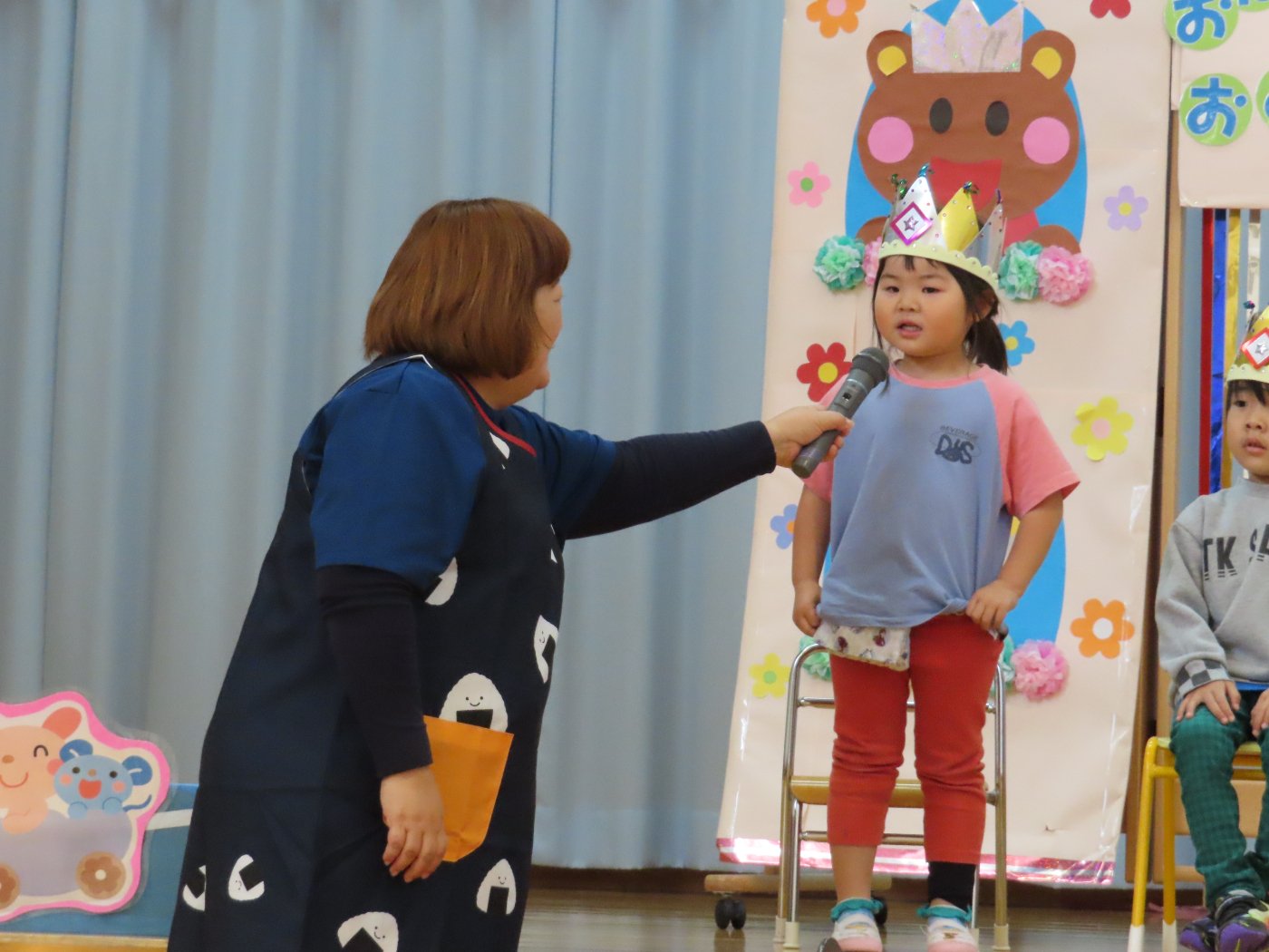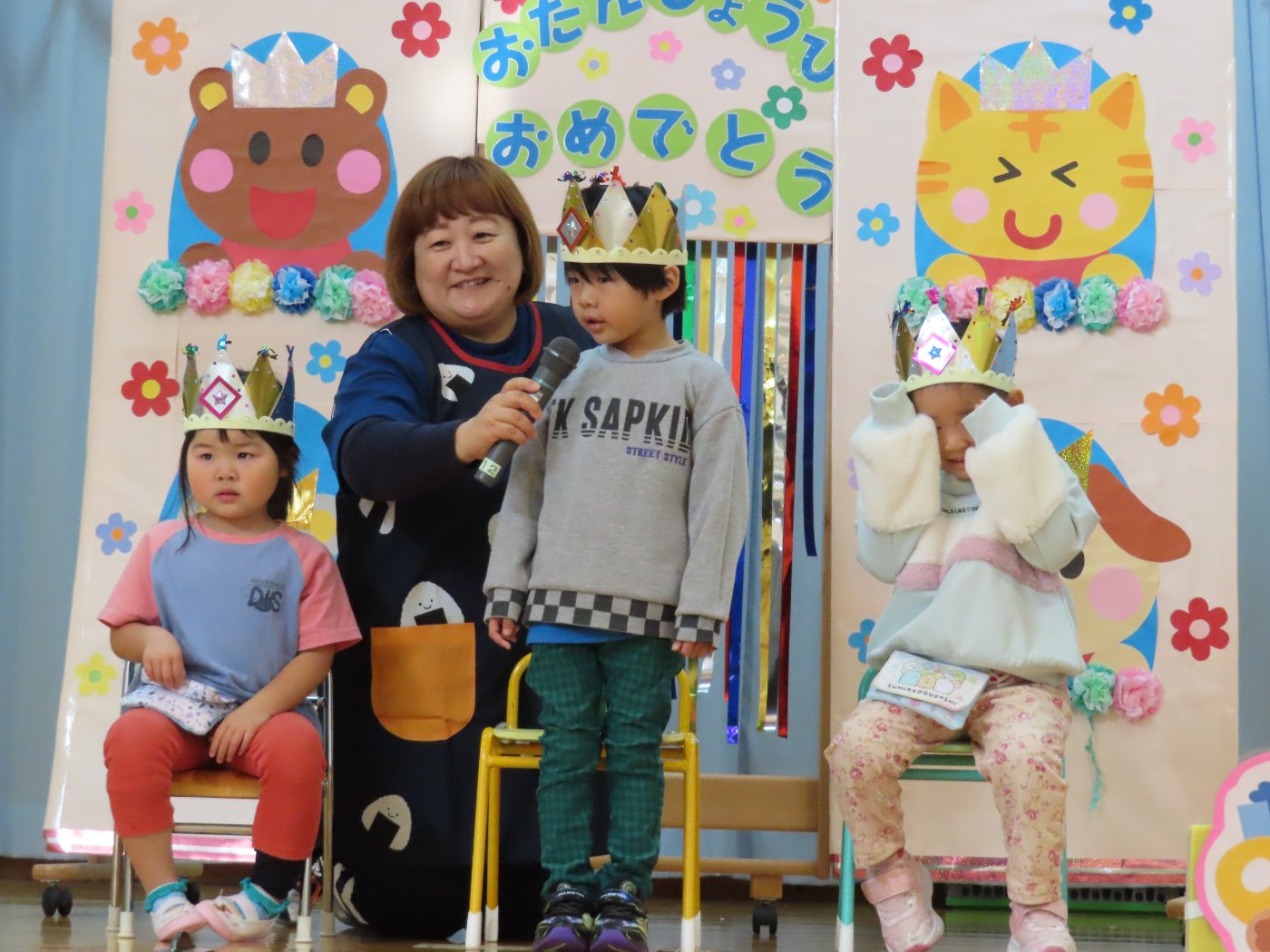 今日は、10月生まれの『誕生会』☆彡つくし組1名 、いちご組2名の友達のお祝いをしました。初体験の誕生会に嬉し恥ずかしそうないちご組の誕生児、待ちわびていた誕生会に ウキウキしていたつくし組の誕生児。いざ、ステージに上がると少し緊張したようですが、親しんできた友達との質問のやり取り、たくさんの拍手やお祝いの歌を受けると段々と表情も和ぎ、年に一度の特別な日を楽しんでいました。
