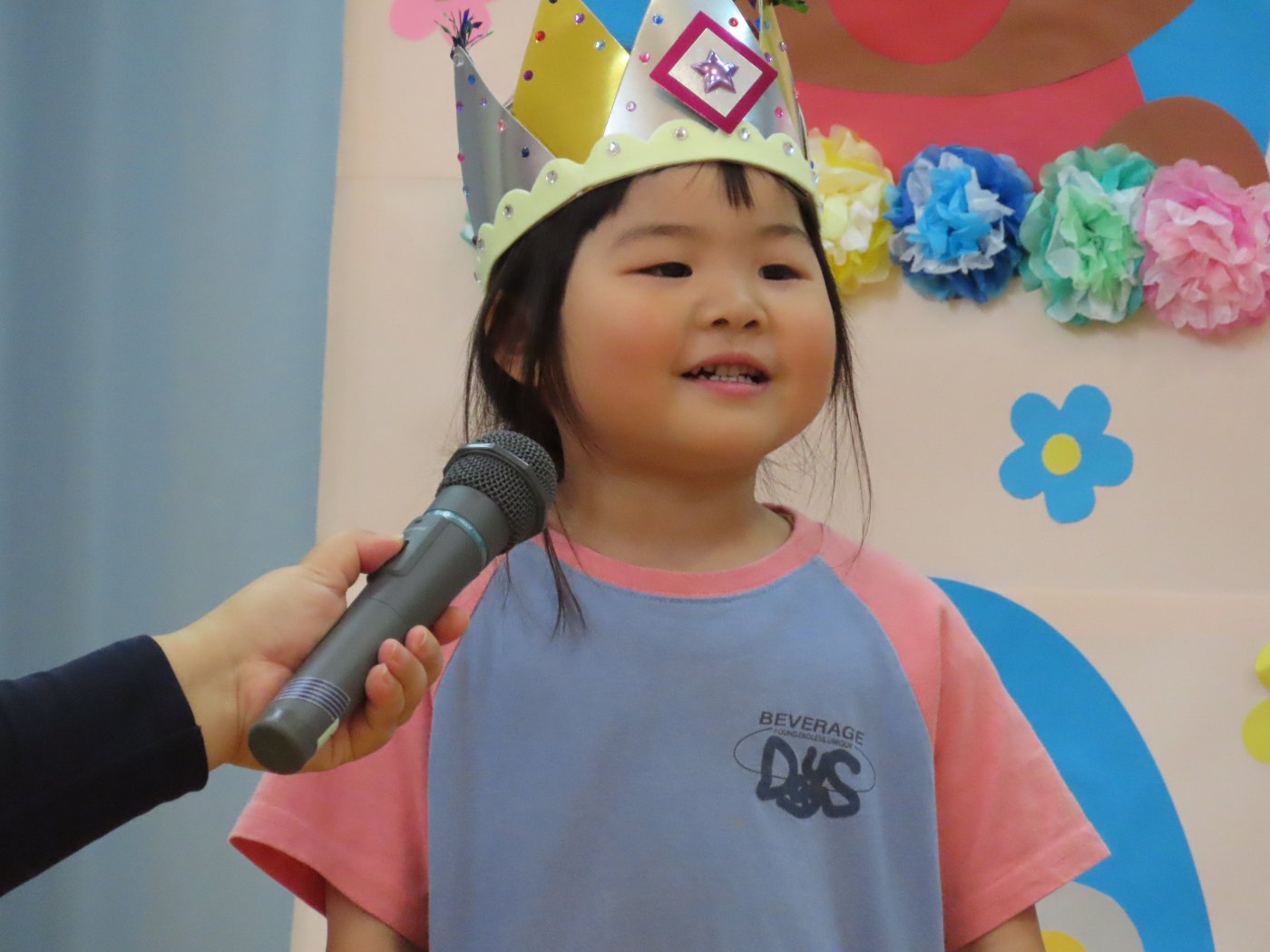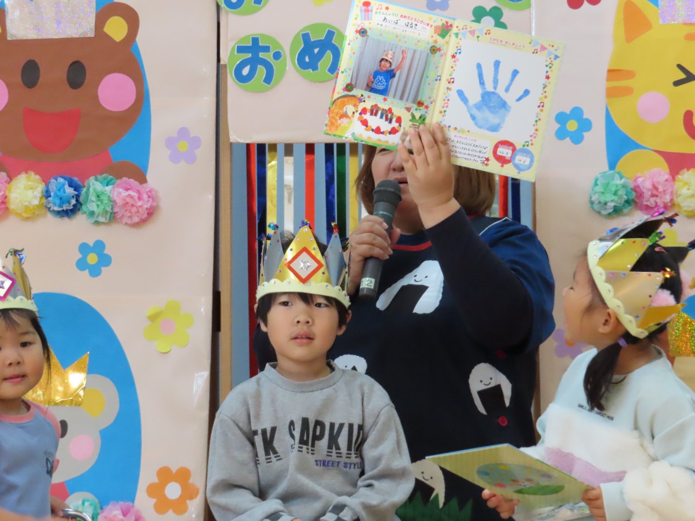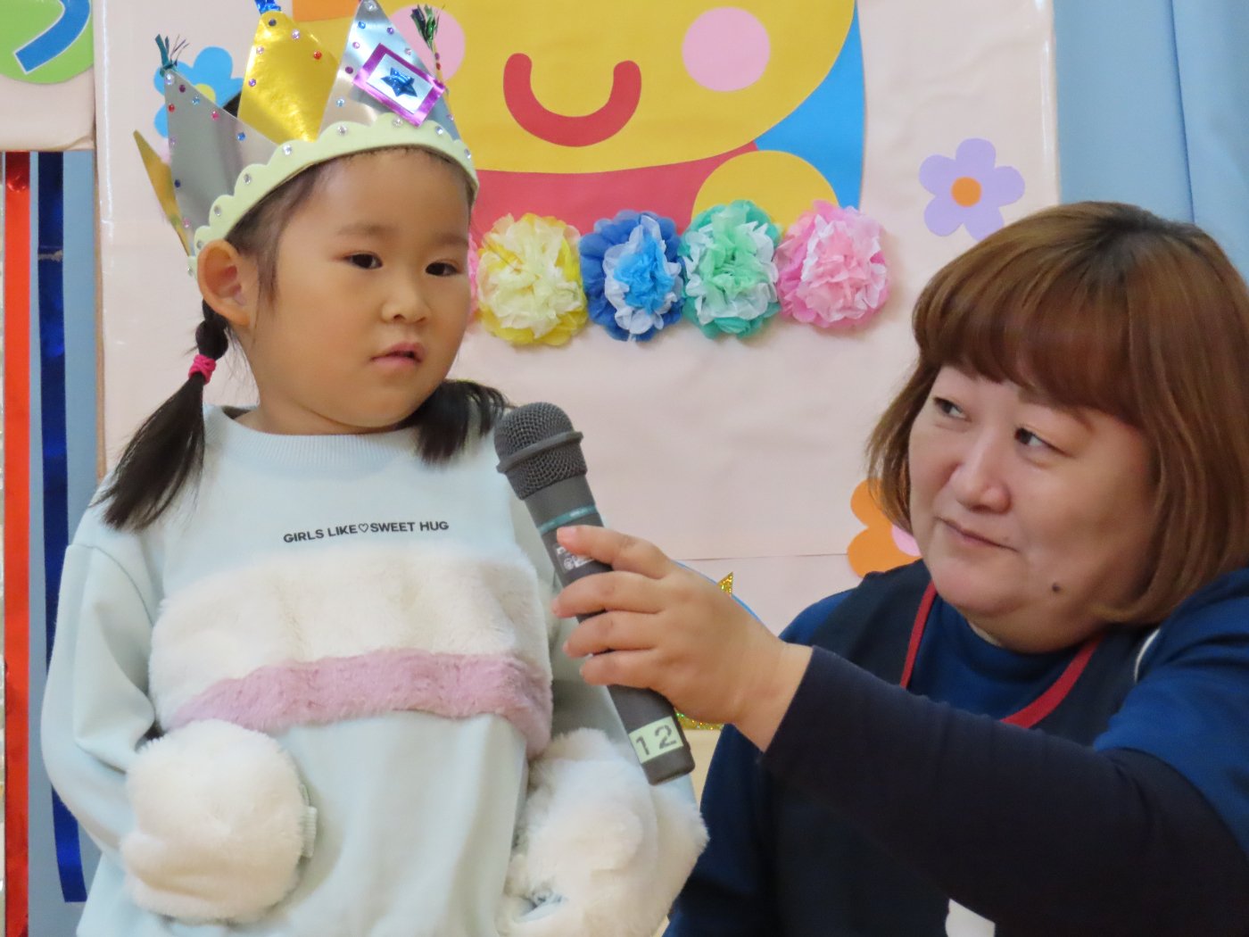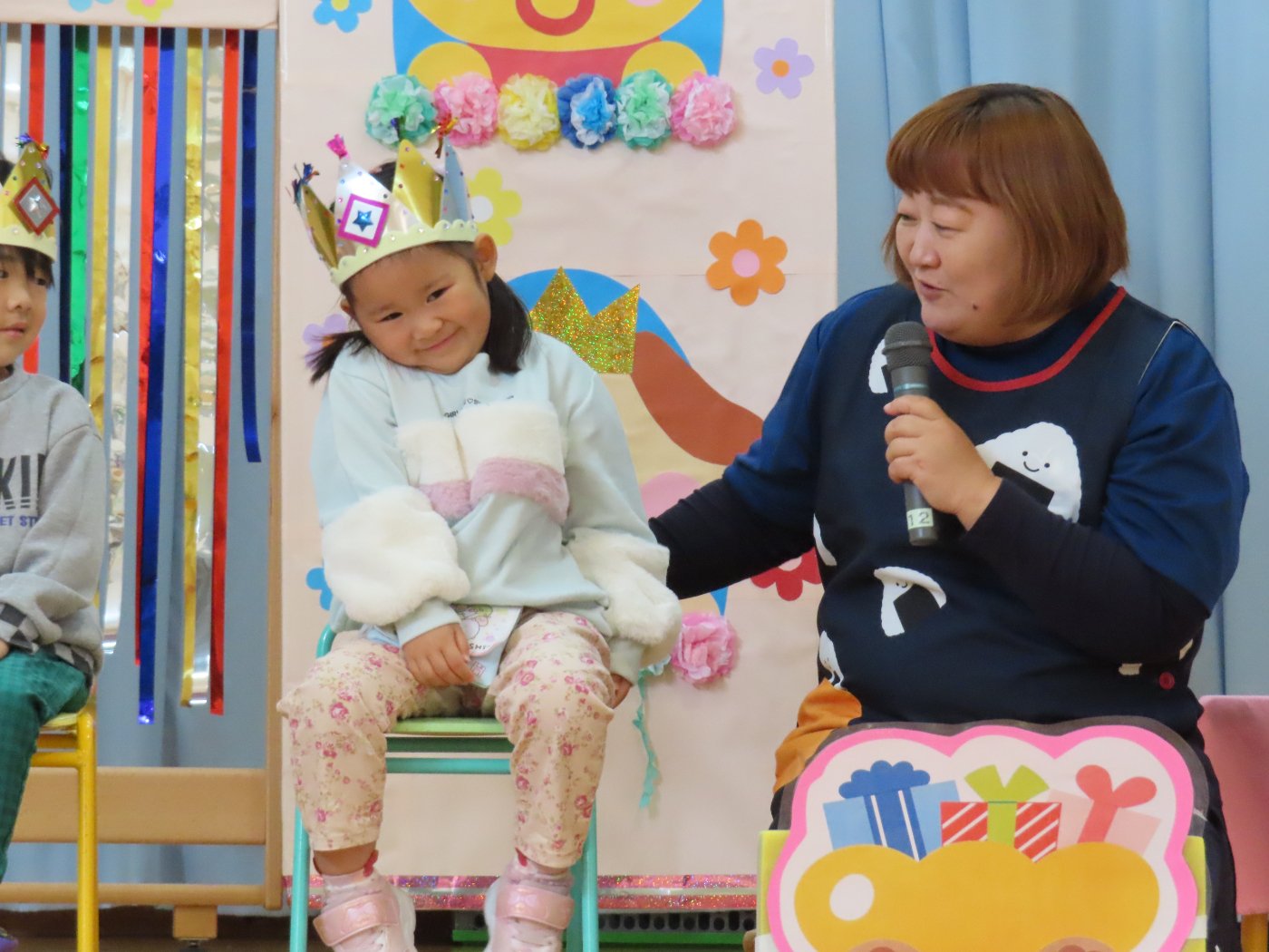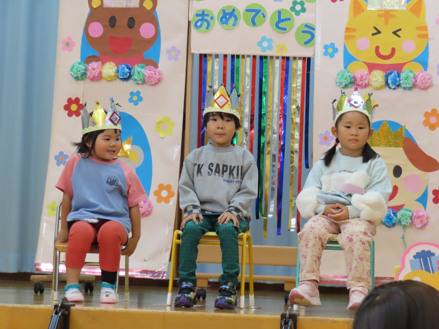 今日は、10月生まれの『誕生会』☆彡つくし組1名 、いちご組2名の友達のお祝いをしました。初体験の誕生会に嬉し恥ずかしそうないちご組の誕生児、待ちわびていた誕生会に ウキウキしていたつくし組の誕生児。いざ、ステージに上がると少し緊張したようですが、親しんできた友達との質問のやり取り、たくさんの拍手やお祝いの歌を受けると段々と表情も和ぎ、年に一度の特別な日を楽しんでいました。