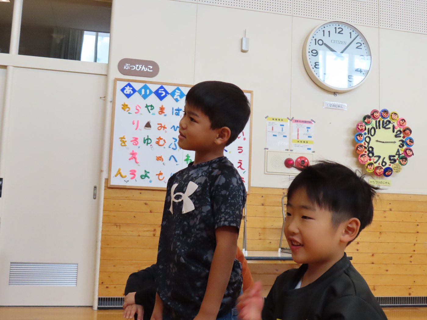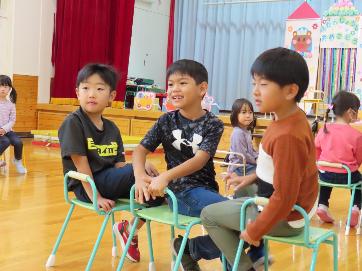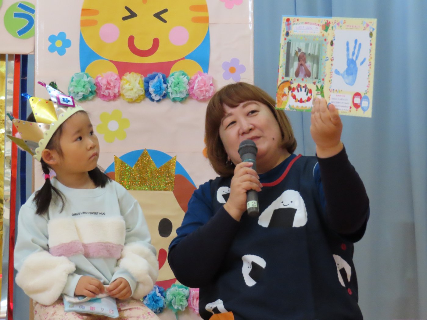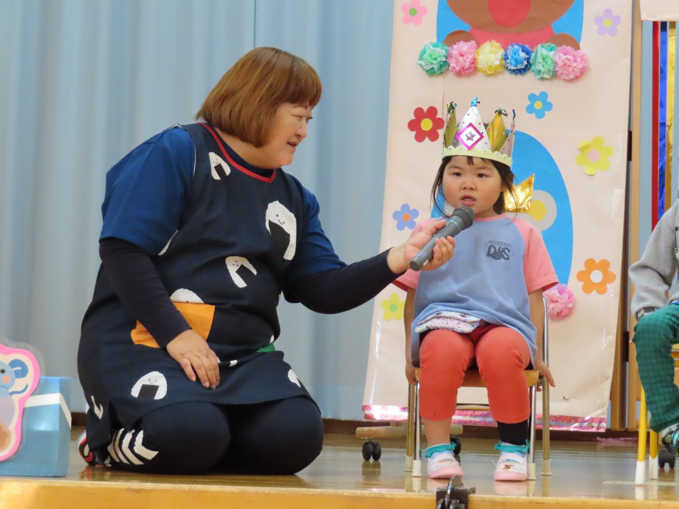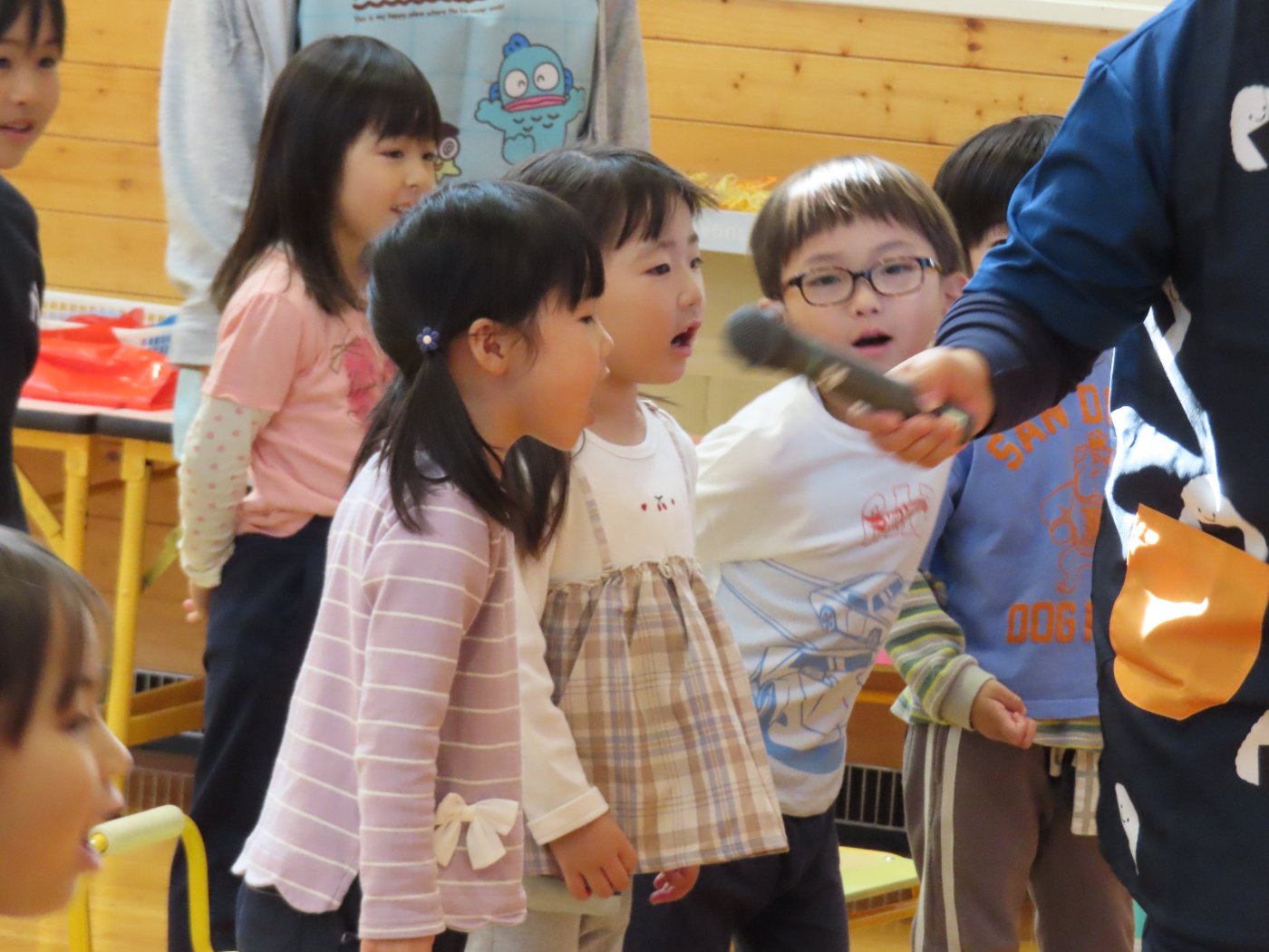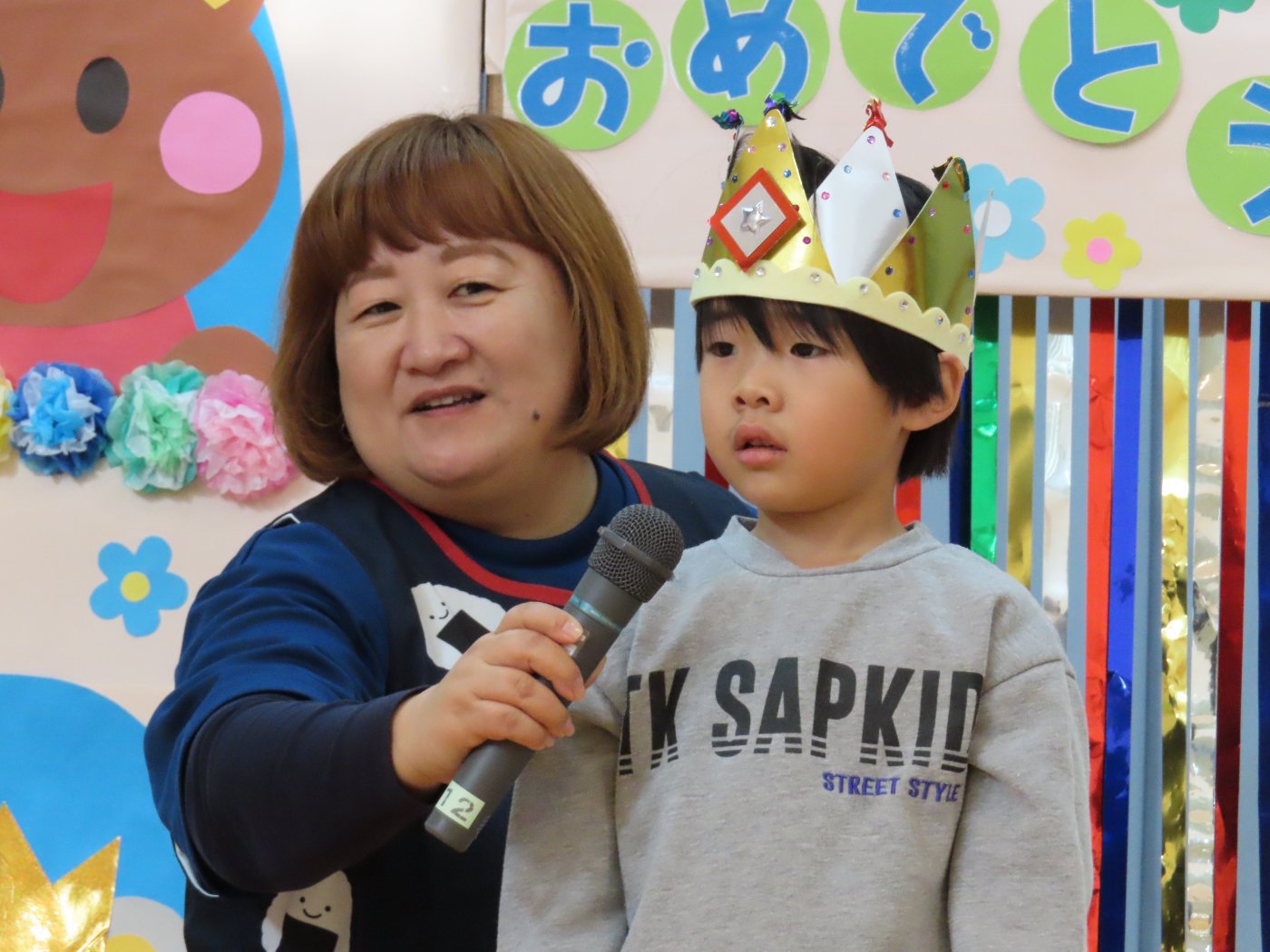 今日は、10月生まれの『誕生会』☆彡つくし組1名 、いちご組2名の友達のお祝いをしました。初体験の誕生会に嬉し恥ずかしそうないちご組の誕生児、待ちわびていた誕生会に ウキウキしていたつくし組の誕生児。いざ、ステージに上がると少し緊張したようですが、親しんできた友達との質問のやり取り、たくさんの拍手やお祝いの歌を受けると段々と表情も和ぎ、年に一度の特別な日を楽しんでいました。
