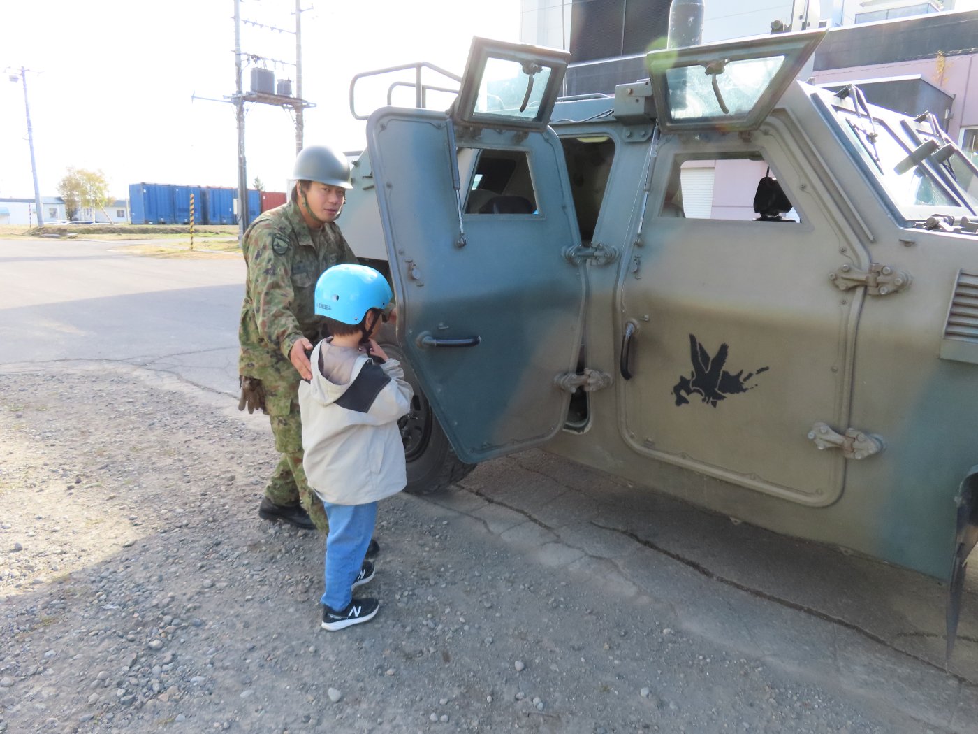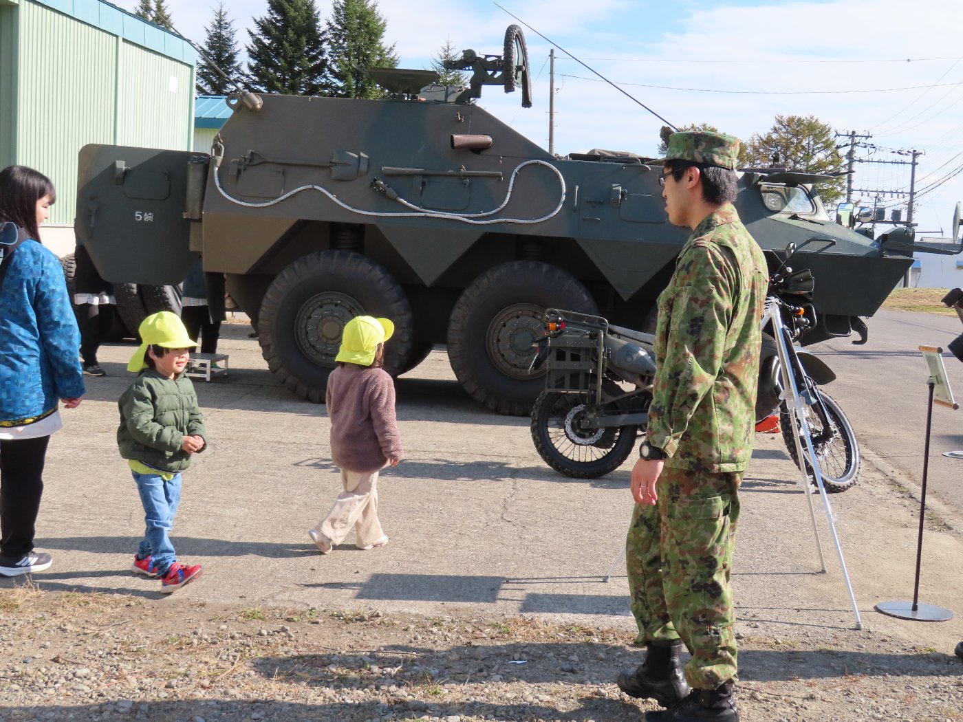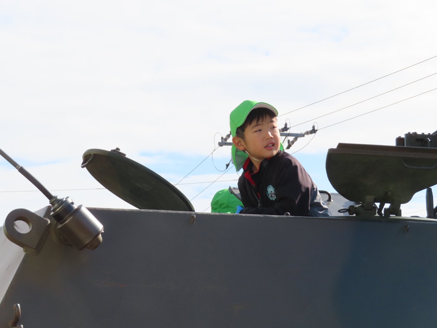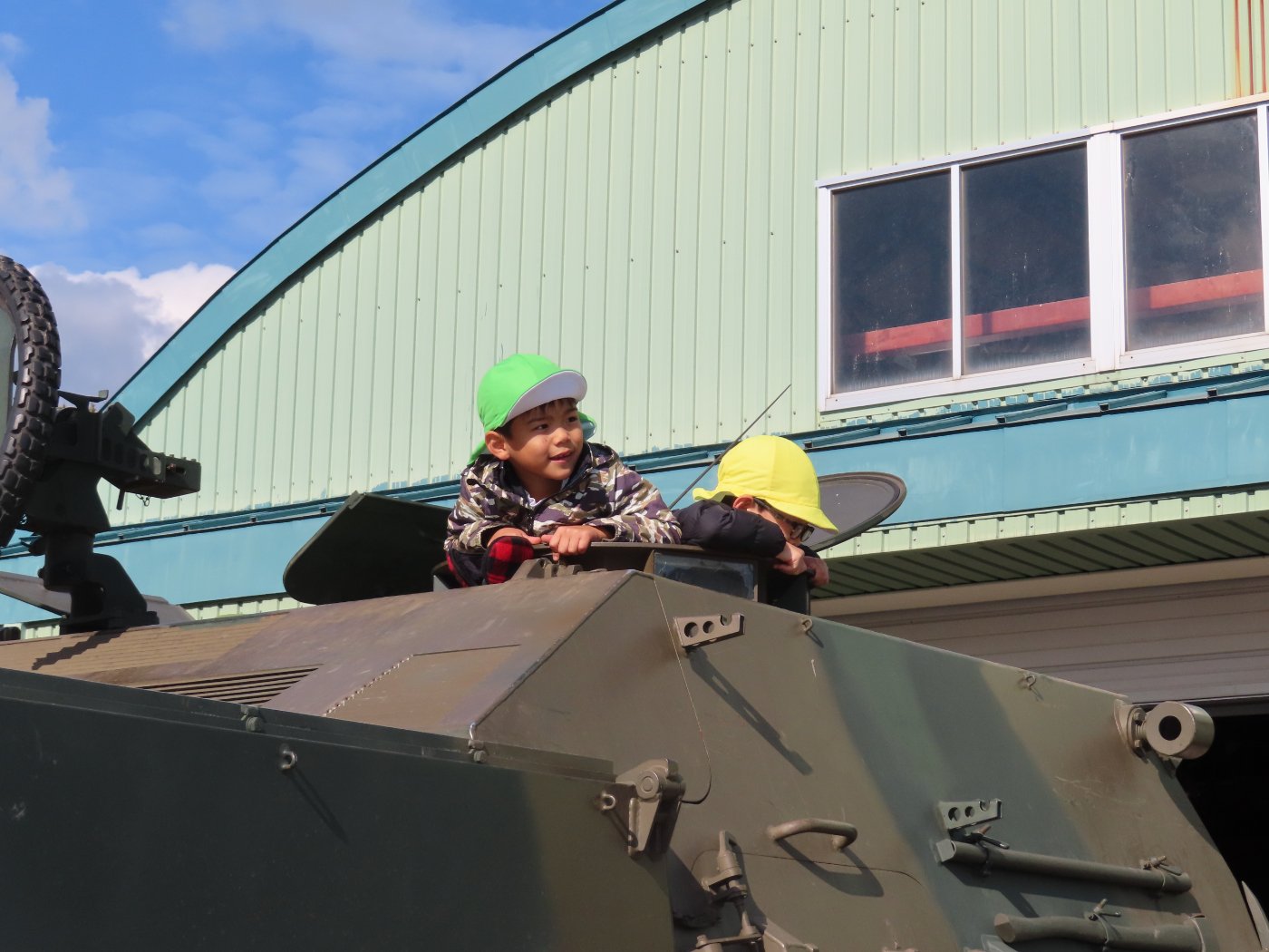 初めて駐屯地の敷地内に入った子も、記念行事で足を運んだことがある子も、目に映るもの全てのもの・ことに興味深々の様子でした。自衛隊といえば、姿勢正しい礼儀や機敏・迅速な動作! 挨拶を交わした後は、さっそく、号令を受けて姿勢を変える・行動を起こすなどの『基本教練』を見せていただきました。揃っている動作や無駄のない動き、5段階もの動作がある匍匐(ほふく)前進を見て、感動の声を上げていました。続いて、展示している戦車やオートバイを間近に見学・試乗、現役の装甲車にも試乗体験!敷地内を走行してもらい、大興奮の子ども達でした。最後は、自衛官さんをお手本に『基本教練』や『匍匐(ほふく)前進』も体験しました。同じように「できた~⤴⤴」と自己肯定感高めな子ども達でしたよ(^^♪