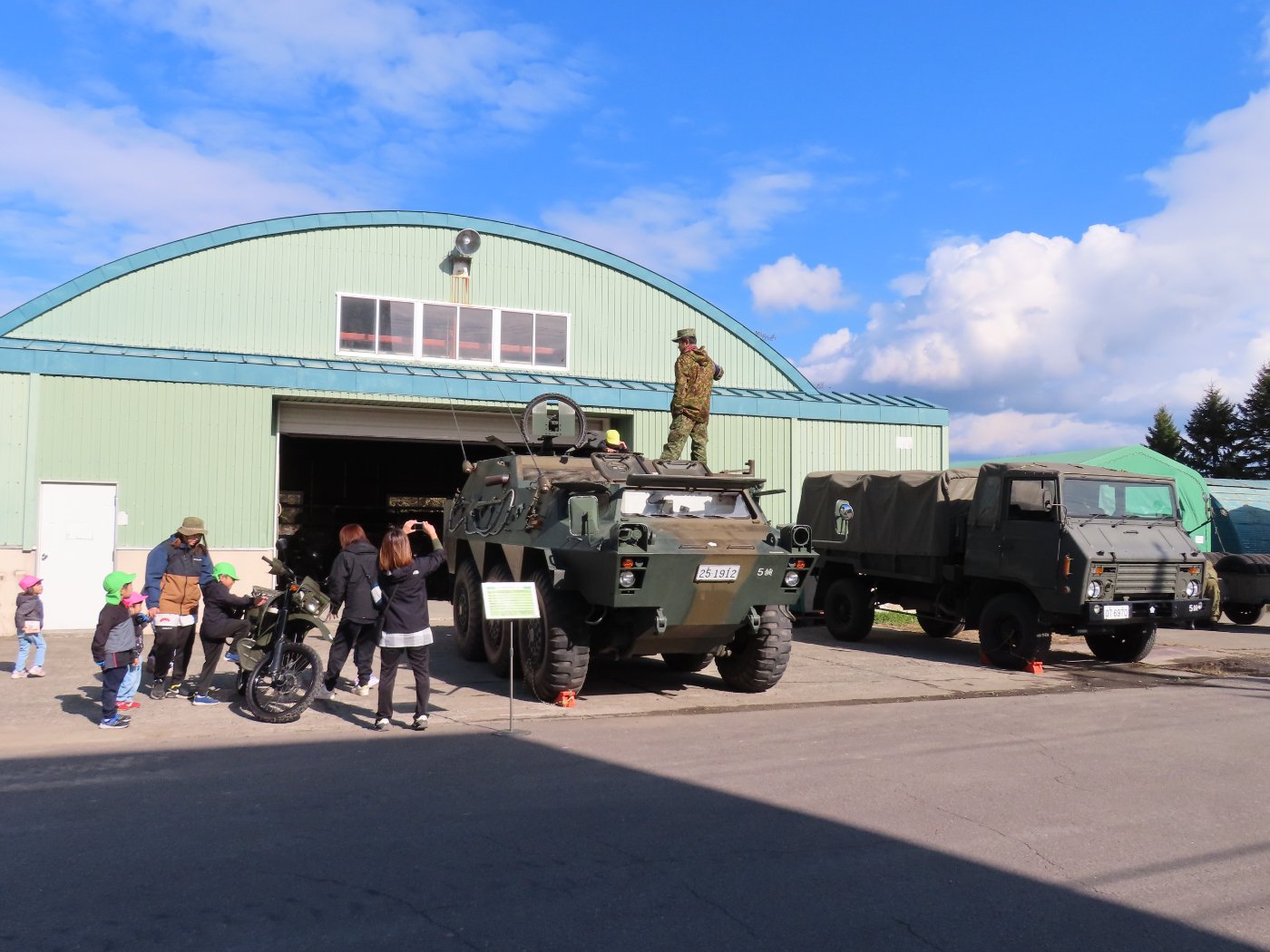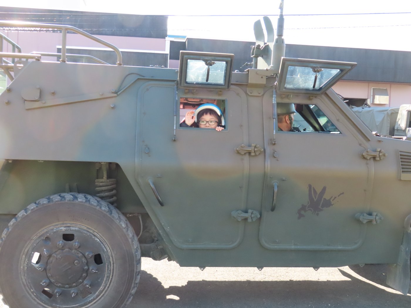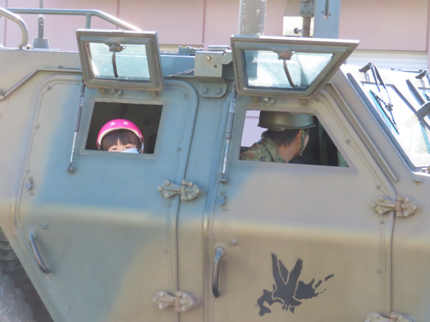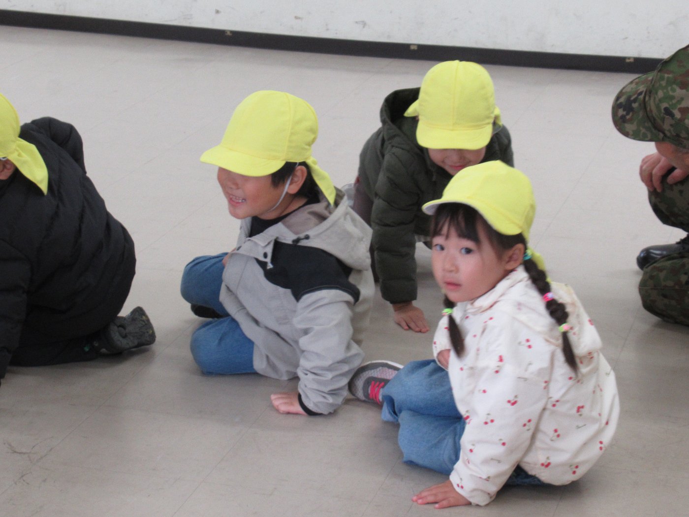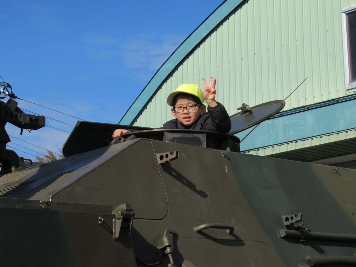初めて駐屯地の敷地内に入った子も、記念行事で足を運んだことがある子も、目に映るもの全てのもの・ことに興味深々の様子でした。自衛隊といえば、姿勢正しい礼儀や機敏・迅速な動作! 挨拶を交わした後は、さっそく、号令を受けて姿勢を変える・行動を起こすなどの『基本教練』を見せていただきました。揃っている動作や無駄のない動き、5段階もの動作がある匍匐(ほふく)前進を見て、感動の声を上げていました。続いて、展示している戦車やオートバイを間近に見学・試乗、現役の装甲車にも試乗体験!敷地内を走行してもらい、大興奮の子ども達でした。最後は、自衛官さんをお手本に『基本教練』や『匍匐(ほふく)前進』も体験しました。同じように「できた~⤴⤴」と自己肯定感高めな子ども達でしたよ(^^♪