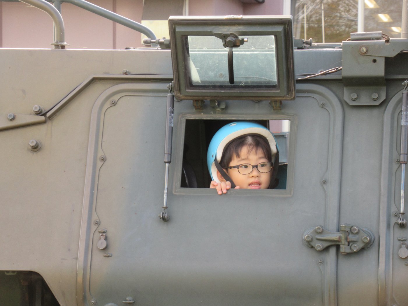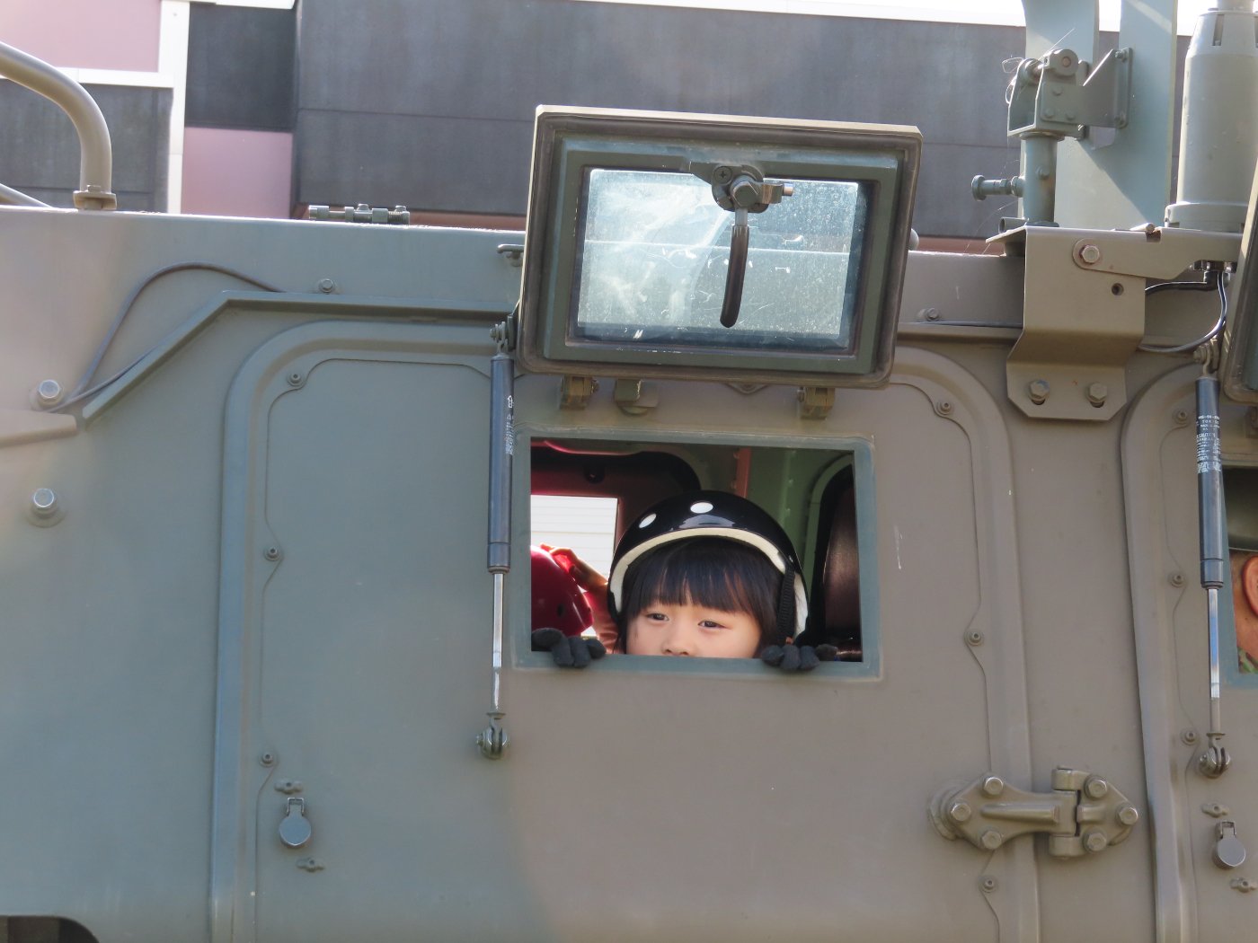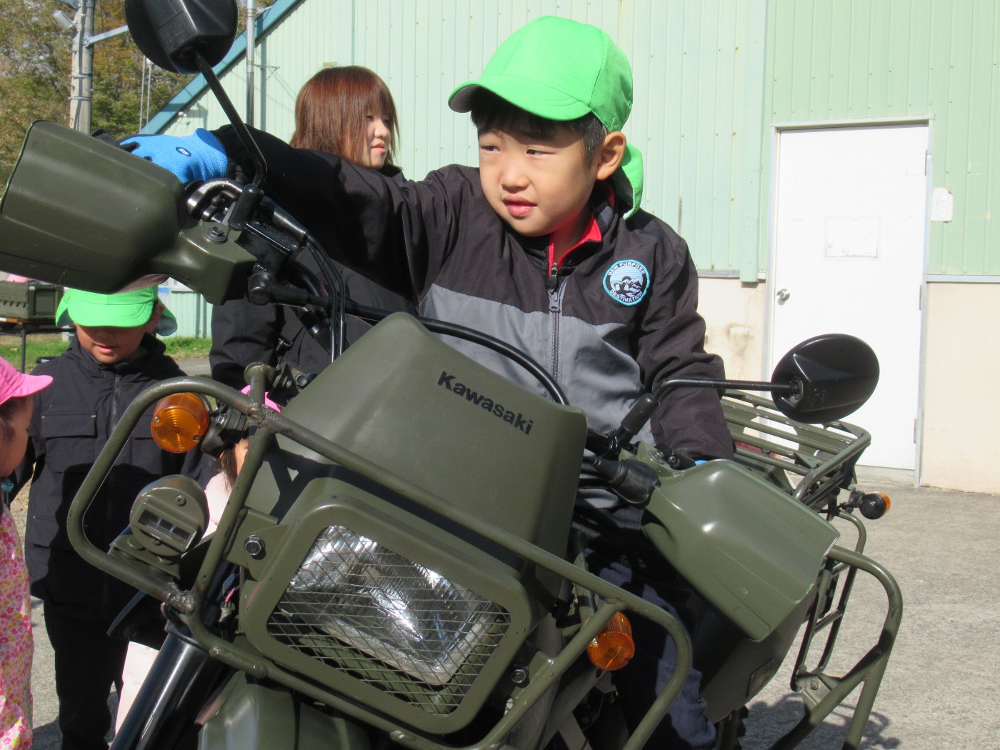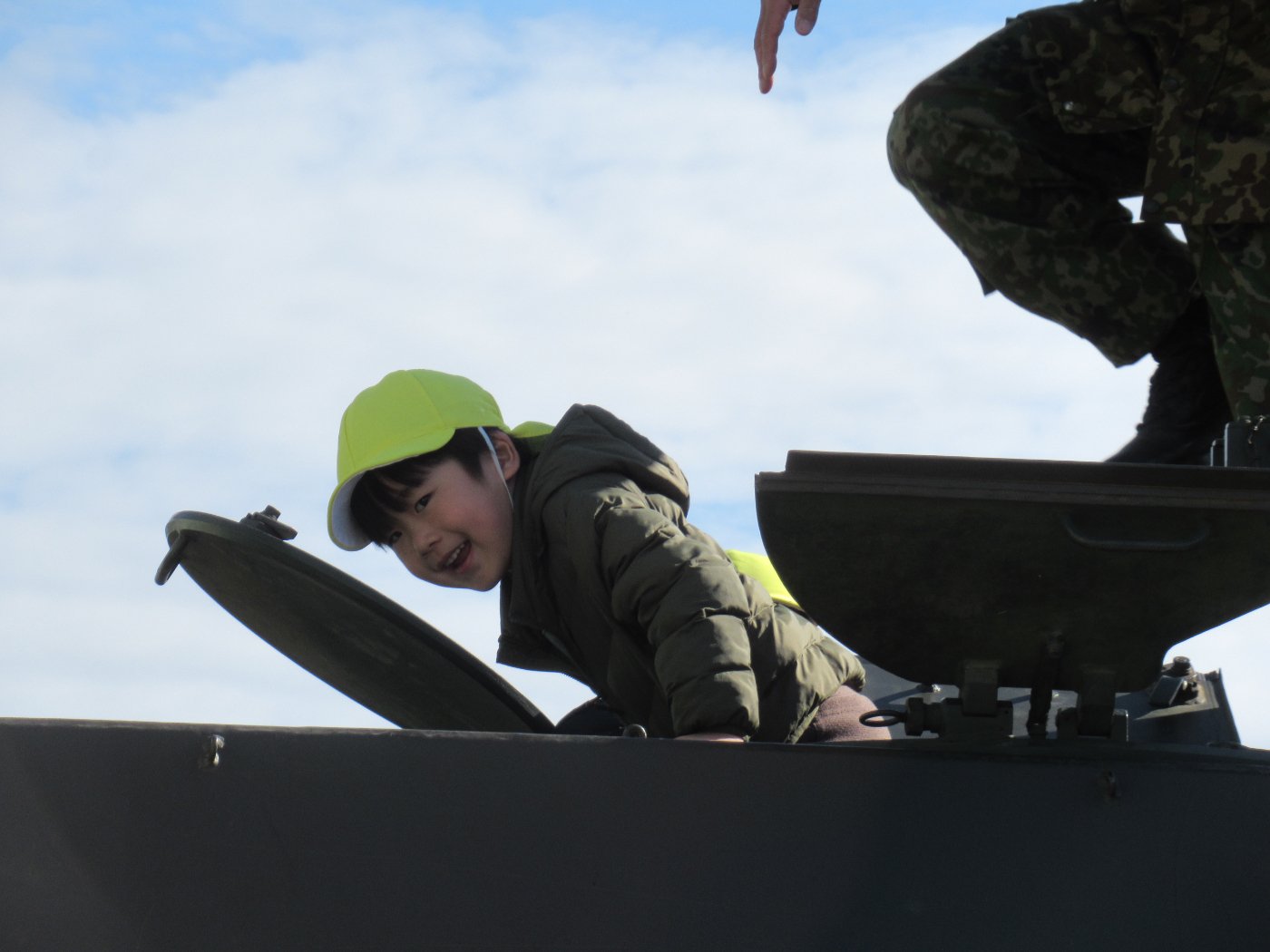 初めて駐屯地の敷地内に入った子も、記念行事で足を運んだことがある子も、目に映るもの全てのもの・ことに興味深々の様子でした。自衛隊といえば、姿勢正しい礼儀や機敏・迅速な動作! 挨拶を交わした後は、さっそく、号令を受けて姿勢を変える・行動を起こすなどの『基本教練』を見せていただきました。揃っている動作や無駄のない動き、5段階もの動作がある匍匐(ほふく)前進を見て、感動の声を上げていました。続いて、展示している戦車やオートバイを間近に見学・試乗、現役の装甲車にも試乗体験!敷地内を走行してもらい、大興奮の子ども達でした。最後は、自衛官さんをお手本に『基本教練』や『匍匐(ほふく)前進』も体験しました。同じように「できた~⤴⤴」と自己肯定感高めな子ども達でしたよ(^^♪