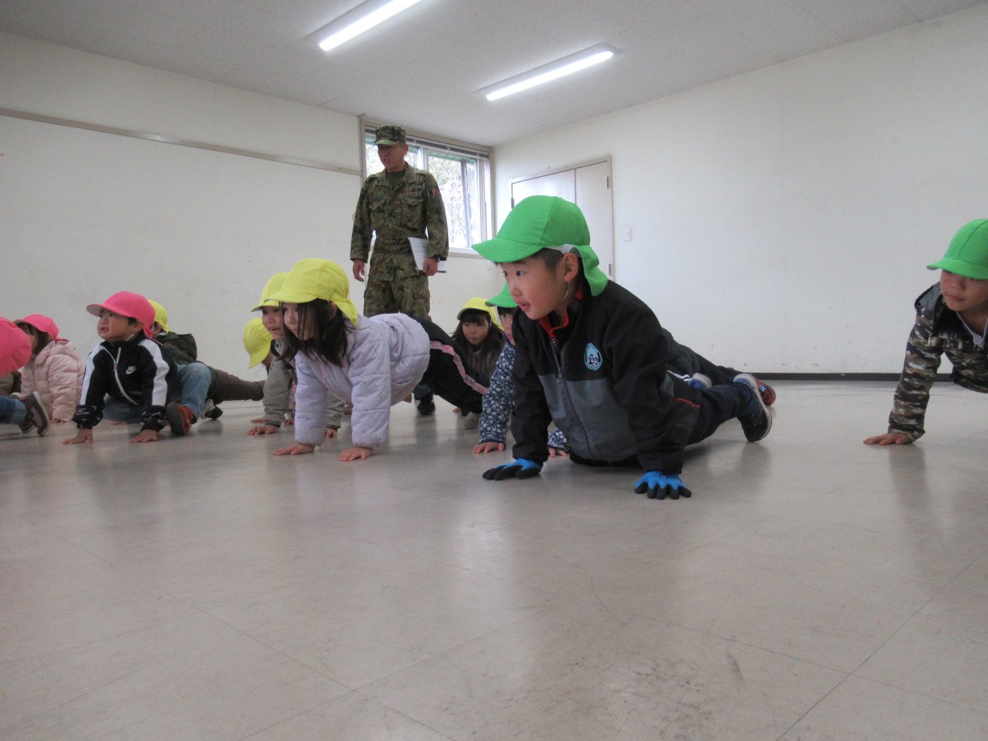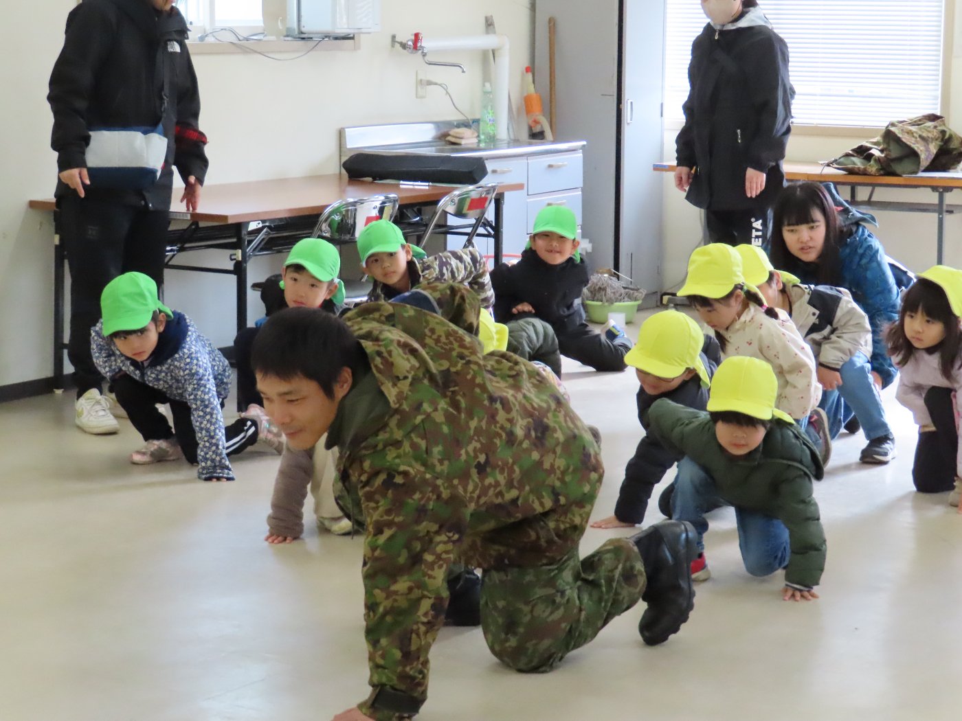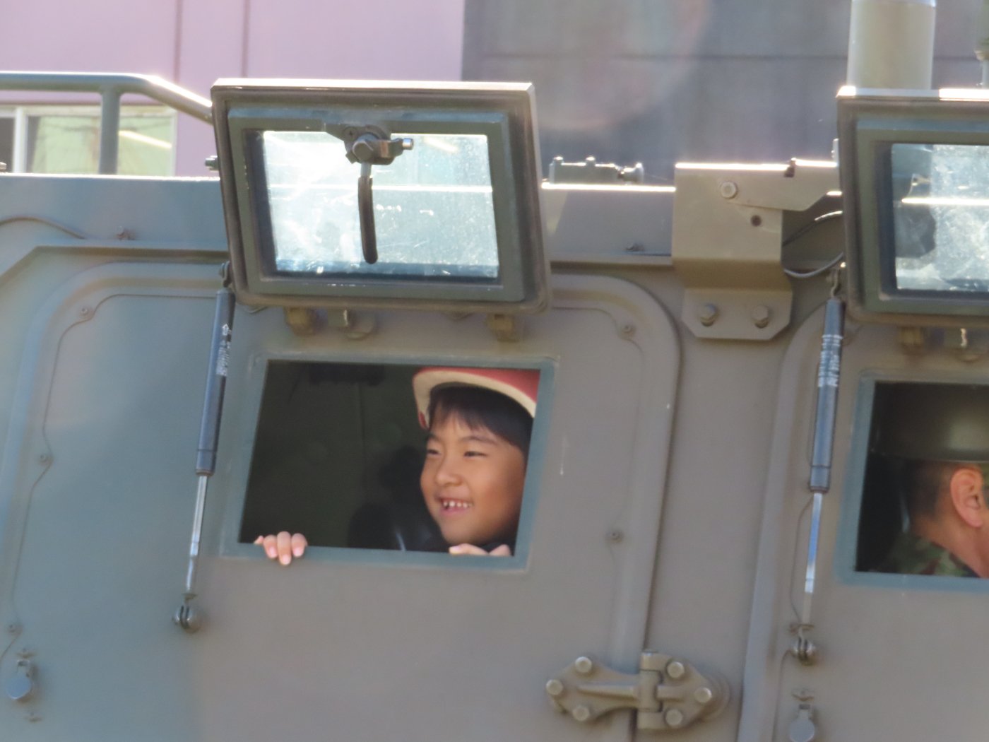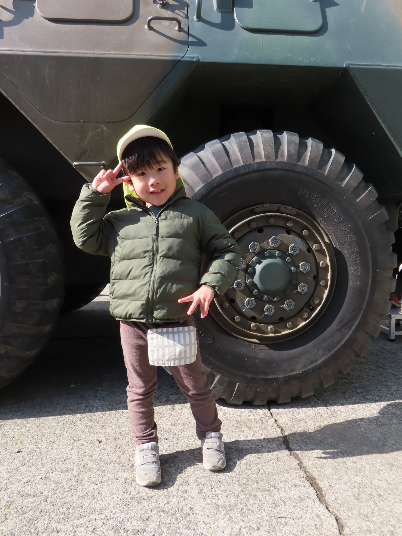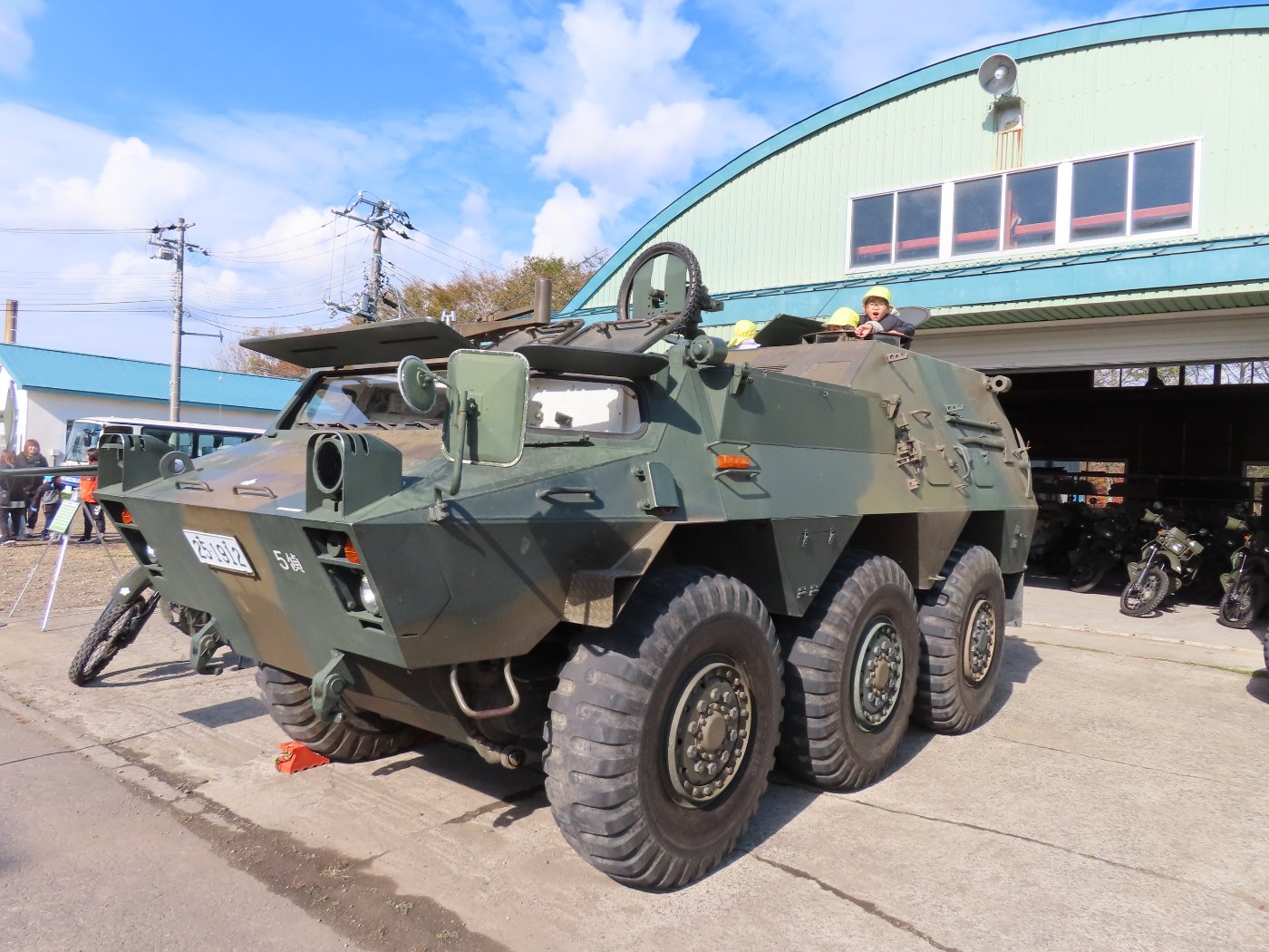 初めて駐屯地の敷地内に入った子も、記念行事で足を運んだことがある子も、目に映るもの全てのもの・ことに興味深々の様子でした。自衛隊といえば、姿勢正しい礼儀や機敏・迅速な動作! 挨拶を交わした後は、さっそく、号令を受けて姿勢を変える・行動を起こすなどの『基本教練』を見せていただきました。揃っている動作や無駄のない動き、5段階もの動作がある匍匐(ほふく)前進を見て、感動の声を上げていました。続いて、展示している戦車やオートバイを間近に見学・試乗、現役の装甲車にも試乗体験!敷地内を走行してもらい、大興奮の子ども達でした。最後は、自衛官さんをお手本に『基本教練』や『匍匐(ほふく)前進』も体験しました。同じように「できた~⤴⤴」と自己肯定感高めな子ども達でしたよ(^^♪
