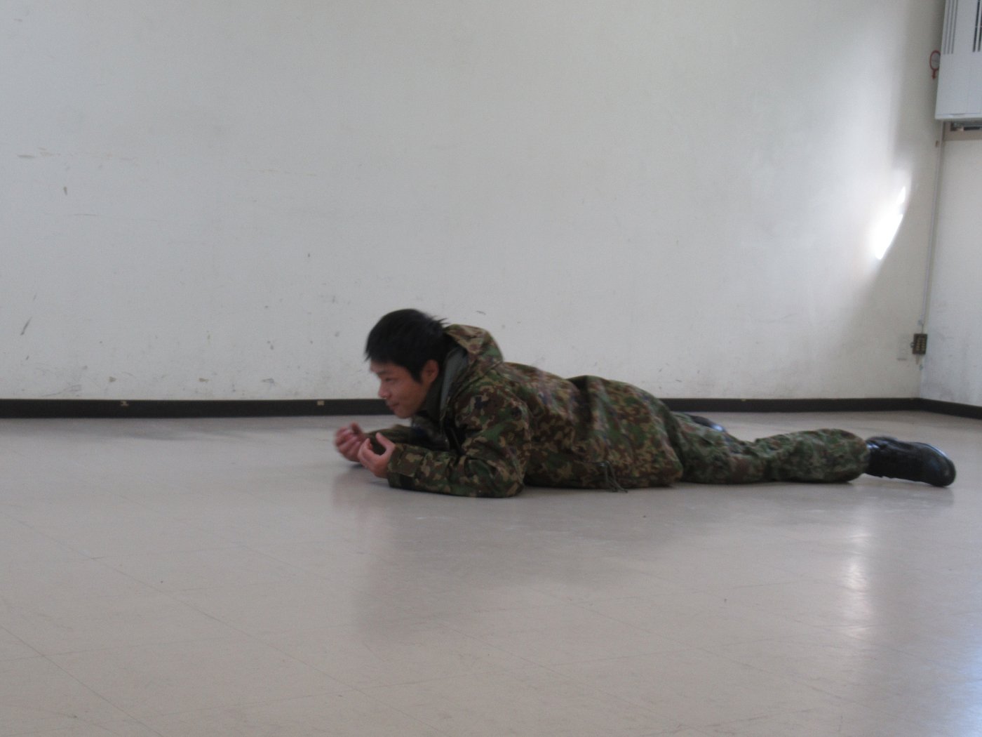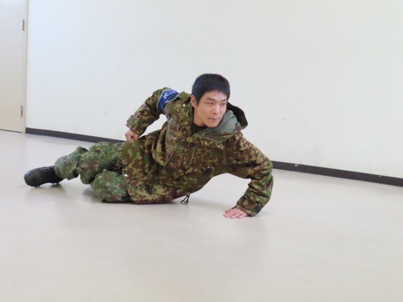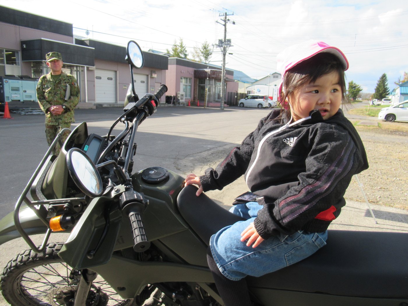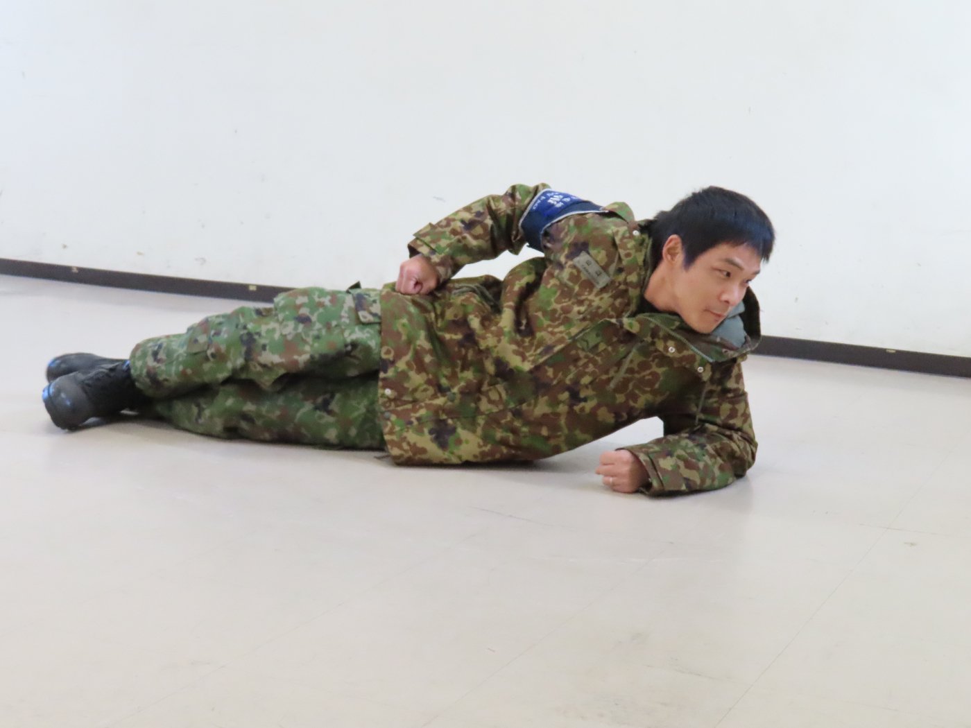 初めて駐屯地の敷地内に入った子も、記念行事で足を運んだことがある子も、目に映るもの全てのもの・ことに興味深々の様子でした。自衛隊といえば、姿勢正しい礼儀や機敏・迅速な動作! 挨拶を交わした後は、さっそく、号令を受けて姿勢を変える・行動を起こすなどの『基本教練』を見せていただきました。揃っている動作や無駄のない動き、5段階もの動作がある匍匐(ほふく)前進を見て、感動の声を上げていました。続いて、展示している戦車やオートバイを間近に見学・試乗、現役の装甲車にも試乗体験!敷地内を走行してもらい、大興奮の子ども達でした。最後は、自衛官さんをお手本に『基本教練』や『匍匐(ほふく)前進』も体験しました。同じように「できた~⤴⤴」と自己肯定感高めな子ども達でしたよ(^^♪