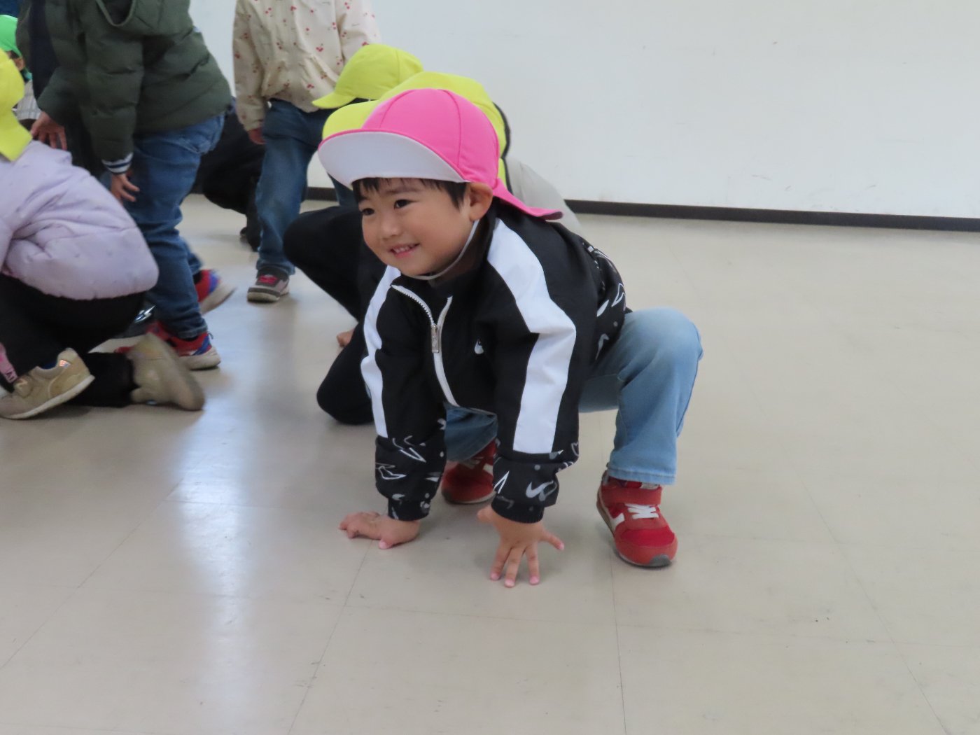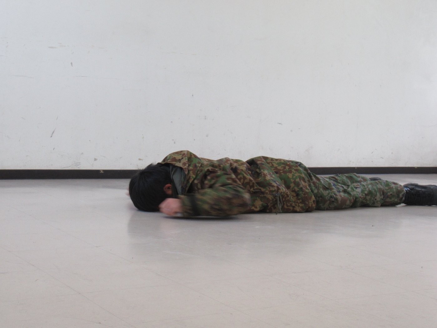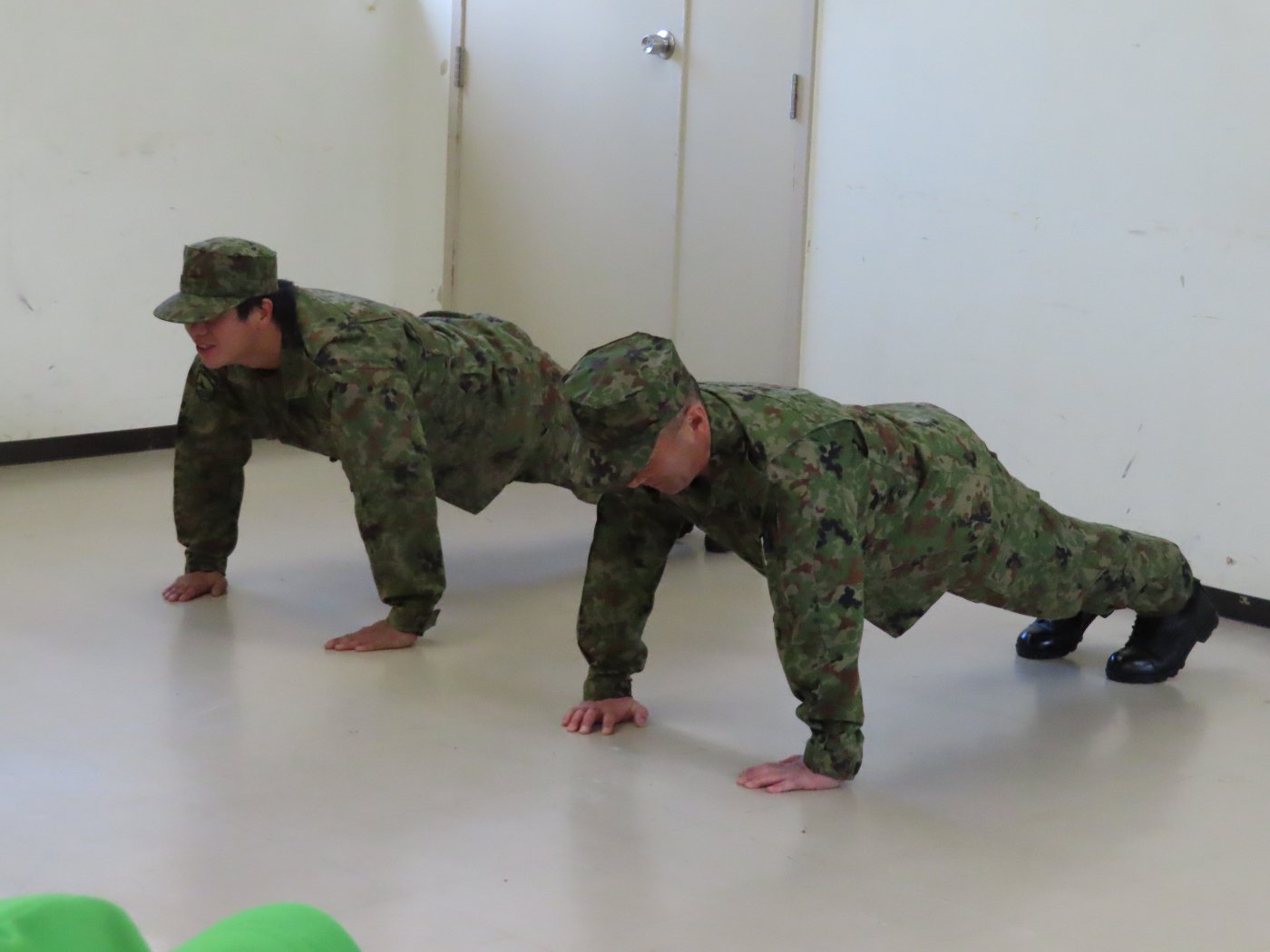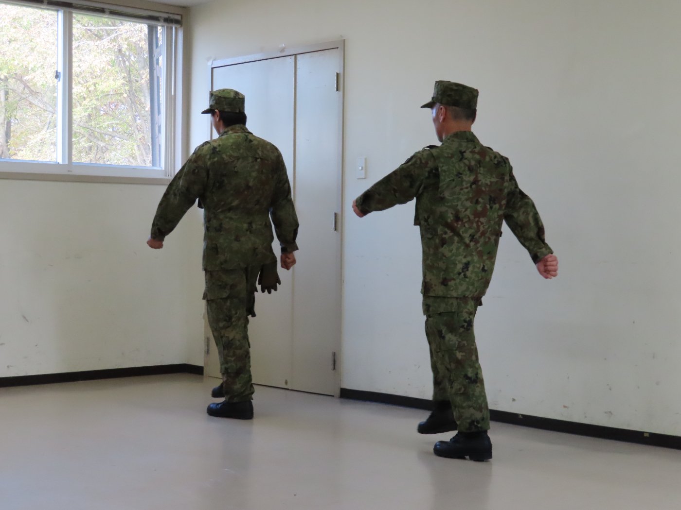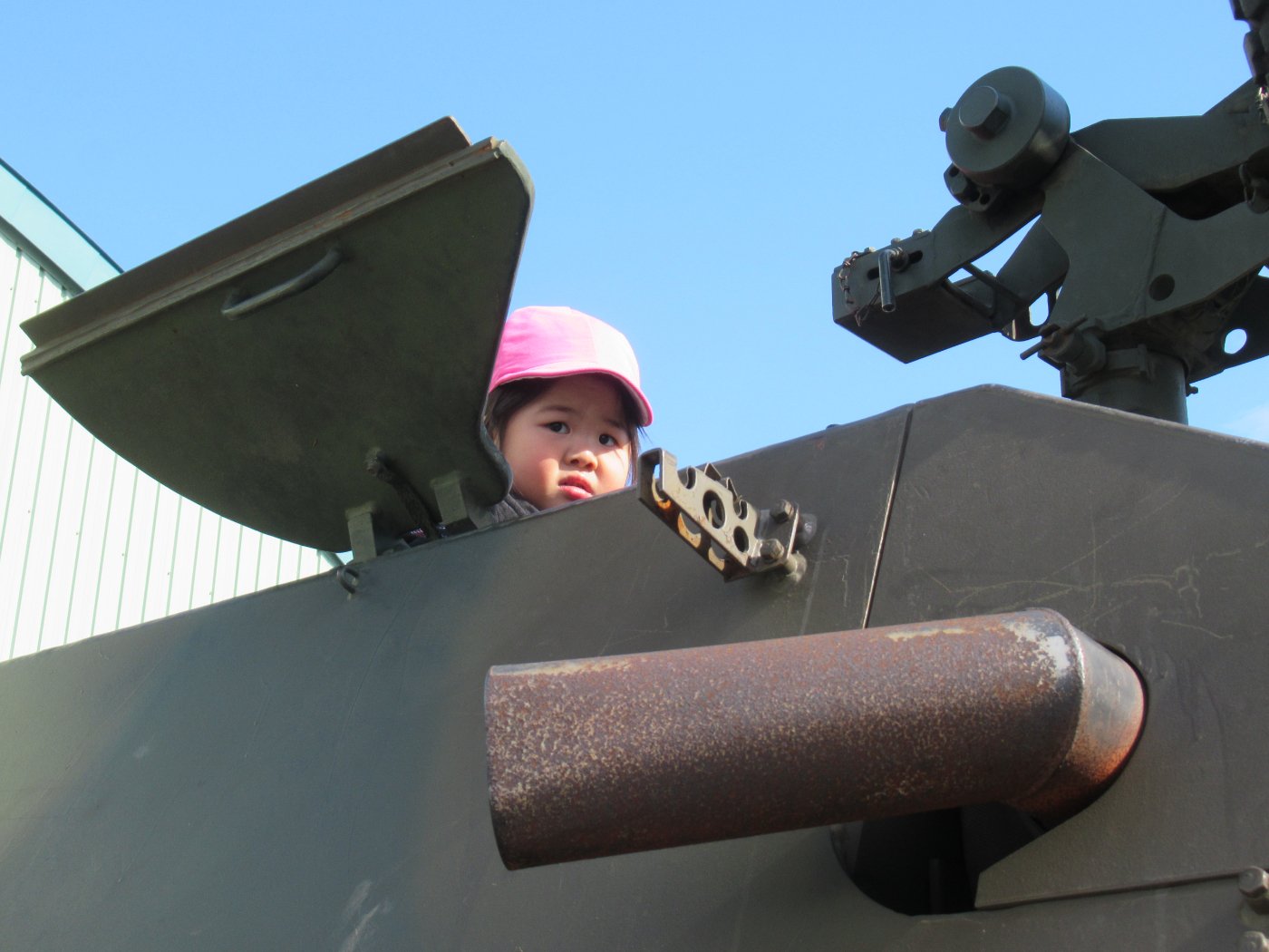 初めて駐屯地の敷地内に入った子も、記念行事で足を運んだことがある子も、目に映るもの全てのもの・ことに興味深々の様子でした。自衛隊といえば、姿勢正しい礼儀や機敏・迅速な動作! 挨拶を交わした後は、さっそく、号令を受けて姿勢を変える・行動を起こすなどの『基本教練』を見せていただきました。揃っている動作や無駄のない動き、5段階もの動作がある匍匐(ほふく)前進を見て、感動の声を上げていました。続いて、展示している戦車やオートバイを間近に見学・試乗、現役の装甲車にも試乗体験!敷地内を走行してもらい、大興奮の子ども達でした。最後は、自衛官さんをお手本に『基本教練』や『匍匐(ほふく)前進』も体験しました。同じように「できた~⤴⤴」と自己肯定感高めな子ども達でしたよ(^^♪