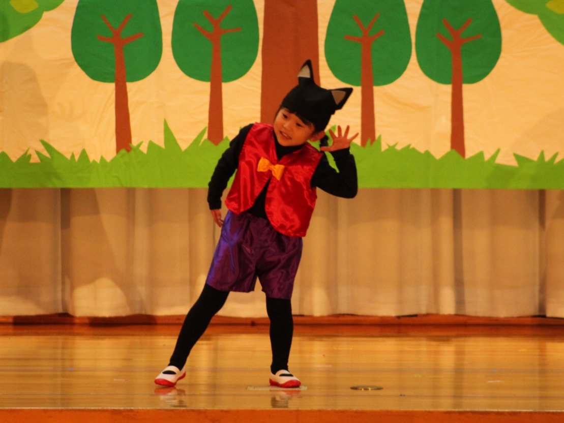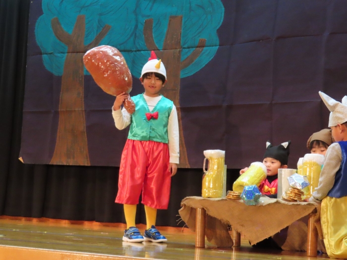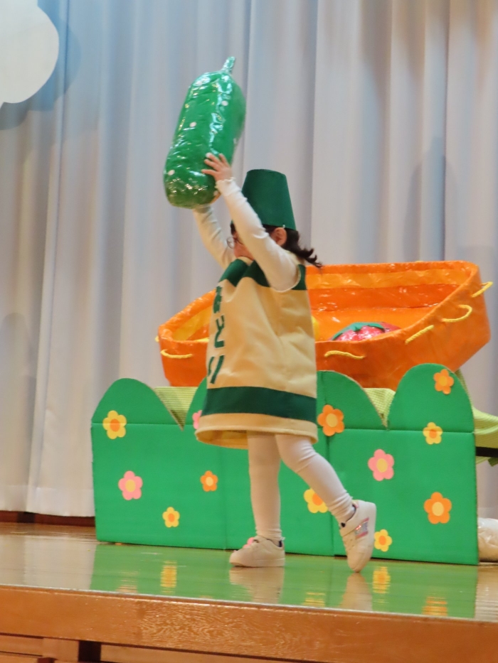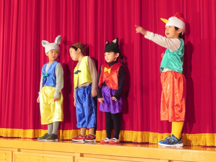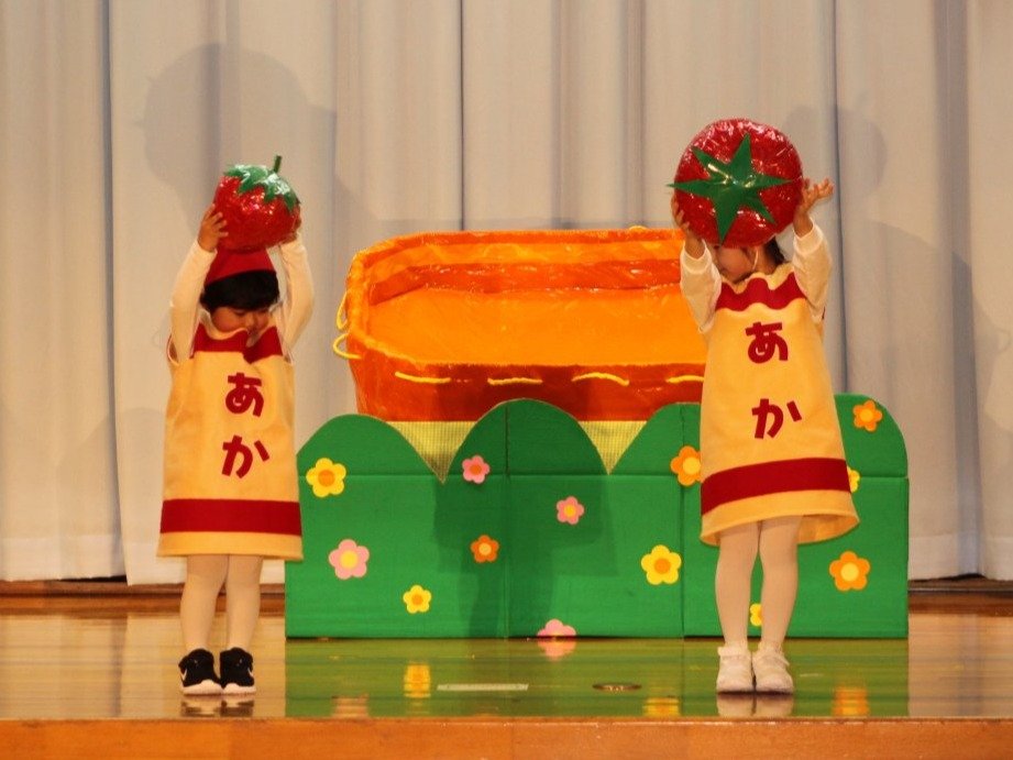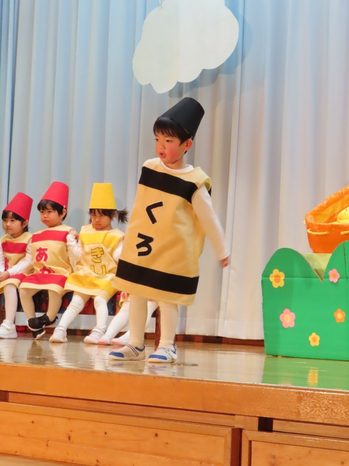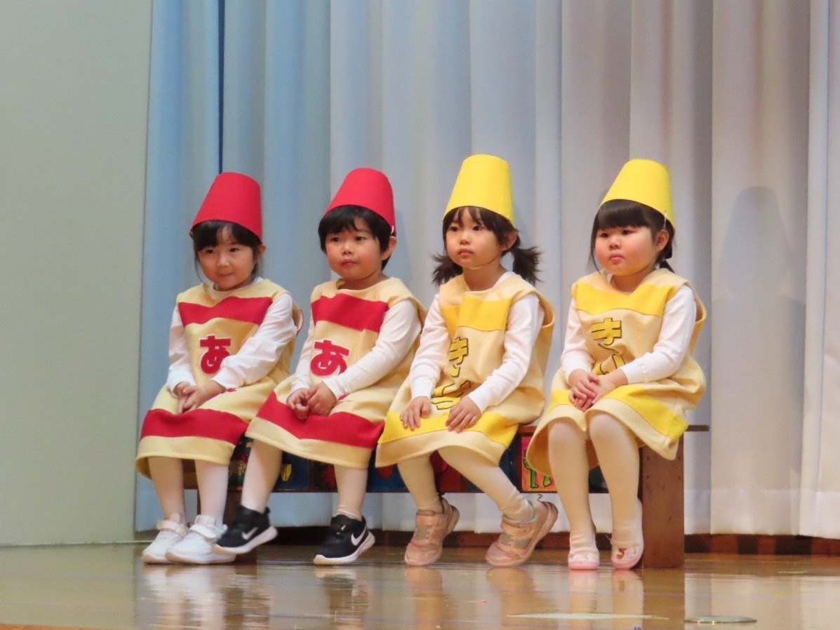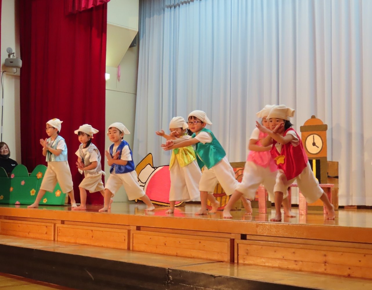 輝いていたね☆彡『第50回ゆめの会』part2 2025年12月21日(日) NEW 行事 10.いちご組/劇遊び『くれよんたちの きょうはなにをかこうかな?』 かわいいクレヨンたちが勢揃い! 自分の好きな色のクレヨンに へ~んしん! ♬どんな色が好き?⇒『赤』! ♪赤い色が好き 赤色クレヨンたちは、『イチゴ』と『トマト』を描いてお弁当箱へ 元気いっぱいの歌声♬ 他の色のクレヨンたちも元気ハツラツな歌声 (^^♪ 黄色クレヨンたちは、『卵焼き』を描いてお弁当箱へ 一人でも、パワフル声量の緑色クレヨン(^^♪ もちろん! 他のクレヨンたちも一緒に歌います♫ ジャジャーン☆彡『キュウリ』を描いてお弁当箱へ リズムに乗って、ウキウキ登場☆彡『紫』クレヨン ジャジャーン☆彡『ブドウ』を描いてお弁当箱へ 元気いっぱい大きな振りで ♫一番先になくなるよ 茶色いクレヨン ジャジャーン☆彡『チョコレート』が飛び出した時は、予想外で会場から驚きの声 最後は、黒色クレヨンが登場☆彡 黒色クレヨンは、『おにぎり』を描いてお弁当箱へ できあがったお弁当を持って、ピクニックへ! 「準備はいいですか?」黒クレヨンの号令で、「それでは皆さんご一緒に!」 い「ただまーす⤴」 頬張る仕草が、これまた可愛い♬ 友達と一緒で楽しい! 普段のクラスの様子が垣間見える劇遊びでした 記念写真☆彡 11.つくし組/オペレッタ『おおかみと しちひきのこやぎ』 開幕とともに、母ヤギ&7匹の子ヤギが登場 お買い物に出かける母ヤギ 子ヤギと約束事を交わします 母さんが帰ってくるまで、扉は絶対開けちゃダメ! 扉は、絶対開けないよ! ♫狙った獲物は逃さない ズンズン迫る音にノッてオオカミ登場☆彡 母さんだったら、もっと優しい声 偽物なんかに、だまされない! 母さんが帰って来るまでは、扉は絶対開けないよ! 再びオオカミ登場☆彡 怖さ&コミカルな動きの表現がナイスです(^^♪ この声は、母さん? 声は、母さんだけど… 手と足の色が違う だまされないぞ~ 扉は、絶対開けないよ! またまた、みんなが好きな『ダメ』ポーズ 最後の手段、小麦粉を持って登場! 音楽に乗り、小麦粉を塗ったように軍手を装着! フォー⤴と雄叫び 声も手足も母さん? 帰っってきた おかえりー!! キャーッ!! オオカミだー 袖から見てみると、必死に隠れています オオカミも子ヤギも、名演技☆彡 逃した獲物はいないか、再確認 柱時計の後ろには…一番小さな子ヤギ 優しく、頼もしい母さんヤギが帰ってきました 寝ているオオカミのお腹を切って、子ヤギを救出 軽やかな音楽と共に 飛び出す子ヤギたち オオカミのお腹の中から無事に生還☆彡 最後は、オオカミのことも助ける肝っ玉母さん(^^♪ 9人の仲間でつくりあげたオペレッタ、たくさんの拍手を受け、やり切った感を味わいました 記念写真☆彡 13.たけのこ組/劇『ブレーメンのおんがくたい』 ゆめの会のトリを飾る たけのこ組の劇 開幕☆彡 歌詞に合わせた大きな振りを意識 後ろの客席に届く声を意識 「働かないと、お母さんたらご飯くれないんだよね…」 客席からの笑い声に、心の中ではガッツポーズ 動きも表情も、ネコになり切っています 「ケンタッキーにされちゃうんだよ」のセリフに、会場が大受けし、心の中ではガッツポーズ! おっとりコミカルなニワトリ役が、はまり役 よし☆彡 みんなでブレーメンに行こう! ブレーメンを目指し、夜道を歩いていると、「あっ、向こうに明かりが見えるよ!」 見せ場早早着替え! 幕が開くと、動物から泥棒に変身☆彡 窓枠から顔をひょっこり! 泥棒の家の中を覗き込むシーン たまらなく、可愛いです♫ ヒヒーン! ワンワン!! ニャーッ! コケコッコー またまた早着替え! 泥棒を追い出すことに大成功☆彡 ビールでカンパーイ! 「このチキン、食べるのに ちょっと勇気いるんだよな…」のセリフに、会場からドッ!と笑い声が またまた心の中ではガッツポーズ☆彡 またまたまた早着替え☆彡 様子がおかしいと戻ってきた泥棒 「おい! お前、あの家の様子を見てこい!」 「嫌ですよ~、いつでも親分と一緒がいいんです♫」との掛け合いに、またまた大受け! 狙い通りに笑いのツボを押さえる演技が光ります☆彡 また泥棒が来た よし、また驚かせてやろう! カンペキに泥棒を追い出すことに大成功☆彡 ブレーメンもいいけど、ここで4人で暮らさないかい? つまり~、ずっとみんなと一緒ってこと? いいね! なかよし4人組♫ 練習を積み重ね、見事な掛け合いを披露☆彡 これまで育まれてきた絆があったからこそ、成せる業です 最後に一人ずつ、配役を交えて自己紹介 全てを出し切った、やり遂げた 清々しい表情をしています 安堵の表情を浮かべています ともに支え合い、認め合ってきた4人の絆が、また深まりました 記念写真☆彡 なかよし4人組♫ 記念写真☆彡 ビール、最高⤴⤴ 14.たけのこ組/挨拶『おわりのことば』 最後の締めの挨拶は、もちろん!たけのこ組 それぞれの思いを込めながら 幼稚園を代表し、見に来てくれた、支えてくれた方々に挨拶 本当にありがと