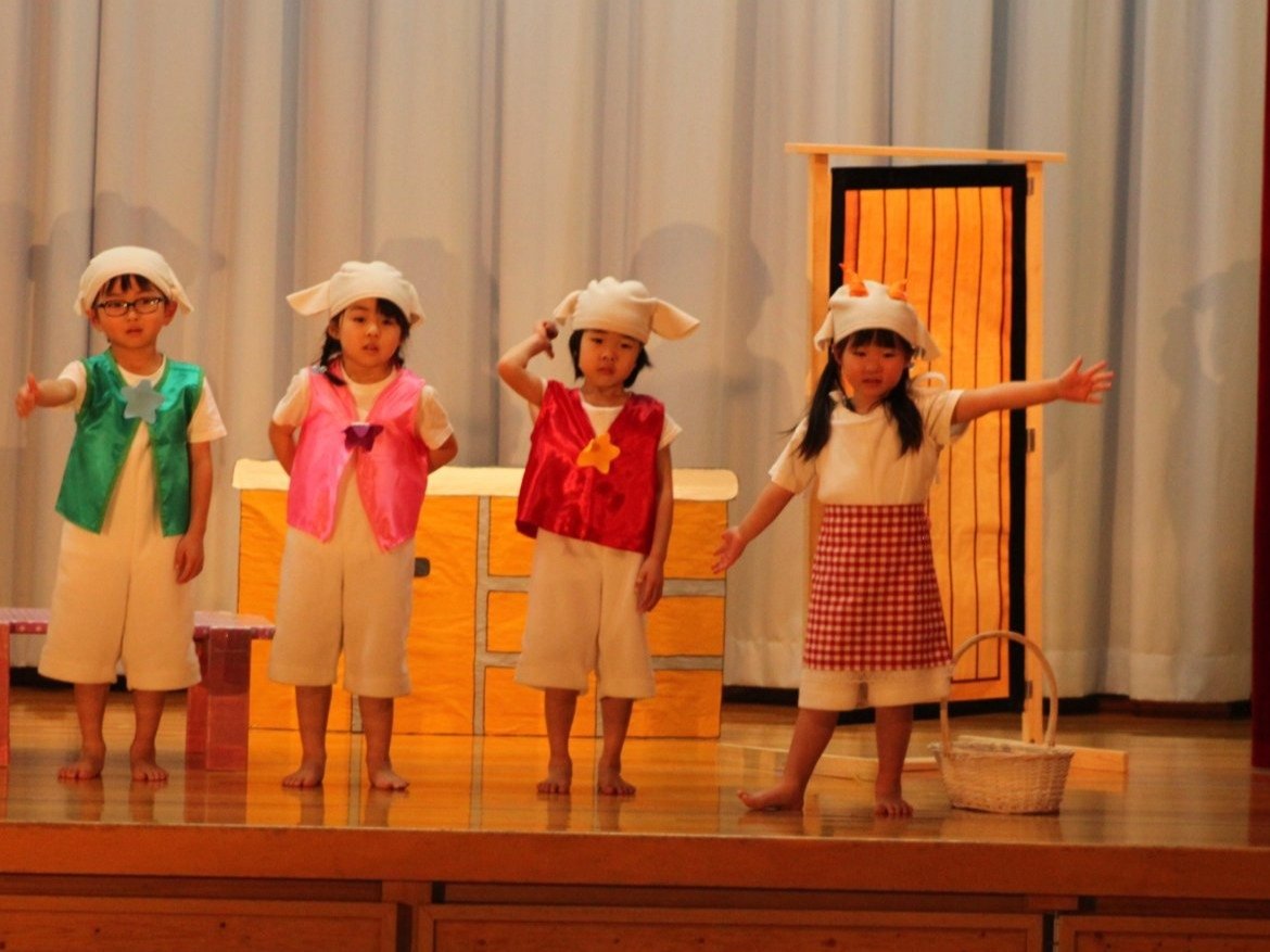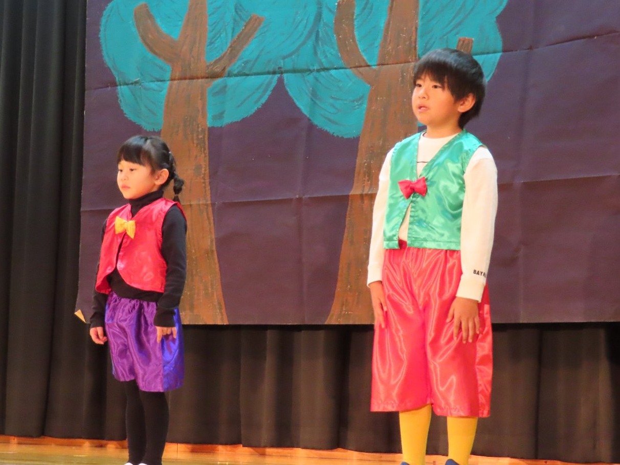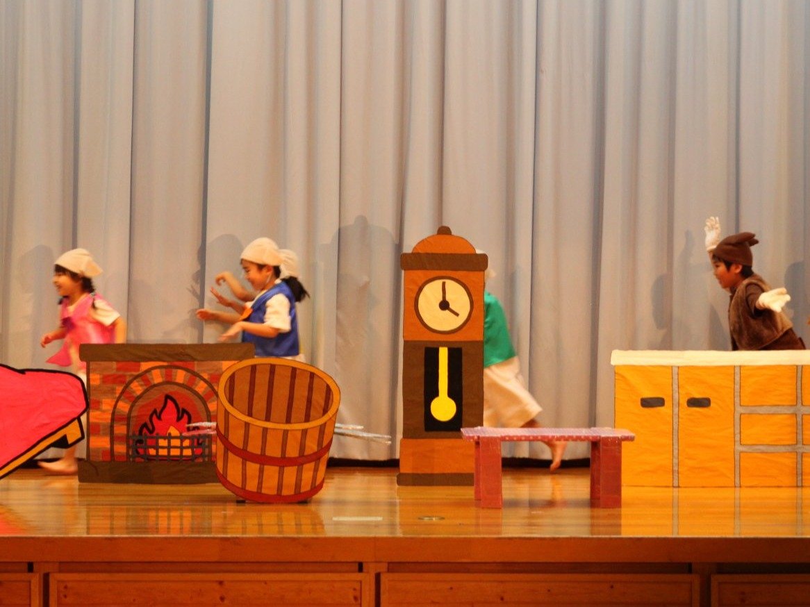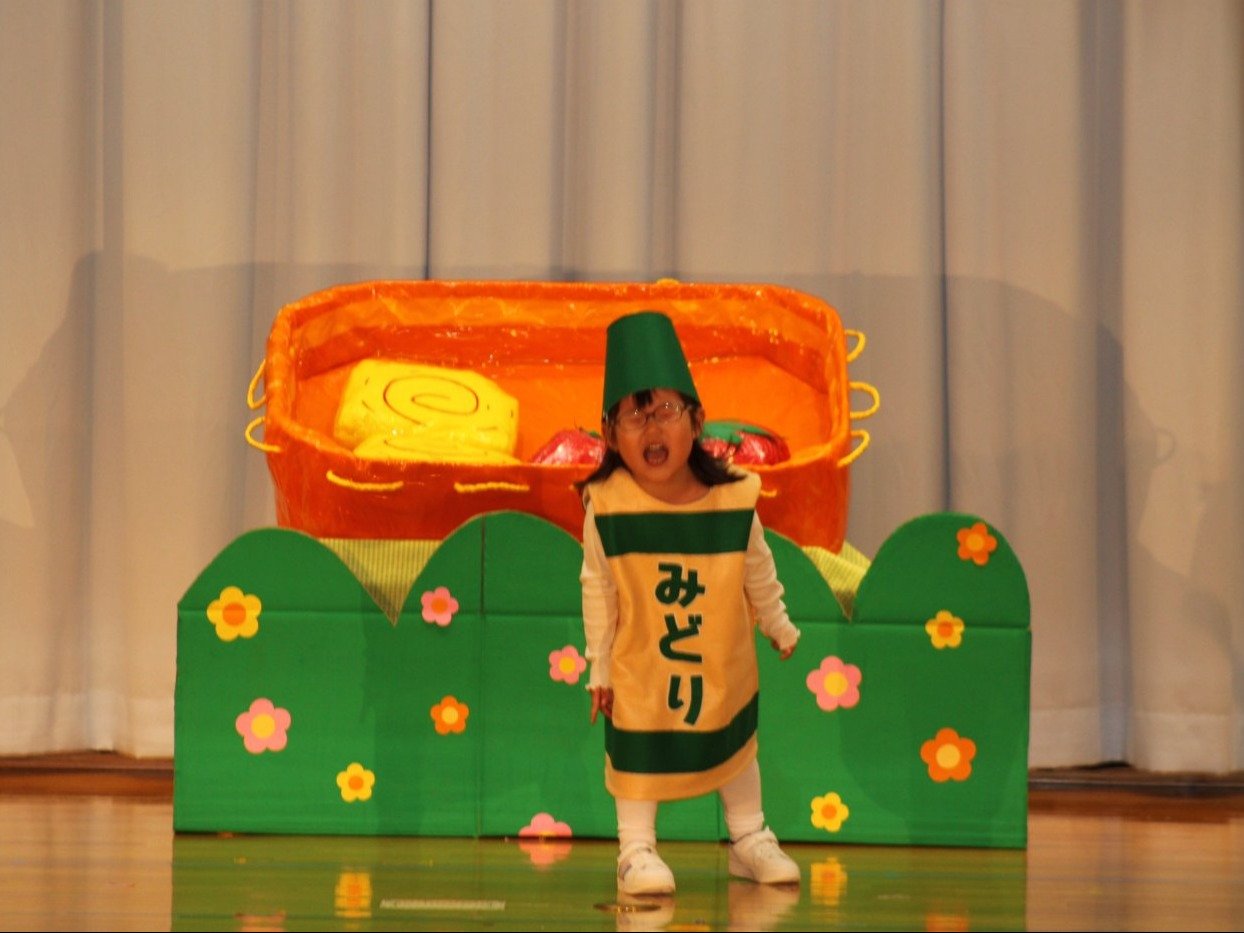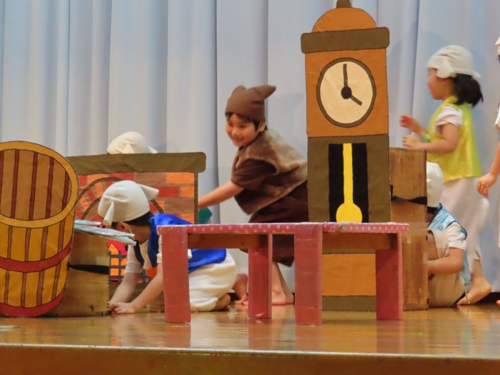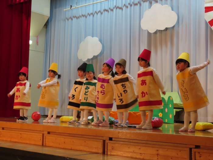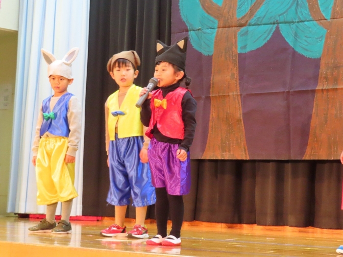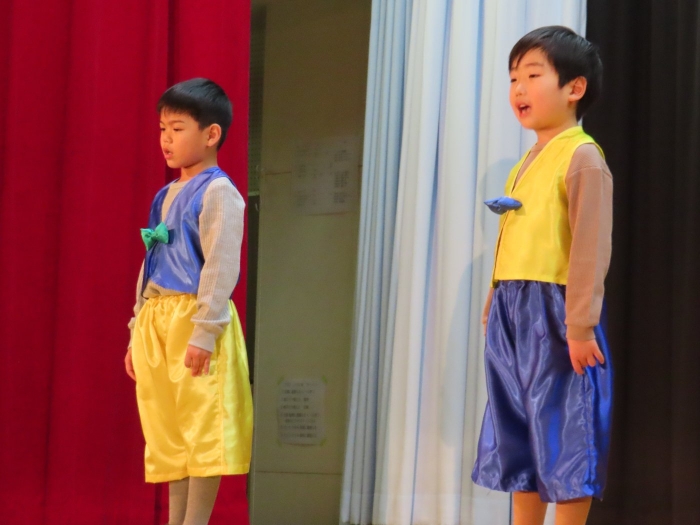 輝いていたね☆彡『第50回ゆめの会』part2 2025年12月21日(日) NEW 行事 10.いちご組/劇遊び『くれよんたちの きょうはなにをかこうかな?』 かわいいクレヨンたちが勢揃い! 自分の好きな色のクレヨンに へ~んしん! ♬どんな色が好き?⇒『赤』! ♪赤い色が好き 赤色クレヨンたちは、『イチゴ』と『トマト』を描いてお弁当箱へ 元気いっぱいの歌声♬ 他の色のクレヨンたちも元気ハツラツな歌声 (^^♪ 黄色クレヨンたちは、『卵焼き』を描いてお弁当箱へ 一人でも、パワフル声量の緑色クレヨン(^^♪ もちろん! 他のクレヨンたちも一緒に歌います♫ ジャジャーン☆彡『キュウリ』を描いてお弁当箱へ リズムに乗って、ウキウキ登場☆彡『紫』クレヨン ジャジャーン☆彡『ブドウ』を描いてお弁当箱へ 元気いっぱい大きな振りで ♫一番先になくなるよ 茶色いクレヨン ジャジャーン☆彡『チョコレート』が飛び出した時は、予想外で会場から驚きの声 最後は、黒色クレヨンが登場☆彡 黒色クレヨンは、『おにぎり』を描いてお弁当箱へ できあがったお弁当を持って、ピクニックへ! 「準備はいいですか?」黒クレヨンの号令で、「それでは皆さんご一緒に!」 い「ただまーす⤴」 頬張る仕草が、これまた可愛い♬ 友達と一緒で楽しい! 普段のクラスの様子が垣間見える劇遊びでした 記念写真☆彡 11.つくし組/オペレッタ『おおかみと しちひきのこやぎ』 開幕とともに、母ヤギ&7匹の子ヤギが登場 お買い物に出かける母ヤギ 子ヤギと約束事を交わします 母さんが帰ってくるまで、扉は絶対開けちゃダメ! 扉は、絶対開けないよ! ♫狙った獲物は逃さない ズンズン迫る音にノッてオオカミ登場☆彡 母さんだったら、もっと優しい声 偽物なんかに、だまされない! 母さんが帰って来るまでは、扉は絶対開けないよ! 再びオオカミ登場☆彡 怖さ&コミカルな動きの表現がナイスです(^^♪ この声は、母さん? 声は、母さんだけど… 手と足の色が違う だまされないぞ~ 扉は、絶対開けないよ! またまた、みんなが好きな『ダメ』ポーズ 最後の手段、小麦粉を持って登場! 音楽に乗り、小麦粉を塗ったように軍手を装着! フォー⤴と雄叫び 声も手足も母さん? 帰っってきた おかえりー!! キャーッ!! オオカミだー 袖から見てみると、必死に隠れています オオカミも子ヤギも、名演技☆彡 逃した獲物はいないか、再確認 柱時計の後ろには…一番小さな子ヤギ 優しく、頼もしい母さんヤギが帰ってきました 寝ているオオカミのお腹を切って、子ヤギを救出 軽やかな音楽と共に 飛び出す子ヤギたち オオカミのお腹の中から無事に生還☆彡 最後は、オオカミのことも助ける肝っ玉母さん(^^♪ 9人の仲間でつくりあげたオペレッタ、たくさんの拍手を受け、やり切った感を味わいました 記念写真☆彡 13.たけのこ組/劇『ブレーメンのおんがくたい』 ゆめの会のトリを飾る たけのこ組の劇 開幕☆彡 歌詞に合わせた大きな振りを意識 後ろの客席に届く声を意識 「働かないと、お母さんたらご飯くれないんだよね…」 客席からの笑い声に、心の中ではガッツポーズ 動きも表情も、ネコになり切っています 「ケンタッキーにされちゃうんだよ」のセリフに、会場が大受けし、心の中ではガッツポーズ! おっとりコミカルなニワトリ役が、はまり役 よし☆彡 みんなでブレーメンに行こう! ブレーメンを目指し、夜道を歩いていると、「あっ、向こうに明かりが見えるよ!」 見せ場早早着替え! 幕が開くと、動物から泥棒に変身☆彡 窓枠から顔をひょっこり! 泥棒の家の中を覗き込むシーン たまらなく、可愛いです♫ ヒヒーン! ワンワン!! ニャーッ! コケコッコー またまた早着替え! 泥棒を追い出すことに大成功☆彡 ビールでカンパーイ! 「このチキン、食べるのに ちょっと勇気いるんだよな…」のセリフに、会場からドッ!と笑い声が またまた心の中ではガッツポーズ☆彡 またまたまた早着替え☆彡 様子がおかしいと戻ってきた泥棒 「おい! お前、あの家の様子を見てこい!」 「嫌ですよ~、いつでも親分と一緒がいいんです♫」との掛け合いに、またまた大受け! 狙い通りに笑いのツボを押さえる演技が光ります☆彡 また泥棒が来た よし、また驚かせてやろう! カンペキに泥棒を追い出すことに大成功☆彡 ブレーメンもいいけど、ここで4人で暮らさないかい? つまり~、ずっとみんなと一緒ってこと? いいね! なかよし4人組♫ 練習を積み重ね、見事な掛け合いを披露☆彡 これまで育まれてきた絆があったからこそ、成せる業です 最後に一人ずつ、配役を交えて自己紹介 全てを出し切った、やり遂げた 清々しい表情をしています 安堵の表情を浮かべています ともに支え合い、認め合ってきた4人の絆が、また深まりました 記念写真☆彡 なかよし4人組♫ 記念写真☆彡 ビール、最高⤴⤴ 14.たけのこ組/挨拶『おわりのことば』 最後の締めの挨拶は、もちろん!たけのこ組 それぞれの思いを込めながら 幼稚園を代表し、見に来てくれた、支えてくれた方々に挨拶 本当にありがと