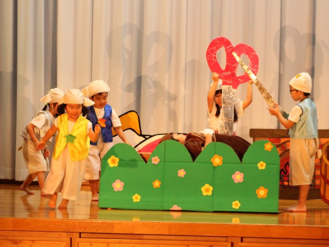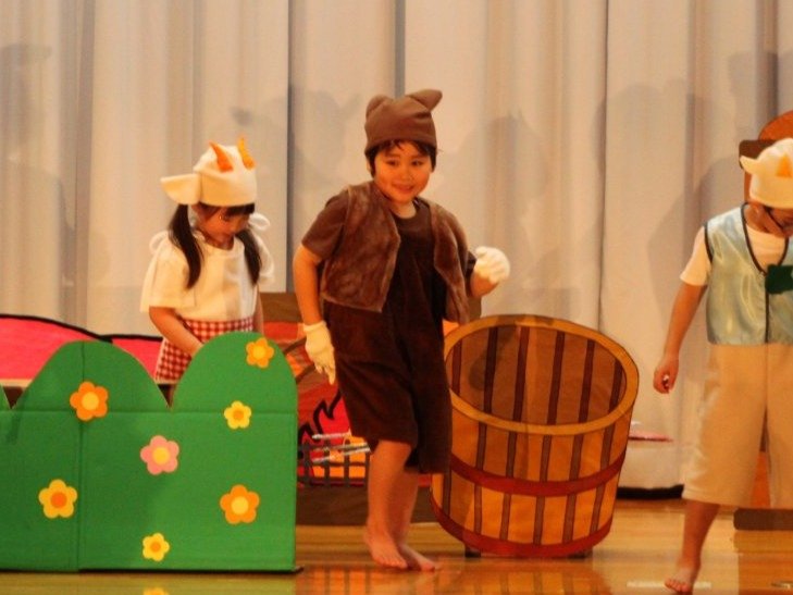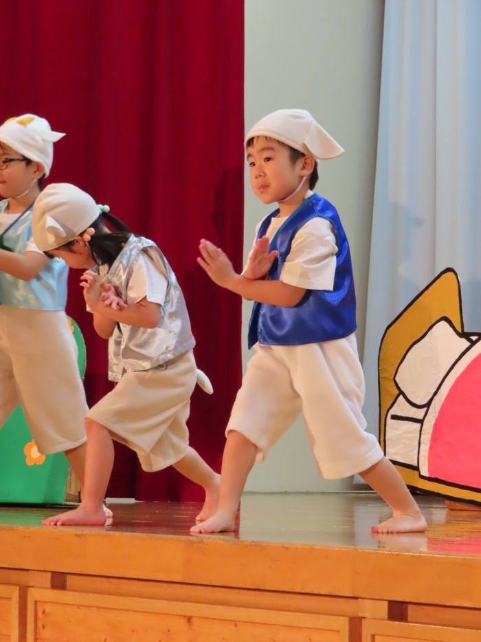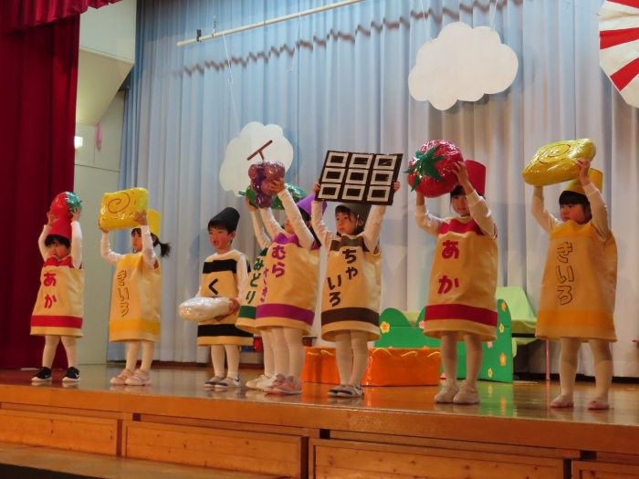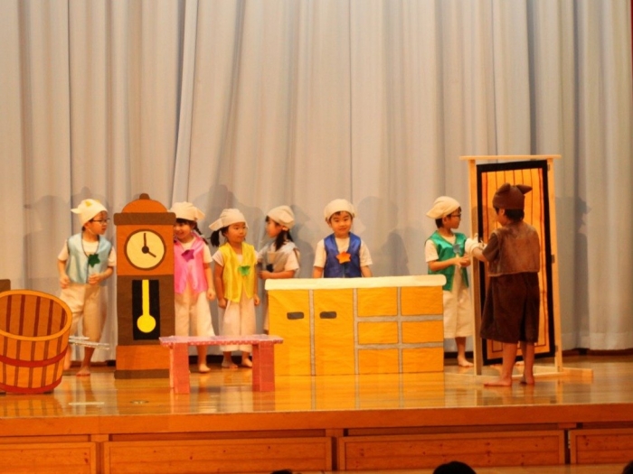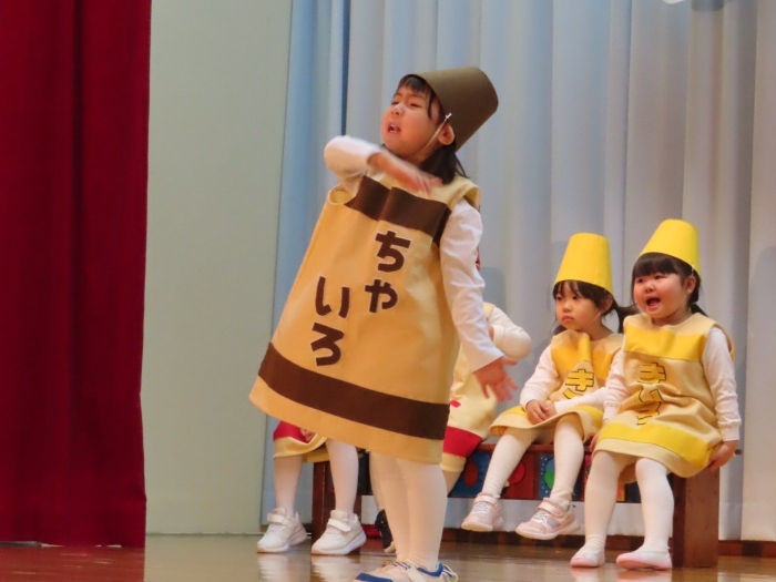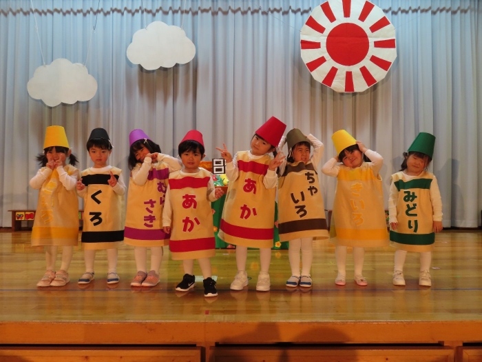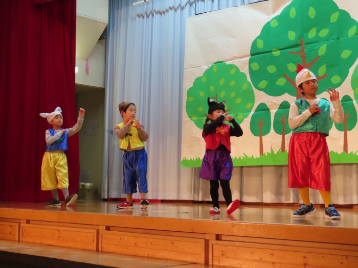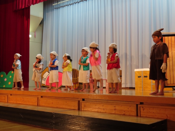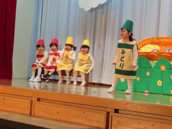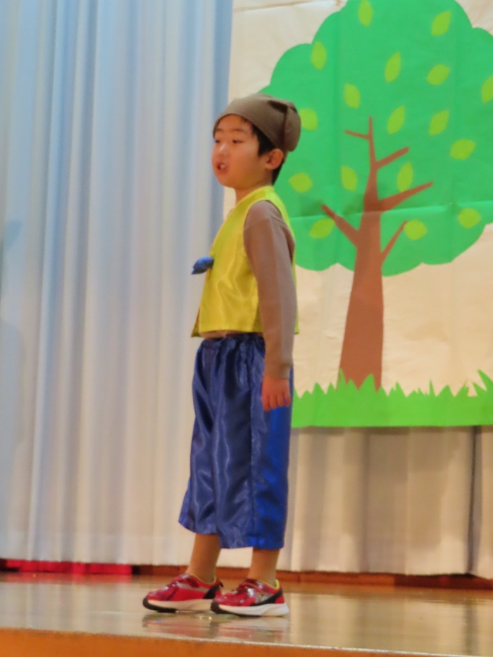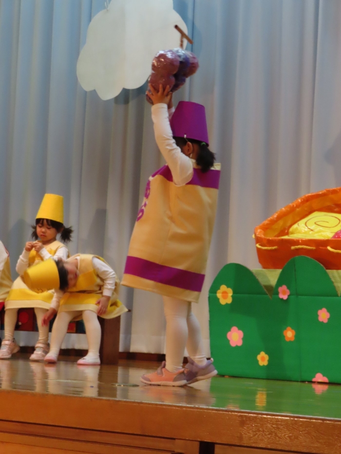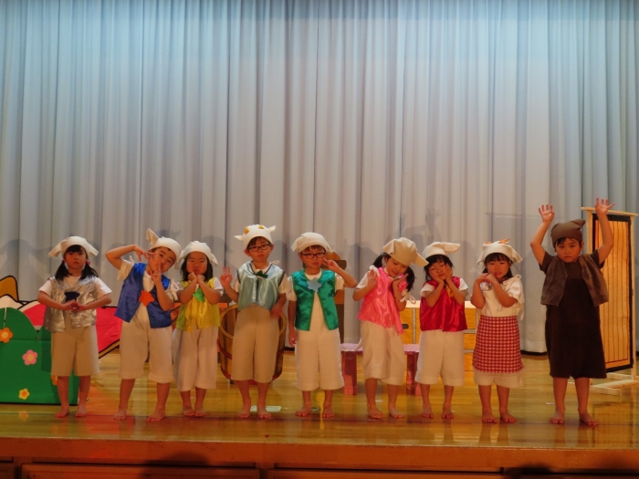 輝いていたね☆彡『第50回ゆめの会』part2 2025年12月21日(日) NEW 行事 10.いちご組/劇遊び『くれよんたちの きょうはなにをかこうかな?』 かわいいクレヨンたちが勢揃い! 自分の好きな色のクレヨンに へ~んしん! ♬どんな色が好き?⇒『赤』! ♪赤い色が好き 赤色クレヨンたちは、『イチゴ』と『トマト』を描いてお弁当箱へ 元気いっぱいの歌声♬ 他の色のクレヨンたちも元気ハツラツな歌声 (^^♪ 黄色クレヨンたちは、『卵焼き』を描いてお弁当箱へ 一人でも、パワフル声量の緑色クレヨン(^^♪ もちろん! 他のクレヨンたちも一緒に歌います♫ ジャジャーン☆彡『キュウリ』を描いてお弁当箱へ リズムに乗って、ウキウキ登場☆彡『紫』クレヨン ジャジャーン☆彡『ブドウ』を描いてお弁当箱へ 元気いっぱい大きな振りで ♫一番先になくなるよ 茶色いクレヨン ジャジャーン☆彡『チョコレート』が飛び出した時は、予想外で会場から驚きの声 最後は、黒色クレヨンが登場☆彡 黒色クレヨンは、『おにぎり』を描いてお弁当箱へ できあがったお弁当を持って、ピクニックへ! 「準備はいいですか?」黒クレヨンの号令で、「それでは皆さんご一緒に!」 い「ただまーす⤴」 頬張る仕草が、これまた可愛い♬ 友達と一緒で楽しい! 普段のクラスの様子が垣間見える劇遊びでした 記念写真☆彡 11.つくし組/オペレッタ『おおかみと しちひきのこやぎ』 開幕とともに、母ヤギ&7匹の子ヤギが登場 お買い物に出かける母ヤギ 子ヤギと約束事を交わします 母さんが帰ってくるまで、扉は絶対開けちゃダメ! 扉は、絶対開けないよ! ♫狙った獲物は逃さない ズンズン迫る音にノッてオオカミ登場☆彡 母さんだったら、もっと優しい声 偽物なんかに、だまされない! 母さんが帰って来るまでは、扉は絶対開けないよ! 再びオオカミ登場☆彡 怖さ&コミカルな動きの表現がナイスです(^^♪ この声は、母さん? 声は、母さんだけど… 手と足の色が違う だまされないぞ~ 扉は、絶対開けないよ! またまた、みんなが好きな『ダメ』ポーズ 最後の手段、小麦粉を持って登場! 音楽に乗り、小麦粉を塗ったように軍手を装着! フォー⤴と雄叫び 声も手足も母さん? 帰っってきた おかえりー!! キャーッ!! オオカミだー 袖から見てみると、必死に隠れています オオカミも子ヤギも、名演技☆彡 逃した獲物はいないか、再確認 柱時計の後ろには…一番小さな子ヤギ 優しく、頼もしい母さんヤギが帰ってきました 寝ているオオカミのお腹を切って、子ヤギを救出 軽やかな音楽と共に 飛び出す子ヤギたち オオカミのお腹の中から無事に生還☆彡 最後は、オオカミのことも助ける肝っ玉母さん(^^♪ 9人の仲間でつくりあげたオペレッタ、たくさんの拍手を受け、やり切った感を味わいました 記念写真☆彡 13.たけのこ組/劇『ブレーメンのおんがくたい』 ゆめの会のトリを飾る たけのこ組の劇 開幕☆彡 歌詞に合わせた大きな振りを意識 後ろの客席に届く声を意識 「働かないと、お母さんたらご飯くれないんだよね…」 客席からの笑い声に、心の中ではガッツポーズ 動きも表情も、ネコになり切っています 「ケンタッキーにされちゃうんだよ」のセリフに、会場が大受けし、心の中ではガッツポーズ! おっとりコミカルなニワトリ役が、はまり役 よし☆彡 みんなでブレーメンに行こう! ブレーメンを目指し、夜道を歩いていると、「あっ、向こうに明かりが見えるよ!」 見せ場早早着替え! 幕が開くと、動物から泥棒に変身☆彡 窓枠から顔をひょっこり! 泥棒の家の中を覗き込むシーン たまらなく、可愛いです♫ ヒヒーン! ワンワン!! ニャーッ! コケコッコー またまた早着替え! 泥棒を追い出すことに大成功☆彡 ビールでカンパーイ! 「このチキン、食べるのに ちょっと勇気いるんだよな…」のセリフに、会場からドッ!と笑い声が またまた心の中ではガッツポーズ☆彡 またまたまた早着替え☆彡 様子がおかしいと戻ってきた泥棒 「おい! お前、あの家の様子を見てこい!」 「嫌ですよ~、いつでも親分と一緒がいいんです♫」との掛け合いに、またまた大受け! 狙い通りに笑いのツボを押さえる演技が光ります☆彡 また泥棒が来た よし、また驚かせてやろう! カンペキに泥棒を追い出すことに大成功☆彡 ブレーメンもいいけど、ここで4人で暮らさないかい? つまり~、ずっとみんなと一緒ってこと? いいね! なかよし4人組♫ 練習を積み重ね、見事な掛け合いを披露☆彡 これまで育まれてきた絆があったからこそ、成せる業です 最後に一人ずつ、配役を交えて自己紹介 全てを出し切った、やり遂げた 清々しい表情をしています 安堵の表情を浮かべています ともに支え合い、認め合ってきた4人の絆が、また深まりました 記念写真☆彡 なかよし4人組♫ 記念写真☆彡 ビール、最高⤴⤴ 14.たけのこ組/挨拶『おわりのことば』 最後の締めの挨拶は、もちろん!たけのこ組 それぞれの思いを込めながら 幼稚園を代表し、見に来てくれた、支えてくれた方々に挨拶 本当にありがと