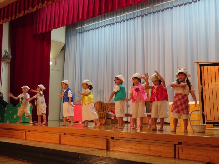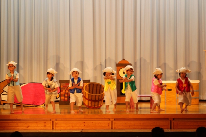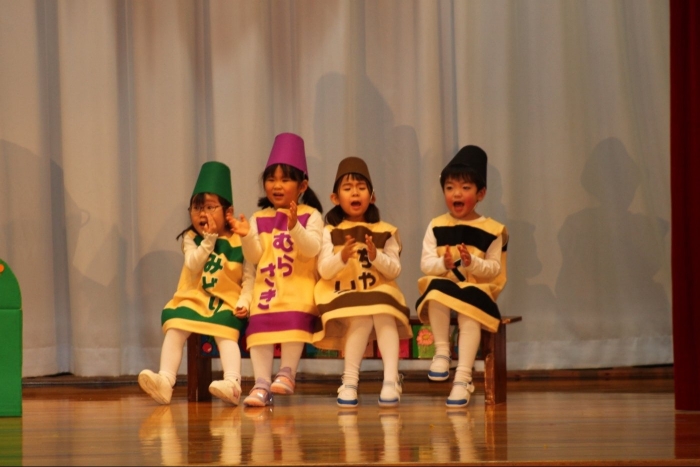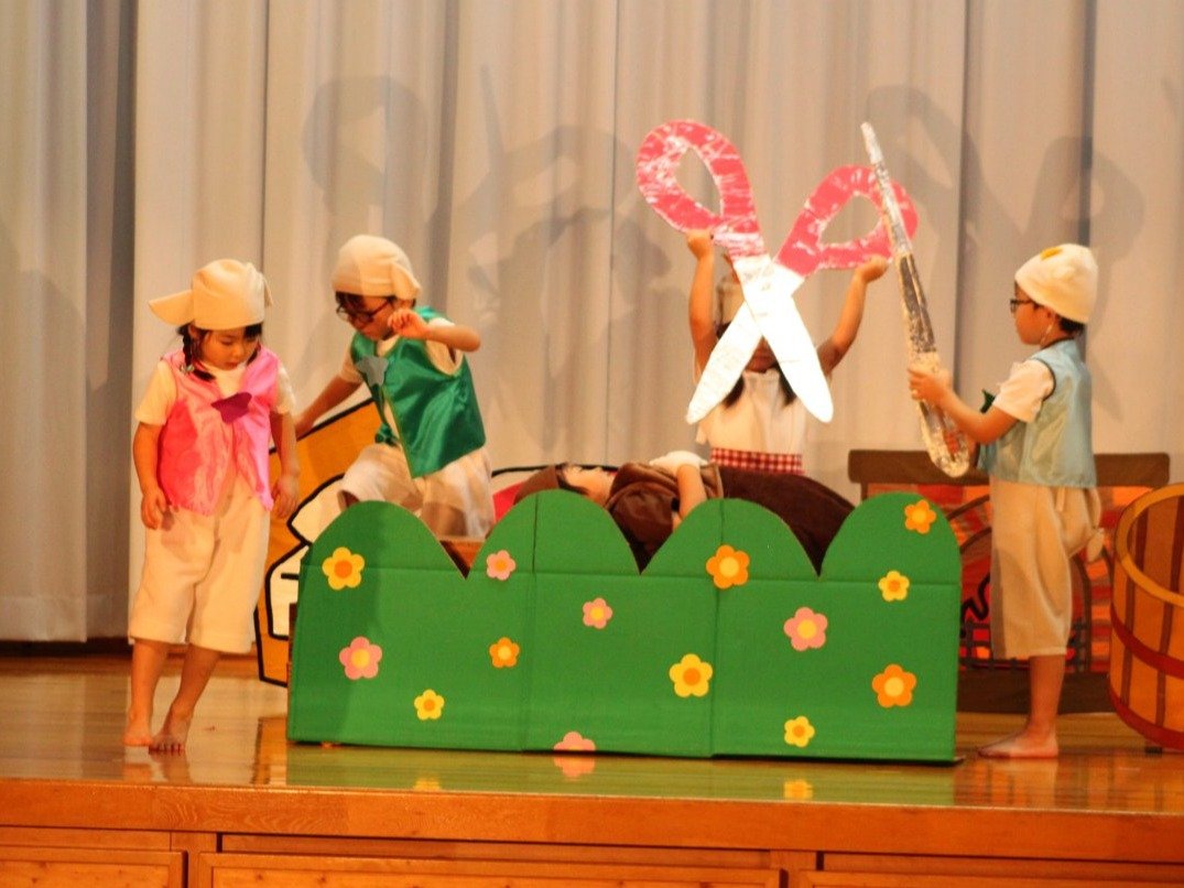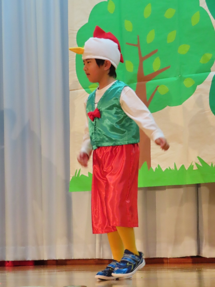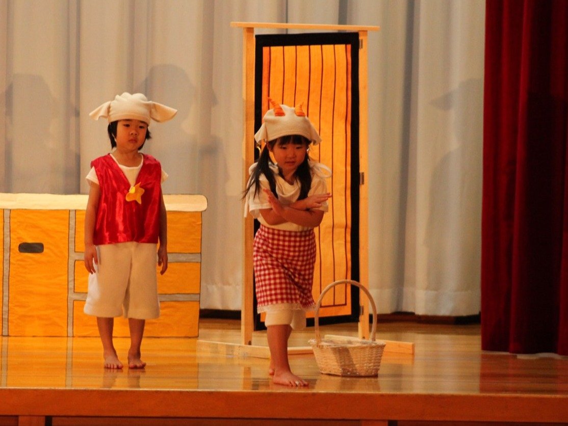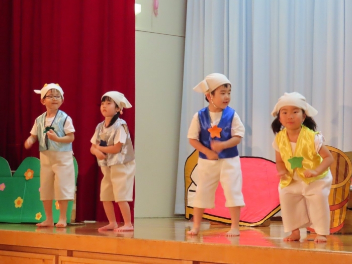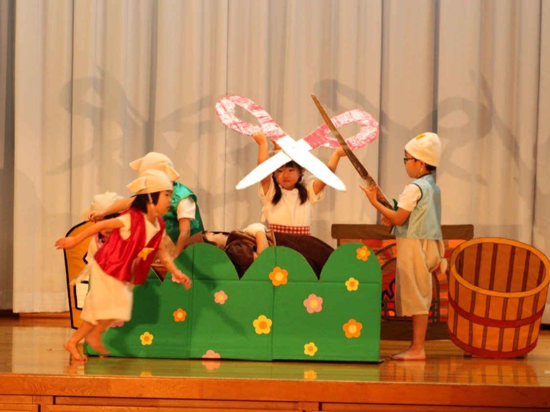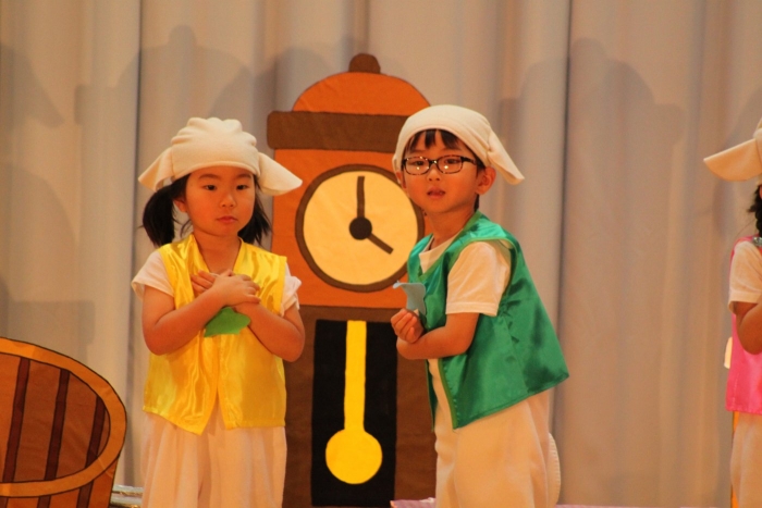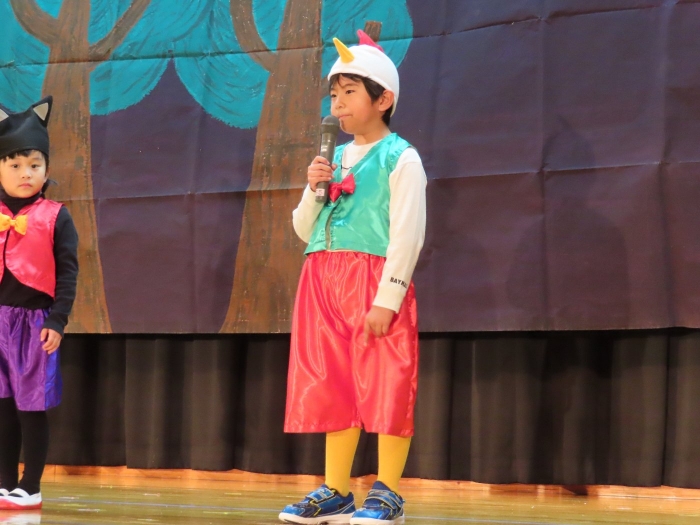 輝いていたね☆彡『第50回ゆめの会』part2 2025年12月21日(日) NEW 行事 10.いちご組/劇遊び『くれよんたちの きょうはなにをかこうかな?』 かわいいクレヨンたちが勢揃い! 自分の好きな色のクレヨンに へ~んしん! ♬どんな色が好き?⇒『赤』! ♪赤い色が好き 赤色クレヨンたちは、『イチゴ』と『トマト』を描いてお弁当箱へ 元気いっぱいの歌声♬ 他の色のクレヨンたちも元気ハツラツな歌声 (^^♪ 黄色クレヨンたちは、『卵焼き』を描いてお弁当箱へ 一人でも、パワフル声量の緑色クレヨン(^^♪ もちろん! 他のクレヨンたちも一緒に歌います♫ ジャジャーン☆彡『キュウリ』を描いてお弁当箱へ リズムに乗って、ウキウキ登場☆彡『紫』クレヨン ジャジャーン☆彡『ブドウ』を描いてお弁当箱へ 元気いっぱい大きな振りで ♫一番先になくなるよ 茶色いクレヨン ジャジャーン☆彡『チョコレート』が飛び出した時は、予想外で会場から驚きの声 最後は、黒色クレヨンが登場☆彡 黒色クレヨンは、『おにぎり』を描いてお弁当箱へ できあがったお弁当を持って、ピクニックへ! 「準備はいいですか?」黒クレヨンの号令で、「それでは皆さんご一緒に!」 い「ただまーす⤴」 頬張る仕草が、これまた可愛い♬ 友達と一緒で楽しい! 普段のクラスの様子が垣間見える劇遊びでした 記念写真☆彡 11.つくし組/オペレッタ『おおかみと しちひきのこやぎ』 開幕とともに、母ヤギ&7匹の子ヤギが登場 お買い物に出かける母ヤギ 子ヤギと約束事を交わします 母さんが帰ってくるまで、扉は絶対開けちゃダメ! 扉は、絶対開けないよ! ♫狙った獲物は逃さない ズンズン迫る音にノッてオオカミ登場☆彡 母さんだったら、もっと優しい声 偽物なんかに、だまされない! 母さんが帰って来るまでは、扉は絶対開けないよ! 再びオオカミ登場☆彡 怖さ&コミカルな動きの表現がナイスです(^^♪ この声は、母さん? 声は、母さんだけど… 手と足の色が違う だまされないぞ~ 扉は、絶対開けないよ! またまた、みんなが好きな『ダメ』ポーズ 最後の手段、小麦粉を持って登場! 音楽に乗り、小麦粉を塗ったように軍手を装着! フォー⤴と雄叫び 声も手足も母さん? 帰っってきた おかえりー!! キャーッ!! オオカミだー 袖から見てみると、必死に隠れています オオカミも子ヤギも、名演技☆彡 逃した獲物はいないか、再確認 柱時計の後ろには…一番小さな子ヤギ 優しく、頼もしい母さんヤギが帰ってきました 寝ているオオカミのお腹を切って、子ヤギを救出 軽やかな音楽と共に 飛び出す子ヤギたち オオカミのお腹の中から無事に生還☆彡 最後は、オオカミのことも助ける肝っ玉母さん(^^♪ 9人の仲間でつくりあげたオペレッタ、たくさんの拍手を受け、やり切った感を味わいました 記念写真☆彡 13.たけのこ組/劇『ブレーメンのおんがくたい』 ゆめの会のトリを飾る たけのこ組の劇 開幕☆彡 歌詞に合わせた大きな振りを意識 後ろの客席に届く声を意識 「働かないと、お母さんたらご飯くれないんだよね…」 客席からの笑い声に、心の中ではガッツポーズ 動きも表情も、ネコになり切っています 「ケンタッキーにされちゃうんだよ」のセリフに、会場が大受けし、心の中ではガッツポーズ! おっとりコミカルなニワトリ役が、はまり役 よし☆彡 みんなでブレーメンに行こう! ブレーメンを目指し、夜道を歩いていると、「あっ、向こうに明かりが見えるよ!」 見せ場早早着替え! 幕が開くと、動物から泥棒に変身☆彡 窓枠から顔をひょっこり! 泥棒の家の中を覗き込むシーン たまらなく、可愛いです♫ ヒヒーン! ワンワン!! ニャーッ! コケコッコー またまた早着替え! 泥棒を追い出すことに大成功☆彡 ビールでカンパーイ! 「このチキン、食べるのに ちょっと勇気いるんだよな…」のセリフに、会場からドッ!と笑い声が またまた心の中ではガッツポーズ☆彡 またまたまた早着替え☆彡 様子がおかしいと戻ってきた泥棒 「おい! お前、あの家の様子を見てこい!」 「嫌ですよ~、いつでも親分と一緒がいいんです♫」との掛け合いに、またまた大受け! 狙い通りに笑いのツボを押さえる演技が光ります☆彡 また泥棒が来た よし、また驚かせてやろう! カンペキに泥棒を追い出すことに大成功☆彡 ブレーメンもいいけど、ここで4人で暮らさないかい? つまり~、ずっとみんなと一緒ってこと? いいね! なかよし4人組♫ 練習を積み重ね、見事な掛け合いを披露☆彡 これまで育まれてきた絆があったからこそ、成せる業です 最後に一人ずつ、配役を交えて自己紹介 全てを出し切った、やり遂げた 清々しい表情をしています 安堵の表情を浮かべています ともに支え合い、認め合ってきた4人の絆が、また深まりました 記念写真☆彡 なかよし4人組♫ 記念写真☆彡 ビール、最高⤴⤴ 14.たけのこ組/挨拶『おわりのことば』 最後の締めの挨拶は、もちろん!たけのこ組 それぞれの思いを込めながら 幼稚園を代表し、見に来てくれた、支えてくれた方々に挨拶 本当にありがと