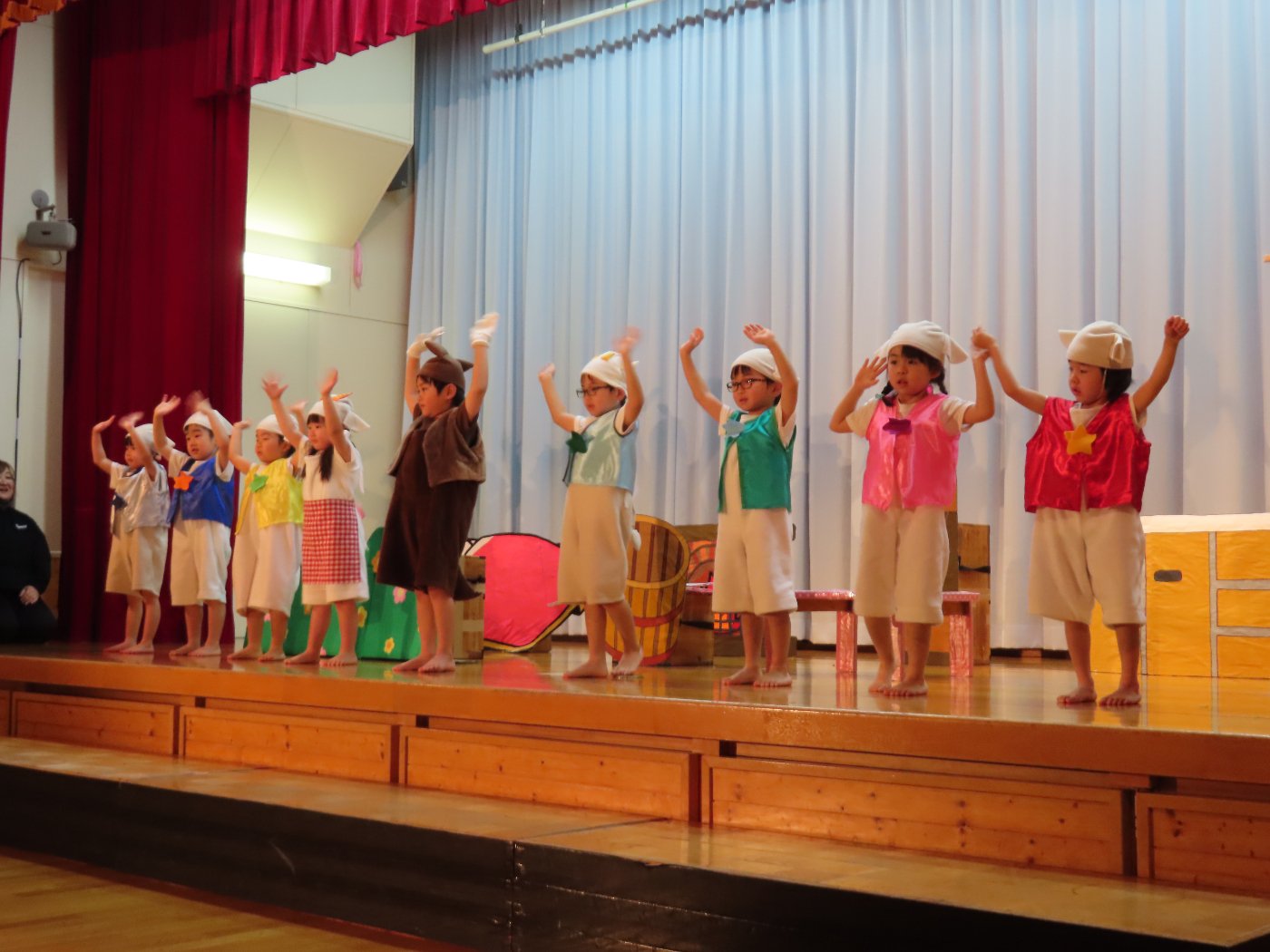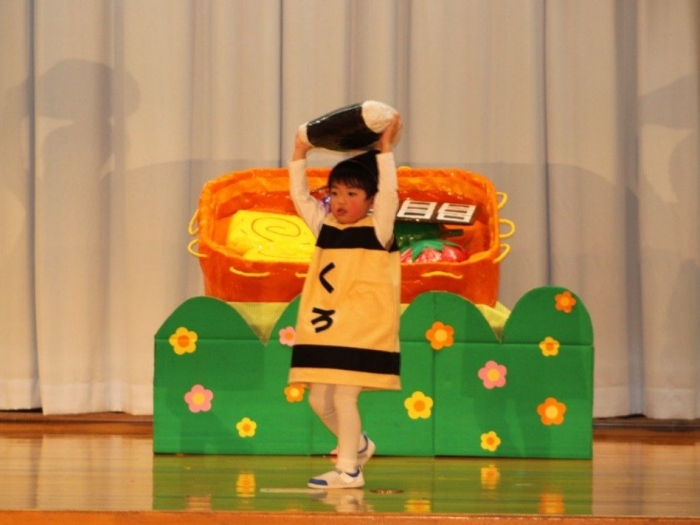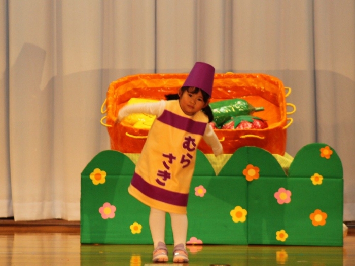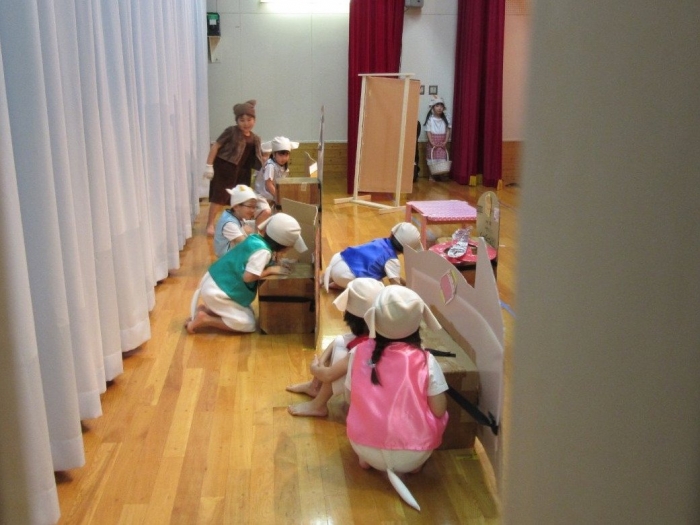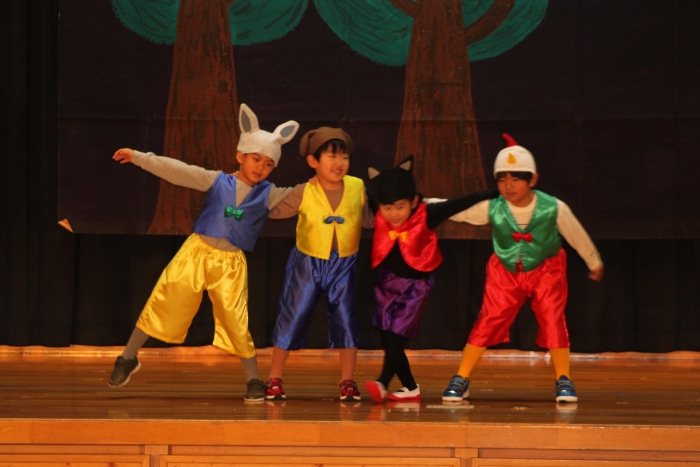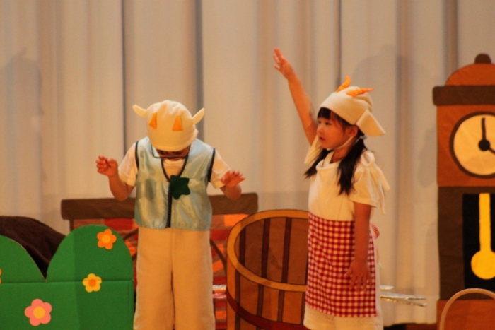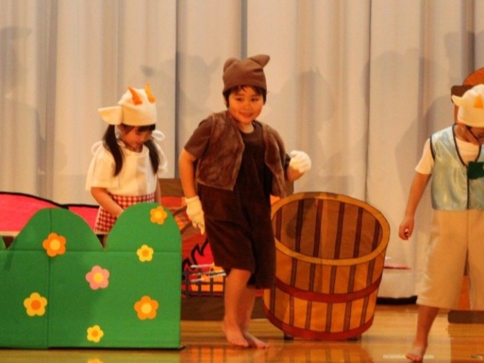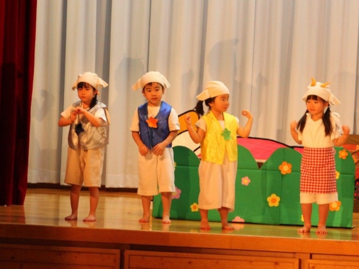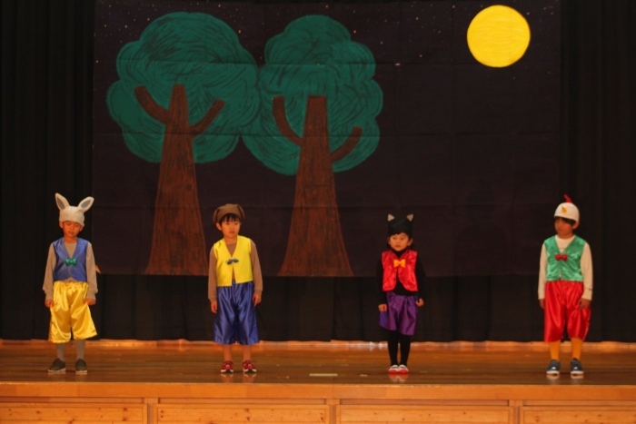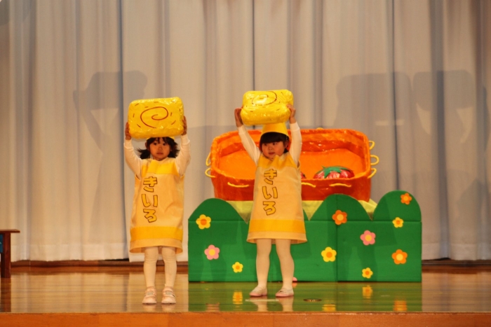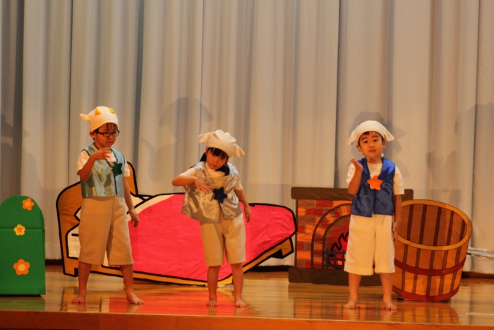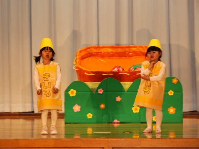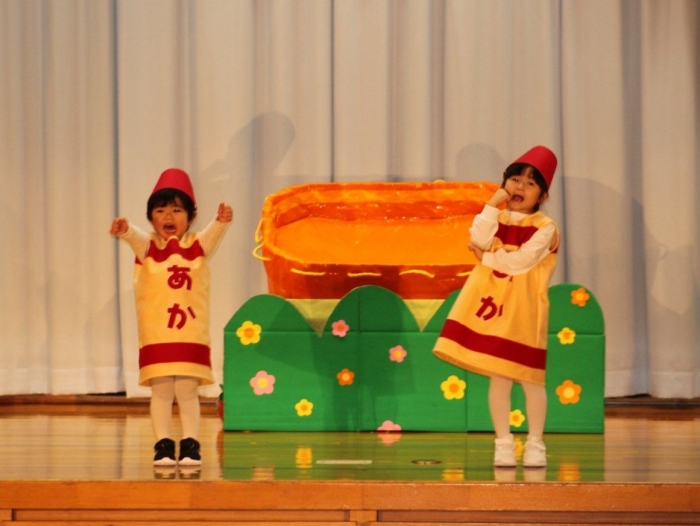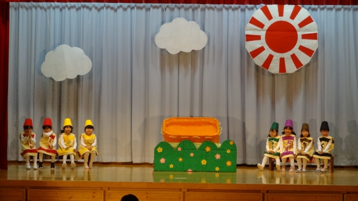輝いていたね☆彡『第50回ゆめの会』part2 2025年12月21日(日) NEW 行事 10.いちご組/劇遊び『くれよんたちの きょうはなにをかこうかな?』 かわいいクレヨンたちが勢揃い! 自分の好きな色のクレヨンに へ~んしん! ♬どんな色が好き?⇒『赤』! ♪赤い色が好き 赤色クレヨンたちは、『イチゴ』と『トマト』を描いてお弁当箱へ 元気いっぱいの歌声♬ 他の色のクレヨンたちも元気ハツラツな歌声 (^^♪ 黄色クレヨンたちは、『卵焼き』を描いてお弁当箱へ 一人でも、パワフル声量の緑色クレヨン(^^♪ もちろん! 他のクレヨンたちも一緒に歌います♫ ジャジャーン☆彡『キュウリ』を描いてお弁当箱へ リズムに乗って、ウキウキ登場☆彡『紫』クレヨン ジャジャーン☆彡『ブドウ』を描いてお弁当箱へ 元気いっぱい大きな振りで ♫一番先になくなるよ 茶色いクレヨン ジャジャーン☆彡『チョコレート』が飛び出した時は、予想外で会場から驚きの声 最後は、黒色クレヨンが登場☆彡 黒色クレヨンは、『おにぎり』を描いてお弁当箱へ できあがったお弁当を持って、ピクニックへ! 「準備はいいですか?」黒クレヨンの号令で、「それでは皆さんご一緒に!」 い「ただまーす⤴」 頬張る仕草が、これまた可愛い♬ 友達と一緒で楽しい! 普段のクラスの様子が垣間見える劇遊びでした 記念写真☆彡 11.つくし組/オペレッタ『おおかみと しちひきのこやぎ』 開幕とともに、母ヤギ&7匹の子ヤギが登場 お買い物に出かける母ヤギ 子ヤギと約束事を交わします 母さんが帰ってくるまで、扉は絶対開けちゃダメ! 扉は、絶対開けないよ! ♫狙った獲物は逃さない ズンズン迫る音にノッてオオカミ登場☆彡 母さんだったら、もっと優しい声 偽物なんかに、だまされない! 母さんが帰って来るまでは、扉は絶対開けないよ! 再びオオカミ登場☆彡 怖さ&コミカルな動きの表現がナイスです(^^♪ この声は、母さん? 声は、母さんだけど… 手と足の色が違う だまされないぞ~ 扉は、絶対開けないよ! またまた、みんなが好きな『ダメ』ポーズ 最後の手段、小麦粉を持って登場! 音楽に乗り、小麦粉を塗ったように軍手を装着! フォー⤴と雄叫び 声も手足も母さん? 帰っってきた おかえりー!! キャーッ!! オオカミだー 袖から見てみると、必死に隠れています オオカミも子ヤギも、名演技☆彡 逃した獲物はいないか、再確認 柱時計の後ろには…一番小さな子ヤギ 優しく、頼もしい母さんヤギが帰ってきました 寝ているオオカミのお腹を切って、子ヤギを救出 軽やかな音楽と共に 飛び出す子ヤギたち オオカミのお腹の中から無事に生還☆彡 最後は、オオカミのことも助ける肝っ玉母さん(^^♪ 9人の仲間でつくりあげたオペレッタ、たくさんの拍手を受け、やり切った感を味わいました 記念写真☆彡 13.たけのこ組/劇『ブレーメンのおんがくたい』 ゆめの会のトリを飾る たけのこ組の劇 開幕☆彡 歌詞に合わせた大きな振りを意識 後ろの客席に届く声を意識 「働かないと、お母さんたらご飯くれないんだよね…」 客席からの笑い声に、心の中ではガッツポーズ 動きも表情も、ネコになり切っています 「ケンタッキーにされちゃうんだよ」のセリフに、会場が大受けし、心の中ではガッツポーズ! おっとりコミカルなニワトリ役が、はまり役 よし☆彡 みんなでブレーメンに行こう! ブレーメンを目指し、夜道を歩いていると、「あっ、向こうに明かりが見えるよ!」 見せ場早早着替え! 幕が開くと、動物から泥棒に変身☆彡 窓枠から顔をひょっこり! 泥棒の家の中を覗き込むシーン たまらなく、可愛いです♫ ヒヒーン! ワンワン!! ニャーッ! コケコッコー またまた早着替え! 泥棒を追い出すことに大成功☆彡 ビールでカンパーイ! 「このチキン、食べるのに ちょっと勇気いるんだよな…」のセリフに、会場からドッ!と笑い声が またまた心の中ではガッツポーズ☆彡 またまたまた早着替え☆彡 様子がおかしいと戻ってきた泥棒 「おい! お前、あの家の様子を見てこい!」 「嫌ですよ~、いつでも親分と一緒がいいんです♫」との掛け合いに、またまた大受け! 狙い通りに笑いのツボを押さえる演技が光ります☆彡 また泥棒が来た よし、また驚かせてやろう! カンペキに泥棒を追い出すことに大成功☆彡 ブレーメンもいいけど、ここで4人で暮らさないかい? つまり~、ずっとみんなと一緒ってこと? いいね! なかよし4人組♫ 練習を積み重ね、見事な掛け合いを披露☆彡 これまで育まれてきた絆があったからこそ、成せる業です 最後に一人ずつ、配役を交えて自己紹介 全てを出し切った、やり遂げた 清々しい表情をしています 安堵の表情を浮かべています ともに支え合い、認め合ってきた4人の絆が、また深まりました 記念写真☆彡 なかよし4人組♫ 記念写真☆彡 ビール、最高⤴⤴ 14.たけのこ組/挨拶『おわりのことば』 最後の締めの挨拶は、もちろん!たけのこ組 それぞれの思いを込めながら 幼稚園を代表し、見に来てくれた、支えてくれた方々に挨拶 本当にありがと
