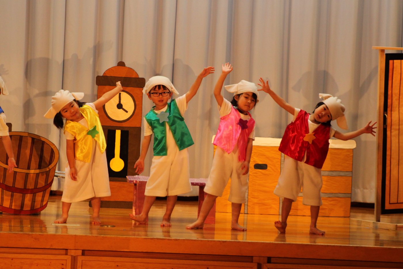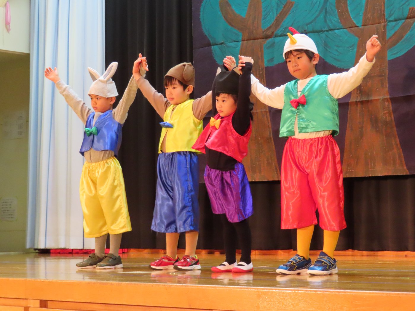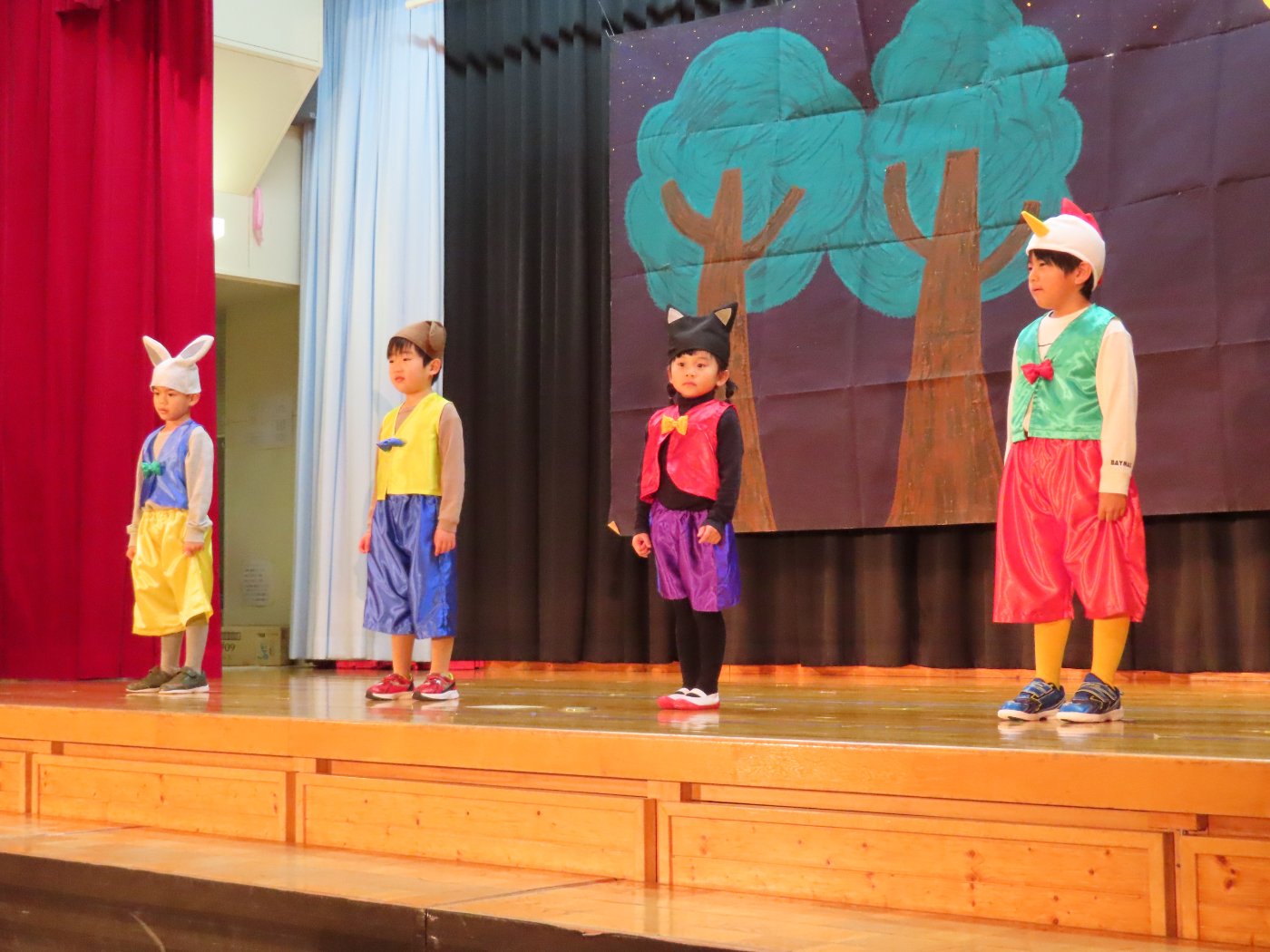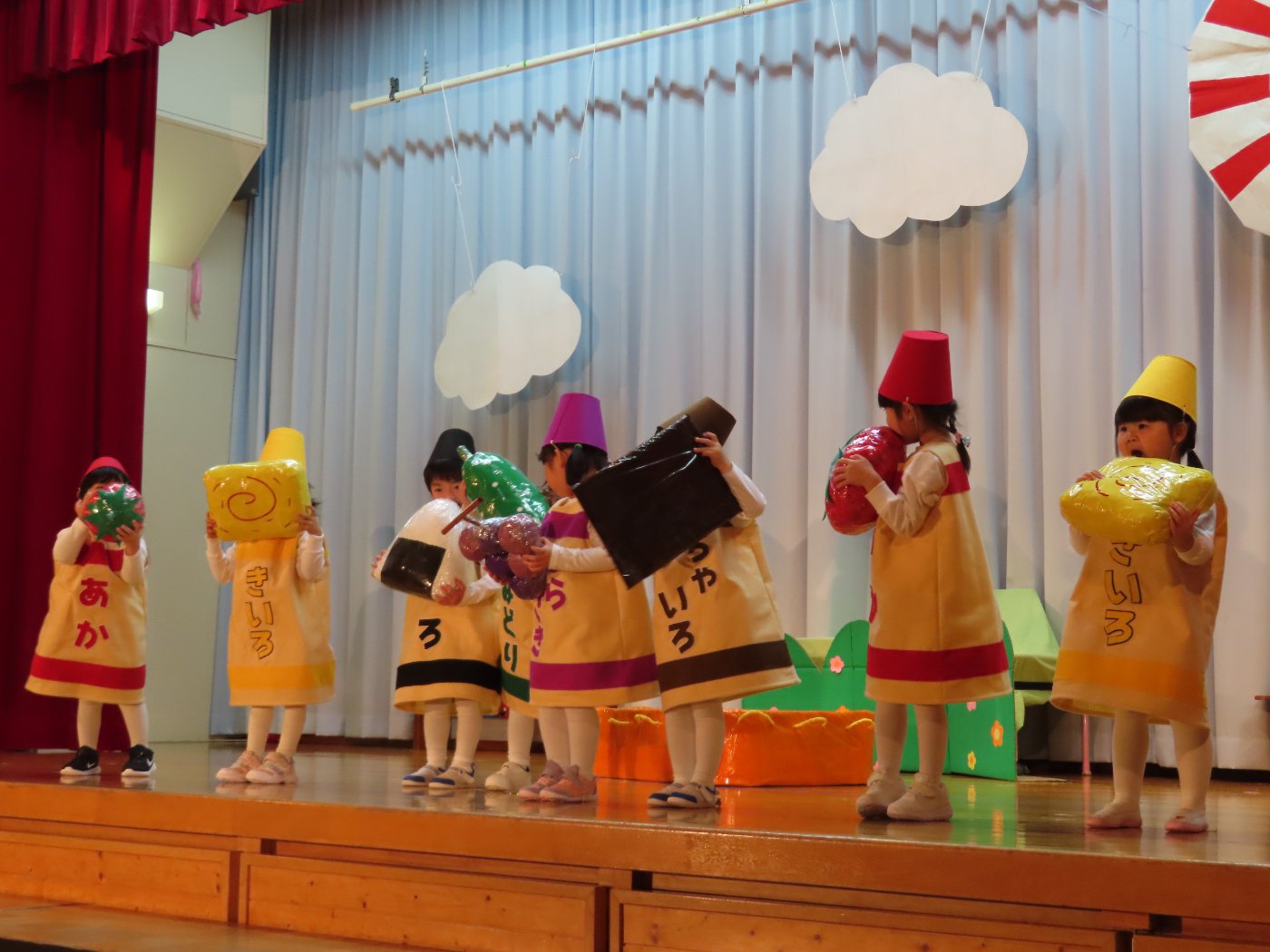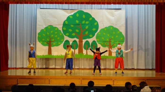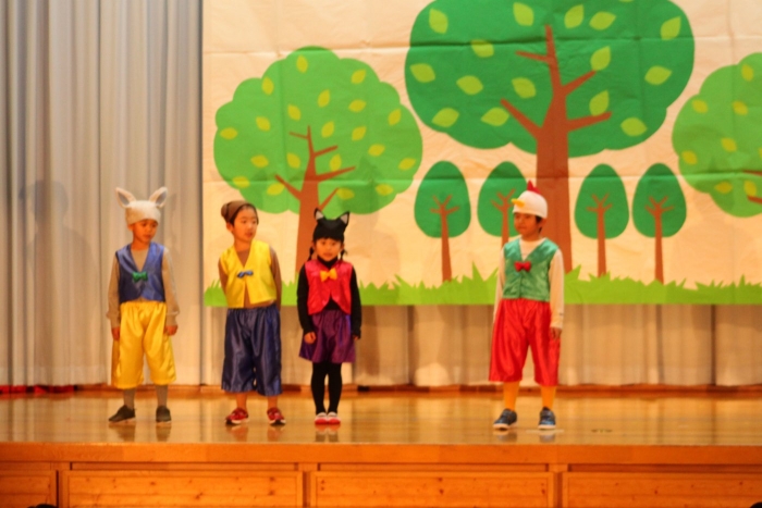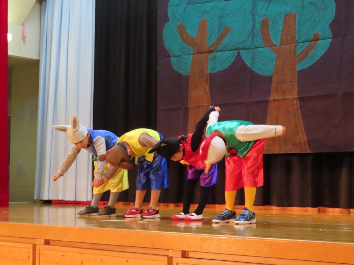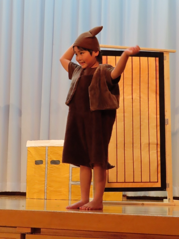 輝いていたね☆彡『第50回ゆめの会』part2 2025年12月21日(日) NEW 行事 10.いちご組/劇遊び『くれよんたちの きょうはなにをかこうかな?』 かわいいクレヨンたちが勢揃い! 自分の好きな色のクレヨンに へ~んしん! ♬どんな色が好き?⇒『赤』! ♪赤い色が好き 赤色クレヨンたちは、『イチゴ』と『トマト』を描いてお弁当箱へ 元気いっぱいの歌声♬ 他の色のクレヨンたちも元気ハツラツな歌声 (^^♪ 黄色クレヨンたちは、『卵焼き』を描いてお弁当箱へ 一人でも、パワフル声量の緑色クレヨン(^^♪ もちろん! 他のクレヨンたちも一緒に歌います♫ ジャジャーン☆彡『キュウリ』を描いてお弁当箱へ リズムに乗って、ウキウキ登場☆彡『紫』クレヨン ジャジャーン☆彡『ブドウ』を描いてお弁当箱へ 元気いっぱい大きな振りで ♫一番先になくなるよ 茶色いクレヨン ジャジャーン☆彡『チョコレート』が飛び出した時は、予想外で会場から驚きの声 最後は、黒色クレヨンが登場☆彡 黒色クレヨンは、『おにぎり』を描いてお弁当箱へ できあがったお弁当を持って、ピクニックへ! 「準備はいいですか?」黒クレヨンの号令で、「それでは皆さんご一緒に!」 い「ただまーす⤴」 頬張る仕草が、これまた可愛い♬ 友達と一緒で楽しい! 普段のクラスの様子が垣間見える劇遊びでした 記念写真☆彡 11.つくし組/オペレッタ『おおかみと しちひきのこやぎ』 開幕とともに、母ヤギ&7匹の子ヤギが登場 お買い物に出かける母ヤギ 子ヤギと約束事を交わします 母さんが帰ってくるまで、扉は絶対開けちゃダメ! 扉は、絶対開けないよ! ♫狙った獲物は逃さない ズンズン迫る音にノッてオオカミ登場☆彡 母さんだったら、もっと優しい声 偽物なんかに、だまされない! 母さんが帰って来るまでは、扉は絶対開けないよ! 再びオオカミ登場☆彡 怖さ&コミカルな動きの表現がナイスです(^^♪ この声は、母さん? 声は、母さんだけど… 手と足の色が違う だまされないぞ~ 扉は、絶対開けないよ! またまた、みんなが好きな『ダメ』ポーズ 最後の手段、小麦粉を持って登場! 音楽に乗り、小麦粉を塗ったように軍手を装着! フォー⤴と雄叫び 声も手足も母さん? 帰っってきた おかえりー!! キャーッ!! オオカミだー 袖から見てみると、必死に隠れています オオカミも子ヤギも、名演技☆彡 逃した獲物はいないか、再確認 柱時計の後ろには…一番小さな子ヤギ 優しく、頼もしい母さんヤギが帰ってきました 寝ているオオカミのお腹を切って、子ヤギを救出 軽やかな音楽と共に 飛び出す子ヤギたち オオカミのお腹の中から無事に生還☆彡 最後は、オオカミのことも助ける肝っ玉母さん(^^♪ 9人の仲間でつくりあげたオペレッタ、たくさんの拍手を受け、やり切った感を味わいました 記念写真☆彡 13.たけのこ組/劇『ブレーメンのおんがくたい』 ゆめの会のトリを飾る たけのこ組の劇 開幕☆彡 歌詞に合わせた大きな振りを意識 後ろの客席に届く声を意識 「働かないと、お母さんたらご飯くれないんだよね…」 客席からの笑い声に、心の中ではガッツポーズ 動きも表情も、ネコになり切っています 「ケンタッキーにされちゃうんだよ」のセリフに、会場が大受けし、心の中ではガッツポーズ! おっとりコミカルなニワトリ役が、はまり役 よし☆彡 みんなでブレーメンに行こう! ブレーメンを目指し、夜道を歩いていると、「あっ、向こうに明かりが見えるよ!」 見せ場早早着替え! 幕が開くと、動物から泥棒に変身☆彡 窓枠から顔をひょっこり! 泥棒の家の中を覗き込むシーン たまらなく、可愛いです♫ ヒヒーン! ワンワン!! ニャーッ! コケコッコー またまた早着替え! 泥棒を追い出すことに大成功☆彡 ビールでカンパーイ! 「このチキン、食べるのに ちょっと勇気いるんだよな…」のセリフに、会場からドッ!と笑い声が またまた心の中ではガッツポーズ☆彡 またまたまた早着替え☆彡 様子がおかしいと戻ってきた泥棒 「おい! お前、あの家の様子を見てこい!」 「嫌ですよ~、いつでも親分と一緒がいいんです♫」との掛け合いに、またまた大受け! 狙い通りに笑いのツボを押さえる演技が光ります☆彡 また泥棒が来た よし、また驚かせてやろう! カンペキに泥棒を追い出すことに大成功☆彡 ブレーメンもいいけど、ここで4人で暮らさないかい? つまり~、ずっとみんなと一緒ってこと? いいね! なかよし4人組♫ 練習を積み重ね、見事な掛け合いを披露☆彡 これまで育まれてきた絆があったからこそ、成せる業です 最後に一人ずつ、配役を交えて自己紹介 全てを出し切った、やり遂げた 清々しい表情をしています 安堵の表情を浮かべています ともに支え合い、認め合ってきた4人の絆が、また深まりました 記念写真☆彡 なかよし4人組♫ 記念写真☆彡 ビール、最高⤴⤴ 14.たけのこ組/挨拶『おわりのことば』 最後の締めの挨拶は、もちろん!たけのこ組 それぞれの思いを込めながら 幼稚園を代表し、見に来てくれた、支えてくれた方々に挨拶 本当にありがと