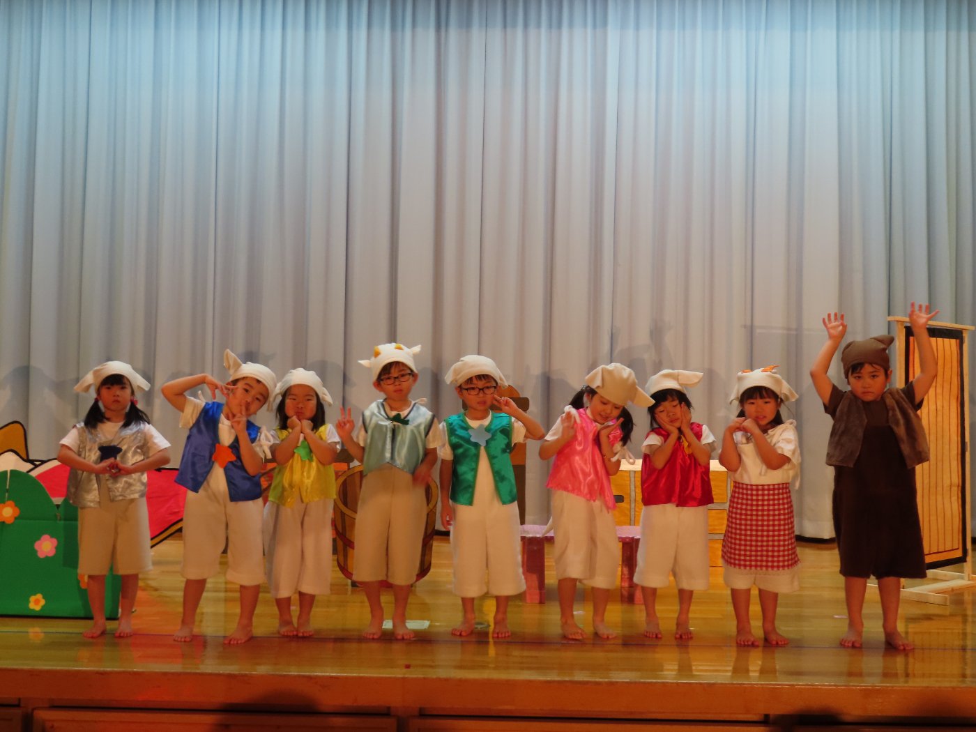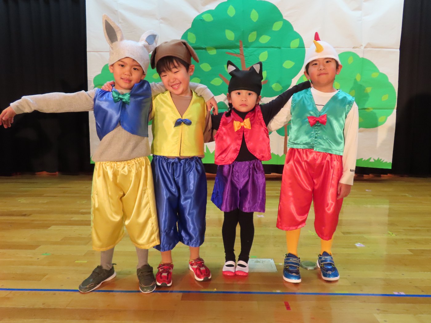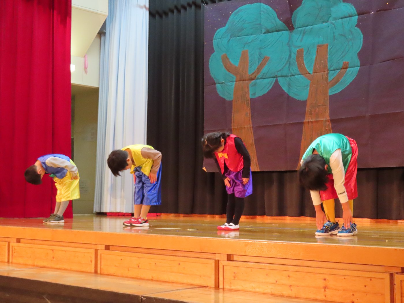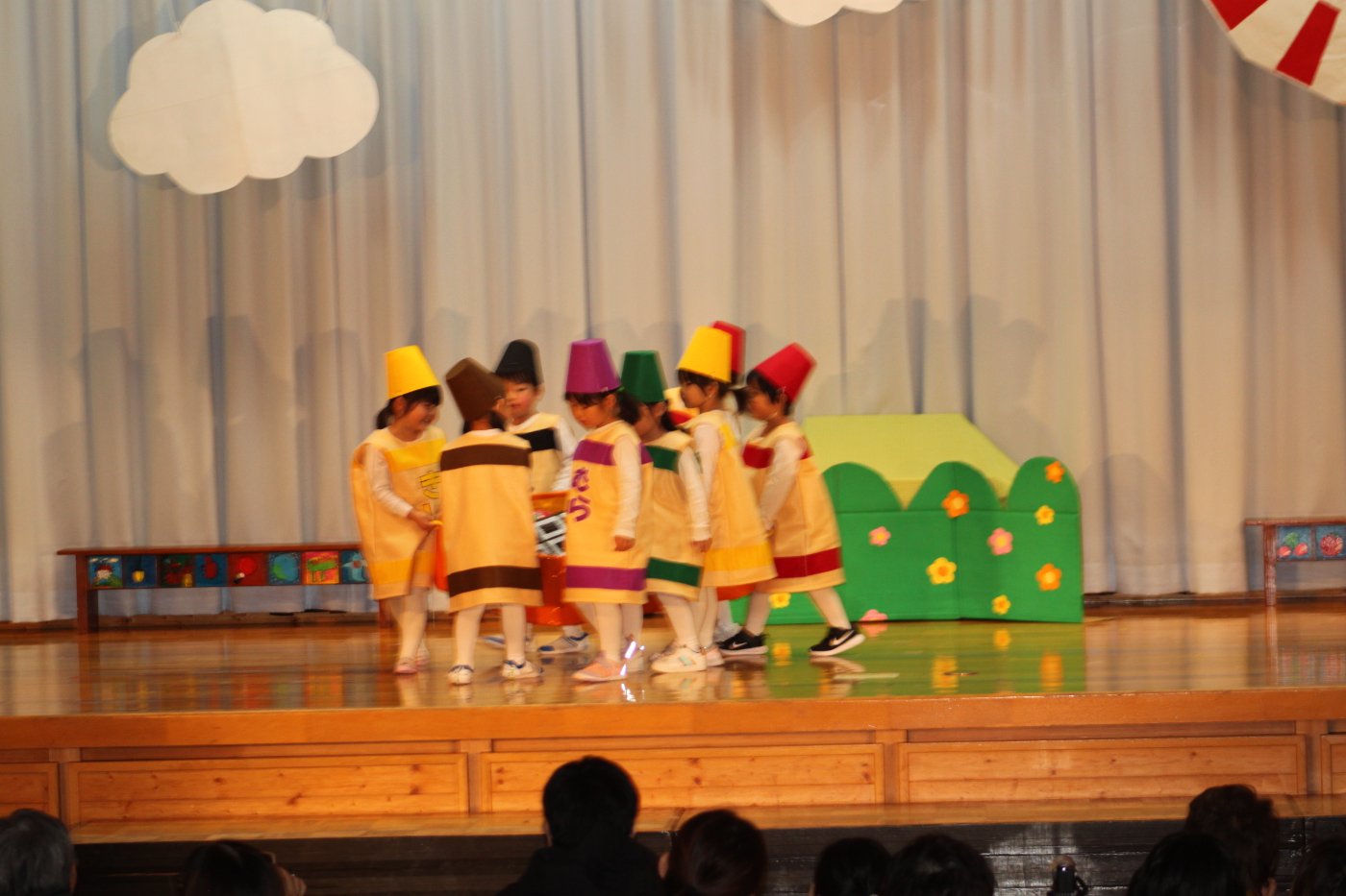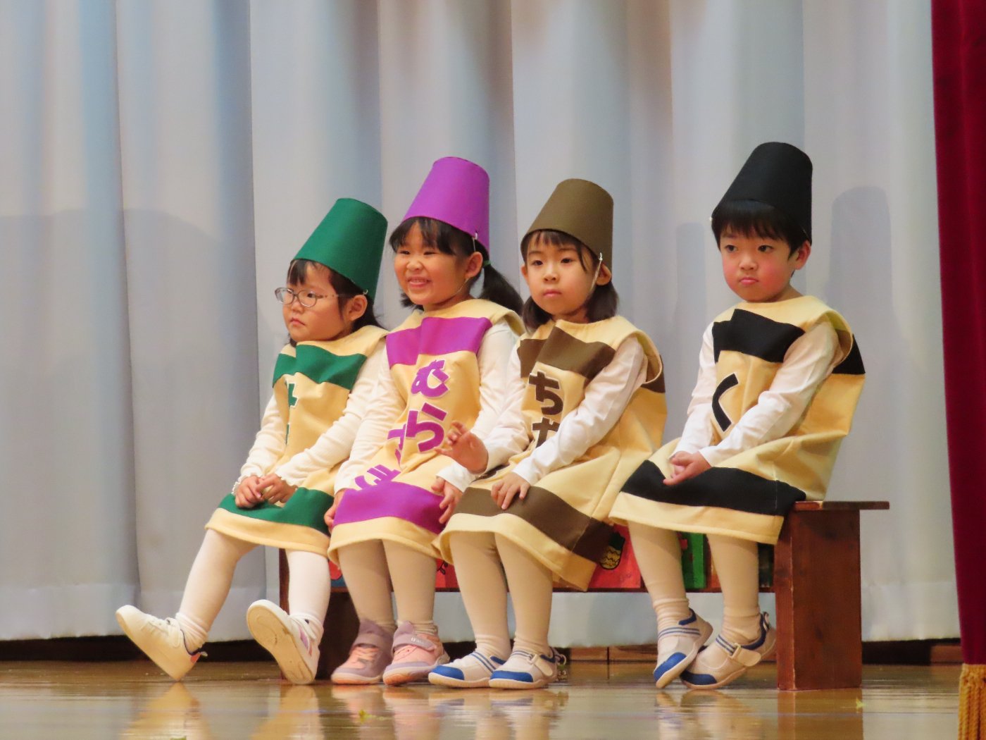 輝いていたね☆彡『第50回ゆめの会』part2 2025年12月21日(日) NEW 行事 10.いちご組/劇遊び『くれよんたちの きょうはなにをかこうかな?』 かわいいクレヨンたちが勢揃い! 自分の好きな色のクレヨンに へ~んしん! ♬どんな色が好き?⇒『赤』! ♪赤い色が好き 赤色クレヨンたちは、『イチゴ』と『トマト』を描いてお弁当箱へ 元気いっぱいの歌声♬ 他の色のクレヨンたちも元気ハツラツな歌声 (^^♪ 黄色クレヨンたちは、『卵焼き』を描いてお弁当箱へ 一人でも、パワフル声量の緑色クレヨン(^^♪ もちろん! 他のクレヨンたちも一緒に歌います♫ ジャジャーン☆彡『キュウリ』を描いてお弁当箱へ リズムに乗って、ウキウキ登場☆彡『紫』クレヨン ジャジャーン☆彡『ブドウ』を描いてお弁当箱へ 元気いっぱい大きな振りで ♫一番先になくなるよ 茶色いクレヨン ジャジャーン☆彡『チョコレート』が飛び出した時は、予想外で会場から驚きの声 最後は、黒色クレヨンが登場☆彡 黒色クレヨンは、『おにぎり』を描いてお弁当箱へ できあがったお弁当を持って、ピクニックへ! 「準備はいいですか?」黒クレヨンの号令で、「それでは皆さんご一緒に!」 い「ただまーす⤴」 頬張る仕草が、これまた可愛い♬ 友達と一緒で楽しい! 普段のクラスの様子が垣間見える劇遊びでした 記念写真☆彡 11.つくし組/オペレッタ『おおかみと しちひきのこやぎ』 開幕とともに、母ヤギ&7匹の子ヤギが登場 お買い物に出かける母ヤギ 子ヤギと約束事を交わします 母さんが帰ってくるまで、扉は絶対開けちゃダメ! 扉は、絶対開けないよ! ♫狙った獲物は逃さない ズンズン迫る音にノッてオオカミ登場☆彡 母さんだったら、もっと優しい声 偽物なんかに、だまされない! 母さんが帰って来るまでは、扉は絶対開けないよ! 再びオオカミ登場☆彡 怖さ&コミカルな動きの表現がナイスです(^^♪ この声は、母さん? 声は、母さんだけど… 手と足の色が違う だまされないぞ~ 扉は、絶対開けないよ! またまた、みんなが好きな『ダメ』ポーズ 最後の手段、小麦粉を持って登場! 音楽に乗り、小麦粉を塗ったように軍手を装着! フォー⤴と雄叫び 声も手足も母さん? 帰っってきた おかえりー!! キャーッ!! オオカミだー 袖から見てみると、必死に隠れています オオカミも子ヤギも、名演技☆彡 逃した獲物はいないか、再確認 柱時計の後ろには…一番小さな子ヤギ 優しく、頼もしい母さんヤギが帰ってきました 寝ているオオカミのお腹を切って、子ヤギを救出 軽やかな音楽と共に 飛び出す子ヤギたち オオカミのお腹の中から無事に生還☆彡 最後は、オオカミのことも助ける肝っ玉母さん(^^♪ 9人の仲間でつくりあげたオペレッタ、たくさんの拍手を受け、やり切った感を味わいました 記念写真☆彡 13.たけのこ組/劇『ブレーメンのおんがくたい』 ゆめの会のトリを飾る たけのこ組の劇 開幕☆彡 歌詞に合わせた大きな振りを意識 後ろの客席に届く声を意識 「働かないと、お母さんたらご飯くれないんだよね…」 客席からの笑い声に、心の中ではガッツポーズ 動きも表情も、ネコになり切っています 「ケンタッキーにされちゃうんだよ」のセリフに、会場が大受けし、心の中ではガッツポーズ! おっとりコミカルなニワトリ役が、はまり役 よし☆彡 みんなでブレーメンに行こう! ブレーメンを目指し、夜道を歩いていると、「あっ、向こうに明かりが見えるよ!」 見せ場早早着替え! 幕が開くと、動物から泥棒に変身☆彡 窓枠から顔をひょっこり! 泥棒の家の中を覗き込むシーン たまらなく、可愛いです♫ ヒヒーン! ワンワン!! ニャーッ! コケコッコー またまた早着替え! 泥棒を追い出すことに大成功☆彡 ビールでカンパーイ! 「このチキン、食べるのに ちょっと勇気いるんだよな…」のセリフに、会場からドッ!と笑い声が またまた心の中ではガッツポーズ☆彡 またまたまた早着替え☆彡 様子がおかしいと戻ってきた泥棒 「おい! お前、あの家の様子を見てこい!」 「嫌ですよ~、いつでも親分と一緒がいいんです♫」との掛け合いに、またまた大受け! 狙い通りに笑いのツボを押さえる演技が光ります☆彡 また泥棒が来た よし、また驚かせてやろう! カンペキに泥棒を追い出すことに大成功☆彡 ブレーメンもいいけど、ここで4人で暮らさないかい? つまり~、ずっとみんなと一緒ってこと? いいね! なかよし4人組♫ 練習を積み重ね、見事な掛け合いを披露☆彡 これまで育まれてきた絆があったからこそ、成せる業です 最後に一人ずつ、配役を交えて自己紹介 全てを出し切った、やり遂げた 清々しい表情をしています 安堵の表情を浮かべています ともに支え合い、認め合ってきた4人の絆が、また深まりました 記念写真☆彡 なかよし4人組♫ 記念写真☆彡 ビール、最高⤴⤴ 14.たけのこ組/挨拶『おわりのことば』 最後の締めの挨拶は、もちろん!たけのこ組 それぞれの思いを込めながら 幼稚園を代表し、見に来てくれた、支えてくれた方々に挨拶 本当にありがと
