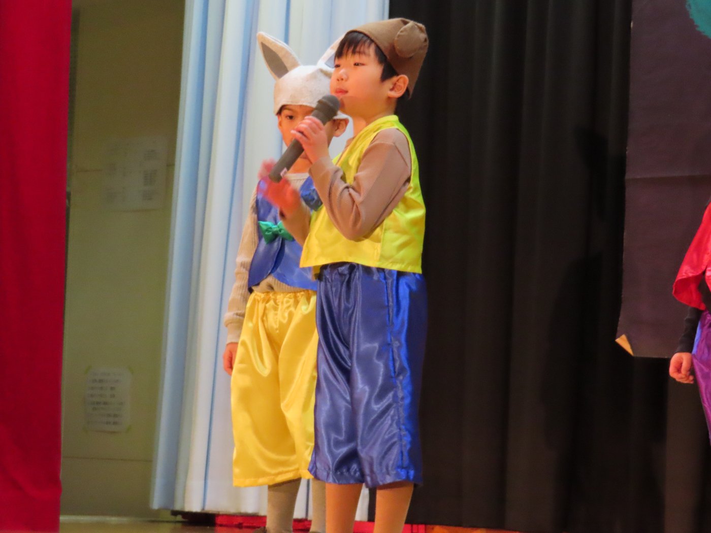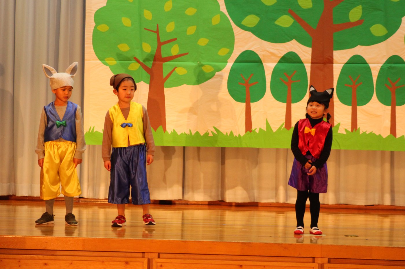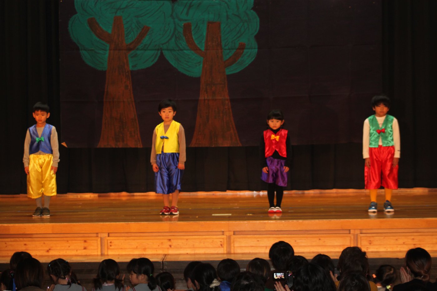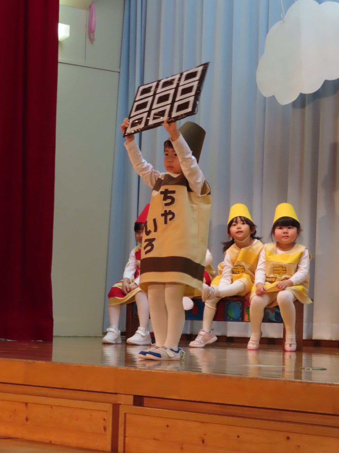 輝いていたね☆彡『第50回ゆめの会』part2 2025年12月21日(日) NEW 行事 10.いちご組/劇遊び『くれよんたちの きょうはなにをかこうかな?』 かわいいクレヨンたちが勢揃い! 自分の好きな色のクレヨンに へ~んしん! ♬どんな色が好き?⇒『赤』! ♪赤い色が好き 赤色クレヨンたちは、『イチゴ』と『トマト』を描いてお弁当箱へ 元気いっぱいの歌声♬ 他の色のクレヨンたちも元気ハツラツな歌声 (^^♪ 黄色クレヨンたちは、『卵焼き』を描いてお弁当箱へ 一人でも、パワフル声量の緑色クレヨン(^^♪ もちろん! 他のクレヨンたちも一緒に歌います♫ ジャジャーン☆彡『キュウリ』を描いてお弁当箱へ リズムに乗って、ウキウキ登場☆彡『紫』クレヨン ジャジャーン☆彡『ブドウ』を描いてお弁当箱へ 元気いっぱい大きな振りで ♫一番先になくなるよ 茶色いクレヨン ジャジャーン☆彡『チョコレート』が飛び出した時は、予想外で会場から驚きの声 最後は、黒色クレヨンが登場☆彡 黒色クレヨンは、『おにぎり』を描いてお弁当箱へ できあがったお弁当を持って、ピクニックへ! 「準備はいいですか?」黒クレヨンの号令で、「それでは皆さんご一緒に!」 い「ただまーす⤴」 頬張る仕草が、これまた可愛い♬ 友達と一緒で楽しい! 普段のクラスの様子が垣間見える劇遊びでした 記念写真☆彡 11.つくし組/オペレッタ『おおかみと しちひきのこやぎ』 開幕とともに、母ヤギ&7匹の子ヤギが登場 お買い物に出かける母ヤギ 子ヤギと約束事を交わします 母さんが帰ってくるまで、扉は絶対開けちゃダメ! 扉は、絶対開けないよ! ♫狙った獲物は逃さない ズンズン迫る音にノッてオオカミ登場☆彡 母さんだったら、もっと優しい声 偽物なんかに、だまされない! 母さんが帰って来るまでは、扉は絶対開けないよ! 再びオオカミ登場☆彡 怖さ&コミカルな動きの表現がナイスです(^^♪ この声は、母さん? 声は、母さんだけど… 手と足の色が違う だまされないぞ~ 扉は、絶対開けないよ! またまた、みんなが好きな『ダメ』ポーズ 最後の手段、小麦粉を持って登場! 音楽に乗り、小麦粉を塗ったように軍手を装着! フォー⤴と雄叫び 声も手足も母さん? 帰っってきた おかえりー!! キャーッ!! オオカミだー 袖から見てみると、必死に隠れています オオカミも子ヤギも、名演技☆彡 逃した獲物はいないか、再確認 柱時計の後ろには…一番小さな子ヤギ 優しく、頼もしい母さんヤギが帰ってきました 寝ているオオカミのお腹を切って、子ヤギを救出 軽やかな音楽と共に 飛び出す子ヤギたち オオカミのお腹の中から無事に生還☆彡 最後は、オオカミのことも助ける肝っ玉母さん(^^♪ 9人の仲間でつくりあげたオペレッタ、たくさんの拍手を受け、やり切った感を味わいました 記念写真☆彡 13.たけのこ組/劇『ブレーメンのおんがくたい』 ゆめの会のトリを飾る たけのこ組の劇 開幕☆彡 歌詞に合わせた大きな振りを意識 後ろの客席に届く声を意識 「働かないと、お母さんたらご飯くれないんだよね…」 客席からの笑い声に、心の中ではガッツポーズ 動きも表情も、ネコになり切っています 「ケンタッキーにされちゃうんだよ」のセリフに、会場が大受けし、心の中ではガッツポーズ! おっとりコミカルなニワトリ役が、はまり役 よし☆彡 みんなでブレーメンに行こう! ブレーメンを目指し、夜道を歩いていると、「あっ、向こうに明かりが見えるよ!」 見せ場早早着替え! 幕が開くと、動物から泥棒に変身☆彡 窓枠から顔をひょっこり! 泥棒の家の中を覗き込むシーン たまらなく、可愛いです♫ ヒヒーン! ワンワン!! ニャーッ! コケコッコー またまた早着替え! 泥棒を追い出すことに大成功☆彡 ビールでカンパーイ! 「このチキン、食べるのに ちょっと勇気いるんだよな…」のセリフに、会場からドッ!と笑い声が またまた心の中ではガッツポーズ☆彡 またまたまた早着替え☆彡 様子がおかしいと戻ってきた泥棒 「おい! お前、あの家の様子を見てこい!」 「嫌ですよ~、いつでも親分と一緒がいいんです♫」との掛け合いに、またまた大受け! 狙い通りに笑いのツボを押さえる演技が光ります☆彡 また泥棒が来た よし、また驚かせてやろう! カンペキに泥棒を追い出すことに大成功☆彡 ブレーメンもいいけど、ここで4人で暮らさないかい? つまり~、ずっとみんなと一緒ってこと? いいね! なかよし4人組♫ 練習を積み重ね、見事な掛け合いを披露☆彡 これまで育まれてきた絆があったからこそ、成せる業です 最後に一人ずつ、配役を交えて自己紹介 全てを出し切った、やり遂げた 清々しい表情をしています 安堵の表情を浮かべています ともに支え合い、認め合ってきた4人の絆が、また深まりました 記念写真☆彡 なかよし4人組♫ 記念写真☆彡 ビール、最高⤴⤴ 14.たけのこ組/挨拶『おわりのことば』 最後の締めの挨拶は、もちろん!たけのこ組 それぞれの思いを込めながら 幼稚園を代表し、見に来てくれた、支えてくれた方々に挨拶 本当にありがと