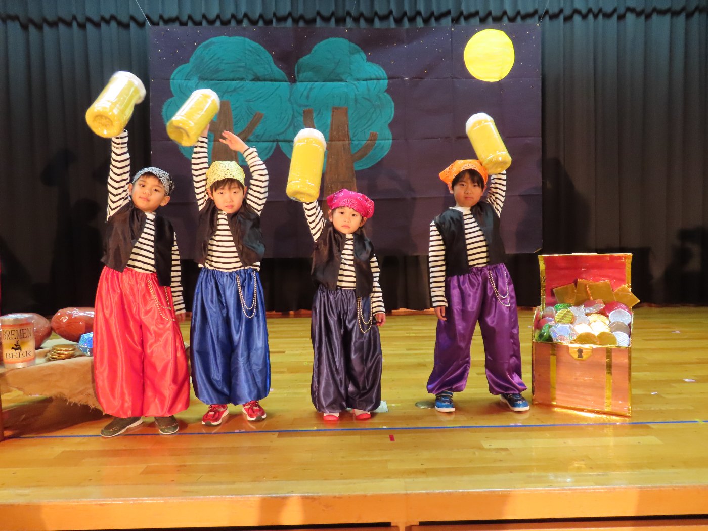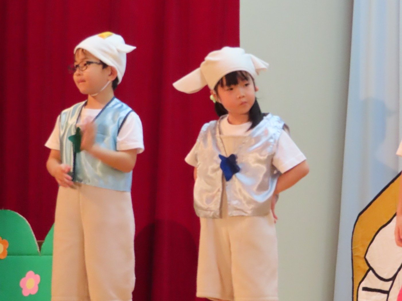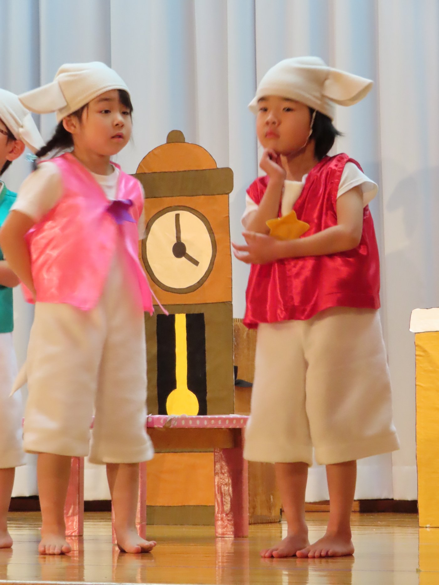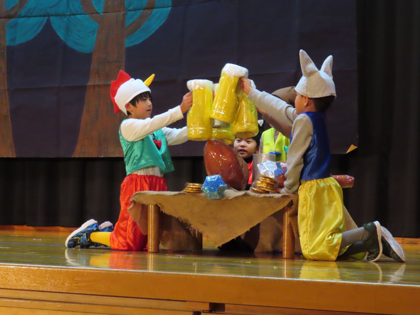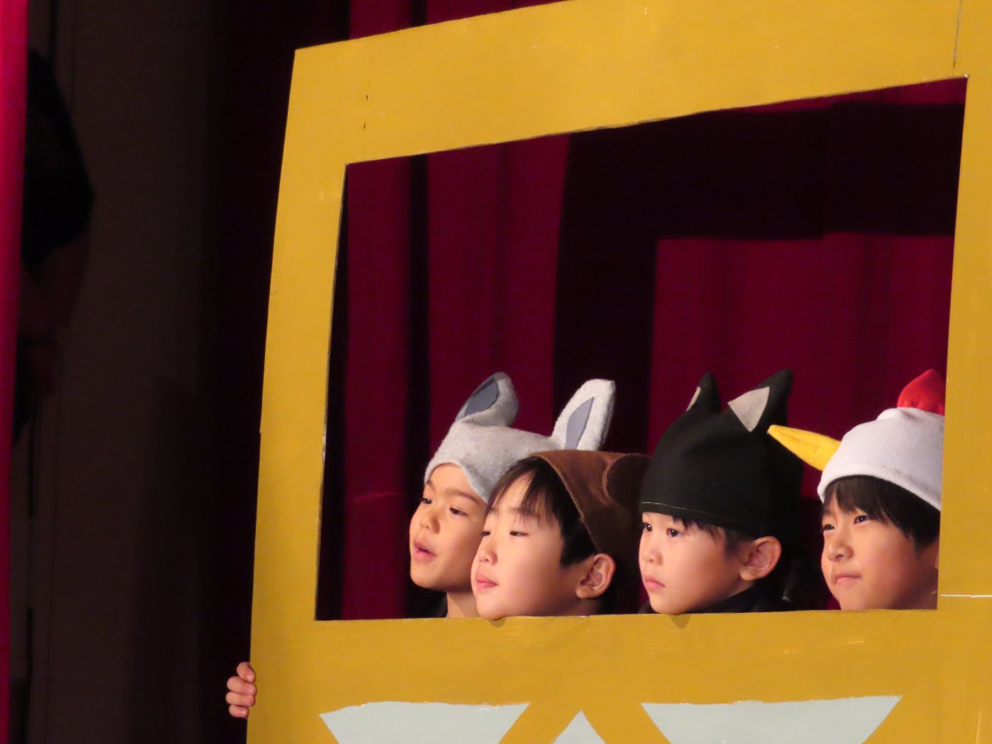 輝いていたね☆彡『第50回ゆめの会』part2 2025年12月21日(日) NEW 行事 10.いちご組/劇遊び『くれよんたちの きょうはなにをかこうかな?』 かわいいクレヨンたちが勢揃い! 自分の好きな色のクレヨンに へ~んしん! ♬どんな色が好き?⇒『赤』! ♪赤い色が好き 赤色クレヨンたちは、『イチゴ』と『トマト』を描いてお弁当箱へ 元気いっぱいの歌声♬ 他の色のクレヨンたちも元気ハツラツな歌声 (^^♪ 黄色クレヨンたちは、『卵焼き』を描いてお弁当箱へ 一人でも、パワフル声量の緑色クレヨン(^^♪ もちろん! 他のクレヨンたちも一緒に歌います♫ ジャジャーン☆彡『キュウリ』を描いてお弁当箱へ リズムに乗って、ウキウキ登場☆彡『紫』クレヨン ジャジャーン☆彡『ブドウ』を描いてお弁当箱へ 元気いっぱい大きな振りで ♫一番先になくなるよ 茶色いクレヨン ジャジャーン☆彡『チョコレート』が飛び出した時は、予想外で会場から驚きの声 最後は、黒色クレヨンが登場☆彡 黒色クレヨンは、『おにぎり』を描いてお弁当箱へ できあがったお弁当を持って、ピクニックへ! 「準備はいいですか?」黒クレヨンの号令で、「それでは皆さんご一緒に!」 い「ただまーす⤴」 頬張る仕草が、これまた可愛い♬ 友達と一緒で楽しい! 普段のクラスの様子が垣間見える劇遊びでした 記念写真☆彡 11.つくし組/オペレッタ『おおかみと しちひきのこやぎ』 開幕とともに、母ヤギ&7匹の子ヤギが登場 お買い物に出かける母ヤギ 子ヤギと約束事を交わします 母さんが帰ってくるまで、扉は絶対開けちゃダメ! 扉は、絶対開けないよ! ♫狙った獲物は逃さない ズンズン迫る音にノッてオオカミ登場☆彡 母さんだったら、もっと優しい声 偽物なんかに、だまされない! 母さんが帰って来るまでは、扉は絶対開けないよ! 再びオオカミ登場☆彡 怖さ&コミカルな動きの表現がナイスです(^^♪ この声は、母さん? 声は、母さんだけど… 手と足の色が違う だまされないぞ~ 扉は、絶対開けないよ! またまた、みんなが好きな『ダメ』ポーズ 最後の手段、小麦粉を持って登場! 音楽に乗り、小麦粉を塗ったように軍手を装着! フォー⤴と雄叫び 声も手足も母さん? 帰っってきた おかえりー!! キャーッ!! オオカミだー 袖から見てみると、必死に隠れています オオカミも子ヤギも、名演技☆彡 逃した獲物はいないか、再確認 柱時計の後ろには…一番小さな子ヤギ 優しく、頼もしい母さんヤギが帰ってきました 寝ているオオカミのお腹を切って、子ヤギを救出 軽やかな音楽と共に 飛び出す子ヤギたち オオカミのお腹の中から無事に生還☆彡 最後は、オオカミのことも助ける肝っ玉母さん(^^♪ 9人の仲間でつくりあげたオペレッタ、たくさんの拍手を受け、やり切った感を味わいました 記念写真☆彡 13.たけのこ組/劇『ブレーメンのおんがくたい』 ゆめの会のトリを飾る たけのこ組の劇 開幕☆彡 歌詞に合わせた大きな振りを意識 後ろの客席に届く声を意識 「働かないと、お母さんたらご飯くれないんだよね…」 客席からの笑い声に、心の中ではガッツポーズ 動きも表情も、ネコになり切っています 「ケンタッキーにされちゃうんだよ」のセリフに、会場が大受けし、心の中ではガッツポーズ! おっとりコミカルなニワトリ役が、はまり役 よし☆彡 みんなでブレーメンに行こう! ブレーメンを目指し、夜道を歩いていると、「あっ、向こうに明かりが見えるよ!」 見せ場早早着替え! 幕が開くと、動物から泥棒に変身☆彡 窓枠から顔をひょっこり! 泥棒の家の中を覗き込むシーン たまらなく、可愛いです♫ ヒヒーン! ワンワン!! ニャーッ! コケコッコー またまた早着替え! 泥棒を追い出すことに大成功☆彡 ビールでカンパーイ! 「このチキン、食べるのに ちょっと勇気いるんだよな…」のセリフに、会場からドッ!と笑い声が またまた心の中ではガッツポーズ☆彡 またまたまた早着替え☆彡 様子がおかしいと戻ってきた泥棒 「おい! お前、あの家の様子を見てこい!」 「嫌ですよ~、いつでも親分と一緒がいいんです♫」との掛け合いに、またまた大受け! 狙い通りに笑いのツボを押さえる演技が光ります☆彡 また泥棒が来た よし、また驚かせてやろう! カンペキに泥棒を追い出すことに大成功☆彡 ブレーメンもいいけど、ここで4人で暮らさないかい? つまり~、ずっとみんなと一緒ってこと? いいね! なかよし4人組♫ 練習を積み重ね、見事な掛け合いを披露☆彡 これまで育まれてきた絆があったからこそ、成せる業です 最後に一人ずつ、配役を交えて自己紹介 全てを出し切った、やり遂げた 清々しい表情をしています 安堵の表情を浮かべています ともに支え合い、認め合ってきた4人の絆が、また深まりました 記念写真☆彡 なかよし4人組♫ 記念写真☆彡 ビール、最高⤴⤴ 14.たけのこ組/挨拶『おわりのことば』 最後の締めの挨拶は、もちろん!たけのこ組 それぞれの思いを込めながら 幼稚園を代表し、見に来てくれた、支えてくれた方々に挨拶 本当にありがと