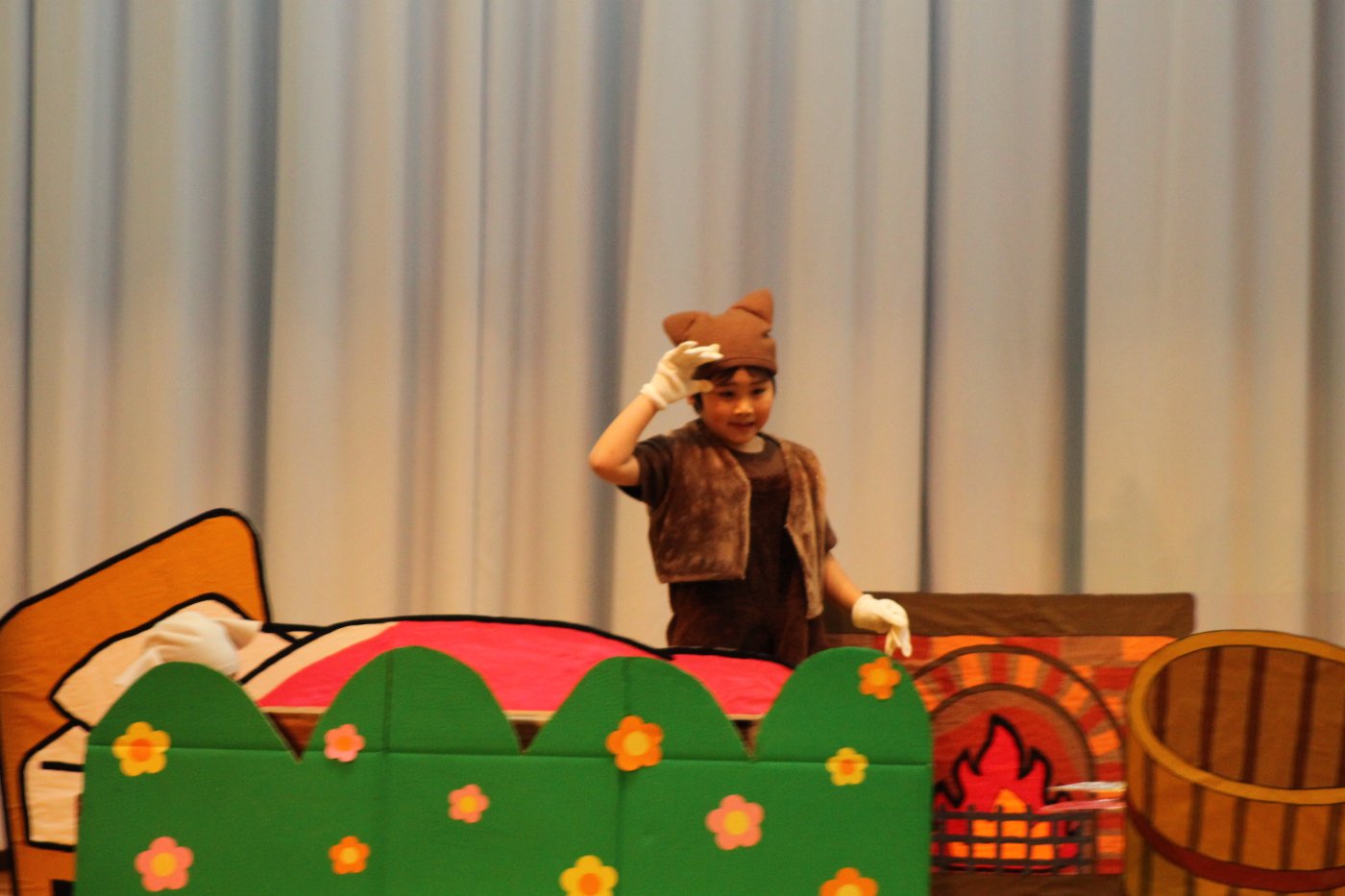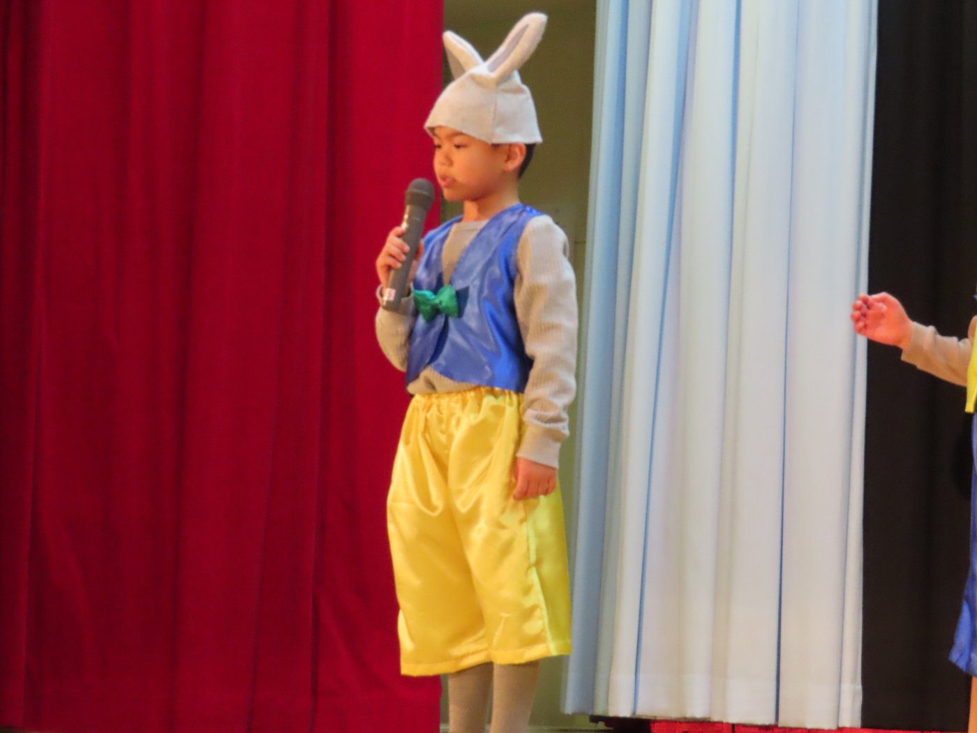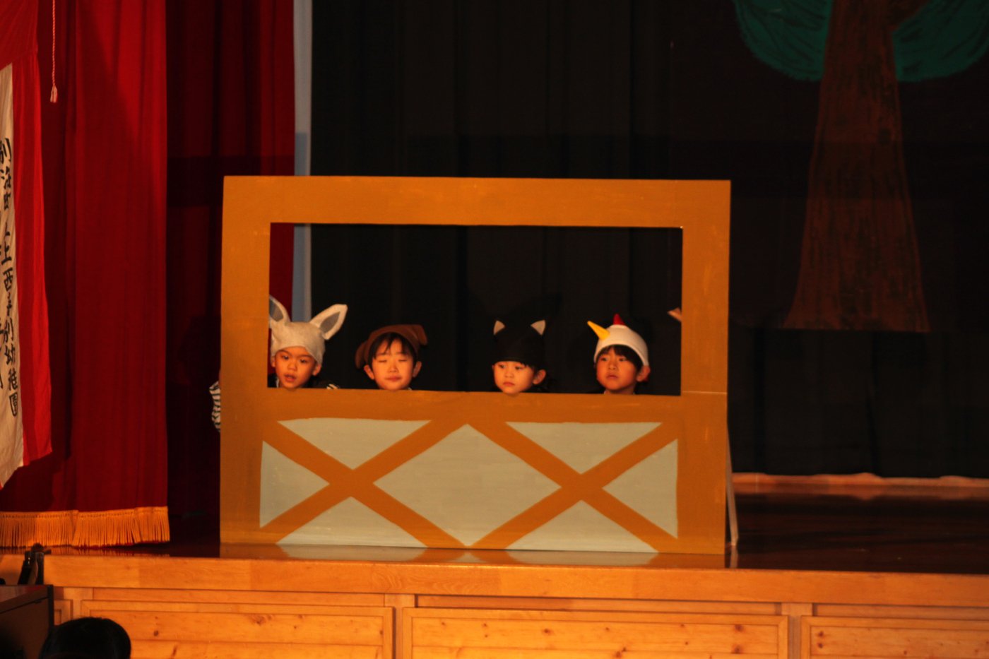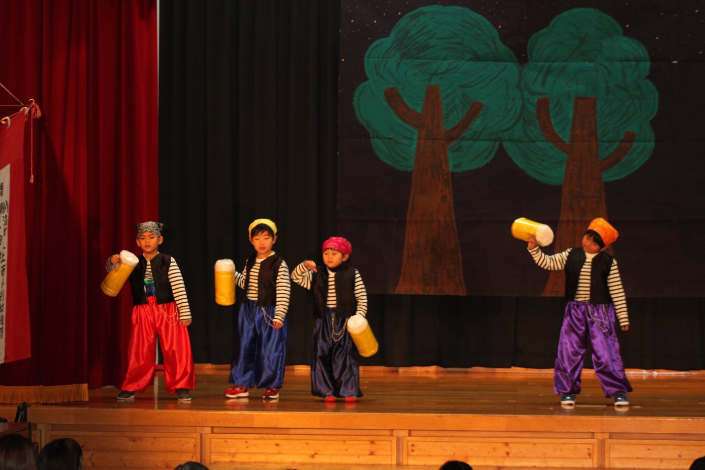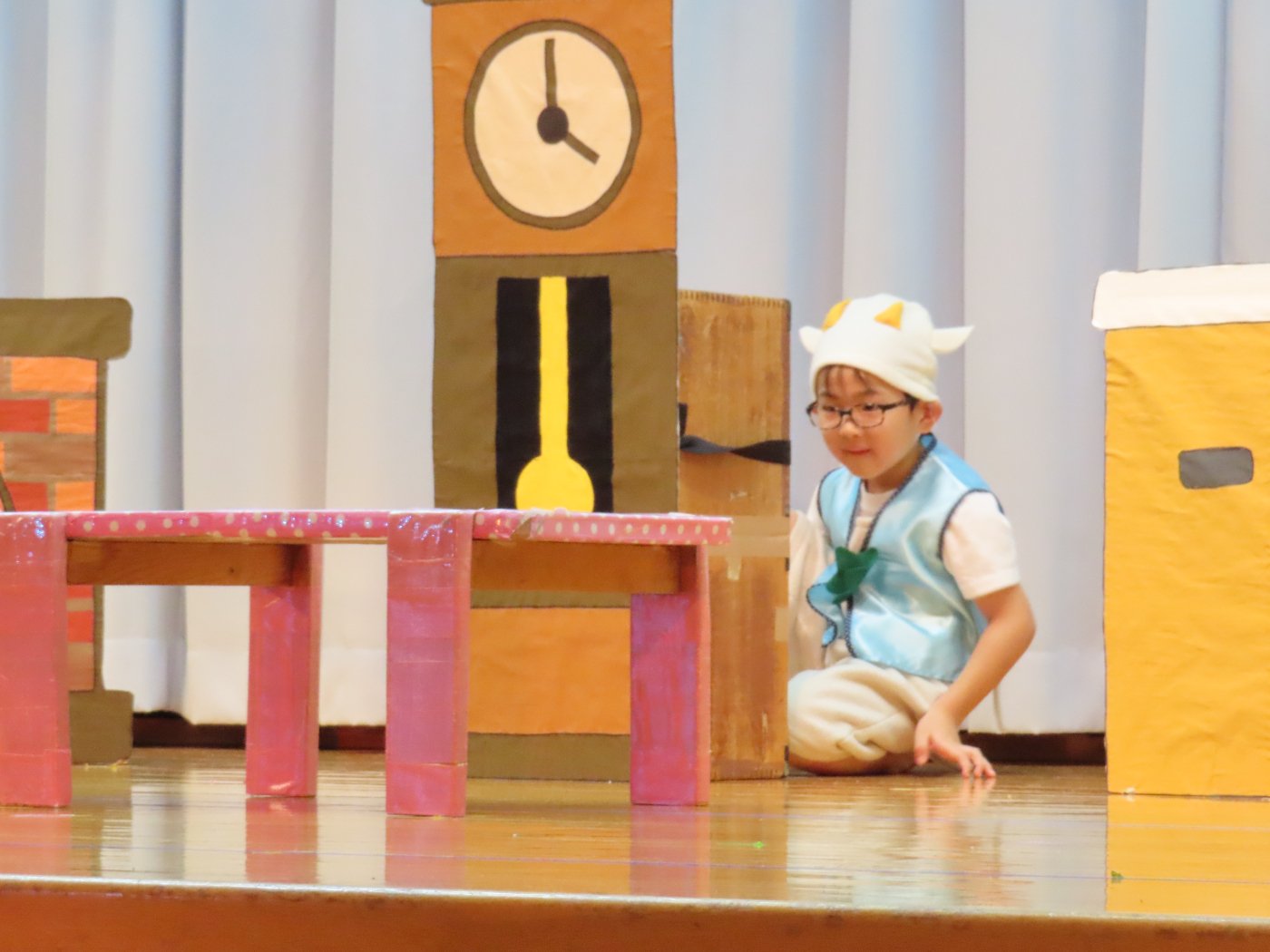 輝いていたね☆彡『第50回ゆめの会』part2 2025年12月21日(日) NEW 行事 10.いちご組/劇遊び『くれよんたちの きょうはなにをかこうかな?』 かわいいクレヨンたちが勢揃い! 自分の好きな色のクレヨンに へ~んしん! ♬どんな色が好き?⇒『赤』! ♪赤い色が好き 赤色クレヨンたちは、『イチゴ』と『トマト』を描いてお弁当箱へ 元気いっぱいの歌声♬ 他の色のクレヨンたちも元気ハツラツな歌声 (^^♪ 黄色クレヨンたちは、『卵焼き』を描いてお弁当箱へ 一人でも、パワフル声量の緑色クレヨン(^^♪ もちろん! 他のクレヨンたちも一緒に歌います♫ ジャジャーン☆彡『キュウリ』を描いてお弁当箱へ リズムに乗って、ウキウキ登場☆彡『紫』クレヨン ジャジャーン☆彡『ブドウ』を描いてお弁当箱へ 元気いっぱい大きな振りで ♫一番先になくなるよ 茶色いクレヨン ジャジャーン☆彡『チョコレート』が飛び出した時は、予想外で会場から驚きの声 最後は、黒色クレヨンが登場☆彡 黒色クレヨンは、『おにぎり』を描いてお弁当箱へ できあがったお弁当を持って、ピクニックへ! 「準備はいいですか?」黒クレヨンの号令で、「それでは皆さんご一緒に!」 い「ただまーす⤴」 頬張る仕草が、これまた可愛い♬ 友達と一緒で楽しい! 普段のクラスの様子が垣間見える劇遊びでした 記念写真☆彡 11.つくし組/オペレッタ『おおかみと しちひきのこやぎ』 開幕とともに、母ヤギ&7匹の子ヤギが登場 お買い物に出かける母ヤギ 子ヤギと約束事を交わします 母さんが帰ってくるまで、扉は絶対開けちゃダメ! 扉は、絶対開けないよ! ♫狙った獲物は逃さない ズンズン迫る音にノッてオオカミ登場☆彡 母さんだったら、もっと優しい声 偽物なんかに、だまされない! 母さんが帰って来るまでは、扉は絶対開けないよ! 再びオオカミ登場☆彡 怖さ&コミカルな動きの表現がナイスです(^^♪ この声は、母さん? 声は、母さんだけど… 手と足の色が違う だまされないぞ~ 扉は、絶対開けないよ! またまた、みんなが好きな『ダメ』ポーズ 最後の手段、小麦粉を持って登場! 音楽に乗り、小麦粉を塗ったように軍手を装着! フォー⤴と雄叫び 声も手足も母さん? 帰っってきた おかえりー!! キャーッ!! オオカミだー 袖から見てみると、必死に隠れています オオカミも子ヤギも、名演技☆彡 逃した獲物はいないか、再確認 柱時計の後ろには…一番小さな子ヤギ 優しく、頼もしい母さんヤギが帰ってきました 寝ているオオカミのお腹を切って、子ヤギを救出 軽やかな音楽と共に 飛び出す子ヤギたち オオカミのお腹の中から無事に生還☆彡 最後は、オオカミのことも助ける肝っ玉母さん(^^♪ 9人の仲間でつくりあげたオペレッタ、たくさんの拍手を受け、やり切った感を味わいました 記念写真☆彡 13.たけのこ組/劇『ブレーメンのおんがくたい』 ゆめの会のトリを飾る たけのこ組の劇 開幕☆彡 歌詞に合わせた大きな振りを意識 後ろの客席に届く声を意識 「働かないと、お母さんたらご飯くれないんだよね…」 客席からの笑い声に、心の中ではガッツポーズ 動きも表情も、ネコになり切っています 「ケンタッキーにされちゃうんだよ」のセリフに、会場が大受けし、心の中ではガッツポーズ! おっとりコミカルなニワトリ役が、はまり役 よし☆彡 みんなでブレーメンに行こう! ブレーメンを目指し、夜道を歩いていると、「あっ、向こうに明かりが見えるよ!」 見せ場早早着替え! 幕が開くと、動物から泥棒に変身☆彡 窓枠から顔をひょっこり! 泥棒の家の中を覗き込むシーン たまらなく、可愛いです♫ ヒヒーン! ワンワン!! ニャーッ! コケコッコー またまた早着替え! 泥棒を追い出すことに大成功☆彡 ビールでカンパーイ! 「このチキン、食べるのに ちょっと勇気いるんだよな…」のセリフに、会場からドッ!と笑い声が またまた心の中ではガッツポーズ☆彡 またまたまた早着替え☆彡 様子がおかしいと戻ってきた泥棒 「おい! お前、あの家の様子を見てこい!」 「嫌ですよ~、いつでも親分と一緒がいいんです♫」との掛け合いに、またまた大受け! 狙い通りに笑いのツボを押さえる演技が光ります☆彡 また泥棒が来た よし、また驚かせてやろう! カンペキに泥棒を追い出すことに大成功☆彡 ブレーメンもいいけど、ここで4人で暮らさないかい? つまり~、ずっとみんなと一緒ってこと? いいね! なかよし4人組♫ 練習を積み重ね、見事な掛け合いを披露☆彡 これまで育まれてきた絆があったからこそ、成せる業です 最後に一人ずつ、配役を交えて自己紹介 全てを出し切った、やり遂げた 清々しい表情をしています 安堵の表情を浮かべています ともに支え合い、認め合ってきた4人の絆が、また深まりました 記念写真☆彡 なかよし4人組♫ 記念写真☆彡 ビール、最高⤴⤴ 14.たけのこ組/挨拶『おわりのことば』 最後の締めの挨拶は、もちろん!たけのこ組 それぞれの思いを込めながら 幼稚園を代表し、見に来てくれた、支えてくれた方々に挨拶 本当にありがと