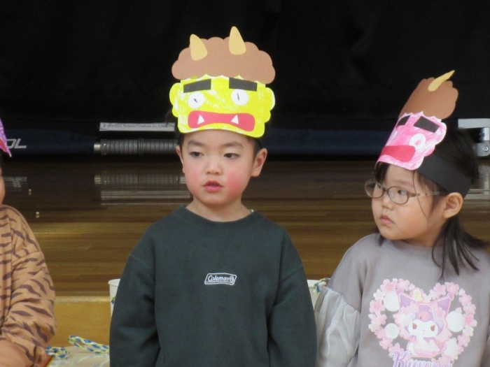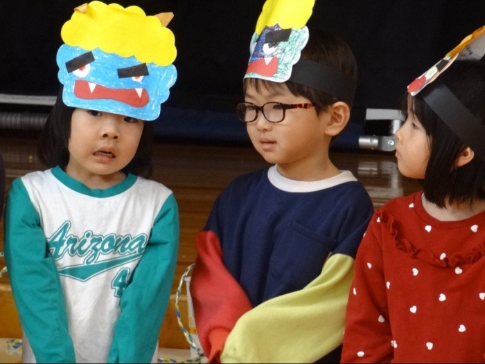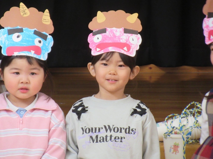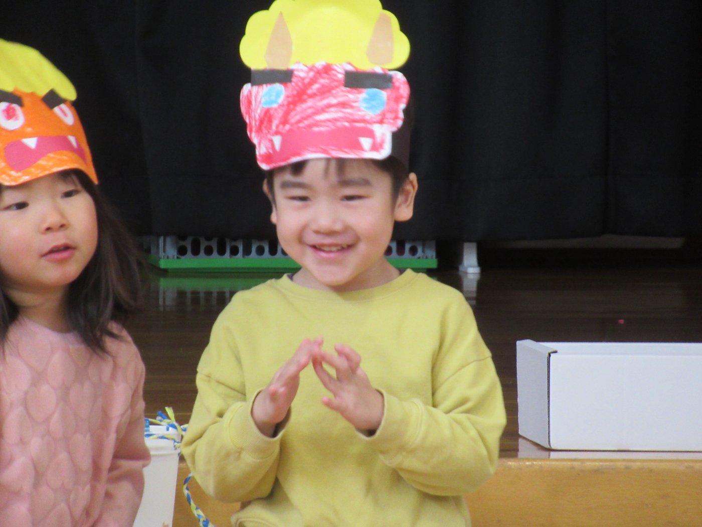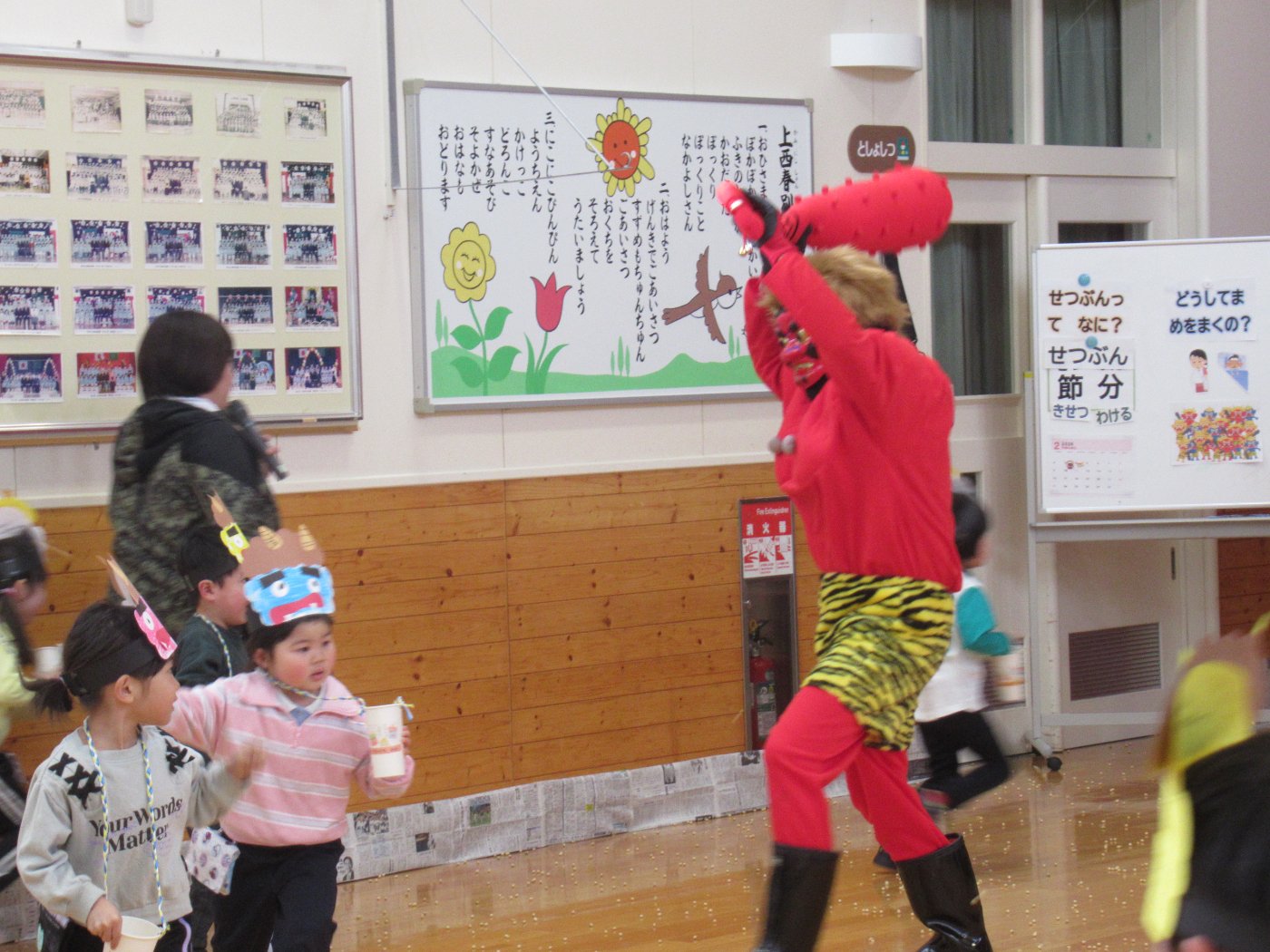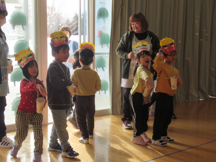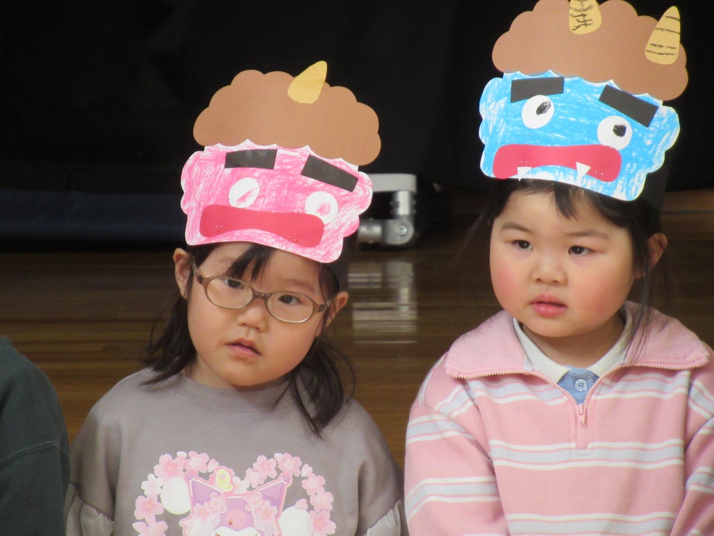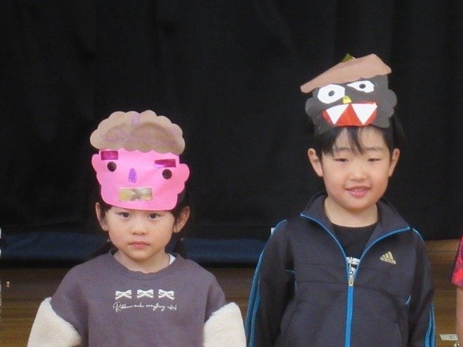 2月3日『節分』の日、幼稚園でも日本の伝統文化への興味・関心を深めようと『豆まき会』を行いました。自分の心の中の鬼を追い出せば鬼は来ないはず!と言っていましたが、経験している子ども達の中には半信半疑でソワソワ、朝から気分がどんよりしている子もおりました。