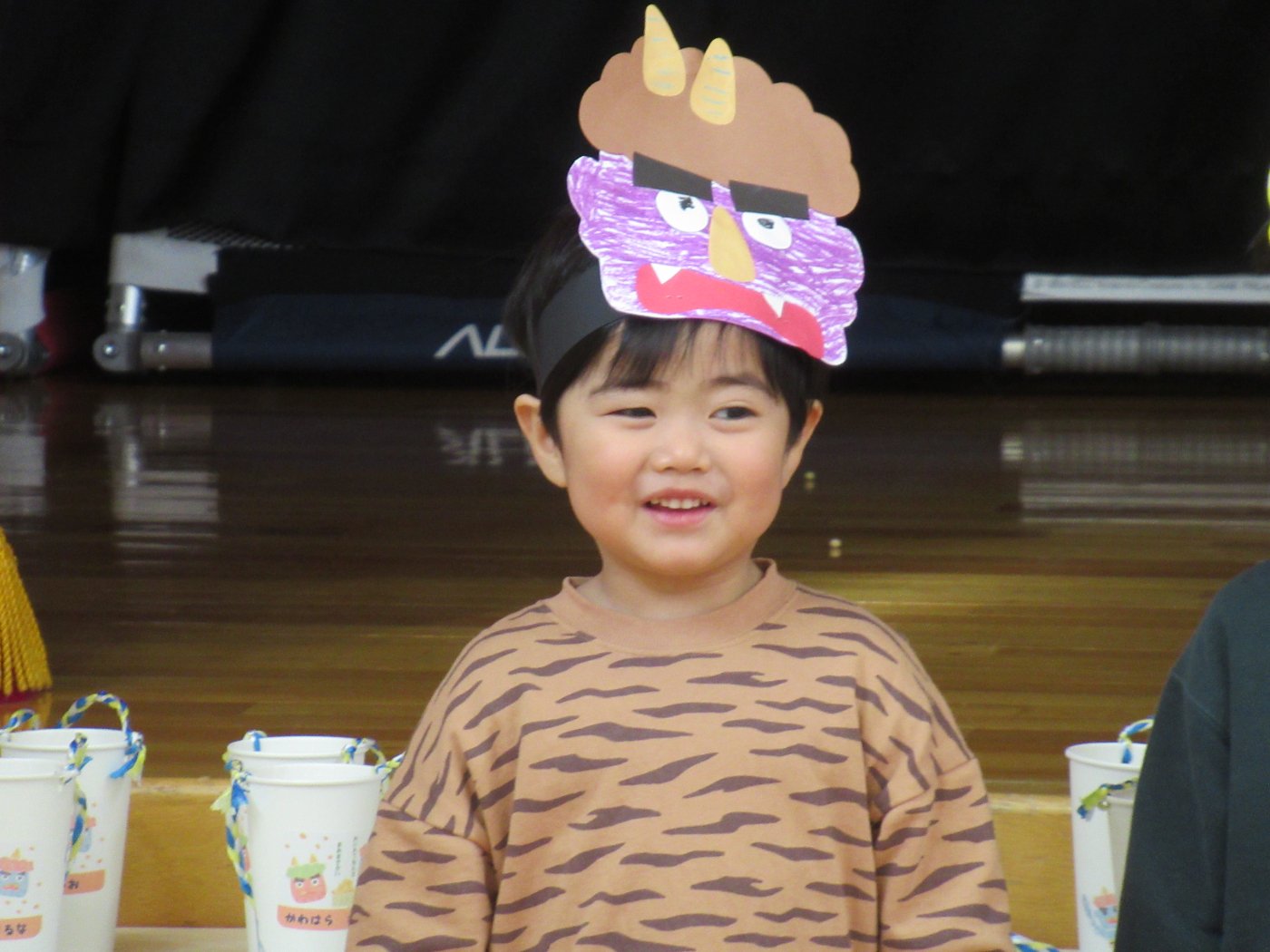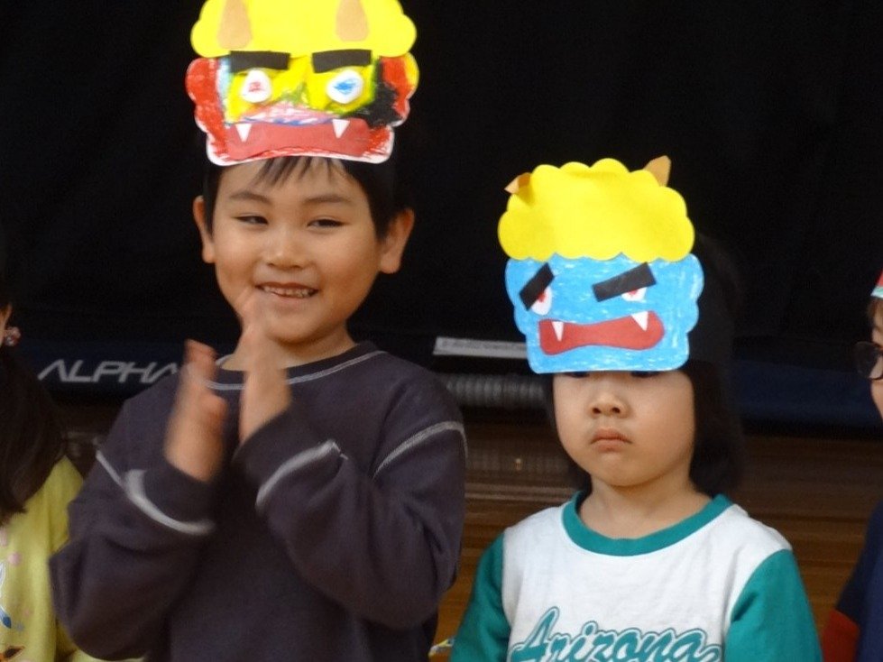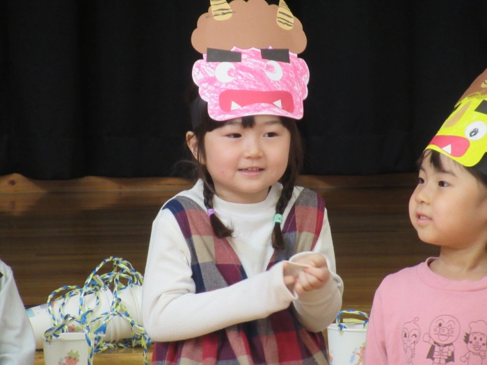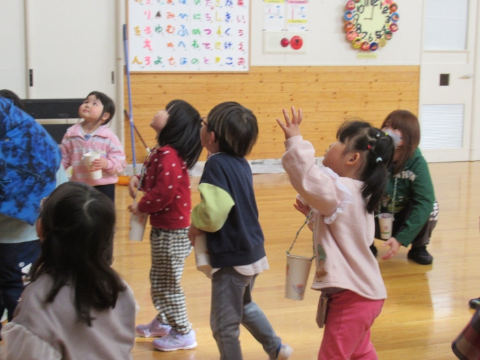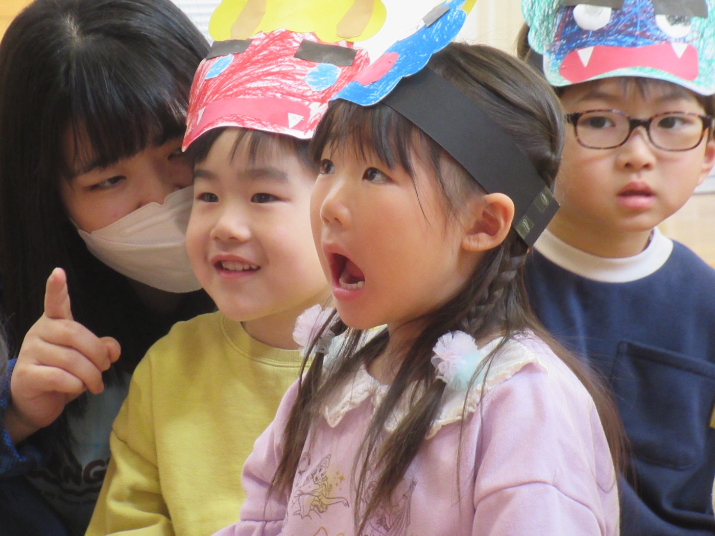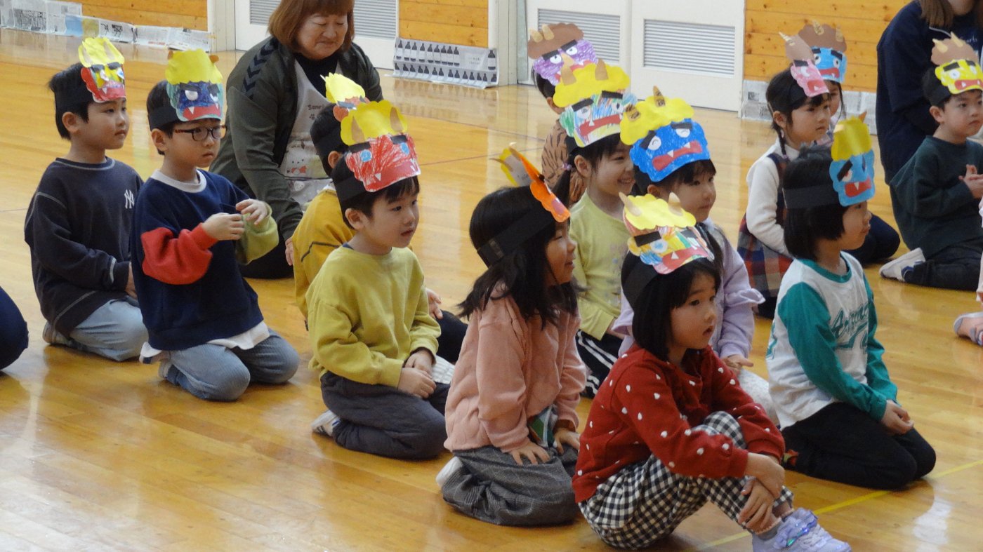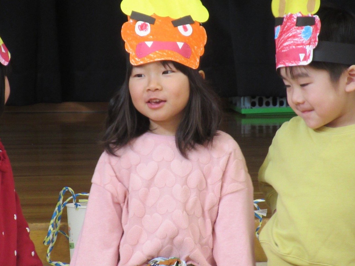 2月3日『節分』の日、幼稚園でも日本の伝統文化への興味・関心を深めようと『豆まき会』を行いました。自分の心の中の鬼を追い出せば鬼は来ないはず!と言っていましたが、経験している子ども達の中には半信半疑でソワソワ、朝から気分がどんよりしている子もおりました。