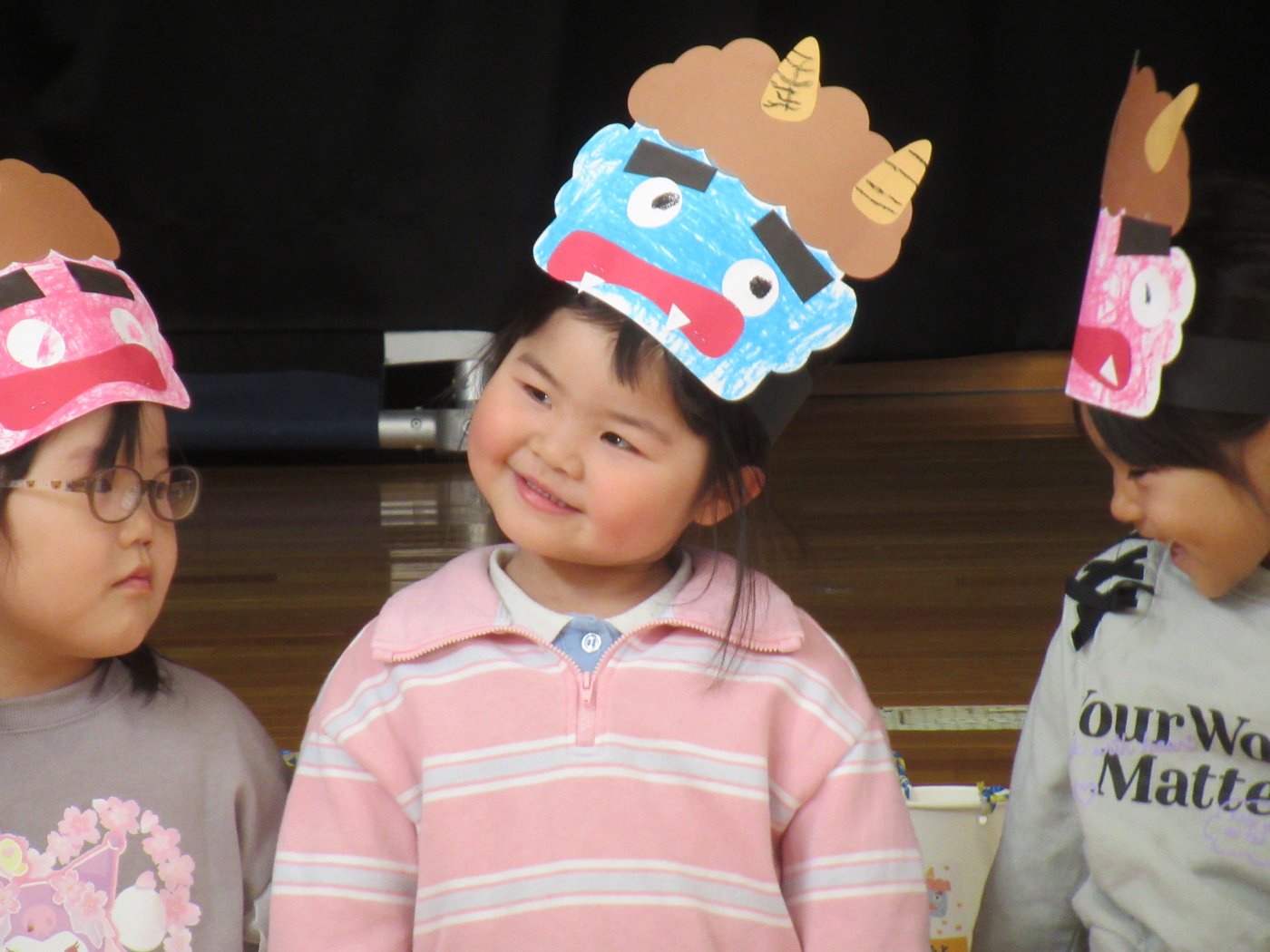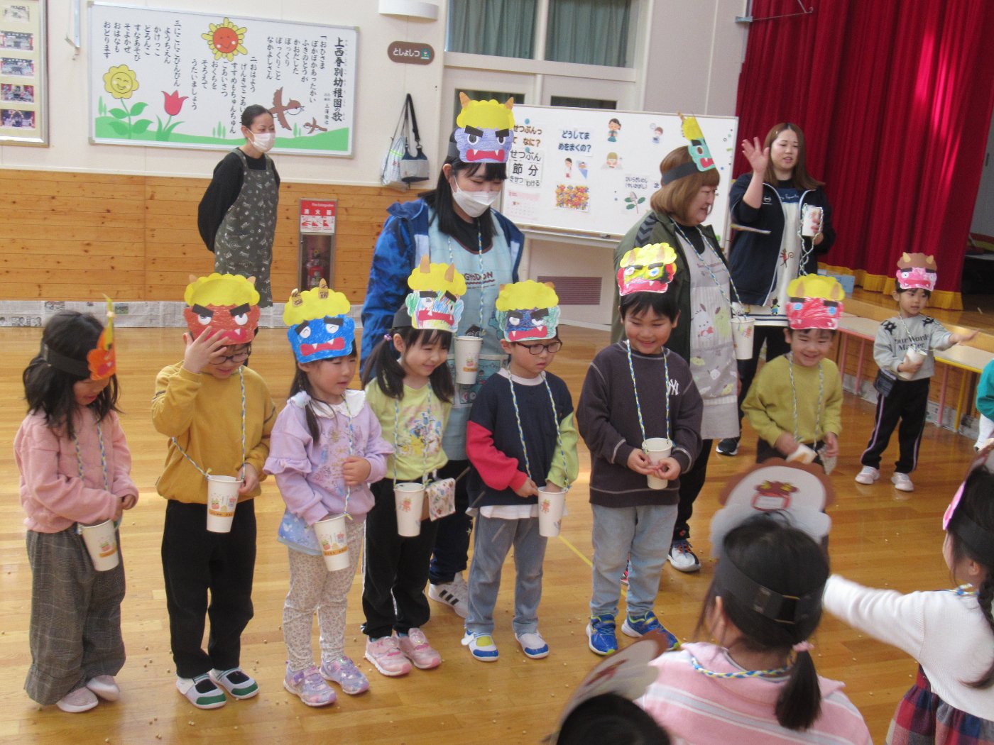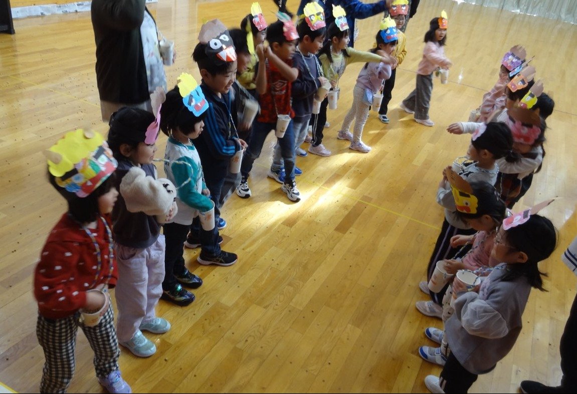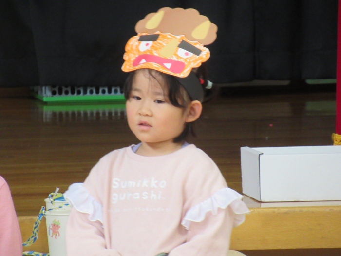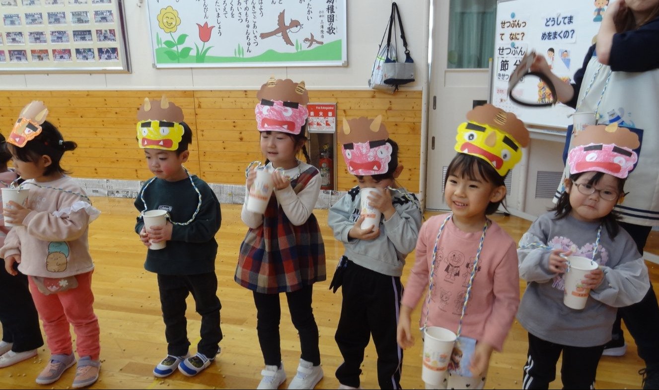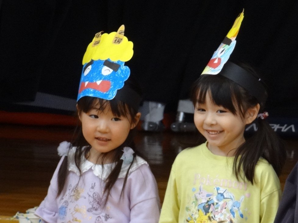 2月3日『節分』の日、幼稚園でも日本の伝統文化への興味・関心を深めようと『豆まき会』を行いました。自分の心の中の鬼を追い出せば鬼は来ないはず!と言っていましたが、経験している子ども達の中には半信半疑でソワソワ、朝から気分がどんよりしている子もおりました。
