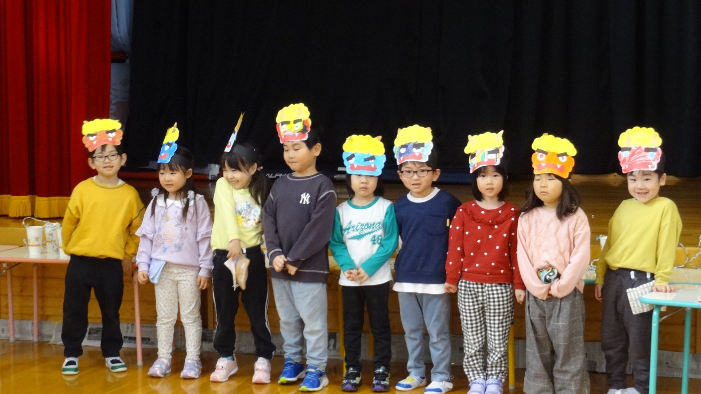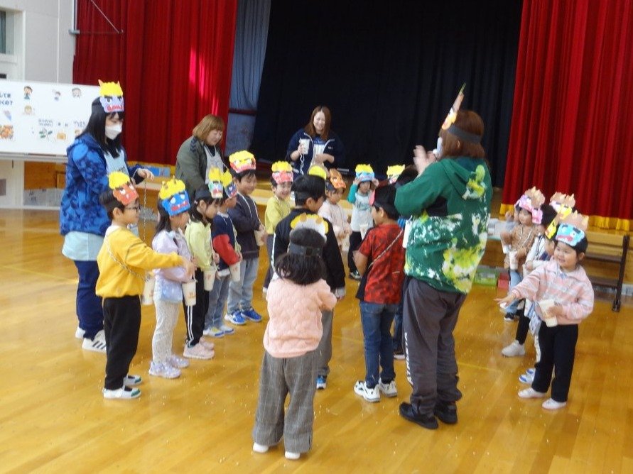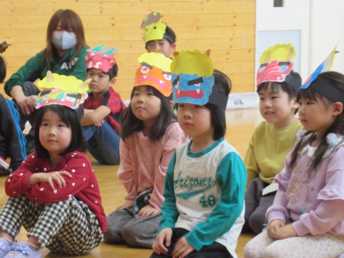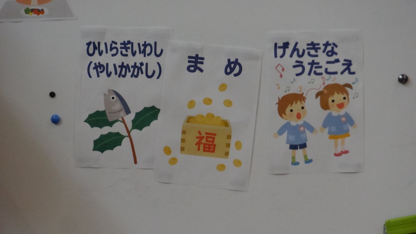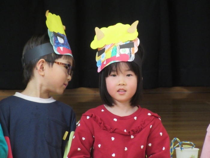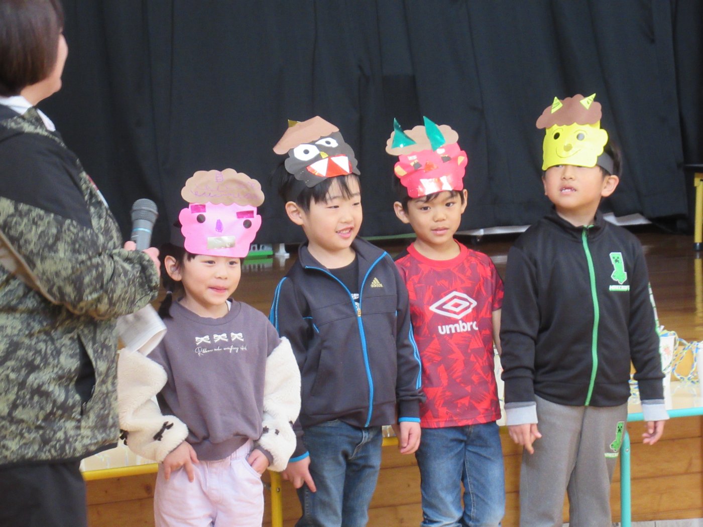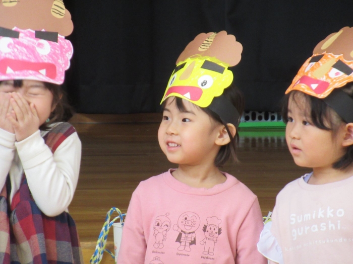 2月3日『節分』の日、幼稚園でも日本の伝統文化への興味・関心を深めようと『豆まき会』を行いました。自分の心の中の鬼を追い出せば鬼は来ないはず!と言っていましたが、経験している子ども達の中には半信半疑でソワソワ、朝から気分がどんよりしている子もおりました。