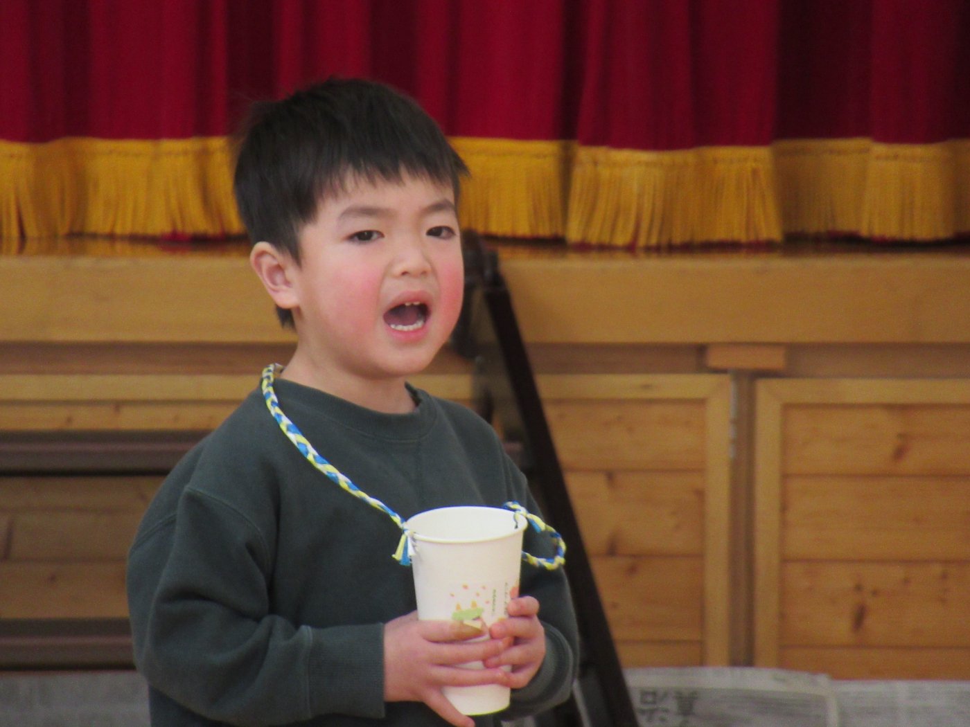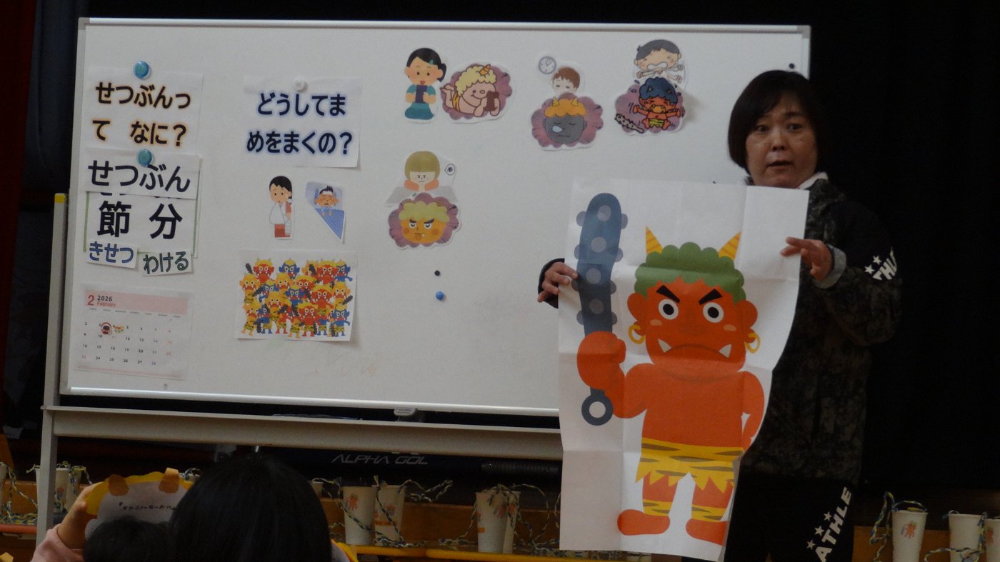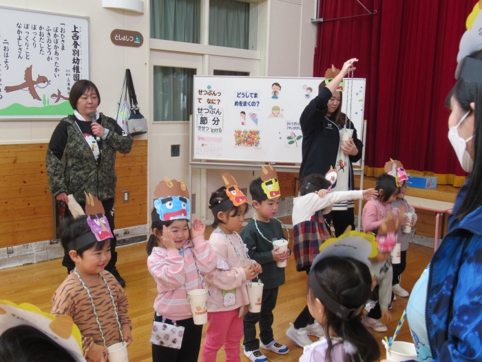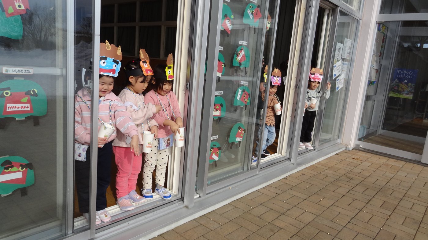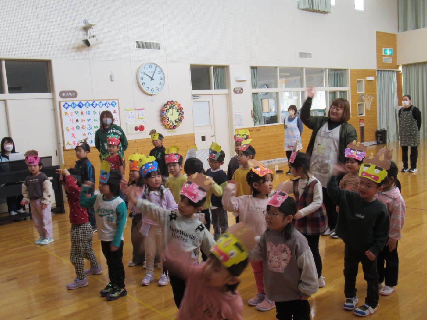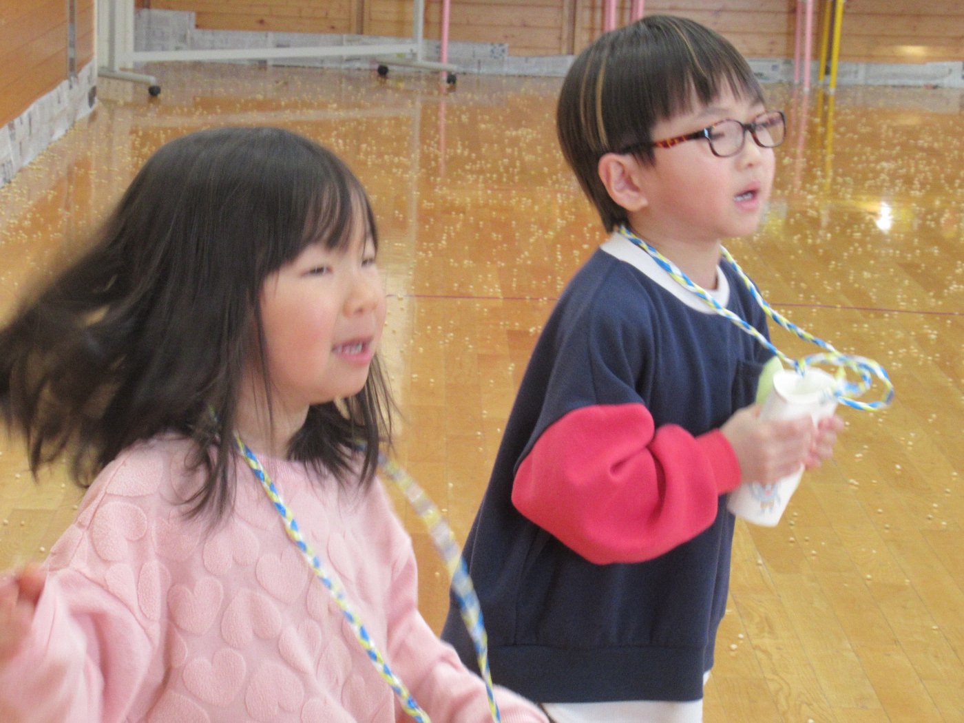 2月3日『節分』の日、幼稚園でも日本の伝統文化への興味・関心を深めようと『豆まき会』を行いました。自分の心の中の鬼を追い出せば鬼は来ないはず!と言っていましたが、経験している子ども達の中には半信半疑でソワソワ、朝から気分がどんよりしている子もおりました。