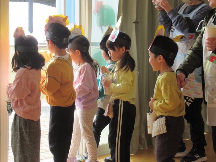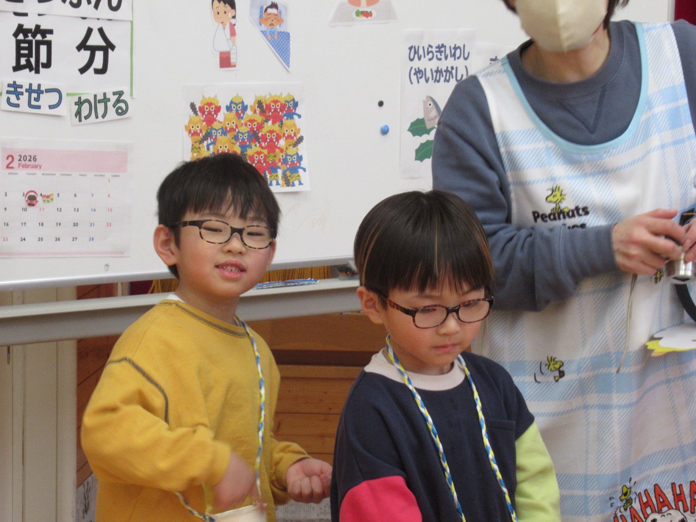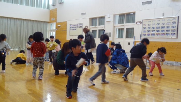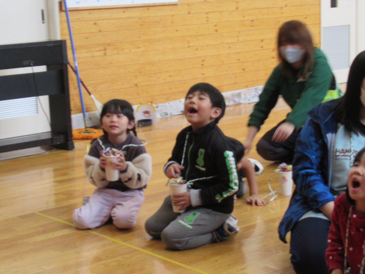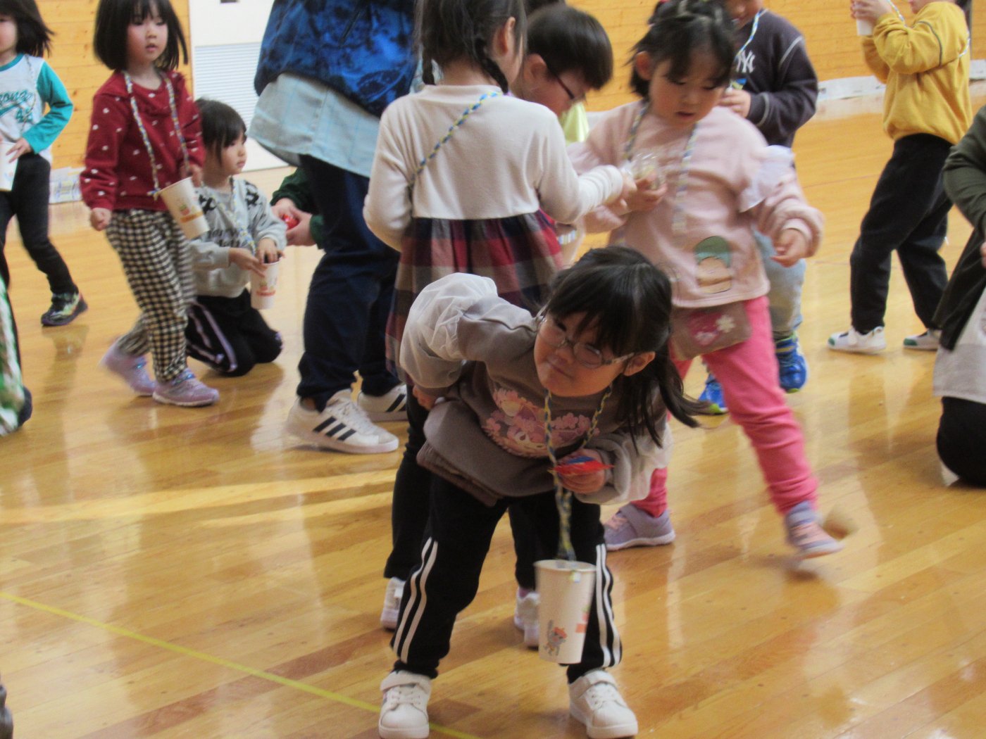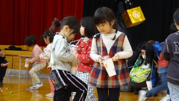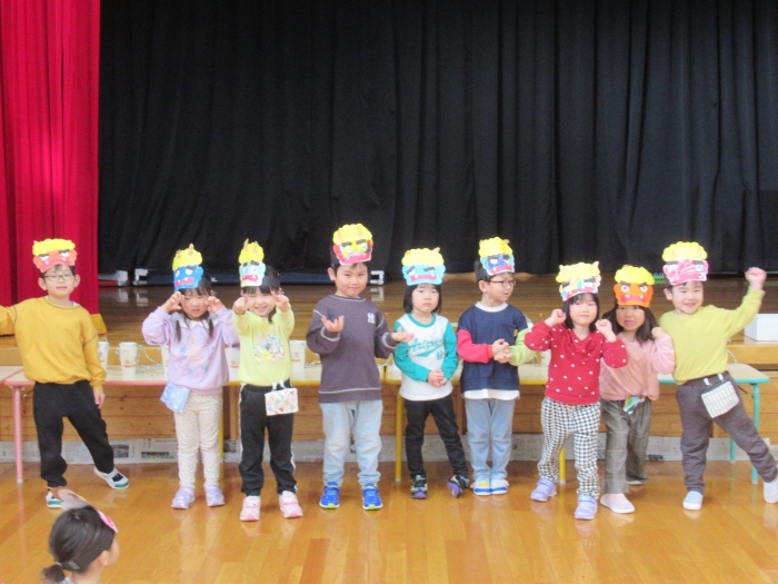 2月3日『節分』の日、幼稚園でも日本の伝統文化への興味・関心を深めようと『豆まき会』を行いました。自分の心の中の鬼を追い出せば鬼は来ないはず!と言っていましたが、経験している子ども達の中には半信半疑でソワソワ、朝から気分がどんよりしている子もおりました。