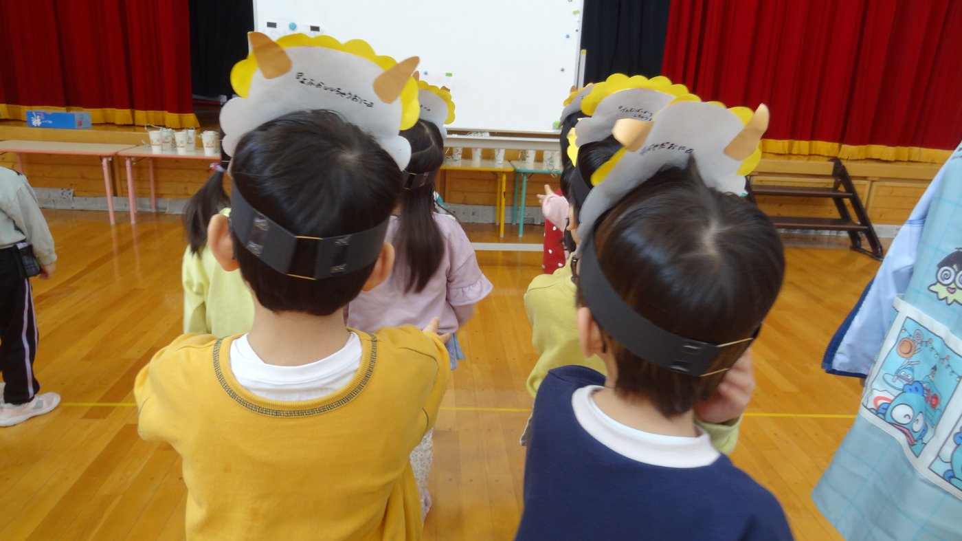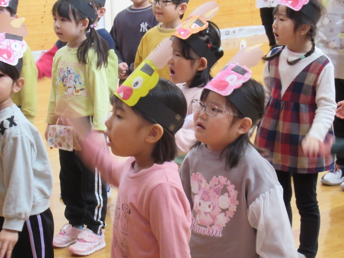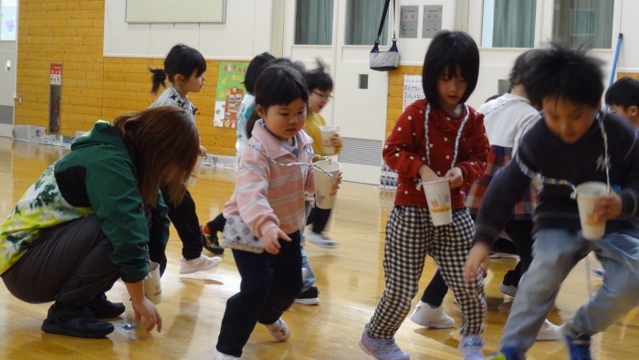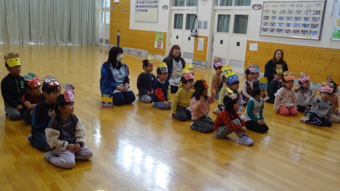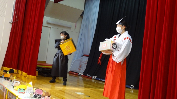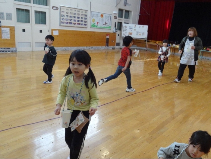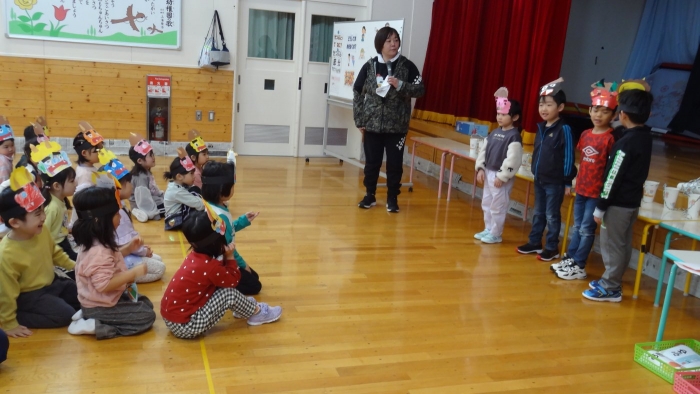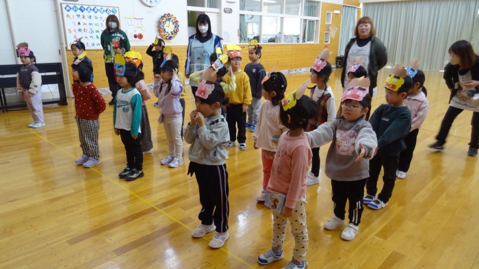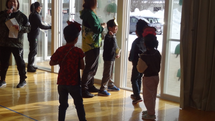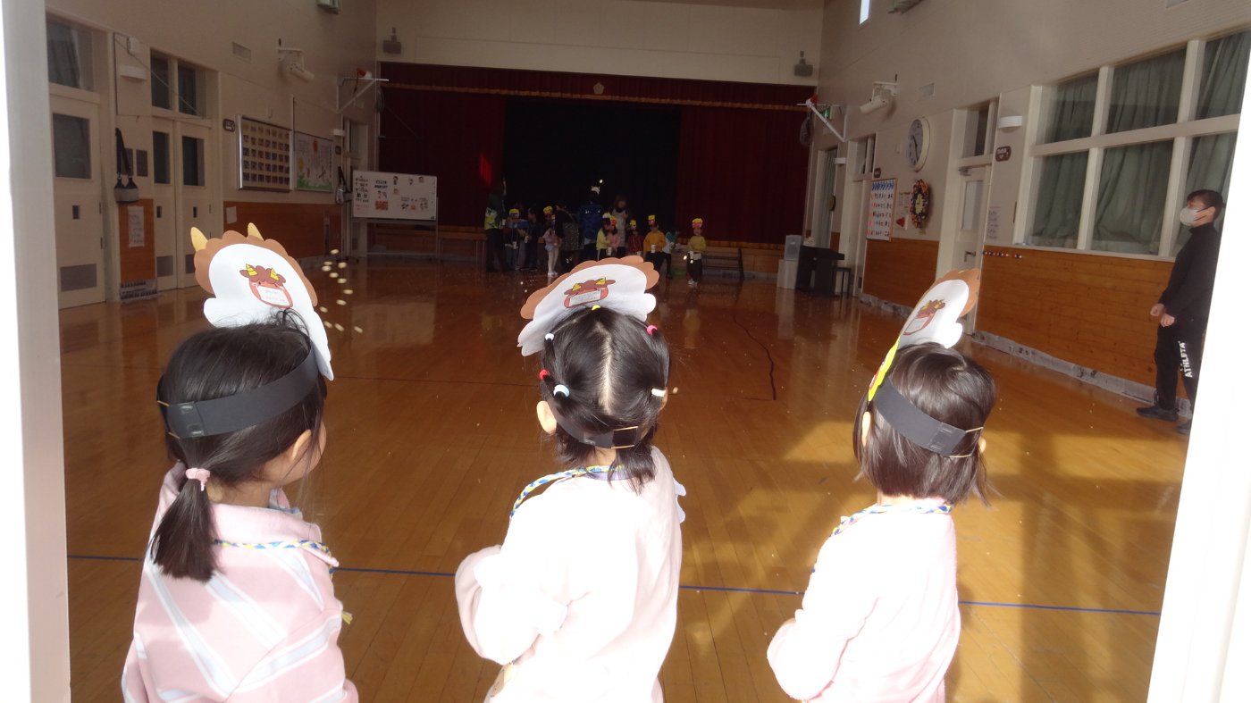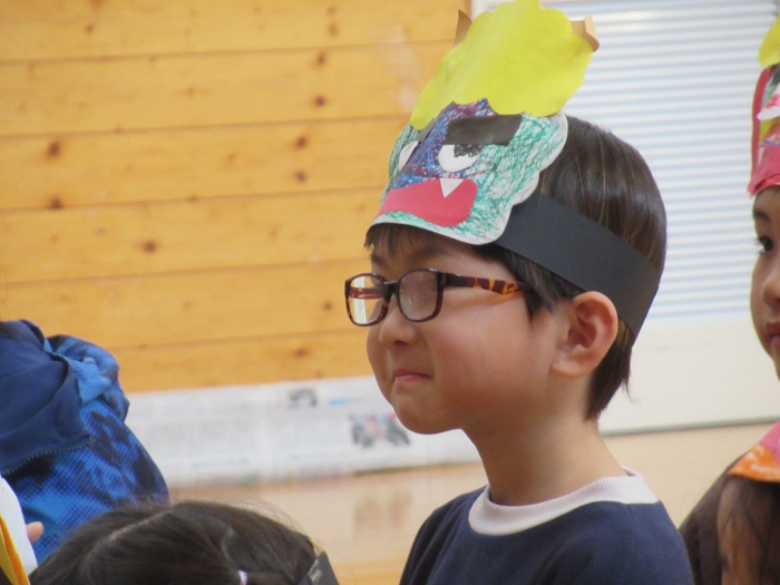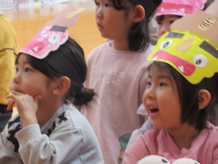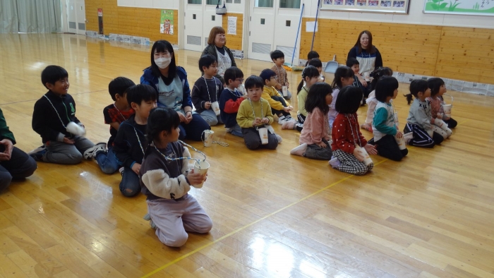 2月3日『節分』の日、幼稚園でも日本の伝統文化への興味・関心を深めようと『豆まき会』を行いました。自分の心の中の鬼を追い出せば鬼は来ないはず!と言っていましたが、経験している子ども達の中には半信半疑でソワソワ、朝から気分がどんよりしている子もおりました。