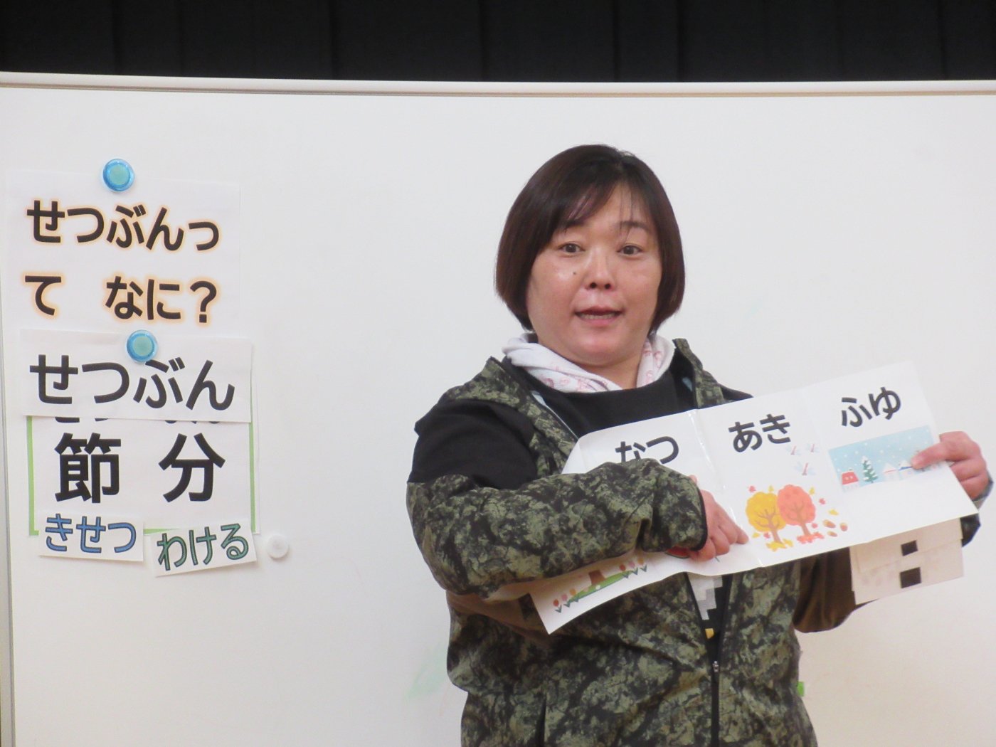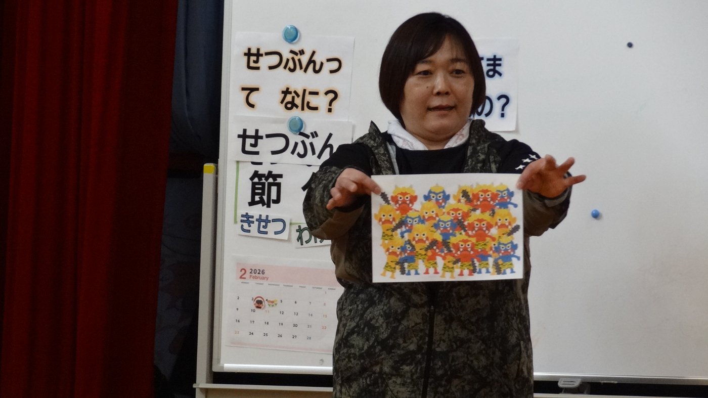 元気な歌で、撒き豆に鬼祓いパワーを注入
