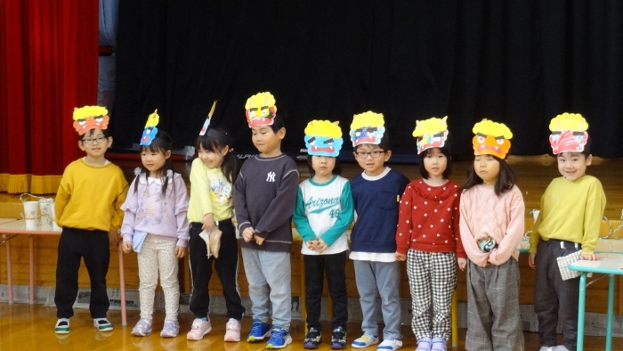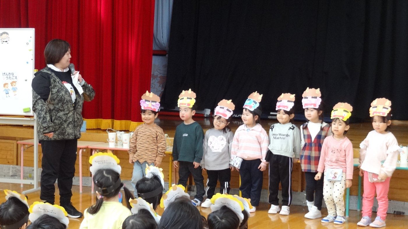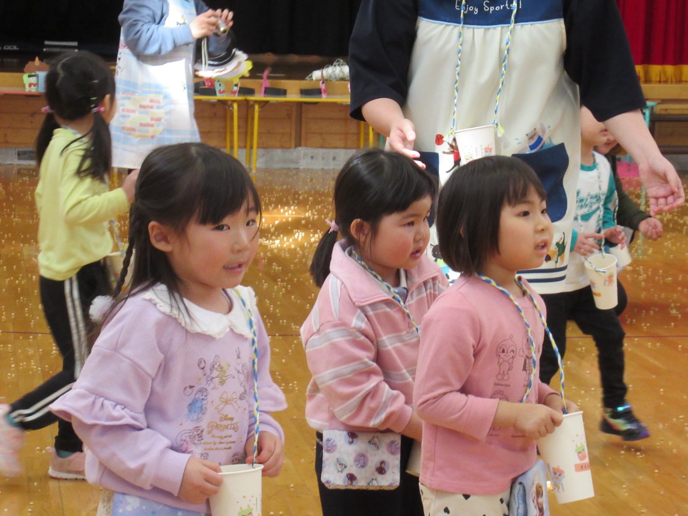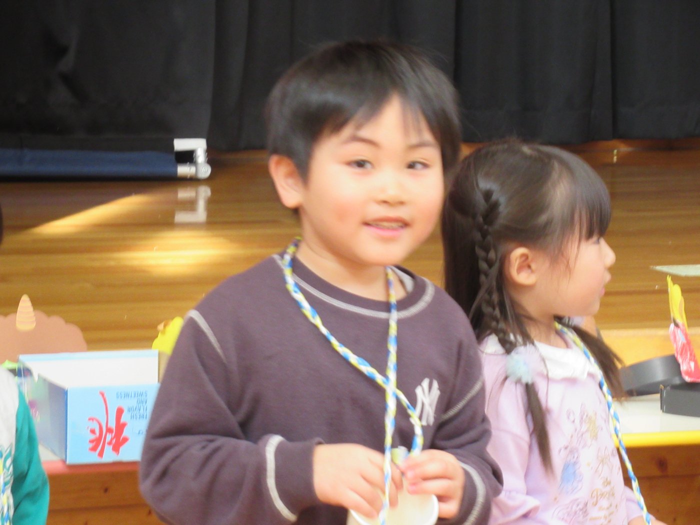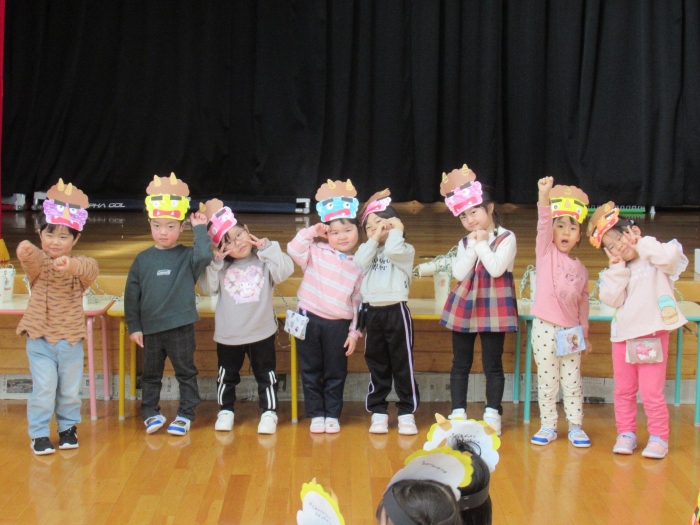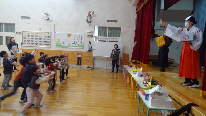 迎えた『豆まき会』では、『節分』とは何か、どうして豆まきするのかといった話に関心をもって聞いていた子ども達。心の鬼を祓わないでいると、どんどん鬼が増えて巨大化するとの話には驚きの声をあげている姿がありました。そうならないために、鬼が苦手な『まめまき』の歌で撒き豆にオニ祓いパワーを注入し、自分が作った鬼の面を紹介&追い出したい鬼を宣言して互いに豆を投げ合いました。厄災・役病防止に、幼稚園の厄祓いもしっかり行いましたよ!