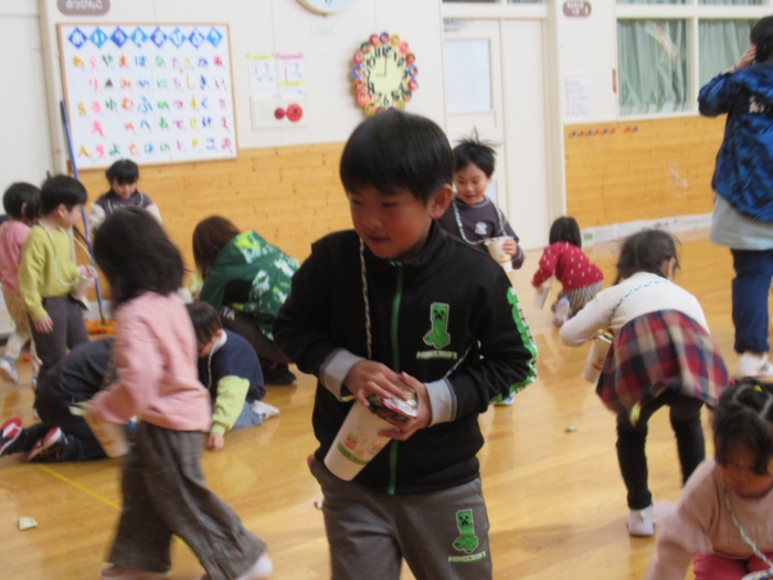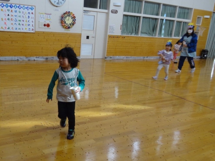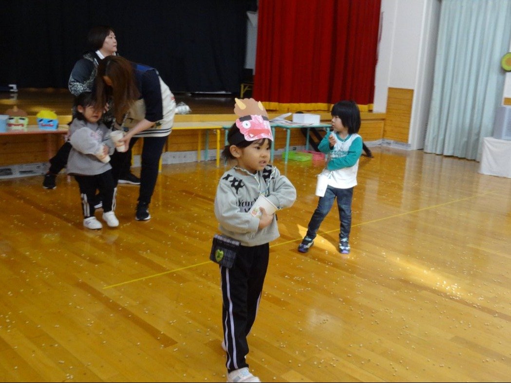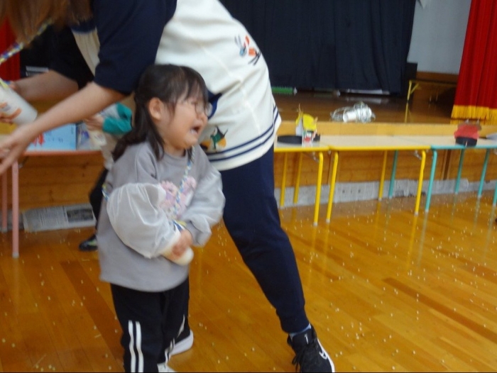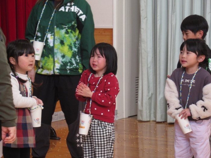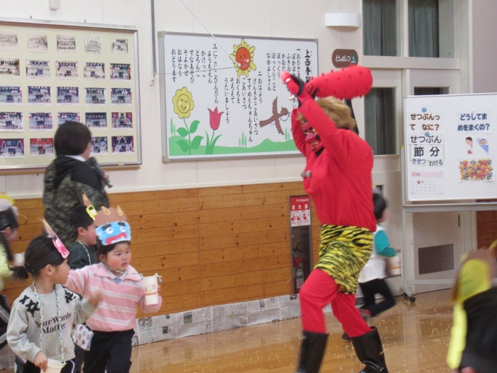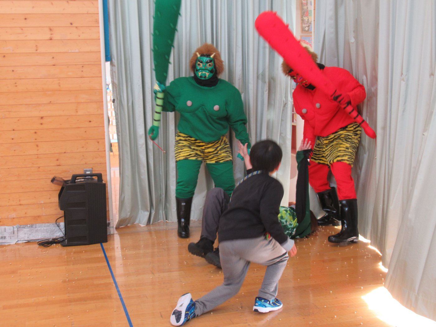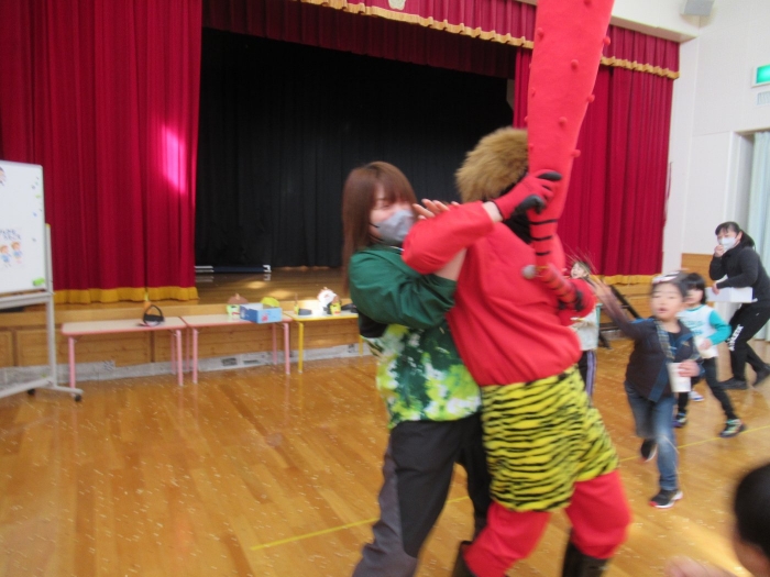 最後は役目を終えた豆を拾おうと、みんなで拾い集めているところに緑鬼が登場! 一瞬、 何が起こったのか分からず硬直状態の子ども達。続いて雄叫びを上げながら赤鬼が乱入し、この世の終わりのような叫びをあげる子が続出でした。子ども達を助けようと5歳児担任が立ち向かい、なんと赤鬼を羽交い絞め!! A先生なら勝てると思ったのも束の間、赤鬼&緑鬼がタッグを組んで形勢逆転。引きずられ連れて行かれそうになった先生を助けようと、泣いていた子も必死に豆を投げ、鬼を祓うことができる歌を懸命に歌い、見事☆彡鬼を退治することができました。鬼が舞い戻ってこないか恐々と豆の片付けをしていた子もいましたが、頑張った自分を感じているようでした。たぶん、心の中の鬼を祓うことができ清々しい気持ちになったことでしょう!