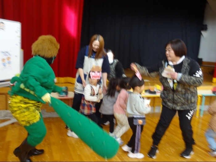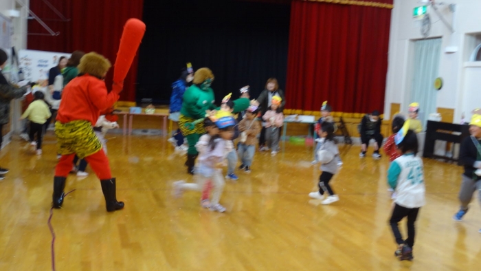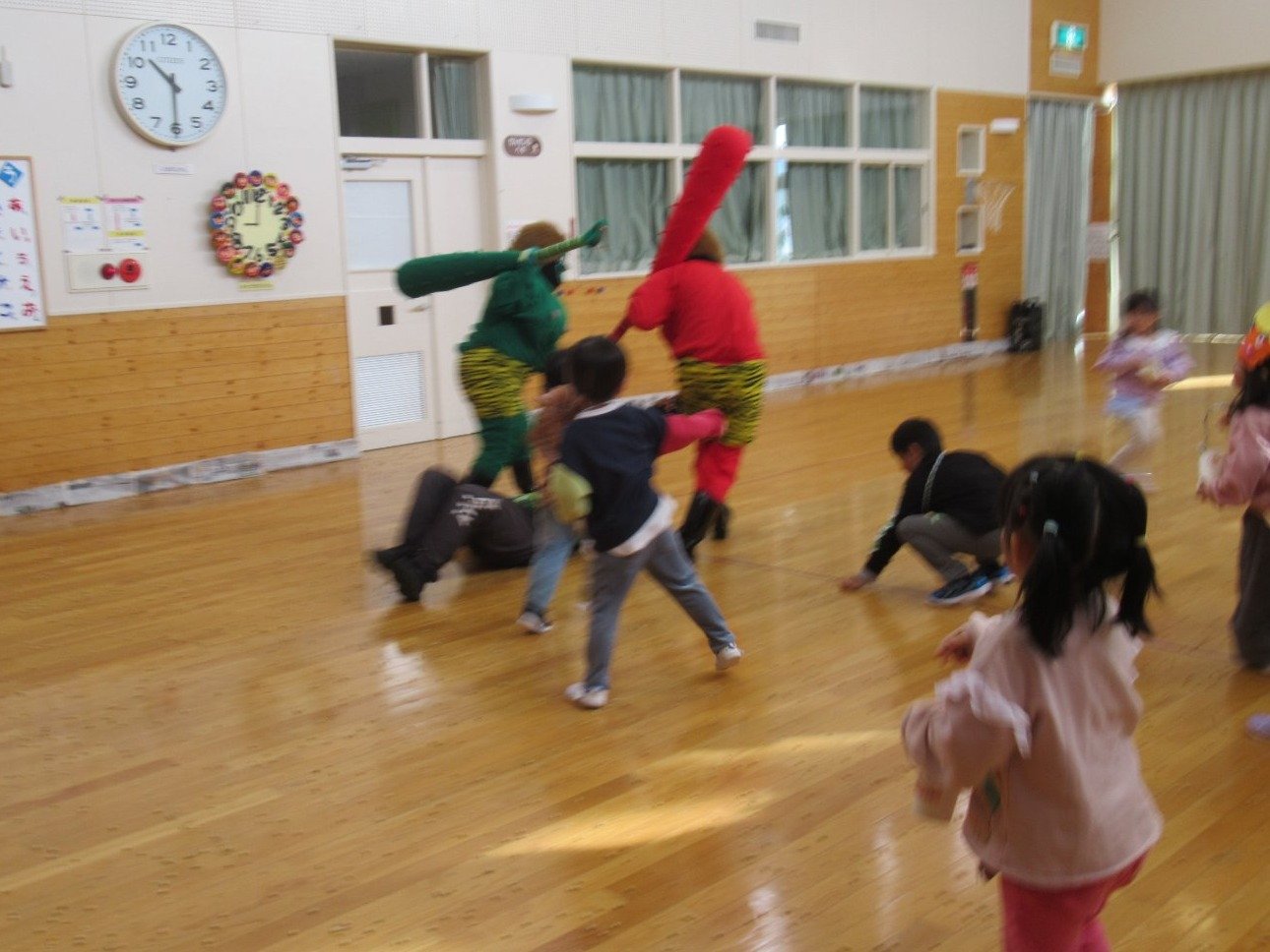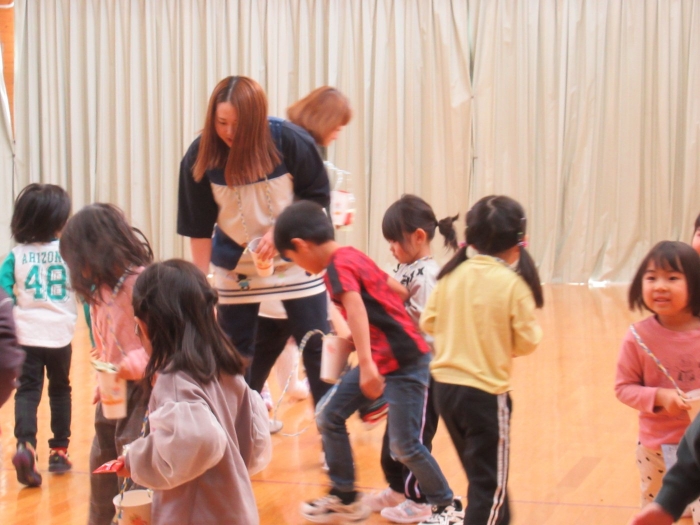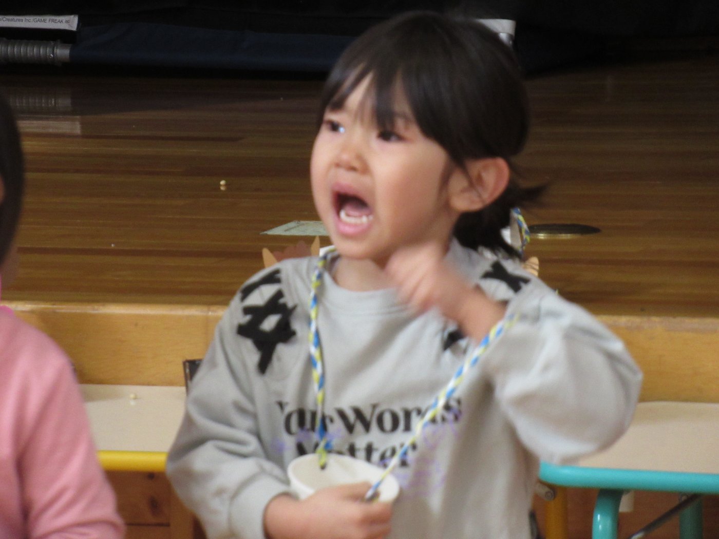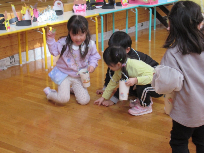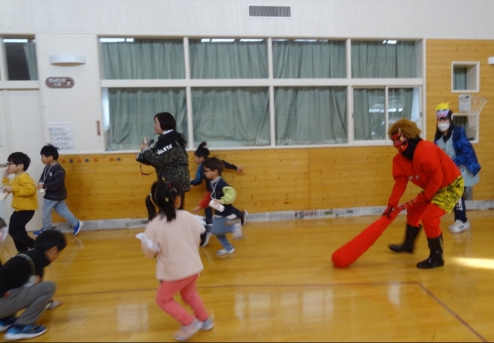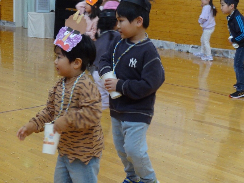 最後は役目を終えた豆を拾おうと、みんなで拾い集めているところに緑鬼が登場! 一瞬、 何が起こったのか分からず硬直状態の子ども達。続いて雄叫びを上げながら赤鬼が乱入し、この世の終わりのような叫びをあげる子が続出でした。子ども達を助けようと5歳児担任が立ち向かい、なんと赤鬼を羽交い絞め!! A先生なら勝てると思ったのも束の間、赤鬼&緑鬼がタッグを組んで形勢逆転。引きずられ連れて行かれそうになった先生を助けようと、泣いていた子も必死に豆を投げ、鬼を祓うことができる歌を懸命に歌い、見事☆彡鬼を退治することができました。鬼が舞い戻ってこないか恐々と豆の片付けをしていた子もいましたが、頑張った自分を感じているようでした。たぶん、心の中の鬼を祓うことができ清々しい気持ちになったことでしょう!