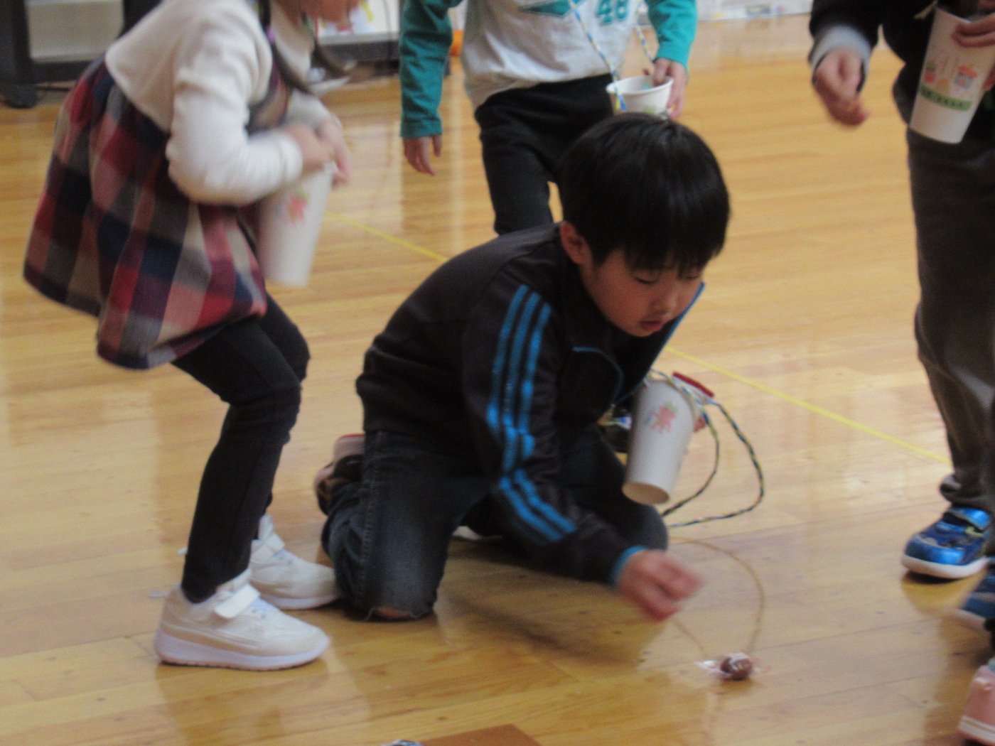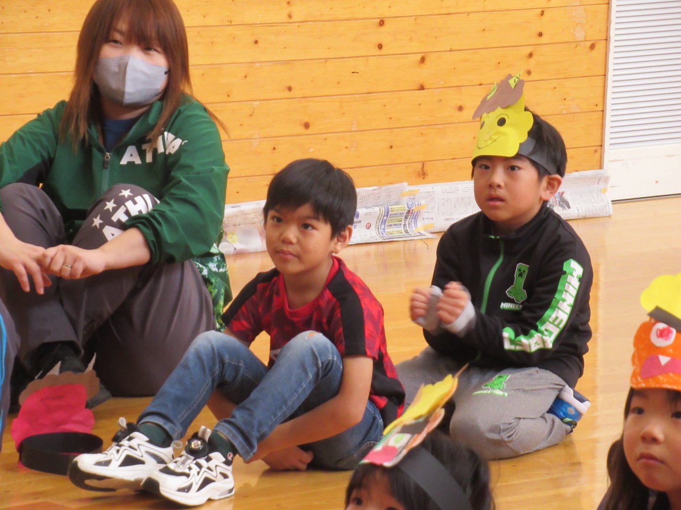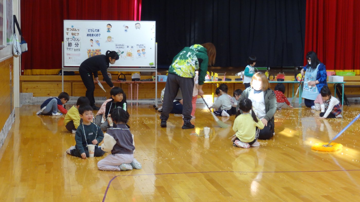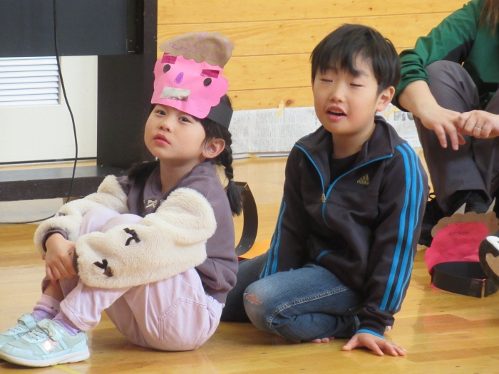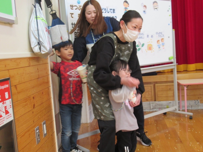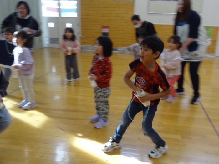 最後は役目を終えた豆を拾おうと、みんなで拾い集めているところに緑鬼が登場! 一瞬、 何が起こったのか分からず硬直状態の子ども達。続いて雄叫びを上げながら赤鬼が乱入し、この世の終わりのような叫びをあげる子が続出でした。子ども達を助けようと5歳児担任が立ち向かい、なんと赤鬼を羽交い絞め!! A先生なら勝てると思ったのも束の間、赤鬼&緑鬼がタッグを組んで形勢逆転。引きずられ連れて行かれそうになった先生を助けようと、泣いていた子も必死に豆を投げ、鬼を祓うことができる歌を懸命に歌い、見事☆彡鬼を退治することができました。鬼が舞い戻ってこないか恐々と豆の片付けをしていた子もいましたが、頑張った自分を感じているようでした。たぶん、心の中の鬼を祓うことができ清々しい気持ちになったことでしょう!