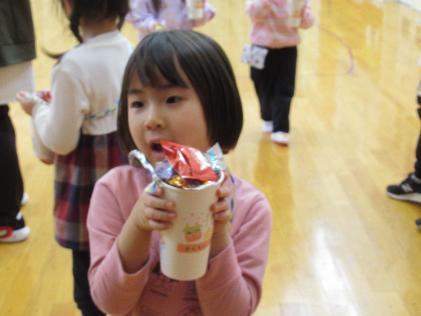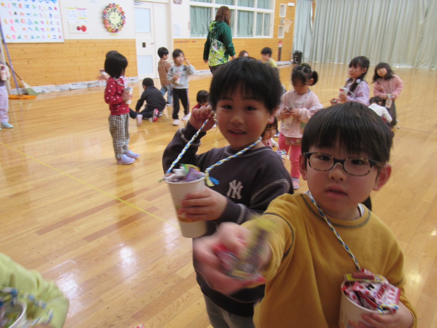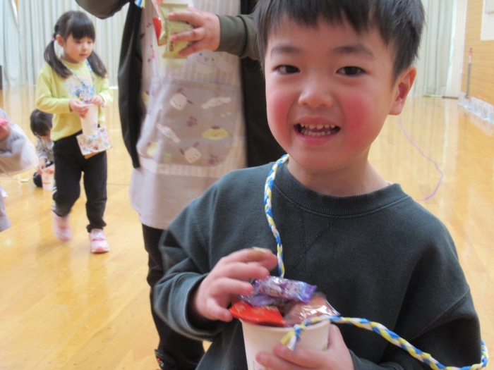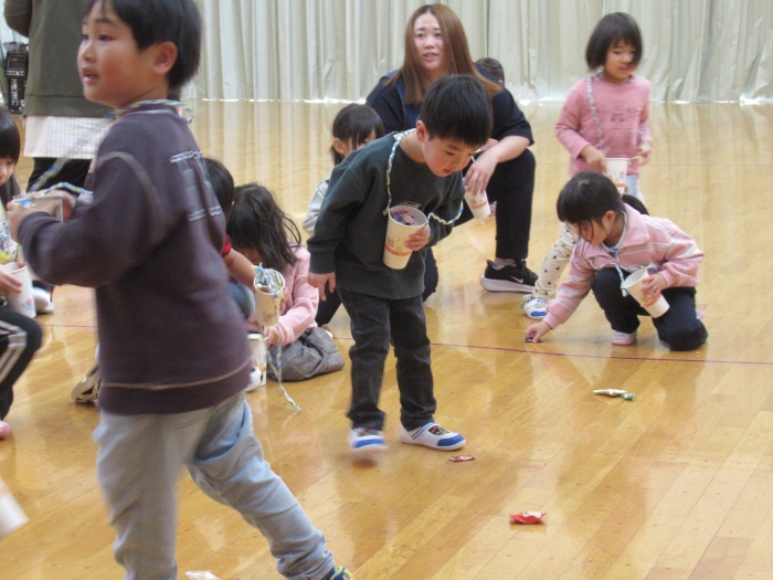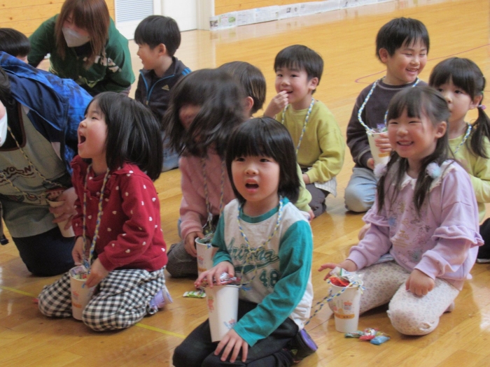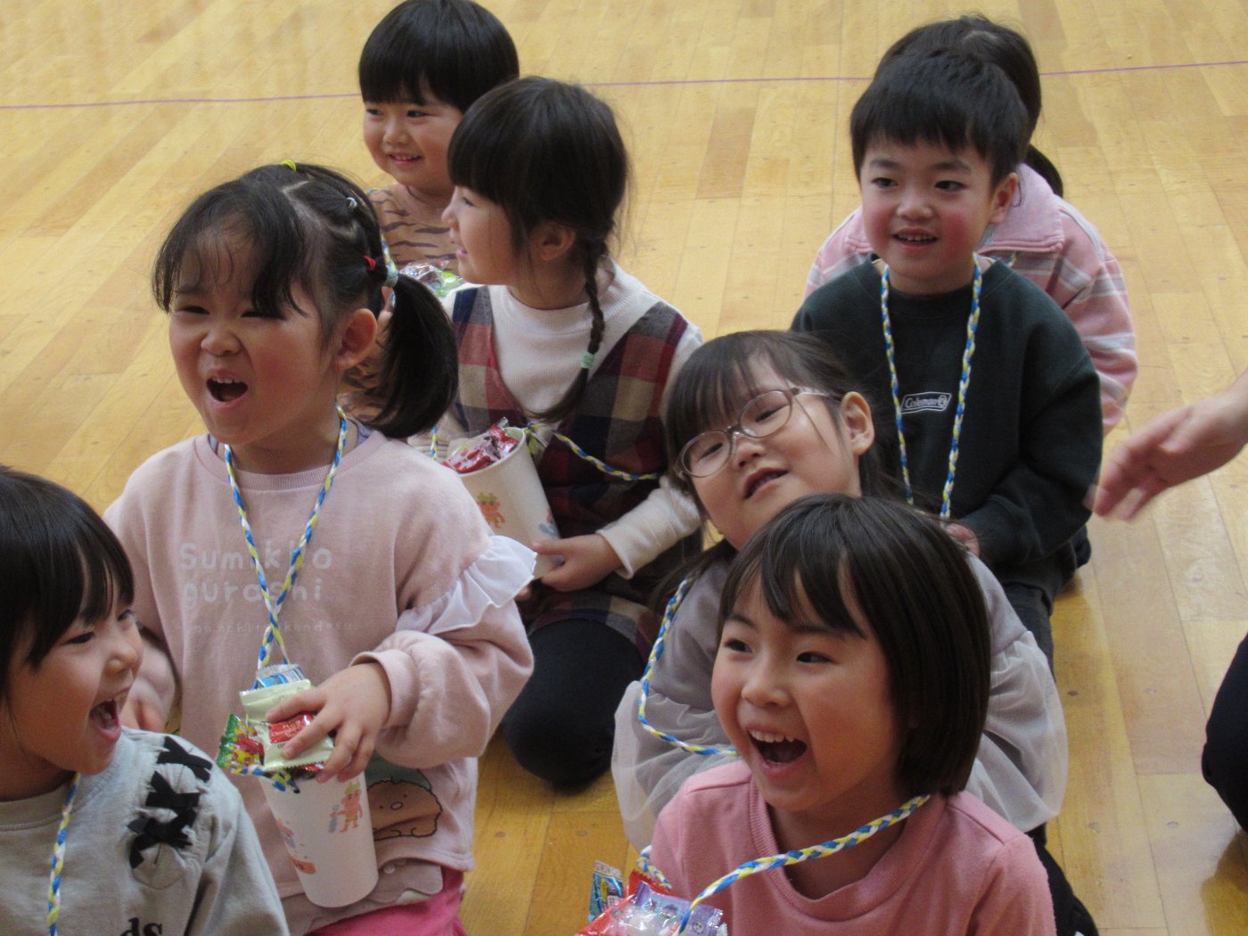 豆まきの後は、頑張って鬼に立ち向かった子ども達のもとへ、福の神 園長&年女のMさんが登場! みんなで『福菓子拾い』を行いました。幸せ(福菓子)をたくさん掴んだ子ども達、『笑う門には福来る』で、いい笑顔で締め括りました。