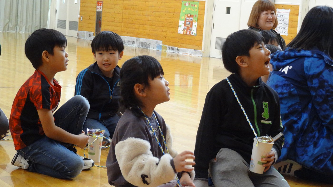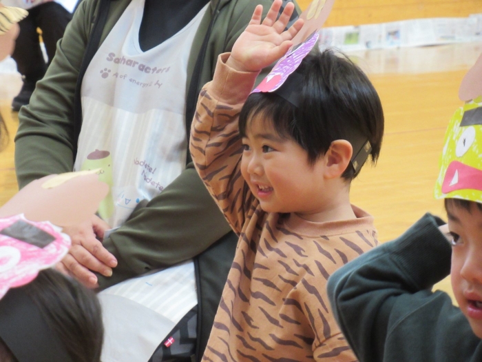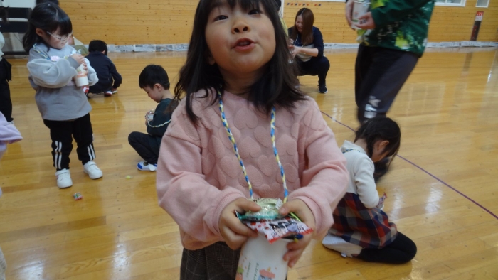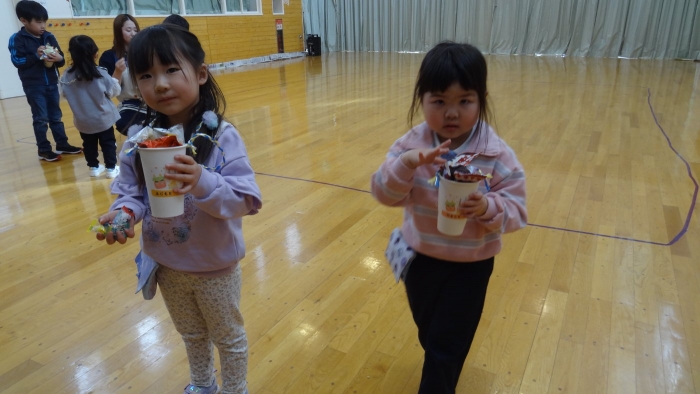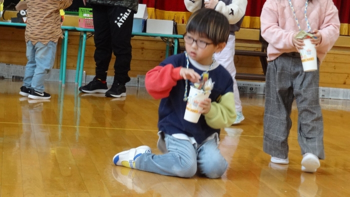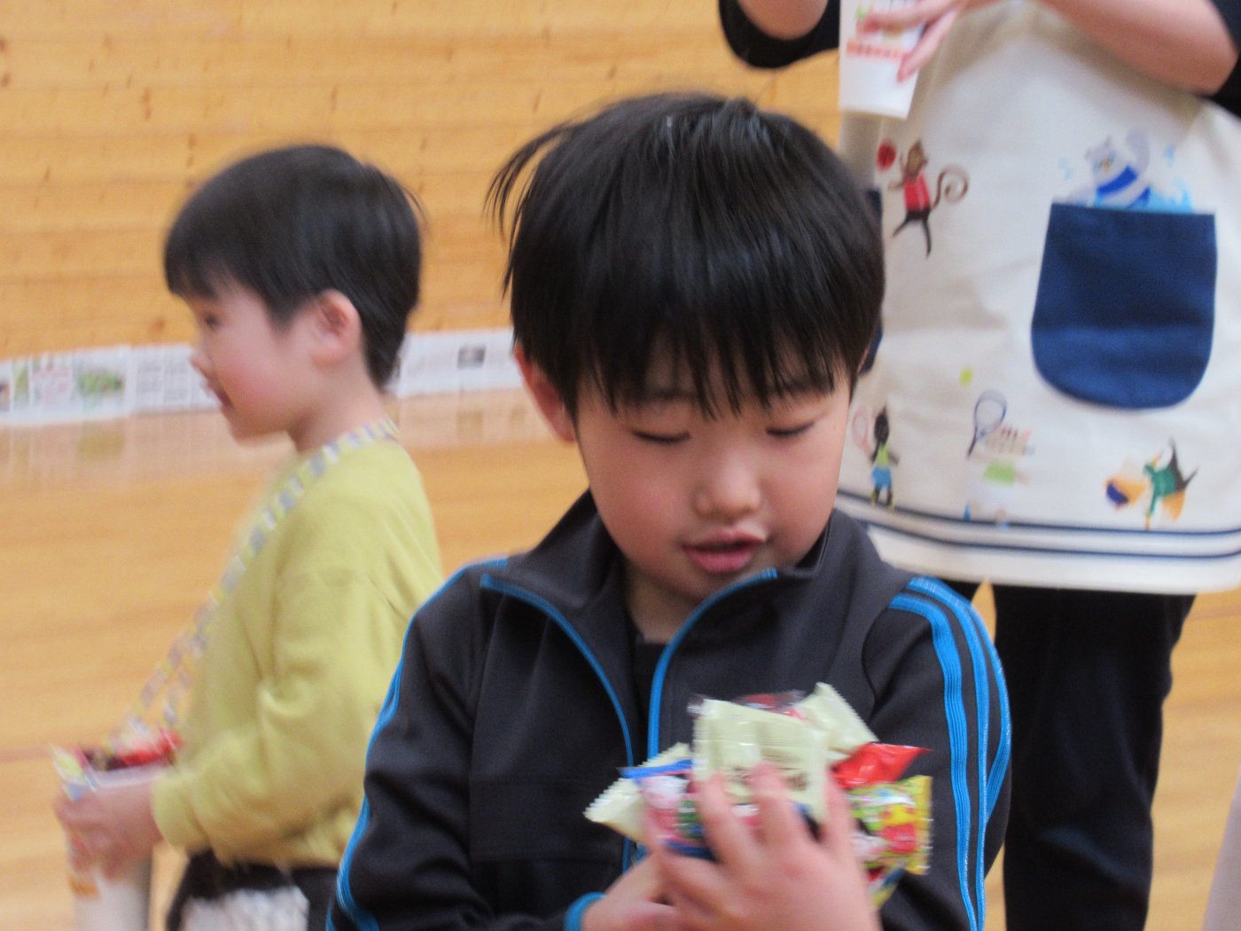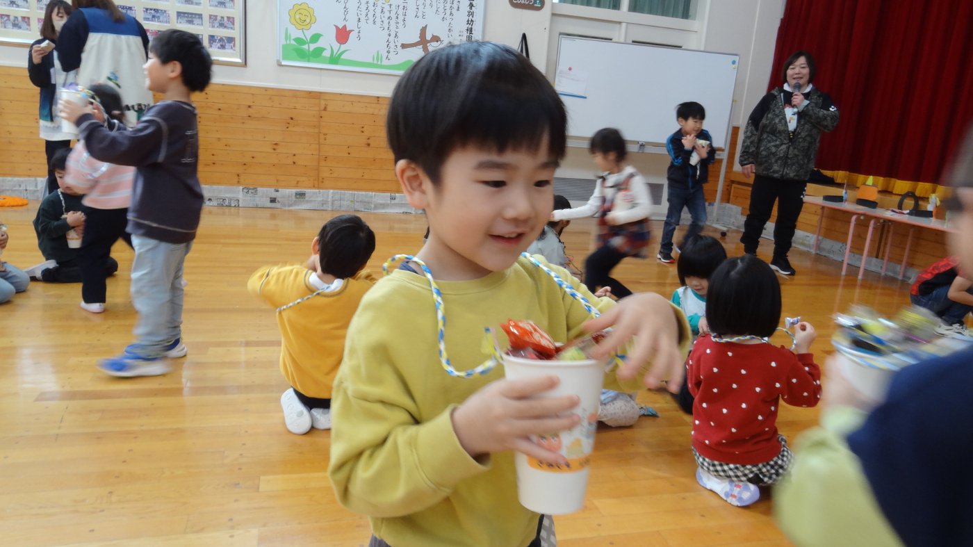 豆まきの後は、頑張って鬼に立ち向かった子ども達のもとへ、福の神 園長&年女のMさんが登場! みんなで『福菓子拾い』を行いました。幸せ(福菓子)をたくさん掴んだ子ども達、『笑う門には福来る』で、いい笑顔で締め括りました。