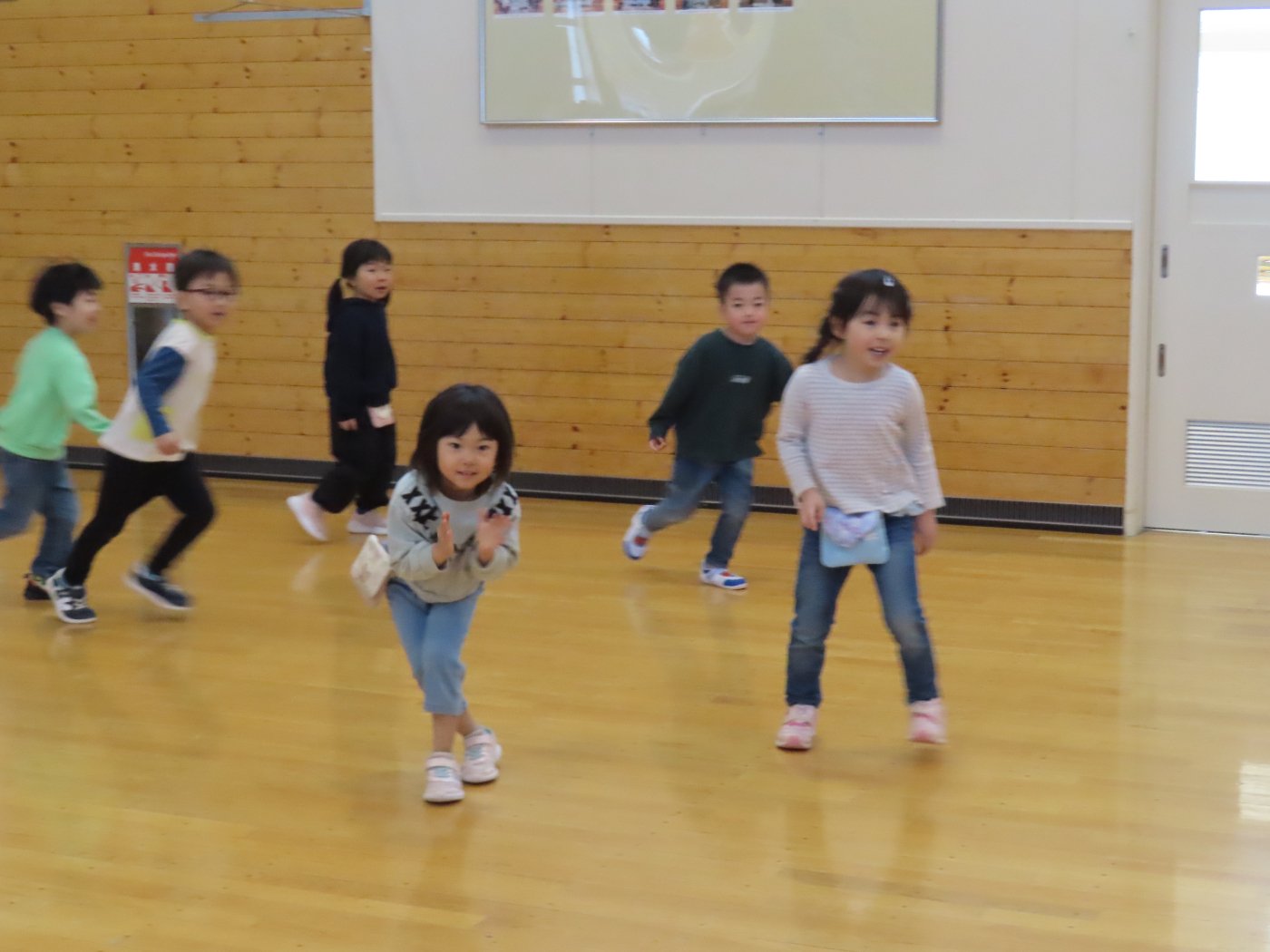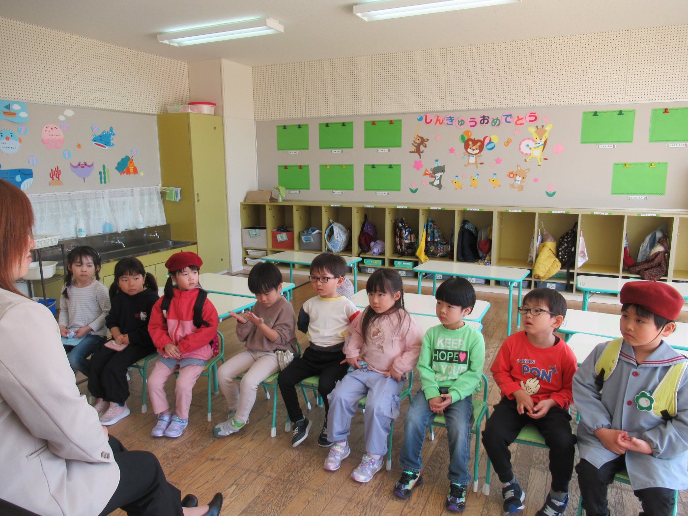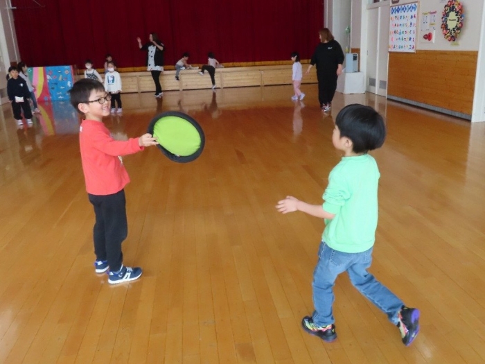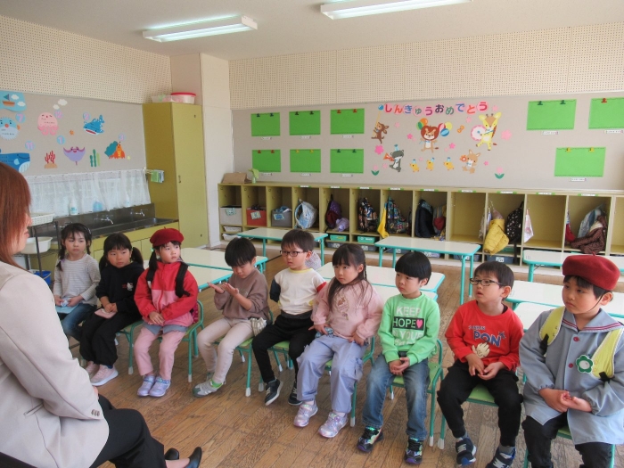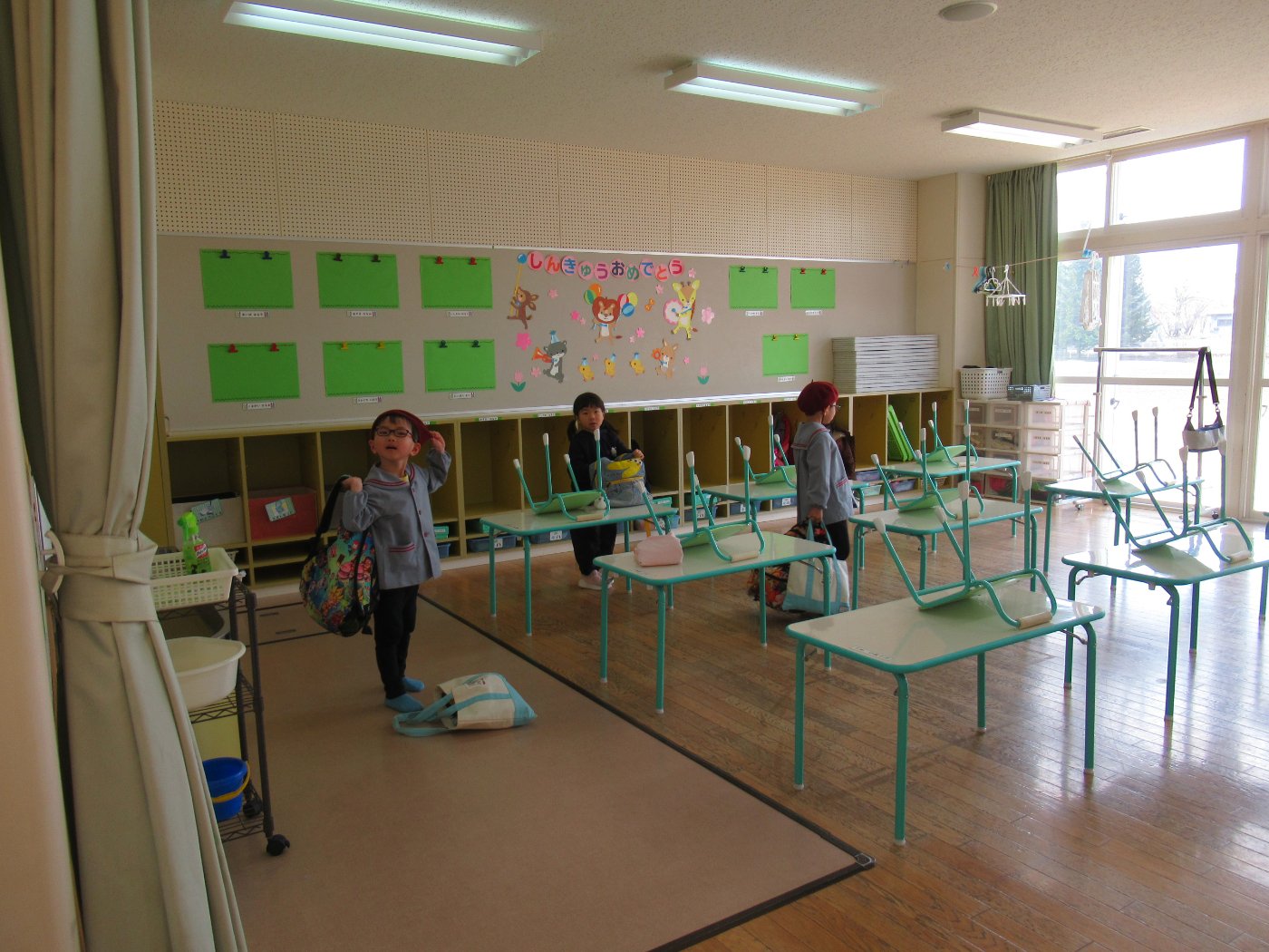 久しぶりの幼稚園,友達や先生との再会を喜んだり,新しい保育室環境にドキドキ・わくわくしながら新学期の大荷物を片付けたりしていました。荷物整理を終えると、さっそく慣れ親しんだ遊び『ドッチビーかたき』を満喫していました。 担任や保育室環境が代わり,ちょっぴり緊張の面持ちの子もいましたが,友達と好きな遊びを楽しんだり、新しい名札を付けてもったり、新規の当番決めをする中で、進級への喜び・期待を膨らませている様子でした。