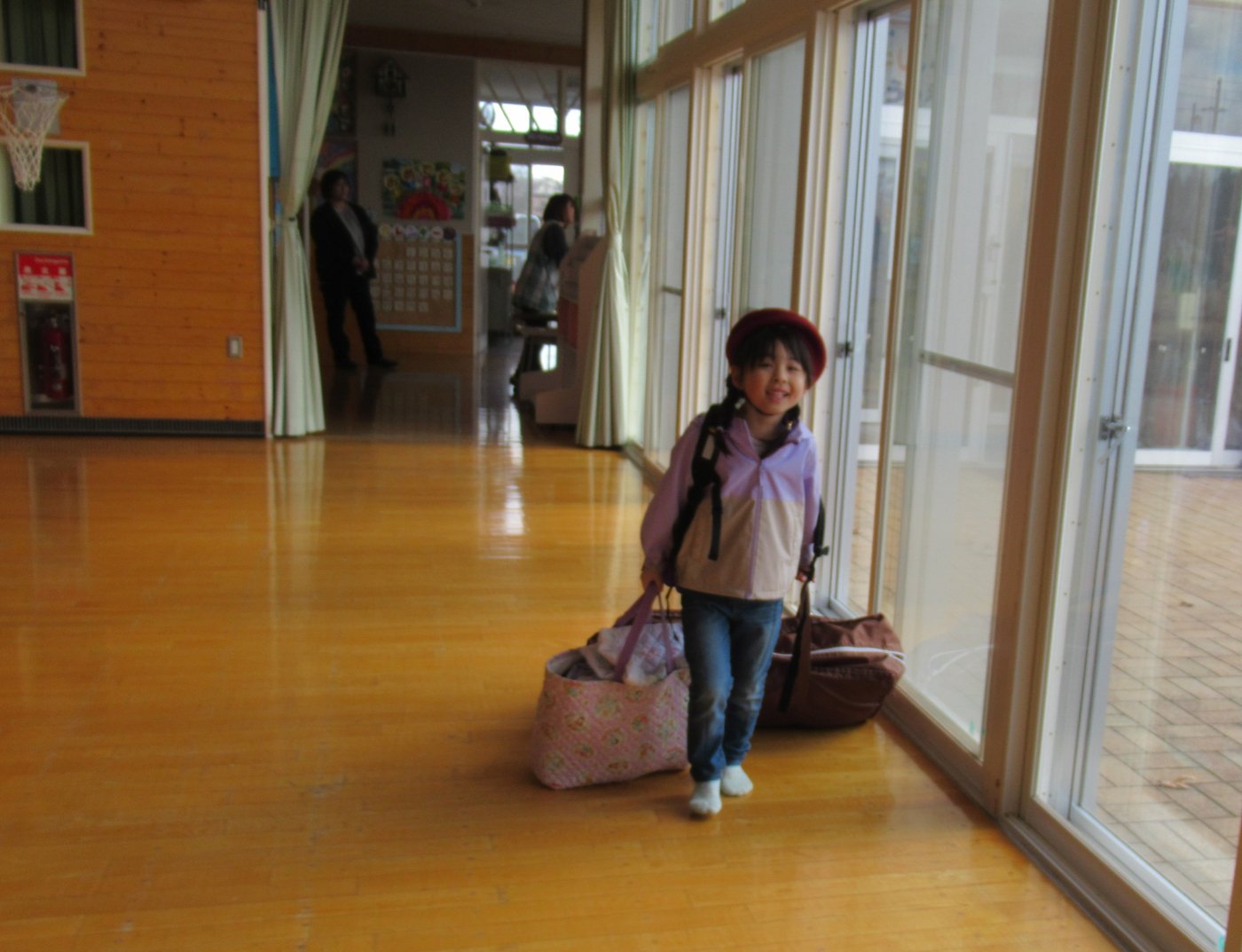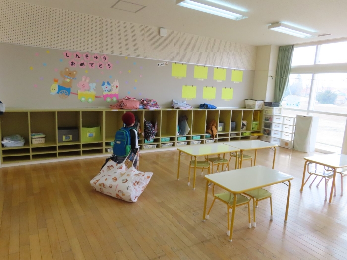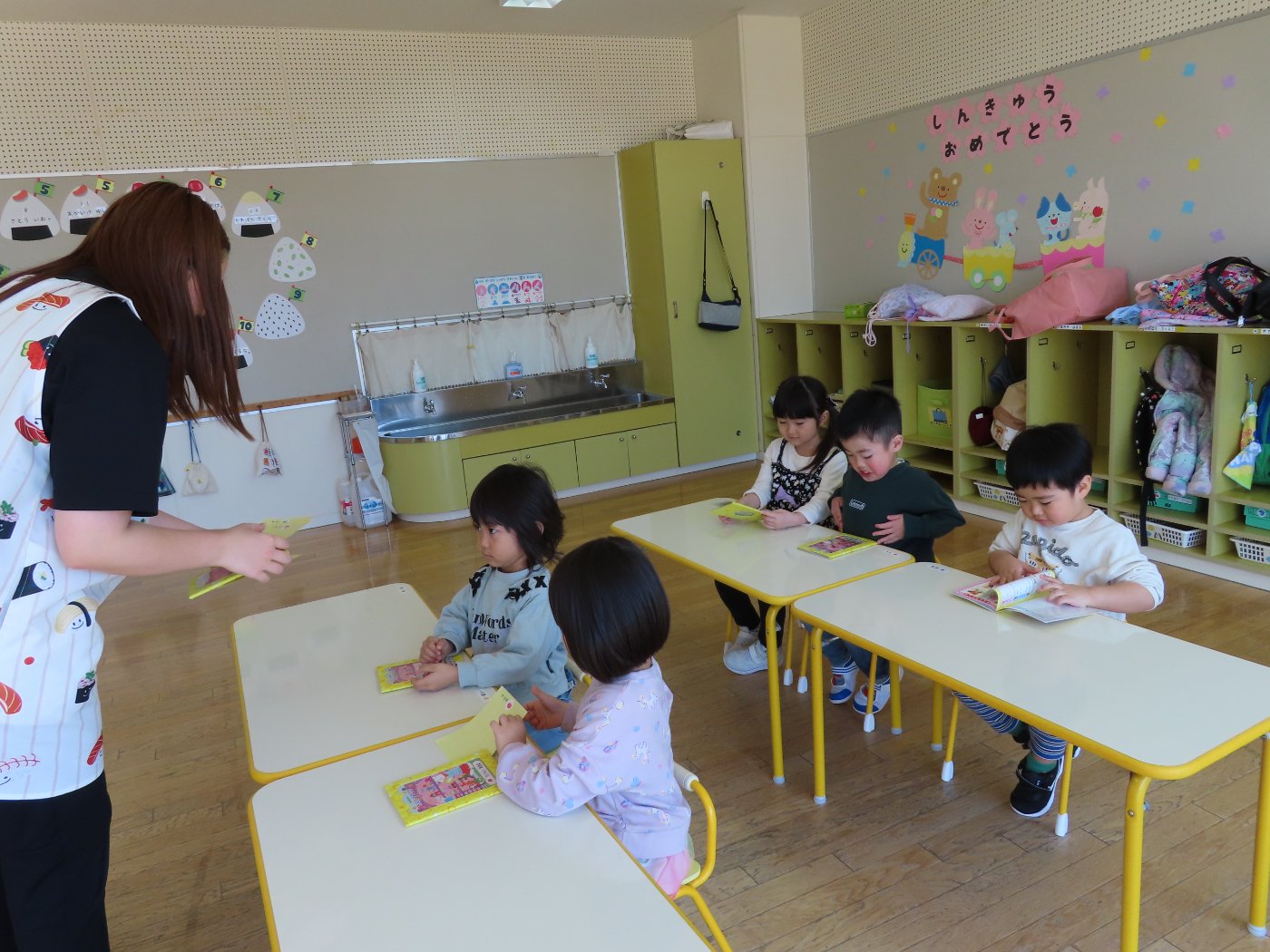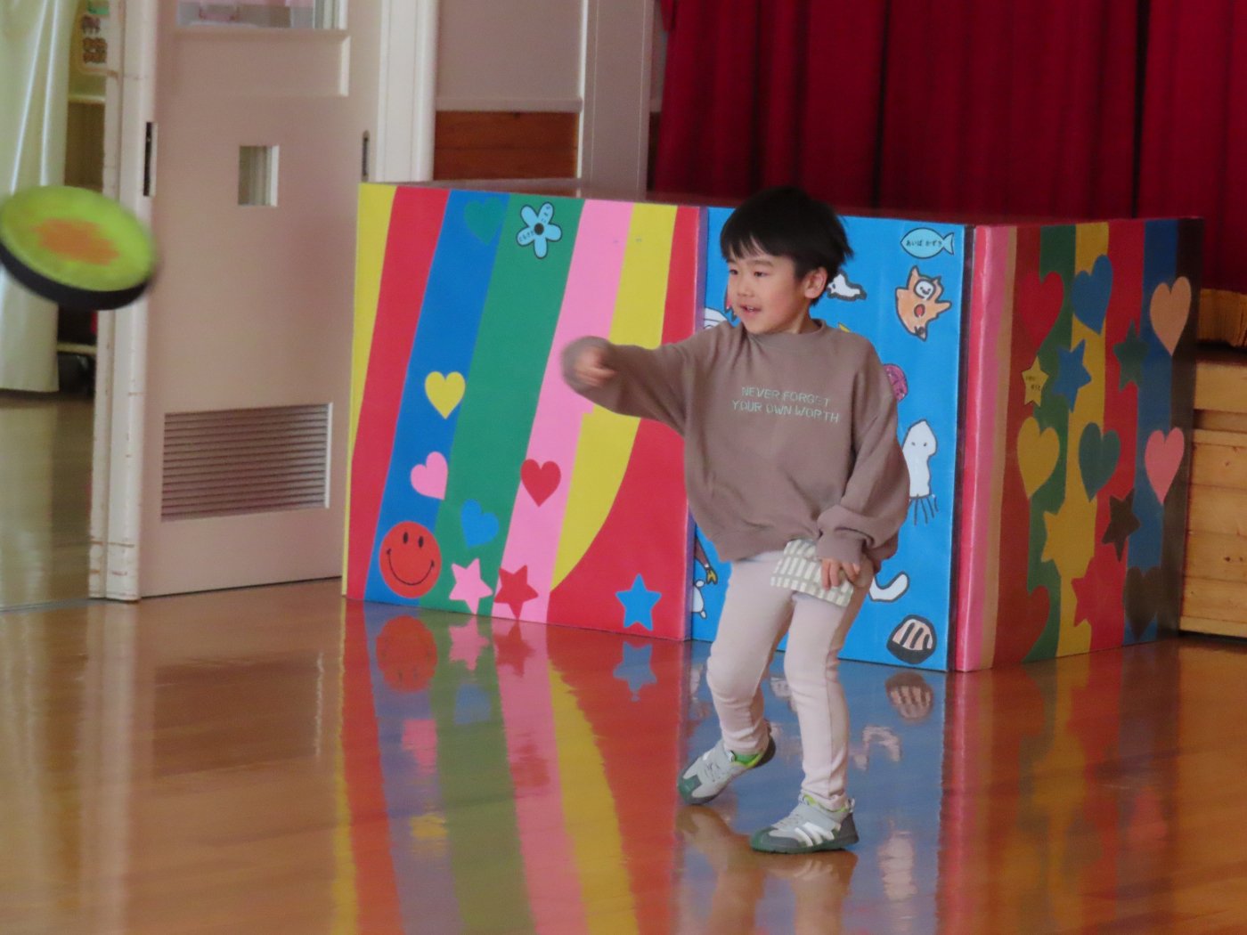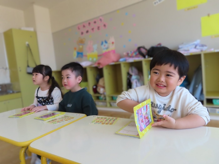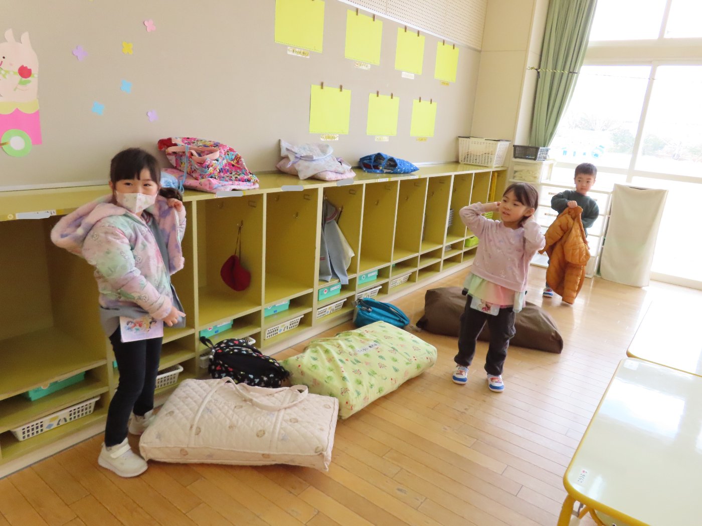 久しぶりの幼稚園,友達や先生との再会を喜んだり,新しい保育室環境にドキドキ・わくわくしながら新学期の大荷物を片付けたりしていました。荷物整理を終えると、さっそく慣れ親しんだ遊び『ドッチビーかたき』を満喫していました。 担任や保育室環境が代わり,ちょっぴり緊張の面持ちの子もいましたが,友達と好きな遊びを楽しんだり、新しい名札を付けてもったり、新規の当番決めをする中で、進級への喜び・期待を膨らませている様子でした。