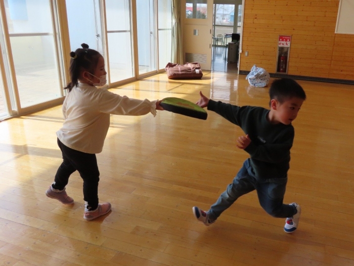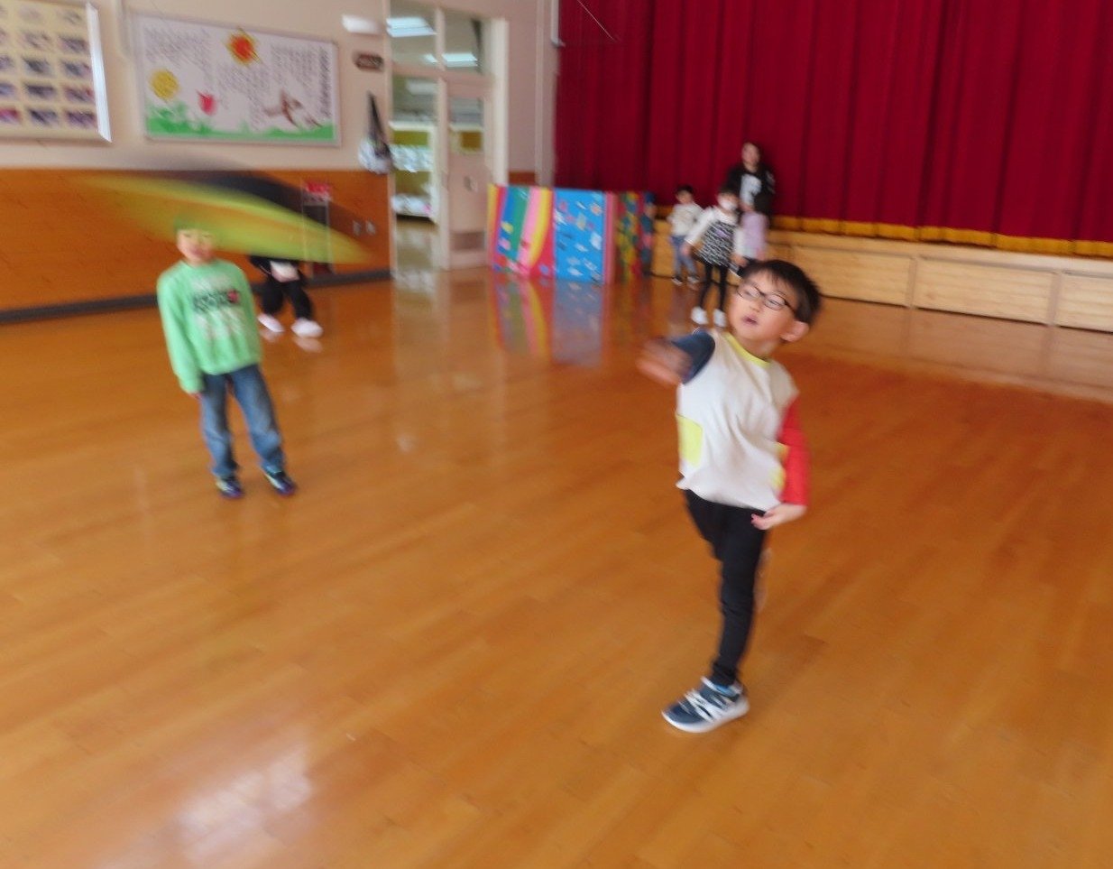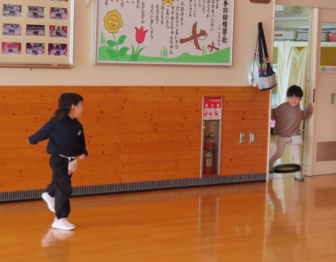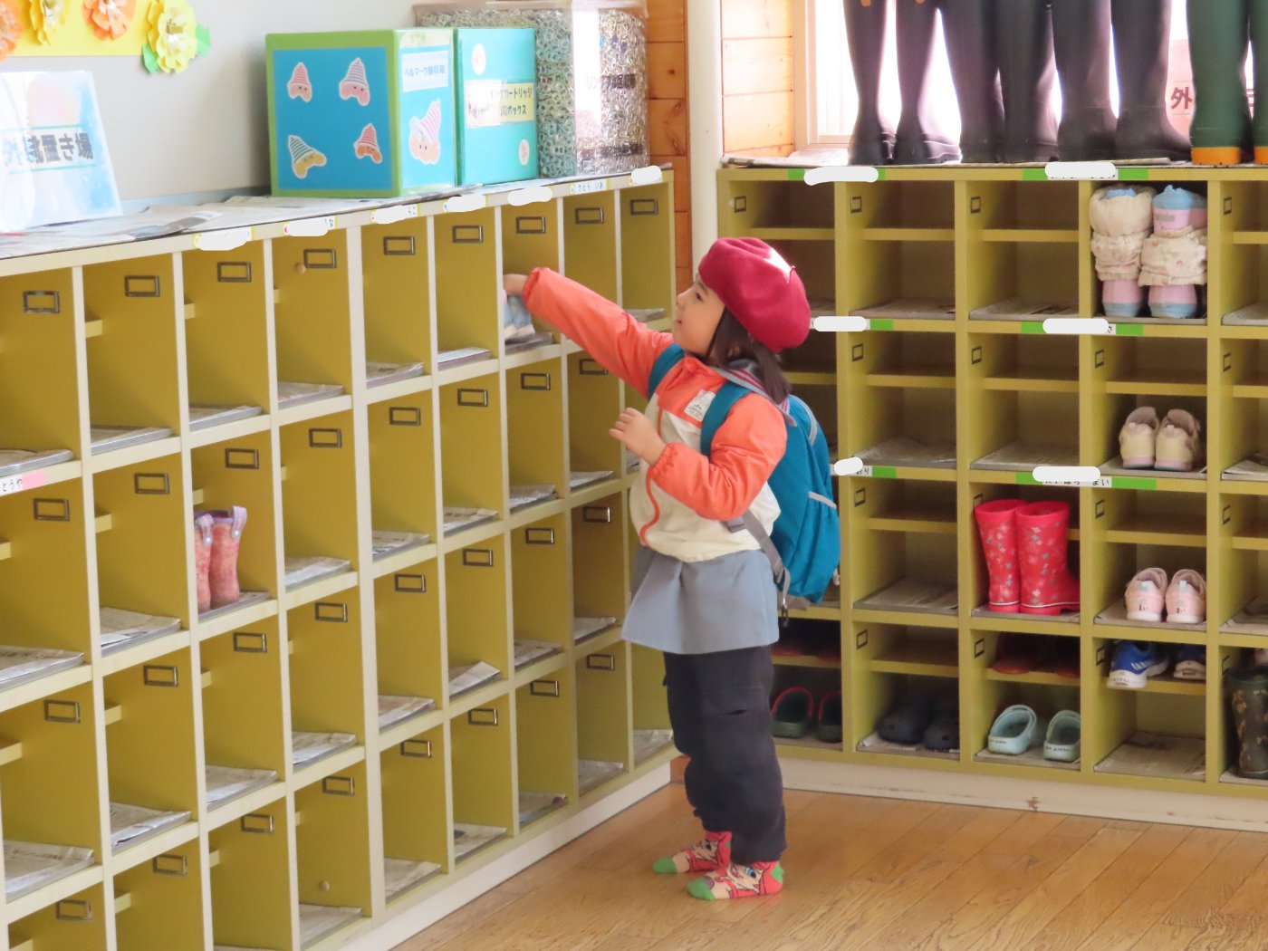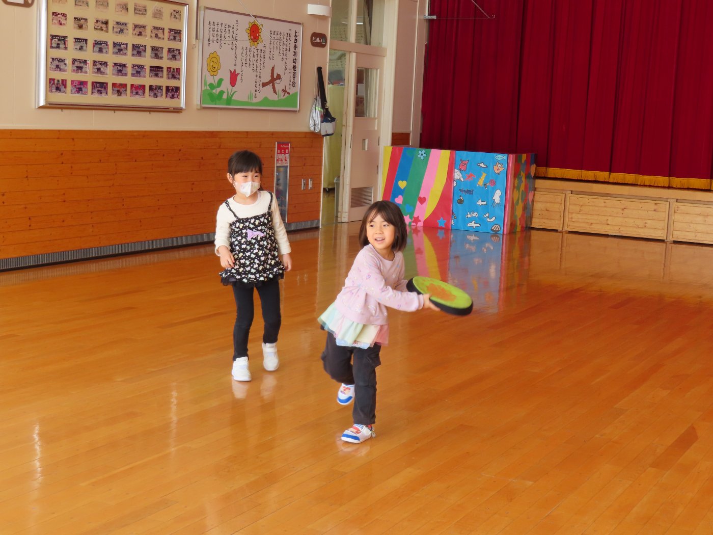 久しぶりの幼稚園,友達や先生との再会を喜んだり,新しい保育室環境にドキドキ・わくわくしながら新学期の大荷物を片付けたりしていました。荷物整理を終えると、さっそく慣れ親しんだ遊び『ドッチビーかたき』を満喫していました。 担任や保育室環境が代わり,ちょっぴり緊張の面持ちの子もいましたが,友達と好きな遊びを楽しんだり、新しい名札を付けてもったり、新規の当番決めをする中で、進級への喜び・期待を膨らませている様子でした。
