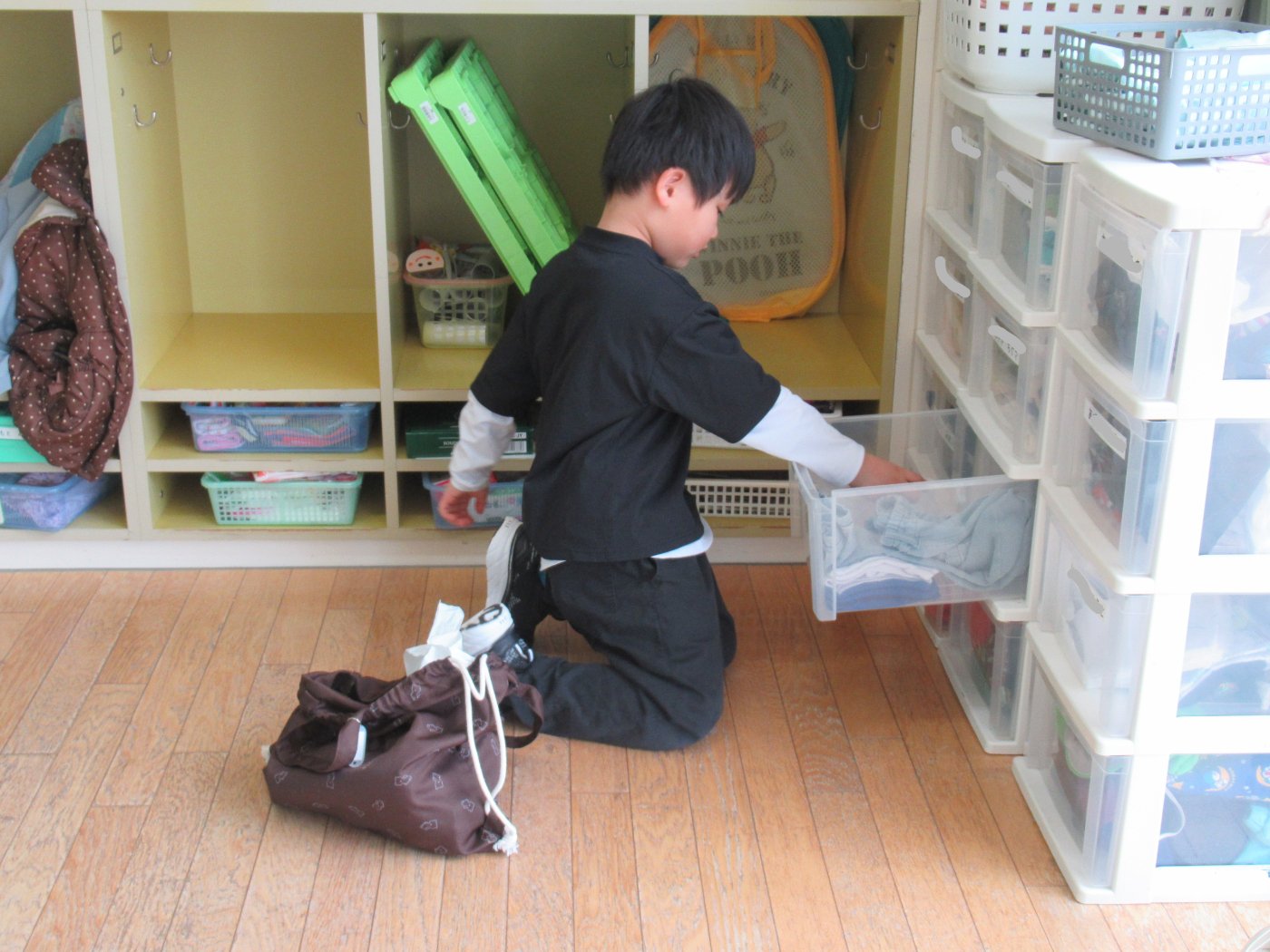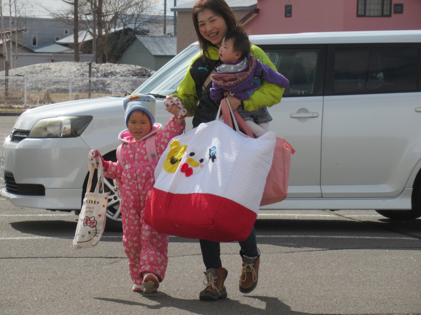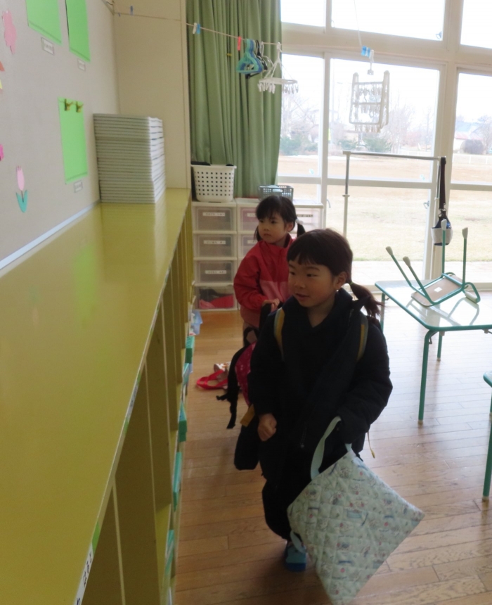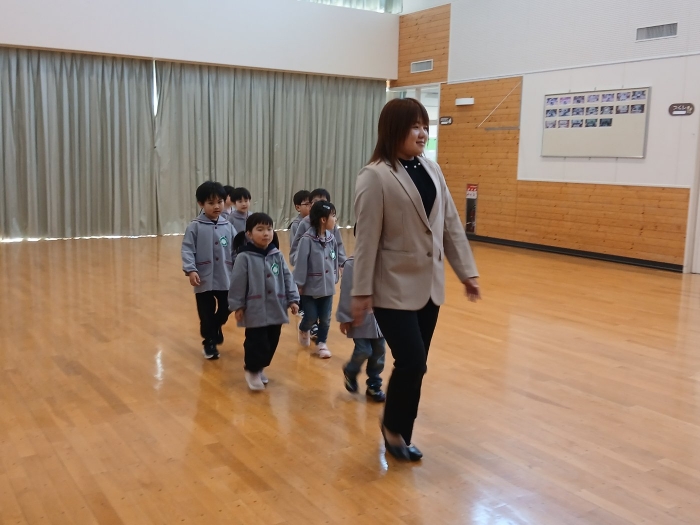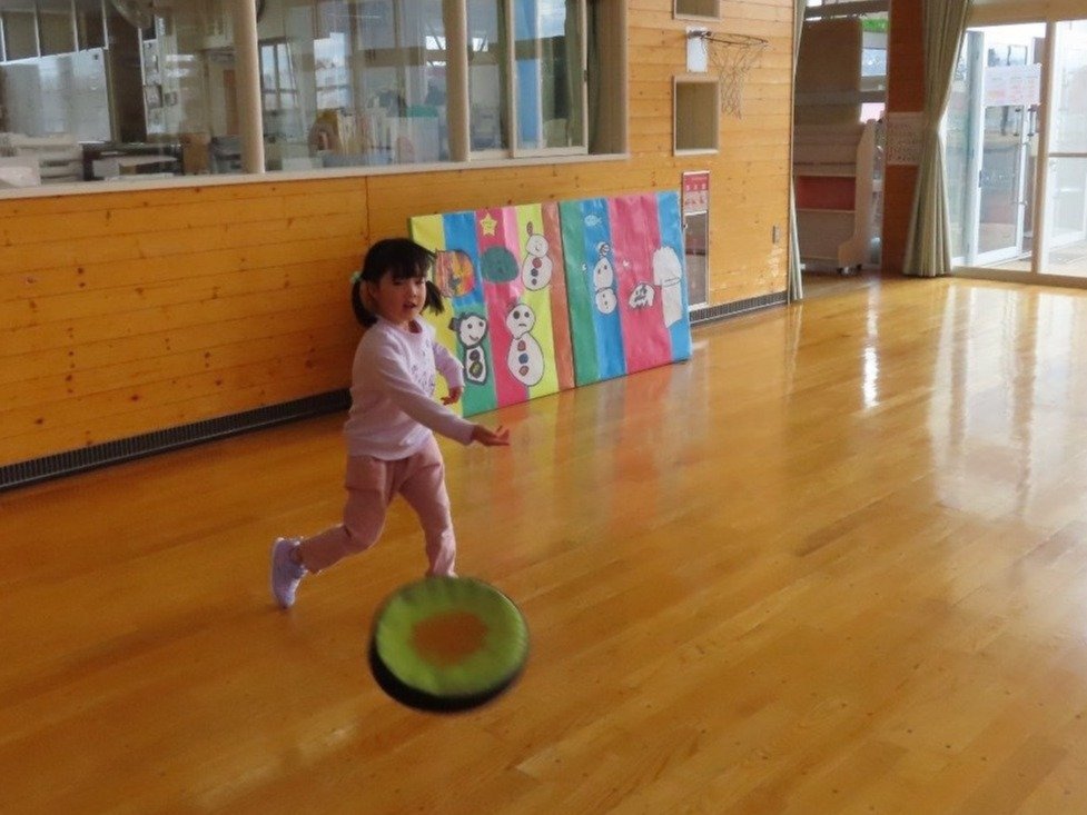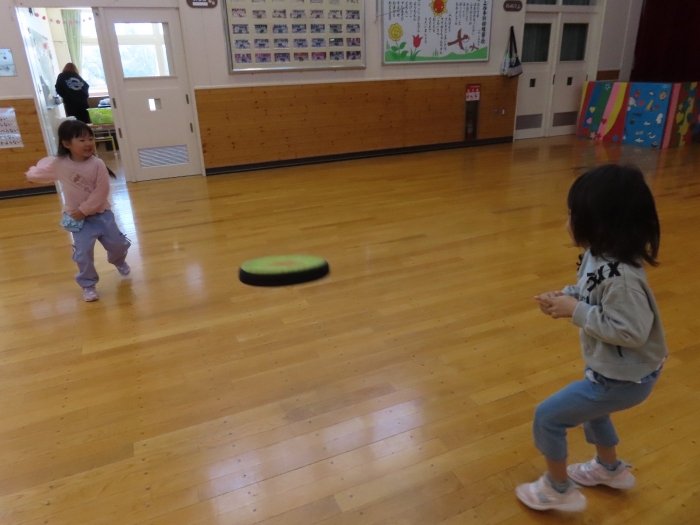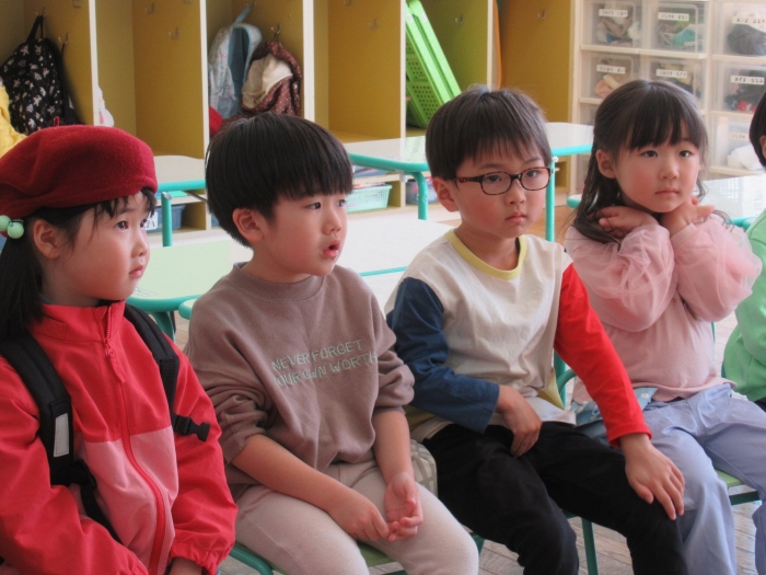 久しぶりの幼稚園,友達や先生との再会を喜んだり,新しい保育室環境にドキドキ・わくわくしながら新学期の大荷物を片付けたりしていました。荷物整理を終えると、さっそく慣れ親しんだ遊び『ドッチビーかたき』を満喫していました。 担任や保育室環境が代わり,ちょっぴり緊張の面持ちの子もいましたが,友達と好きな遊びを楽しんだり、新しい名札を付けてもったり、新規の当番決めをする中で、進級への喜び・期待を膨らませている様子でした。