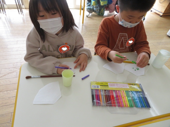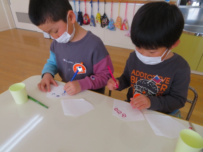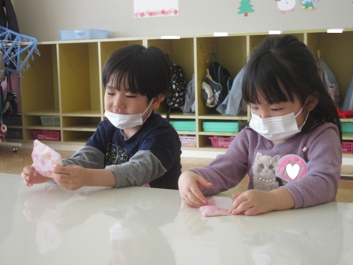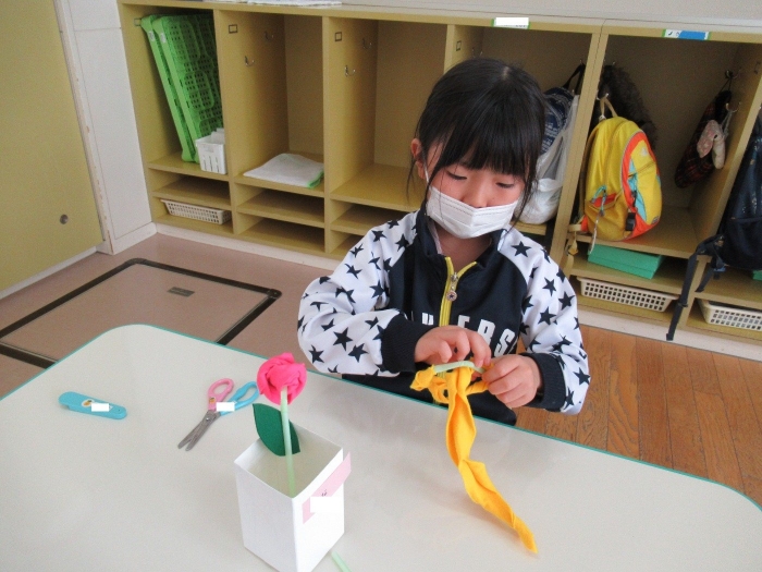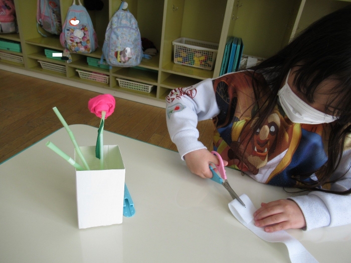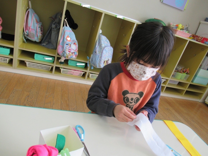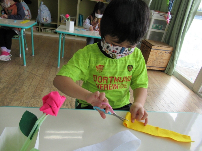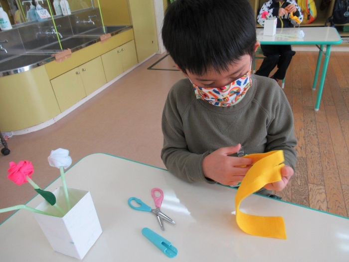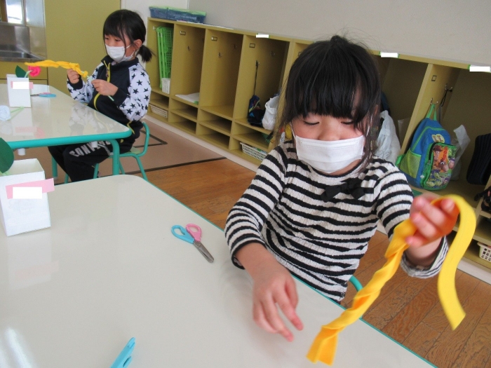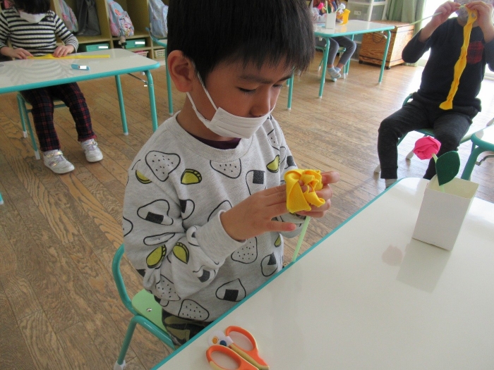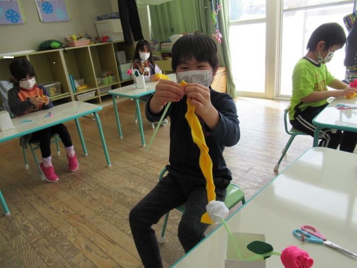 朝会後、いちご組・つくし組は、お部屋で雛人形制作。たけのこ組は、卒園式で花道に飾るお花の制作。どんな作品が完成するのかな…