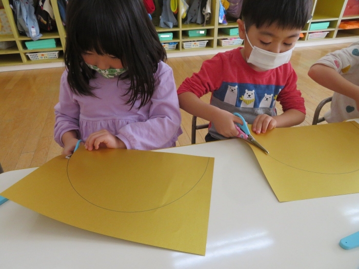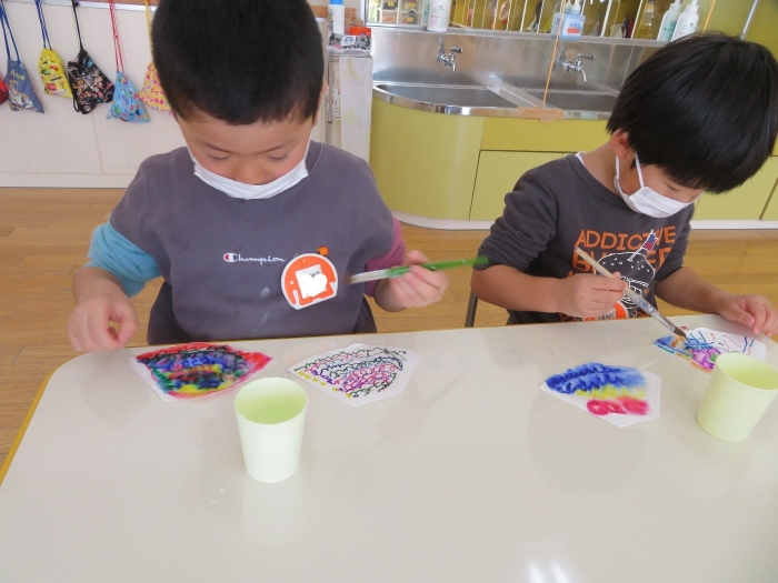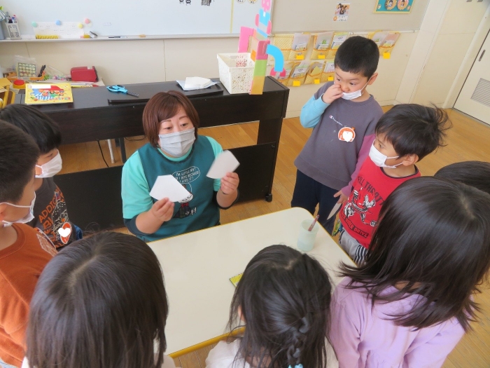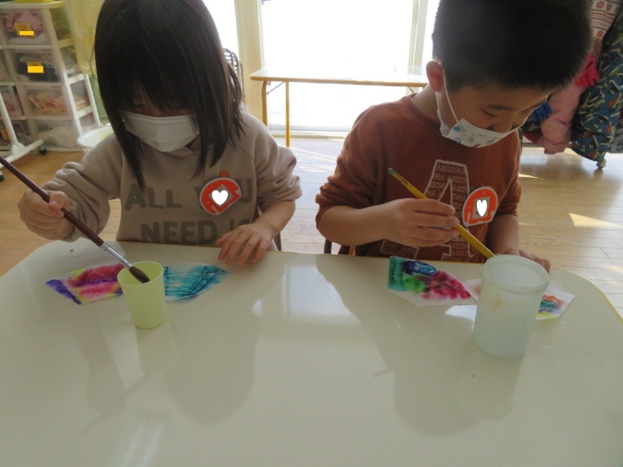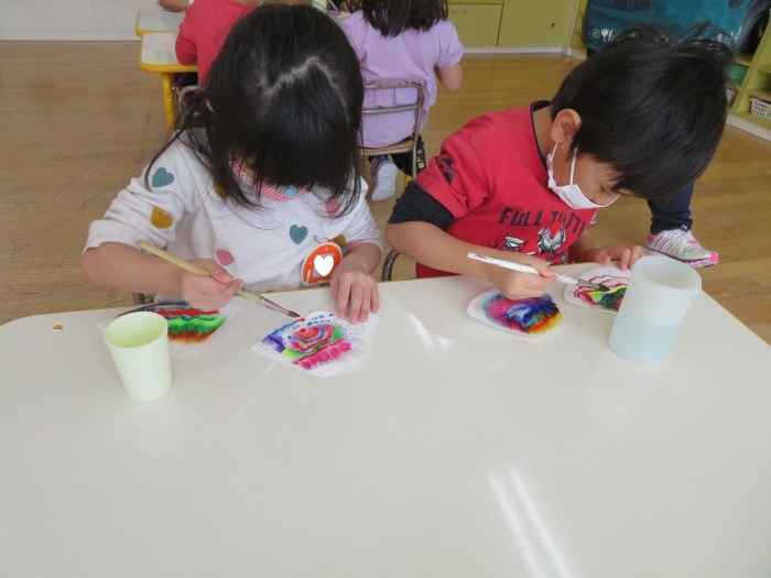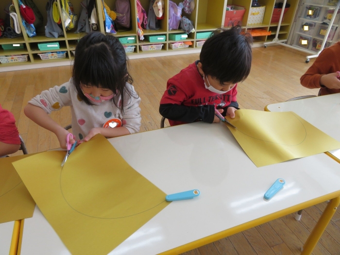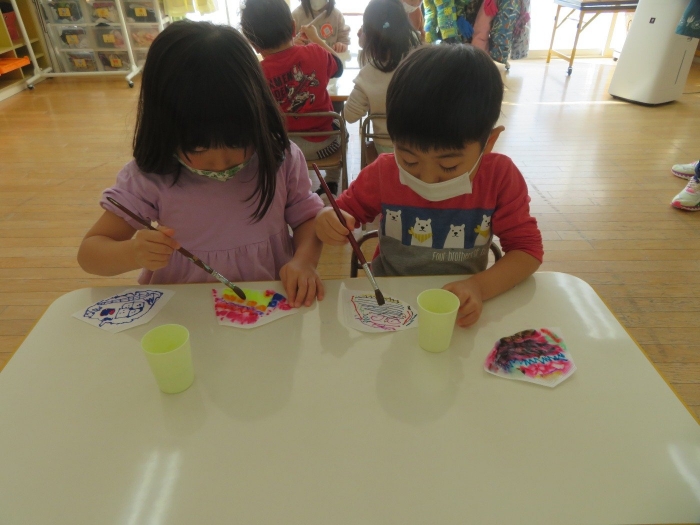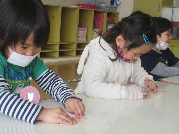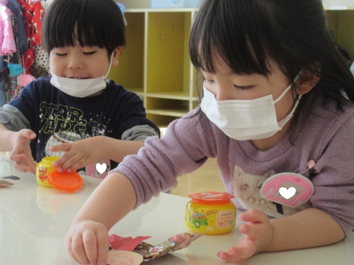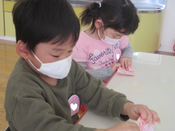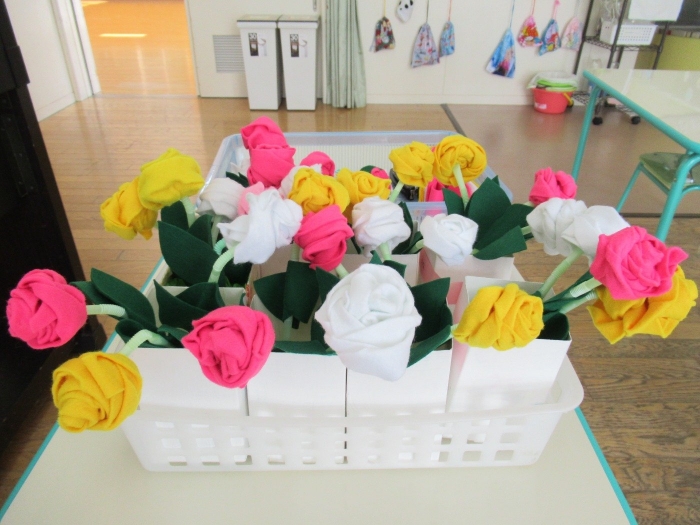 朝会後、いちご組・つくし組は、お部屋で雛人形制作。たけのこ組は、卒園式で花道に飾るお花の制作。どんな作品が完成するのかな…