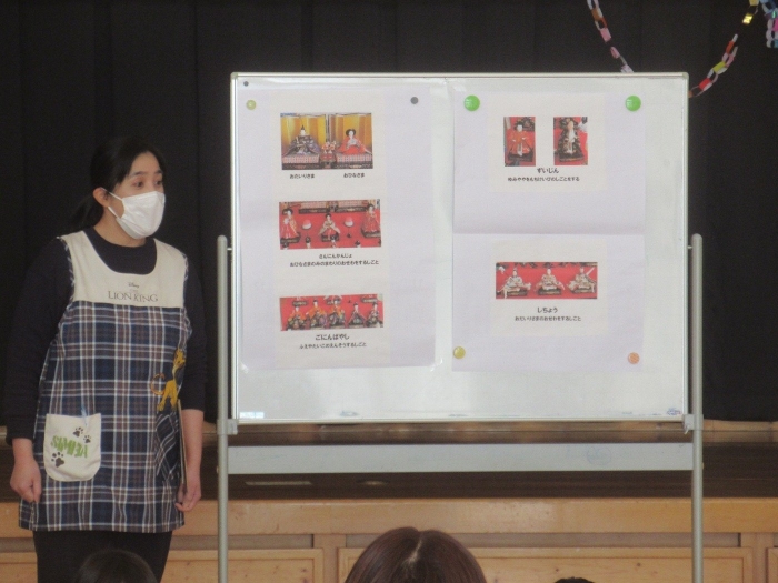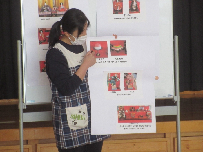 今日のおはよう朝会のお話は、雛人形についてでした。『三人官女』や『五人囃子』等の人形の名称と、持ち物や仕事についてお話をしてくれました。その話を聞いてから雛人形を見ると、なんとなく見るのではなく具体的に見ることができますね。その他に、飾られている様々な道具の名称についても教えてくれました。雛人形について、少し詳しくなった子供達でした。