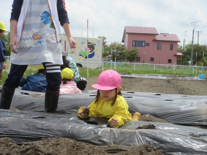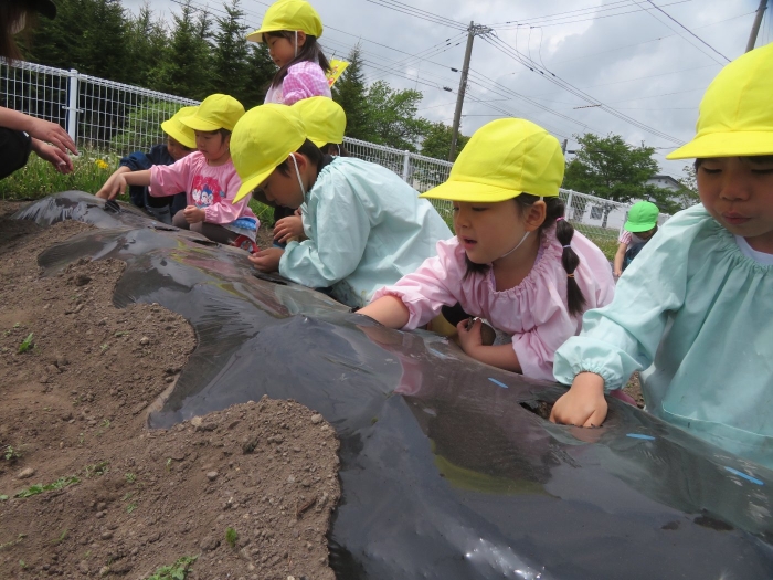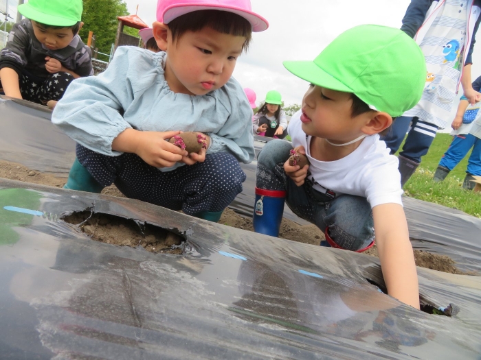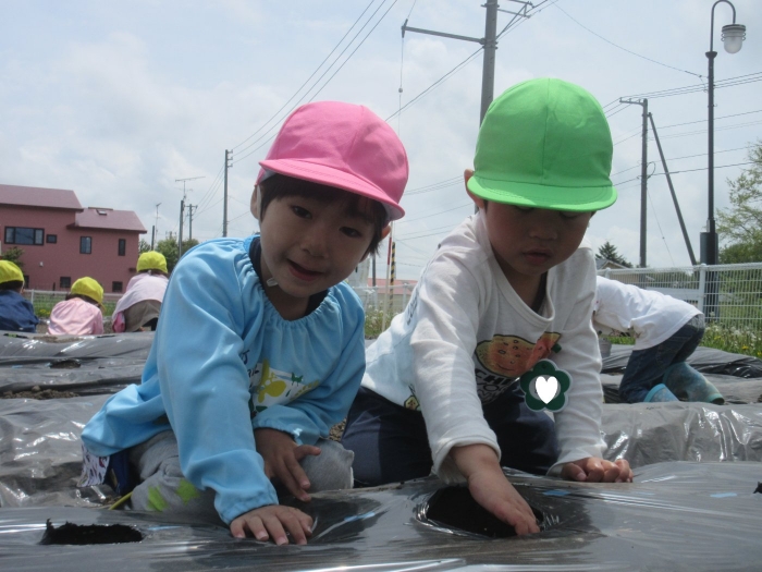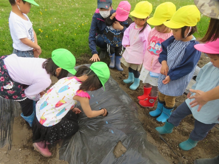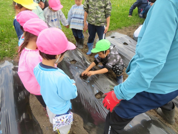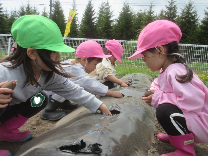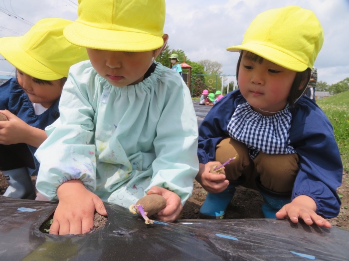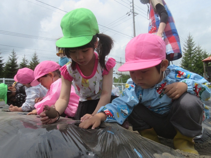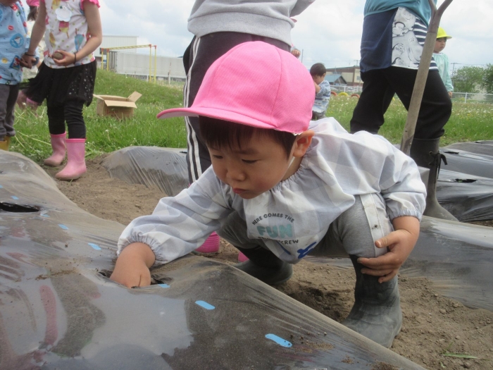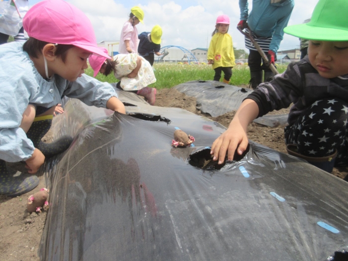 今日は、芋植えを行いました。畑に植える芋の名称をクイズにして出題してみると…見事にわかりませんでした(汗)。たけのこ組は3回目、つくし組は2回目の経験なのですが、なかなか『種いも』という言葉が出てきませんでした。難しかったかな?たけのこさんに、植え方のお手本を見せてもらった後は、早速自分達で挑戦。いちごさんは、たけのこさんや先生に教えてもらいながらやってみましたよ。
