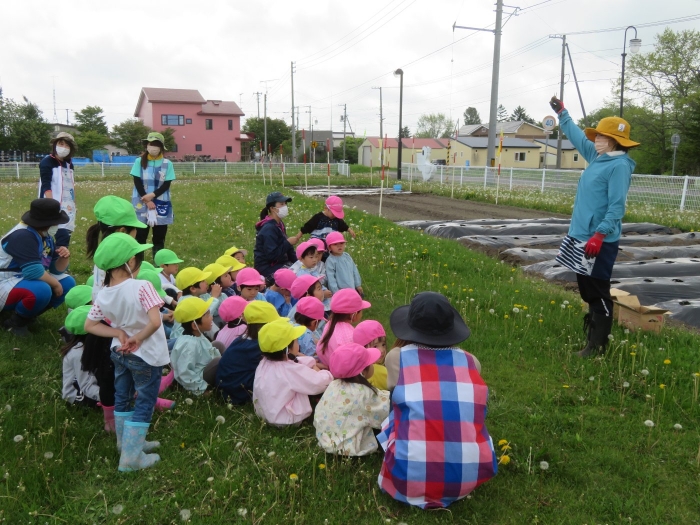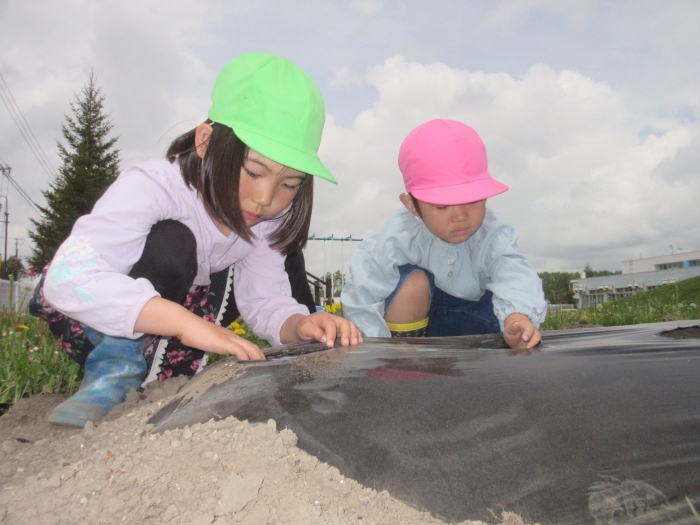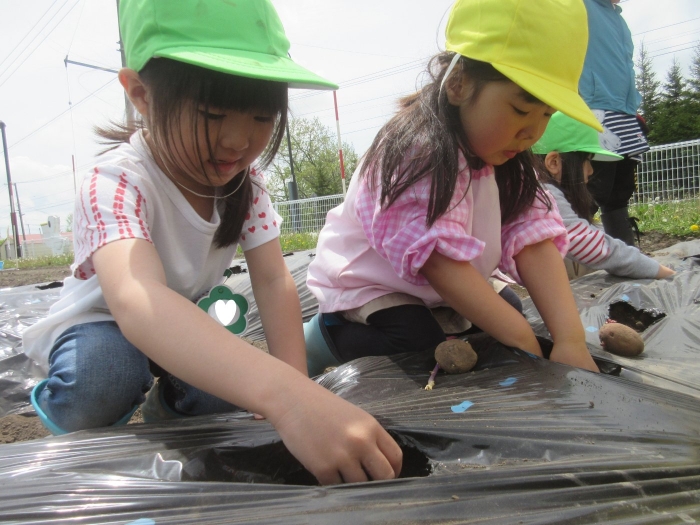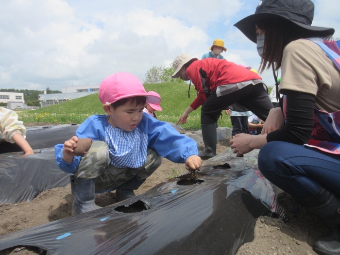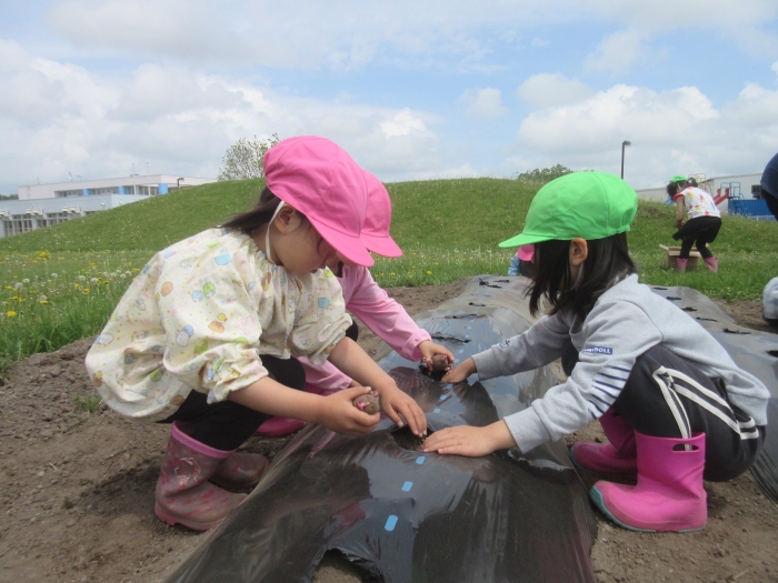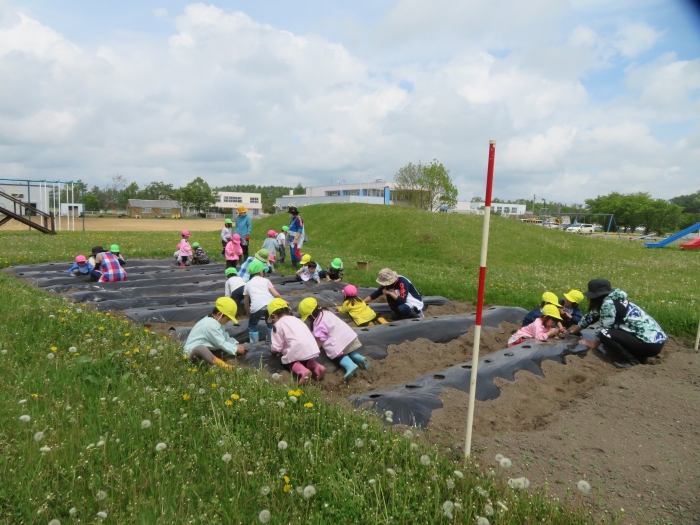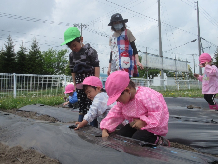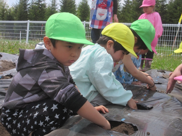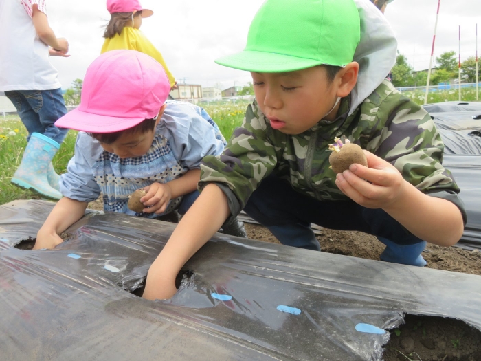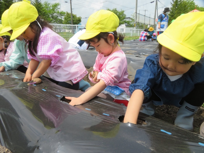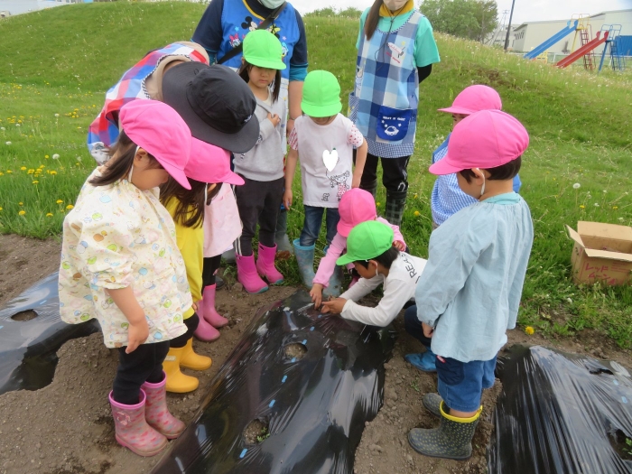 今日は、芋植えを行いました。畑に植える芋の名称をクイズにして出題してみると…見事にわかりませんでした(汗)。たけのこ組は3回目、つくし組は2回目の経験なのですが、なかなか『種いも』という言葉が出てきませんでした。難しかったかな?たけのこさんに、植え方のお手本を見せてもらった後は、早速自分達で挑戦。いちごさんは、たけのこさんや先生に教えてもらいながらやってみましたよ。