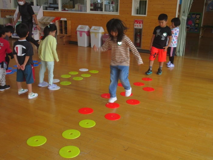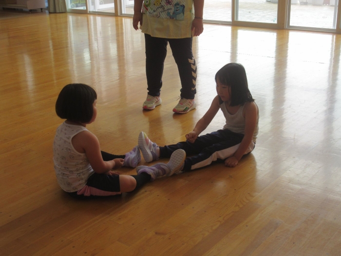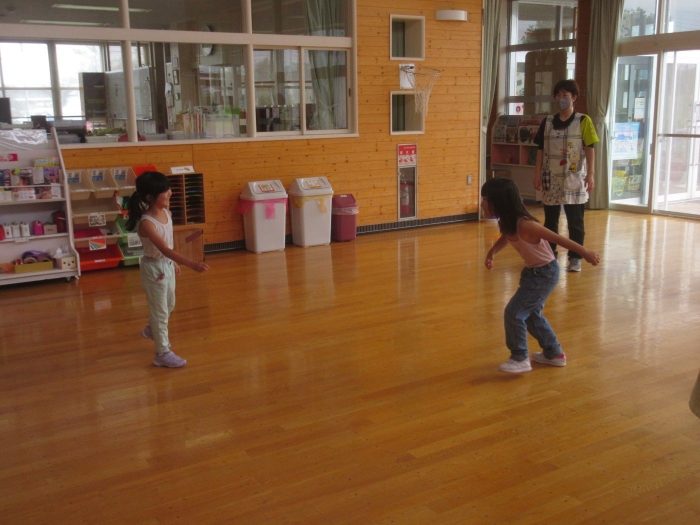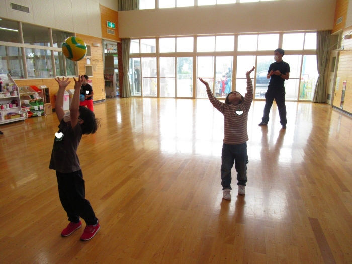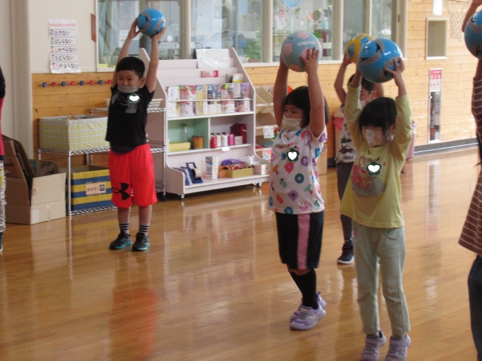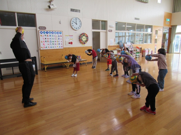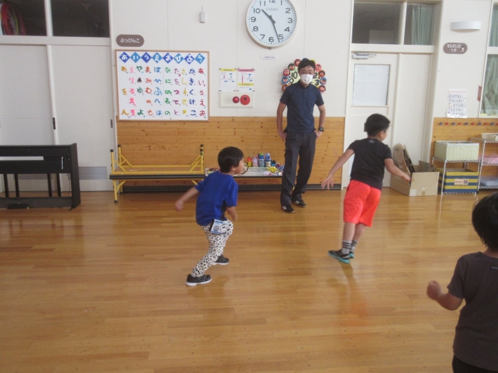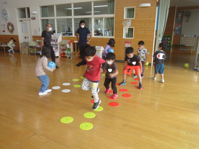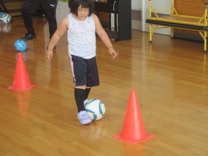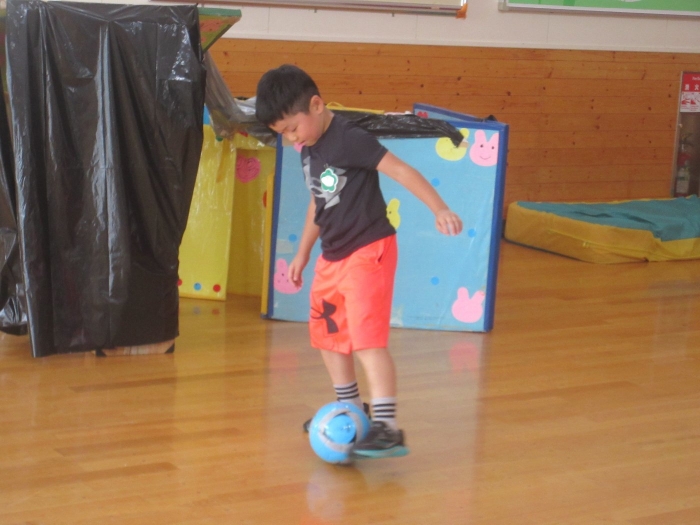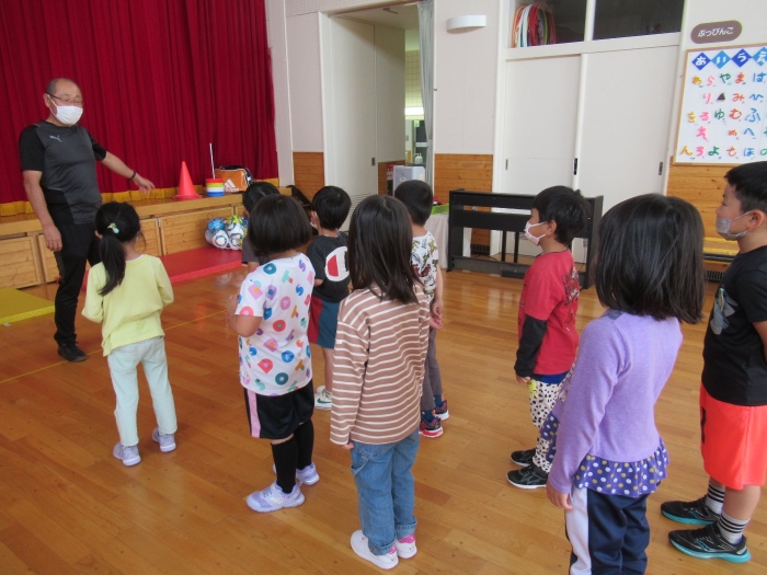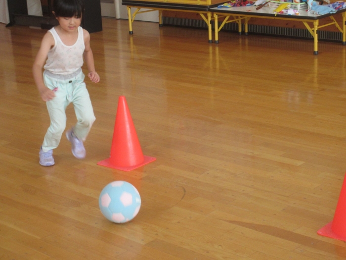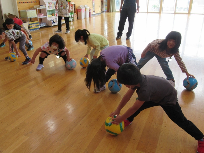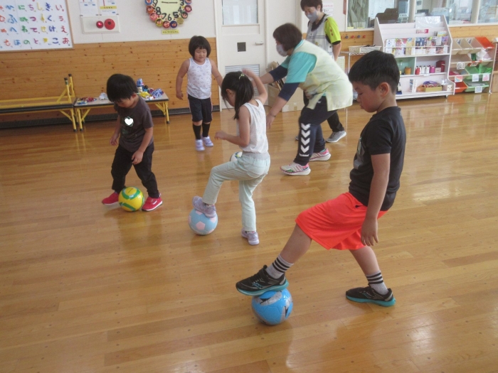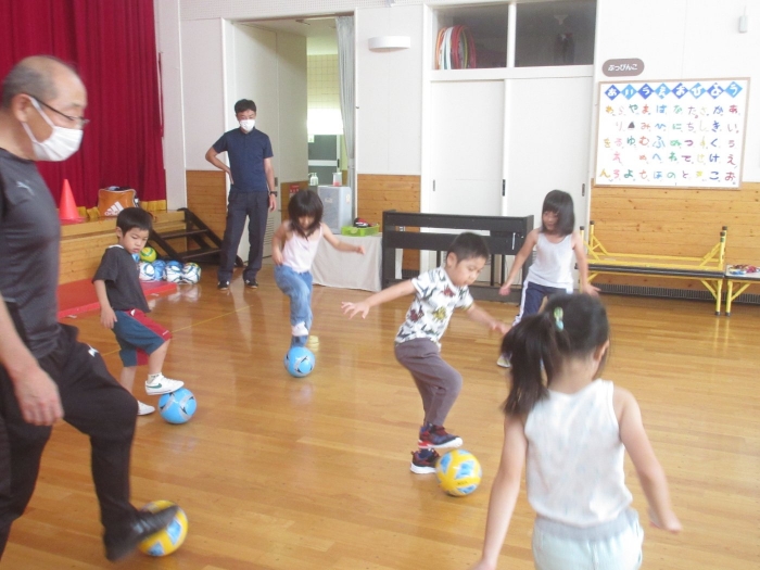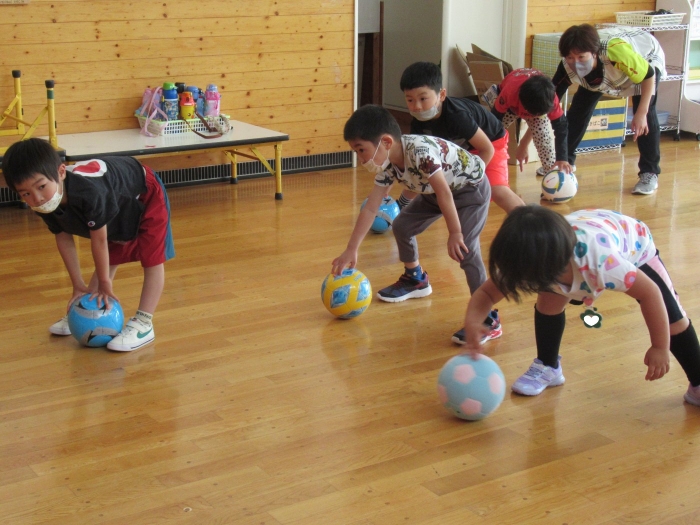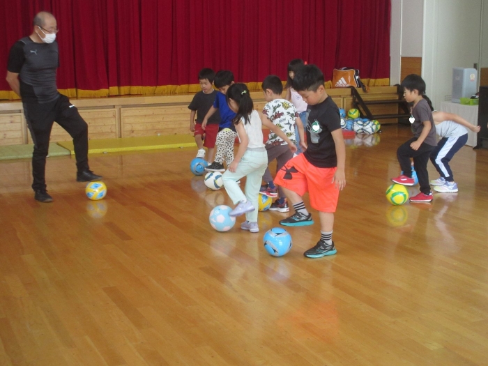 今日は、年長組サッカー教室がありました。新型コロナが流行してからは行っていなかったので、3年ぶりの教室でした。今日は、現在も現役選手である2名のコーチの方が来て指導をしてくださいました。ボールを使っての準備体操をはじめ、ケンケンパやジャンプで体を動かしたり、ボールを使ってドリブルやシュートをしたり。「ボールは友達だよ!」「できるだけ足からボールが離れないようにするんだよ!」と教えてもらいながら、楽しそうに、そして汗だくになりながら夢中になって参加していました。終了後、「楽しかった!」「またやりたい!」と生き生きした表情で話すたけのこさん達でした。