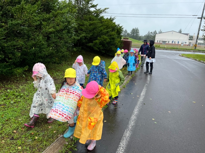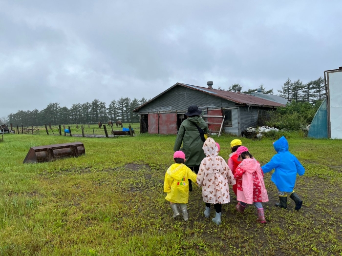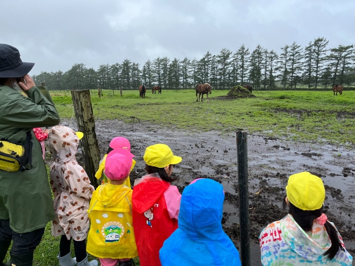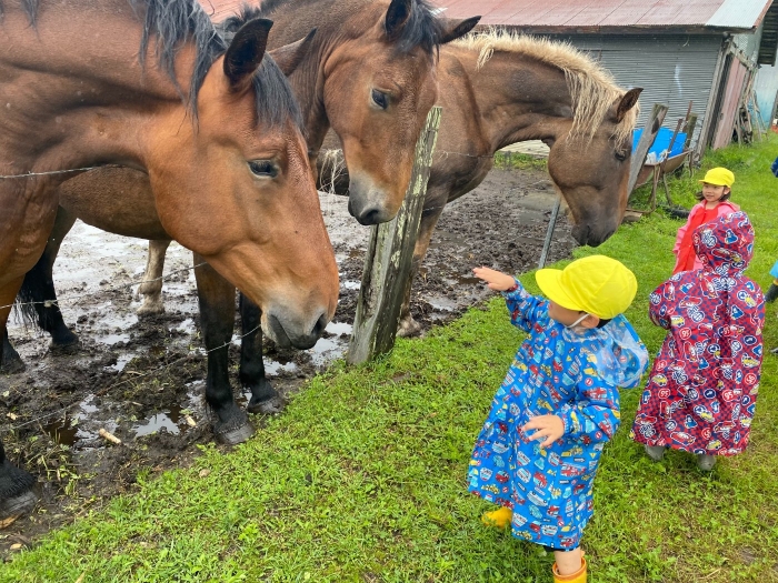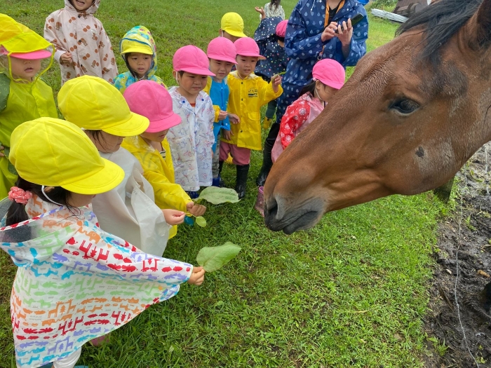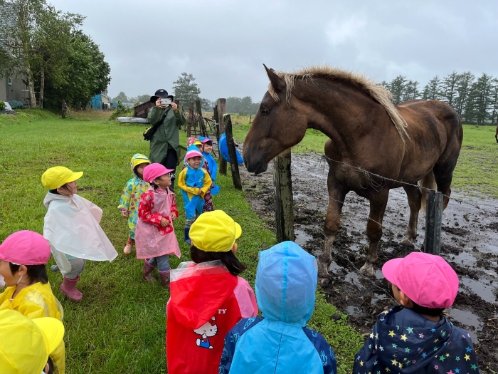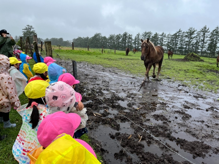 さて、つくしさんといちごさんは、カッパを着てお散歩へ。つくしさんは久しぶりに、いちごさんは初めて馬と対面。最初は、大きな馬を見てドキドキしていたようですが、慣れてくると、とても楽しかったようです。「次は人参も持っていく!」と話していましたよ。