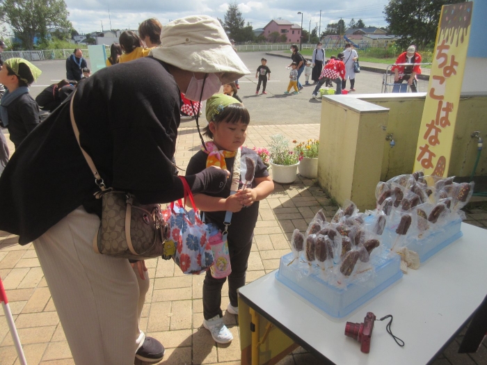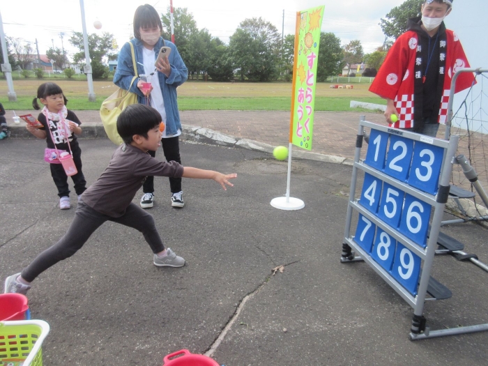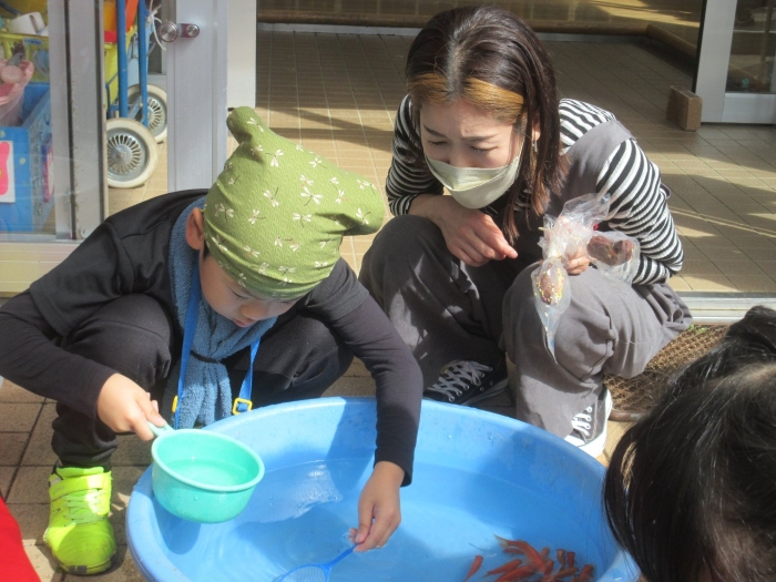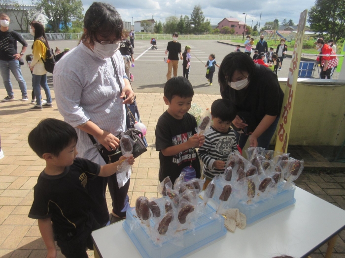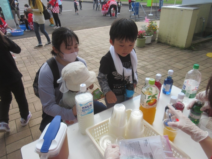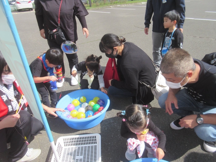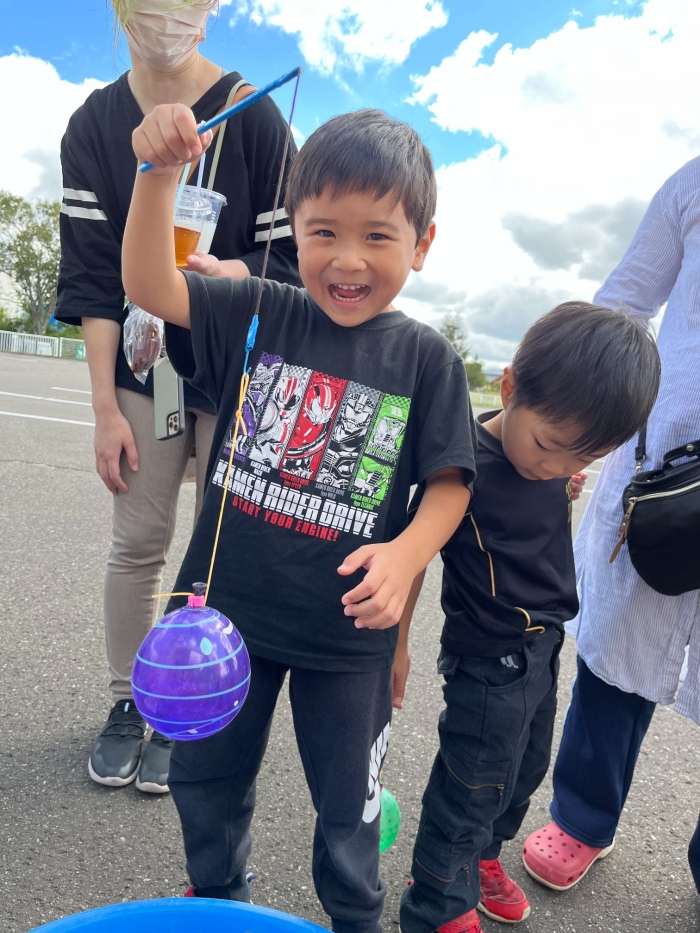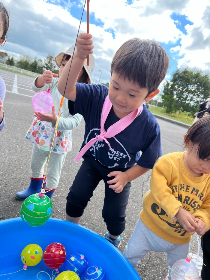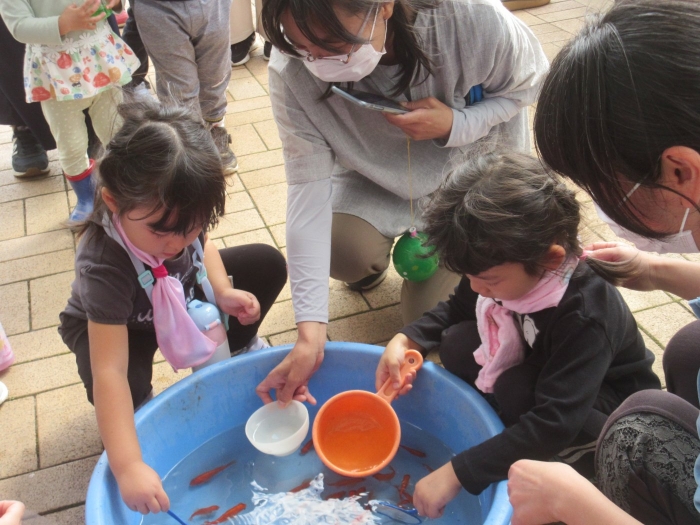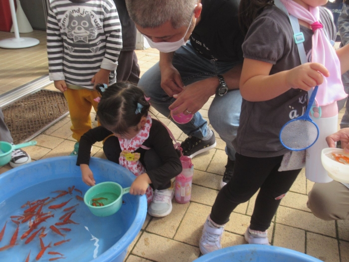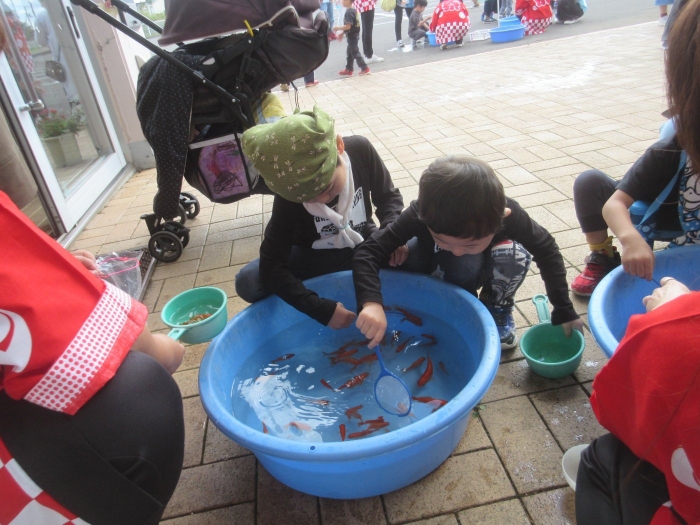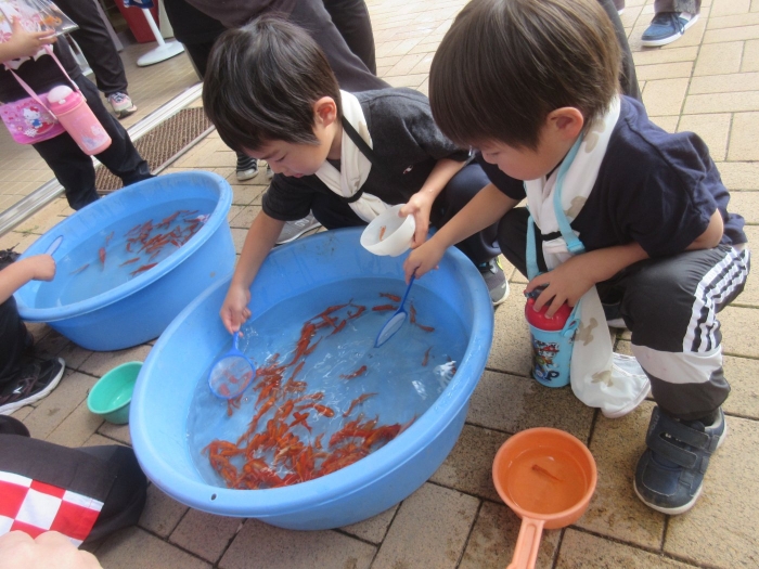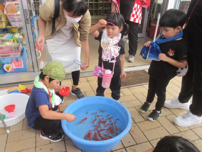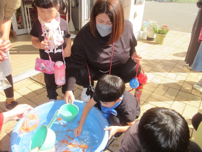 お披露目会終了後は、もう一つのお楽しみ『縁日』。今年は、先生方がお店屋さんになり、親子で縁日を楽しみました。ヨーヨー屋さん、金魚すくい、ストラックアウト、ジュース屋さん、チョコバナナ屋さん、5つのお店を開店。なんと!金魚すくいは本物ですよ。R先生のご両親が、自宅で金魚をたくさん飼育しており、今回子供達のために…とご厚意でくださいました。ありがとうございます。本物の金魚すくいに、子供達は大喜び。保護者の皆さんも、童心に帰り楽しんでいただけましたか?今日は、お祭り気分をたっぷり味わえた一日になりました。