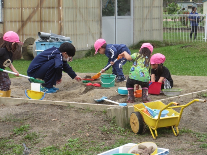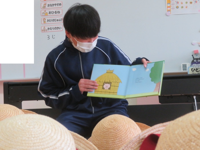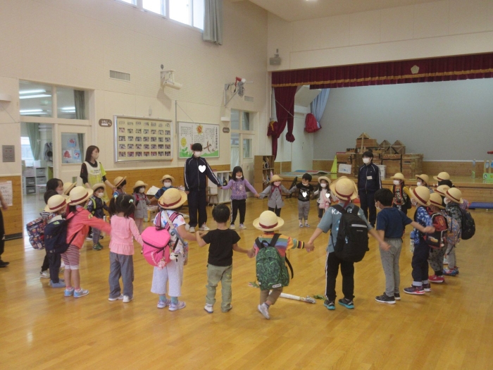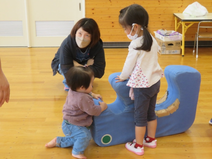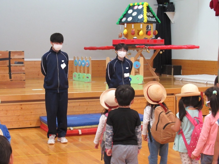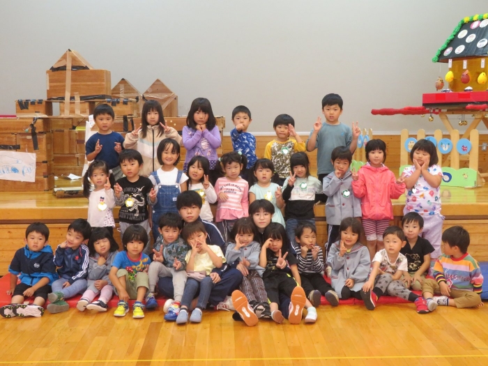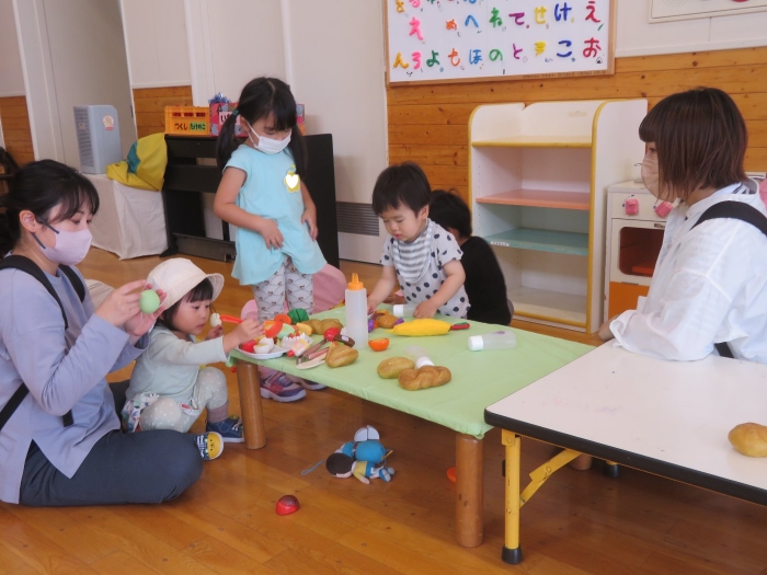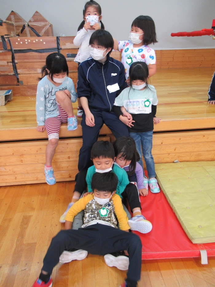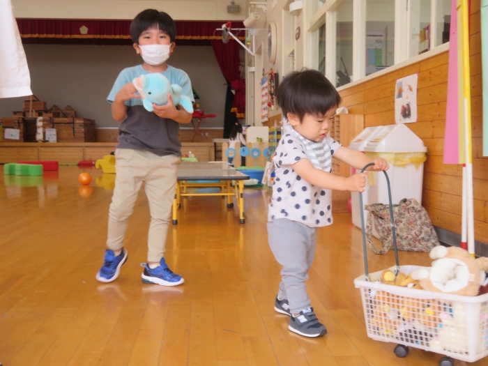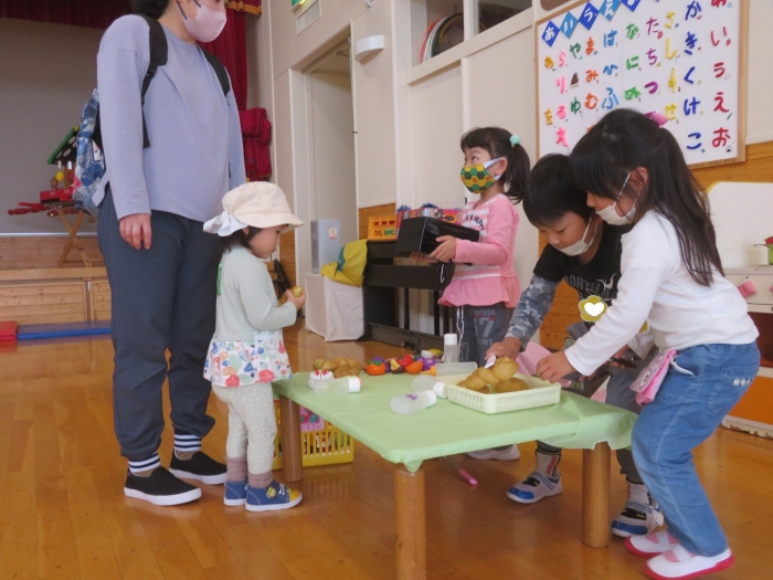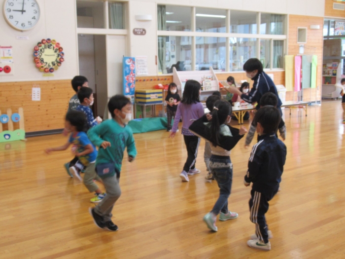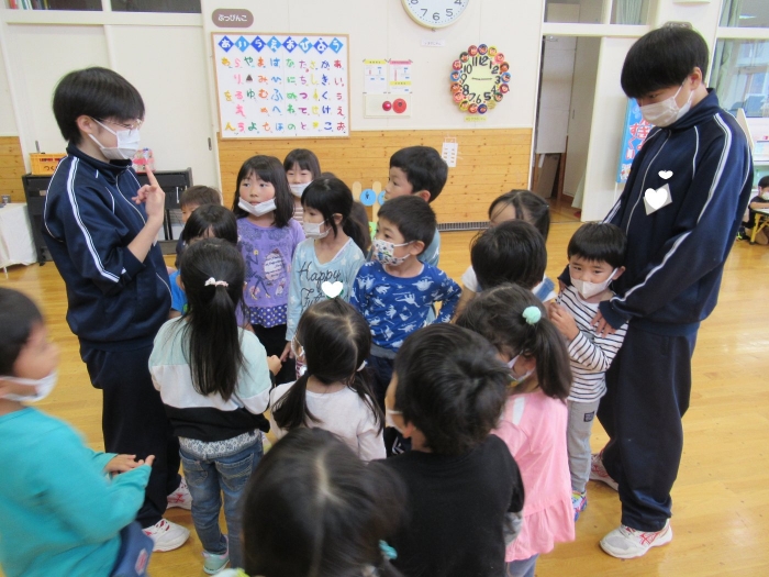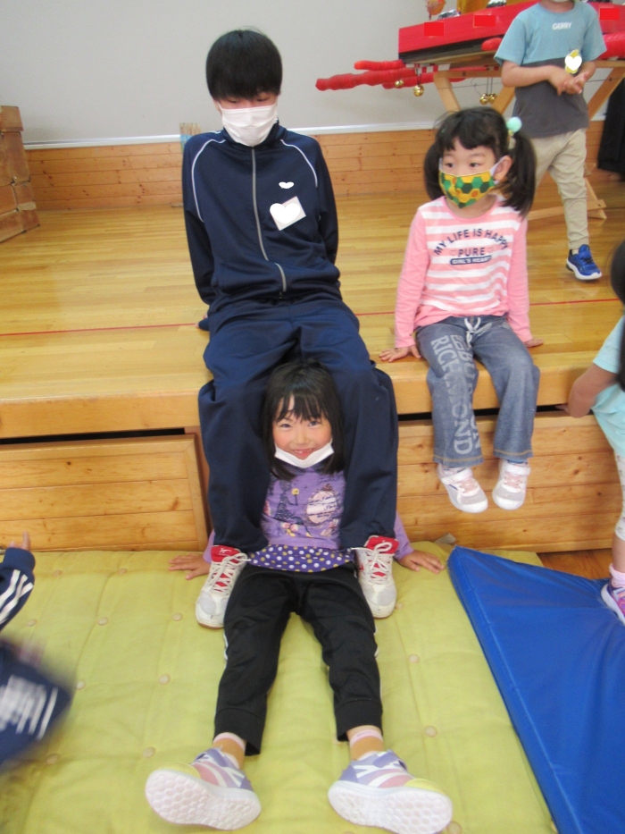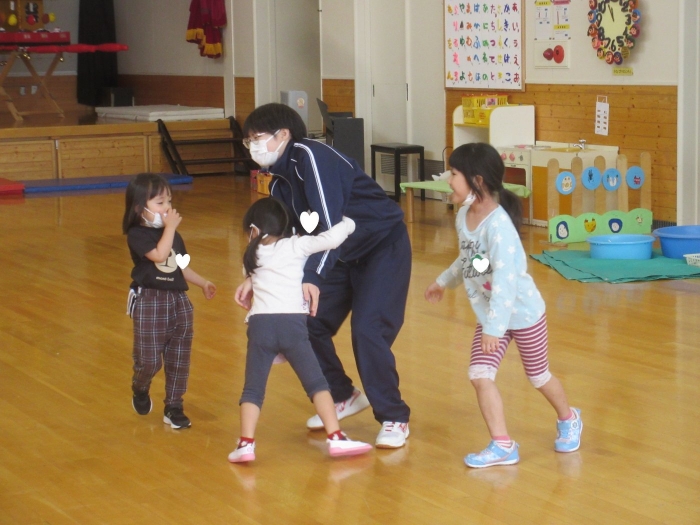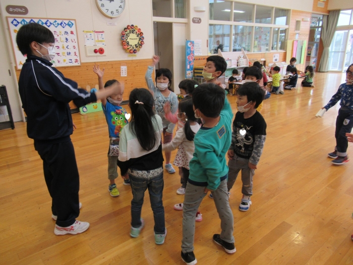 今日は、職業体験2日目、そしてにこぴんクラブがありました。朝の遊びでは、鬼ごっこやかくれんぼ等、集団遊びを楽しむ姿が見られていました。お兄さんお姉さんがいることで、一段と盛り上がっていたようです。お兄さんお姉さんと一緒に過ごした2日間も、あっという間でした。お別れは少し寂しいですが、またいつでも遊びに来てもらえたら嬉しいですね。子供達がお兄さんお姉さんに会いたくなったら、是非中学校へ遊びに行かせていただきたいと思っています。にこぴんクラブは、3名のお友達が来てくれました。小さなお友達が可愛いくて、積極的に関わって遊んでいました。