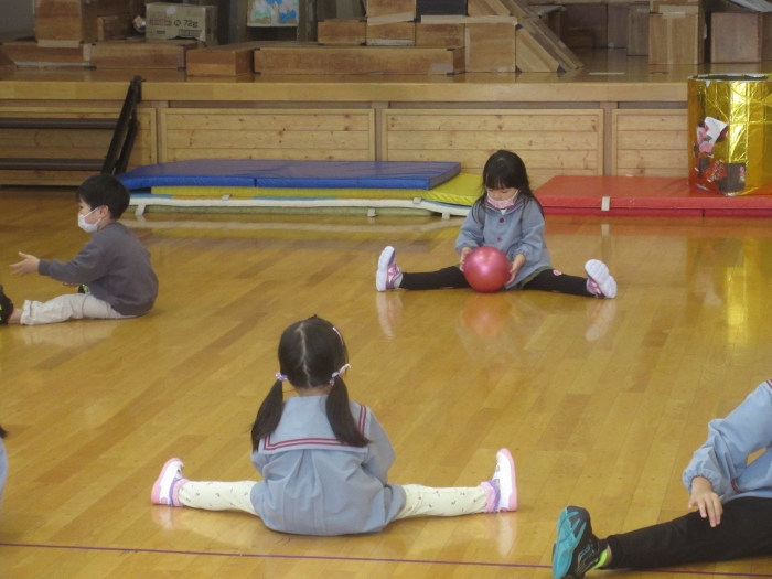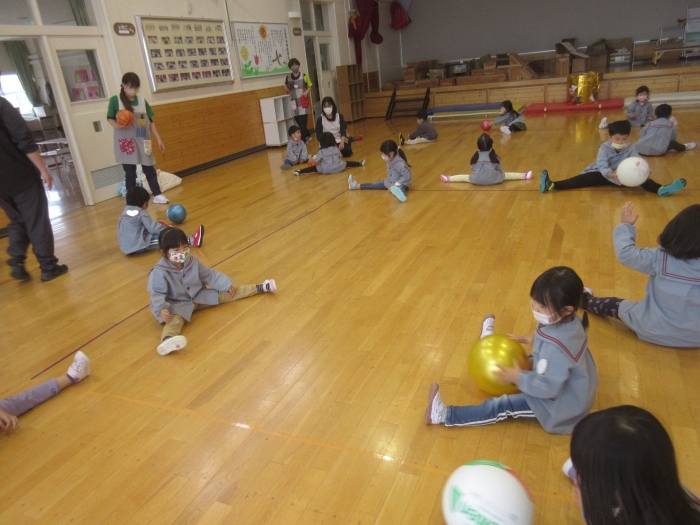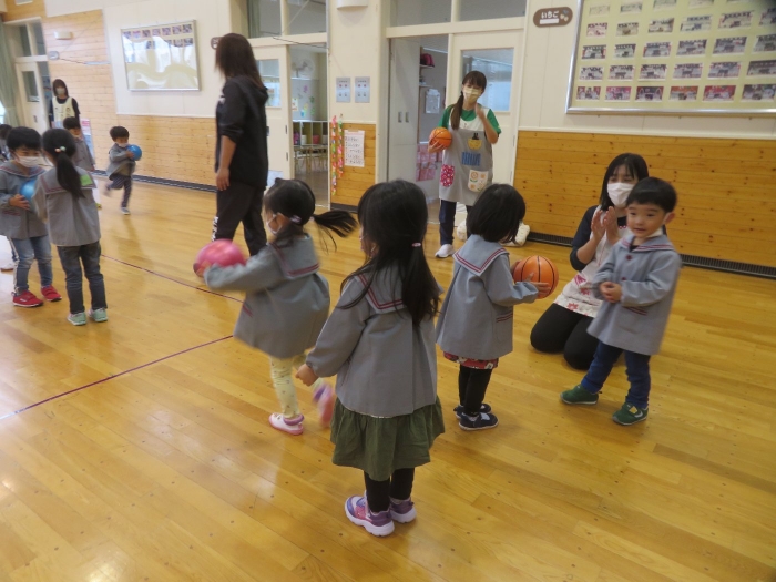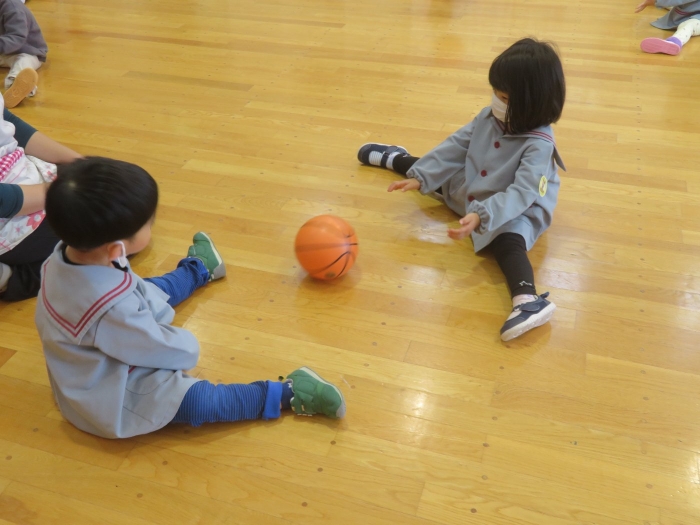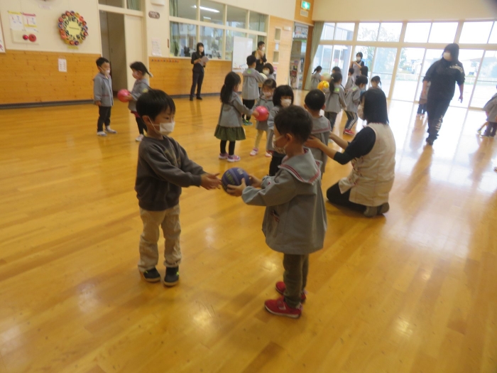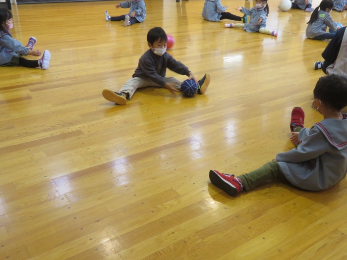 今日のおはよう朝会は、ボールをどんぐりに見立ててリズム遊び。二人でペアになり、どんぐりころころの歌のリズムに合わせて、お友達を意識しながら、音にも気を配りながら、ボールを投げたり転がしたりすることを楽しみました。