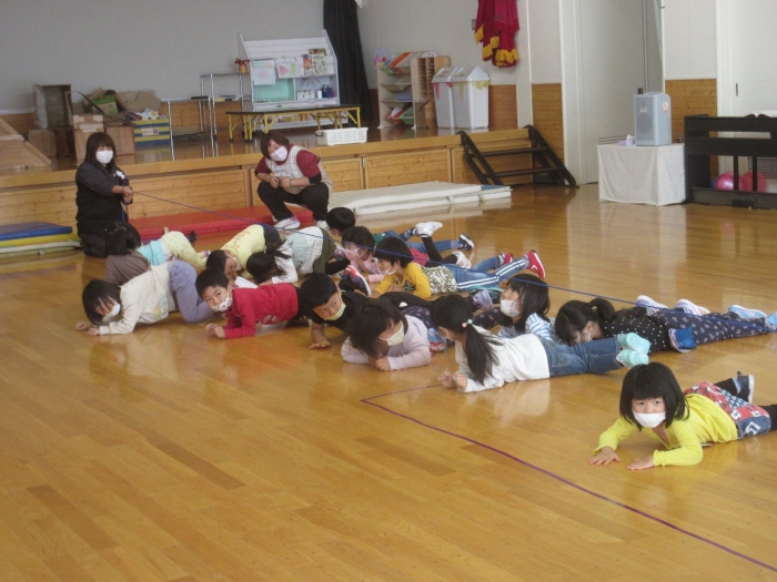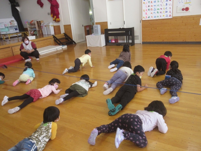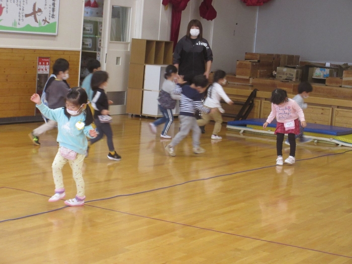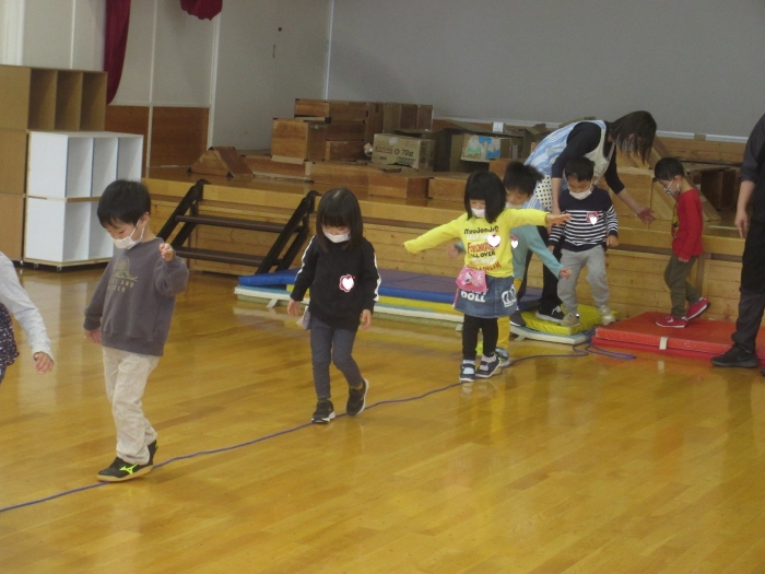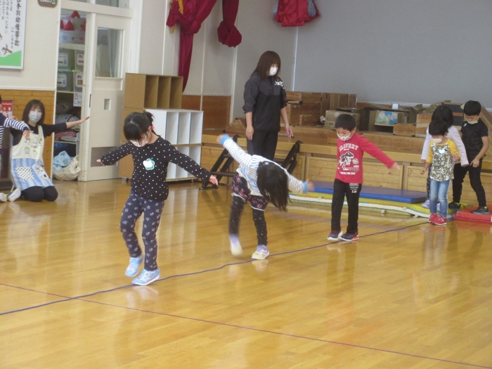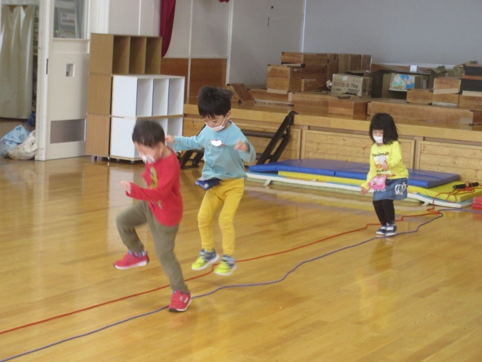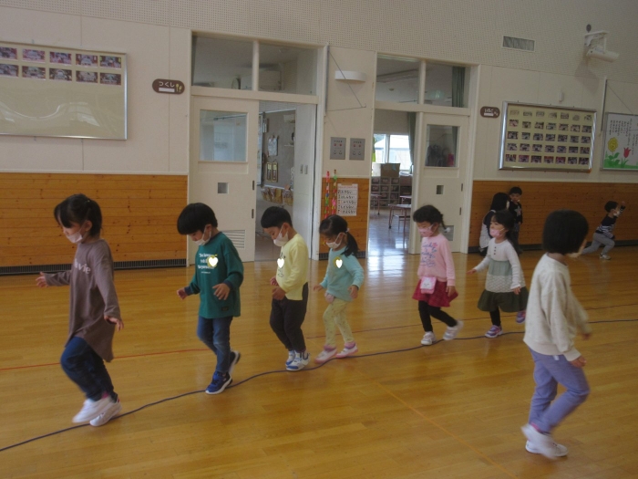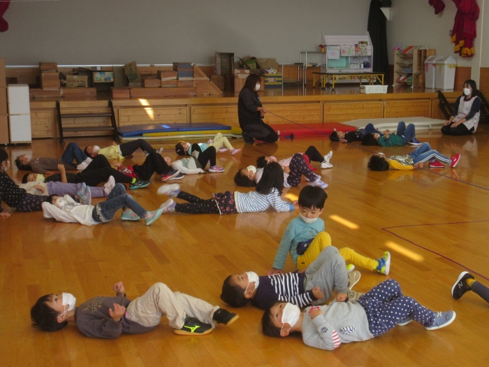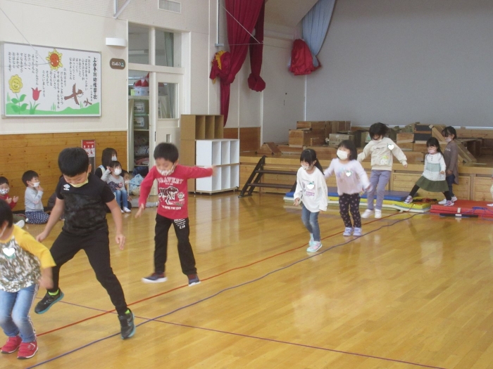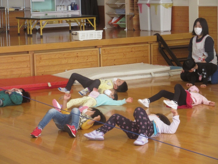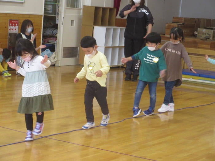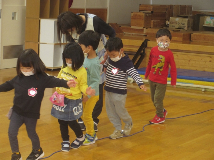 げんきっ子タイムは、大縄を使って体を動かしました。縄の上をつま先で歩いたり、走ったり、ジャンプをしたり、動物になりきって動いたり、様々な体の動きを体験しました。