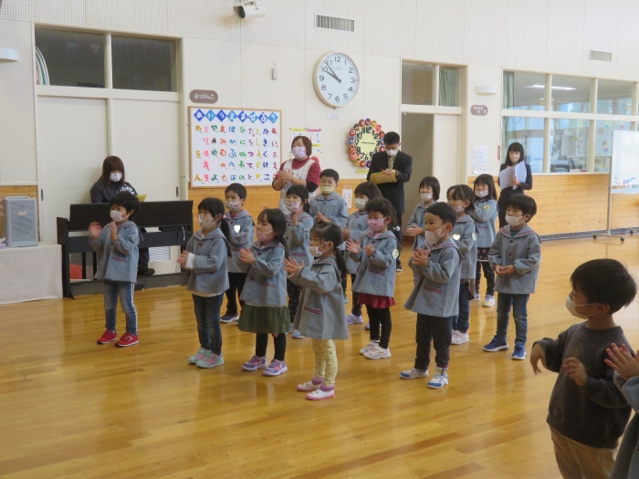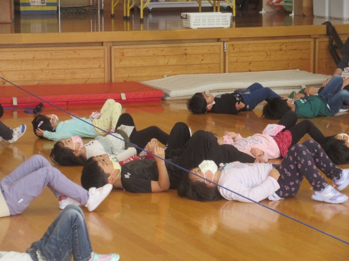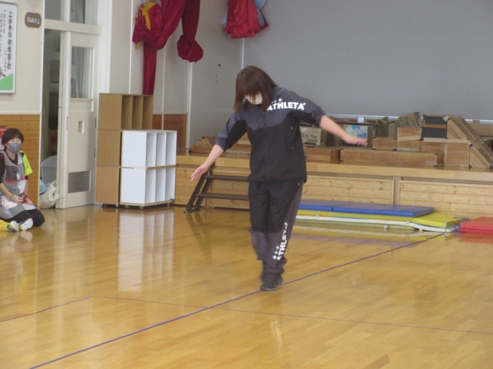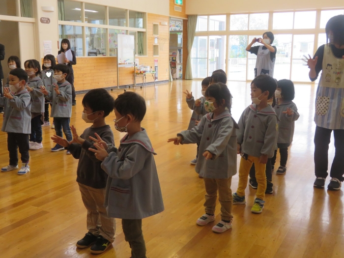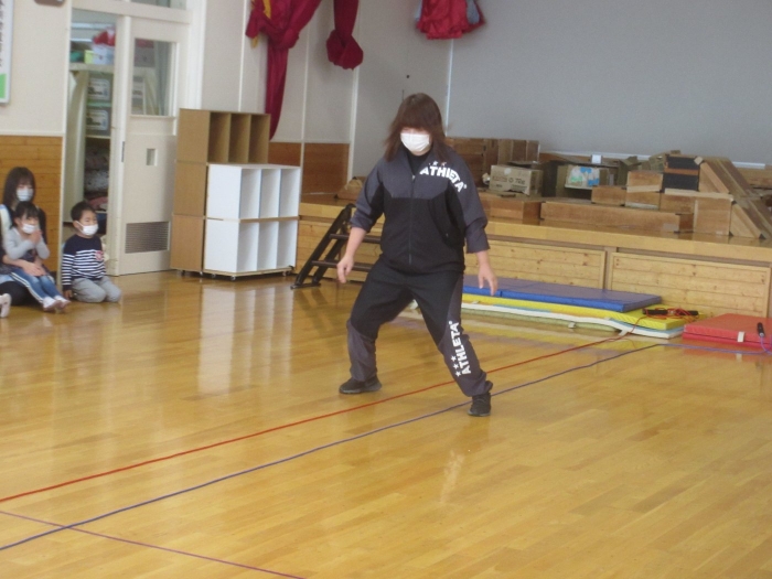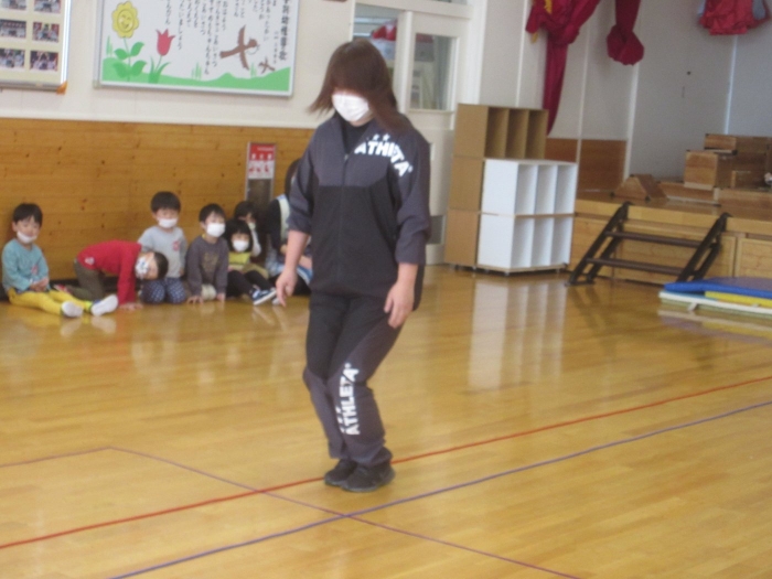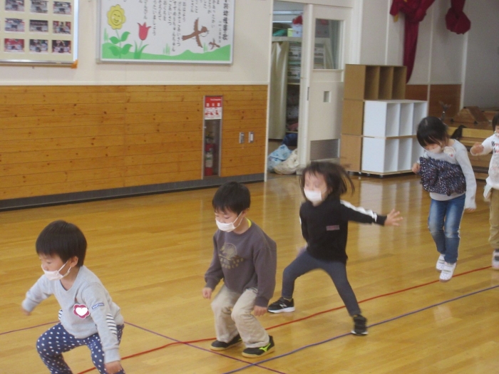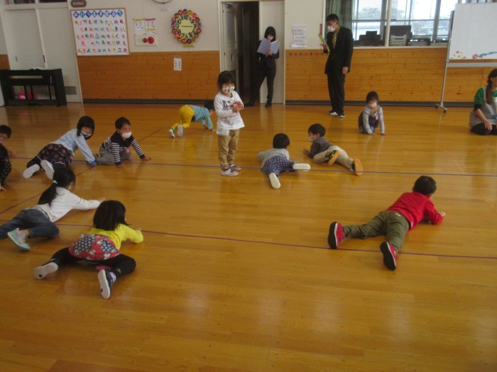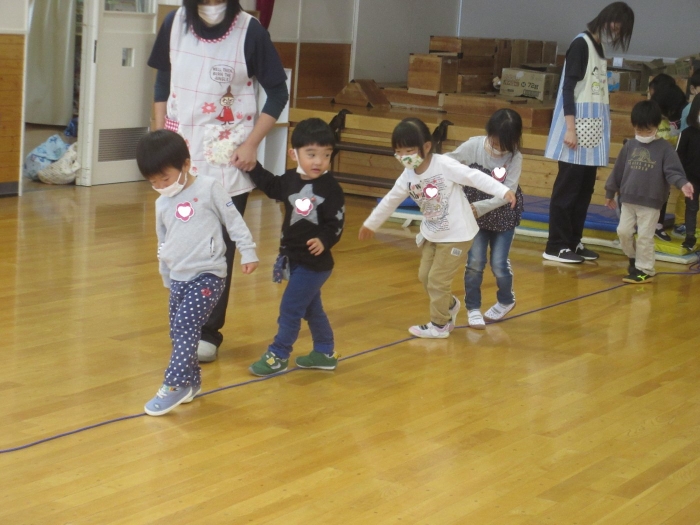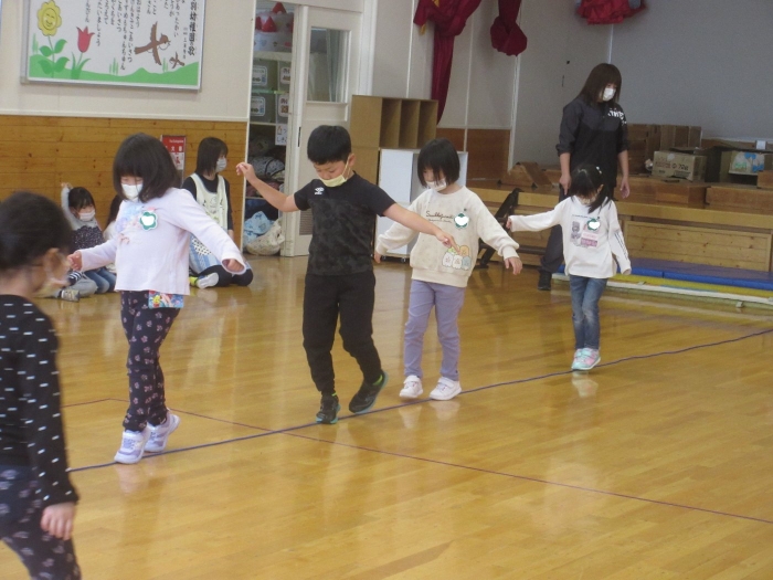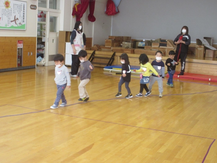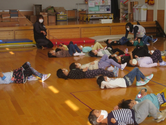 げんきっ子タイムは、大縄を使って体を動かしました。縄の上をつま先で歩いたり、走ったり、ジャンプをしたり、動物になりきって動いたり、様々な体の動きを体験しました。